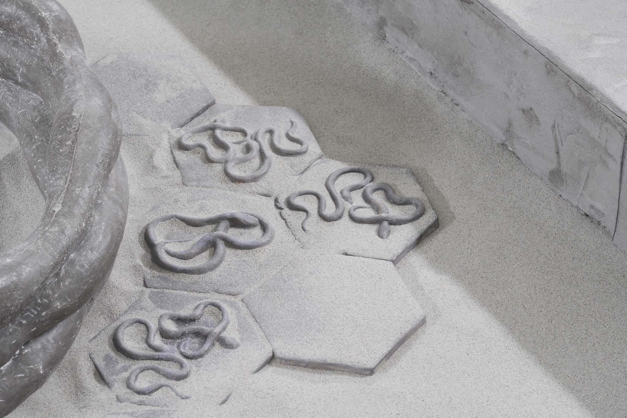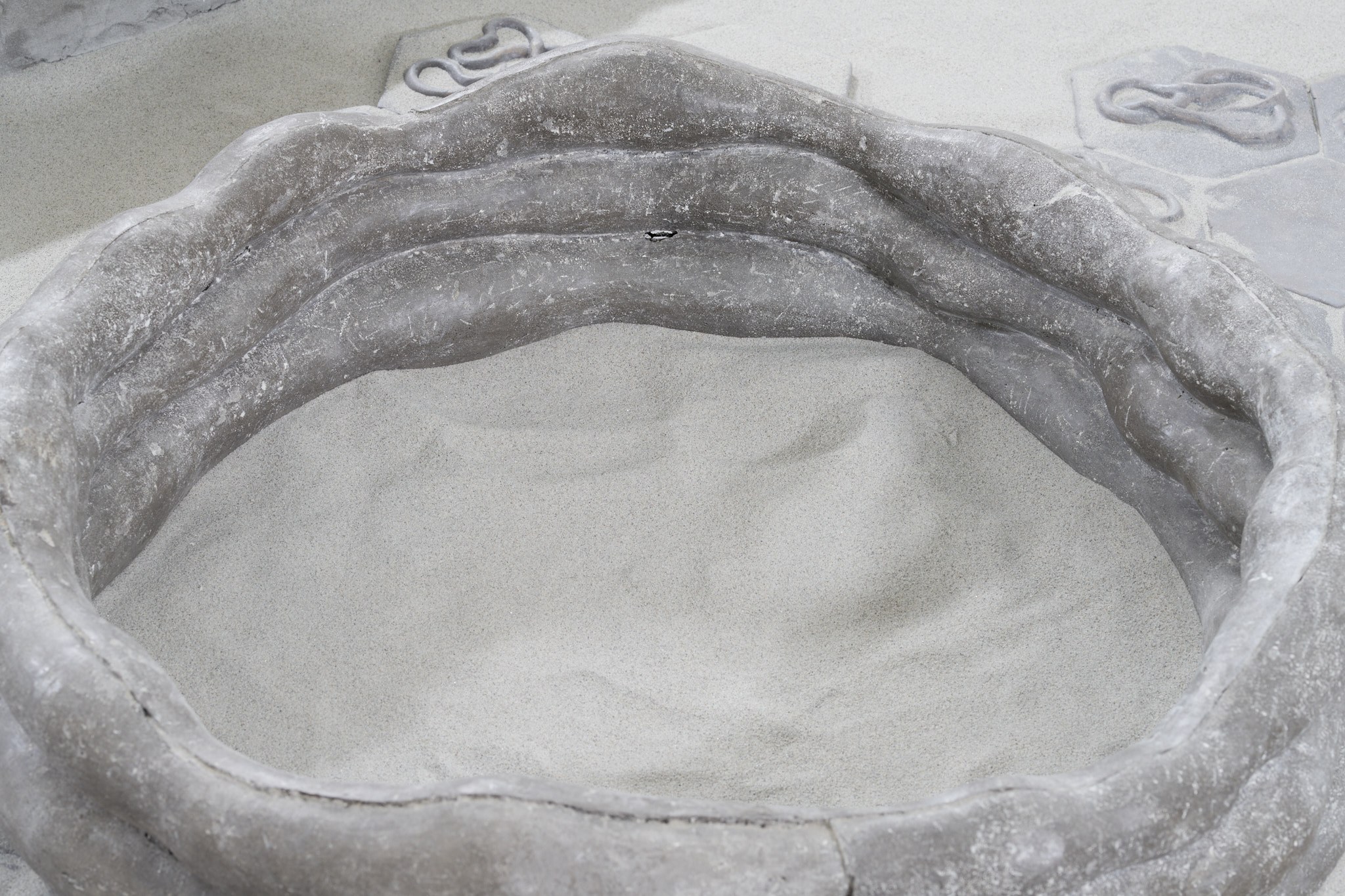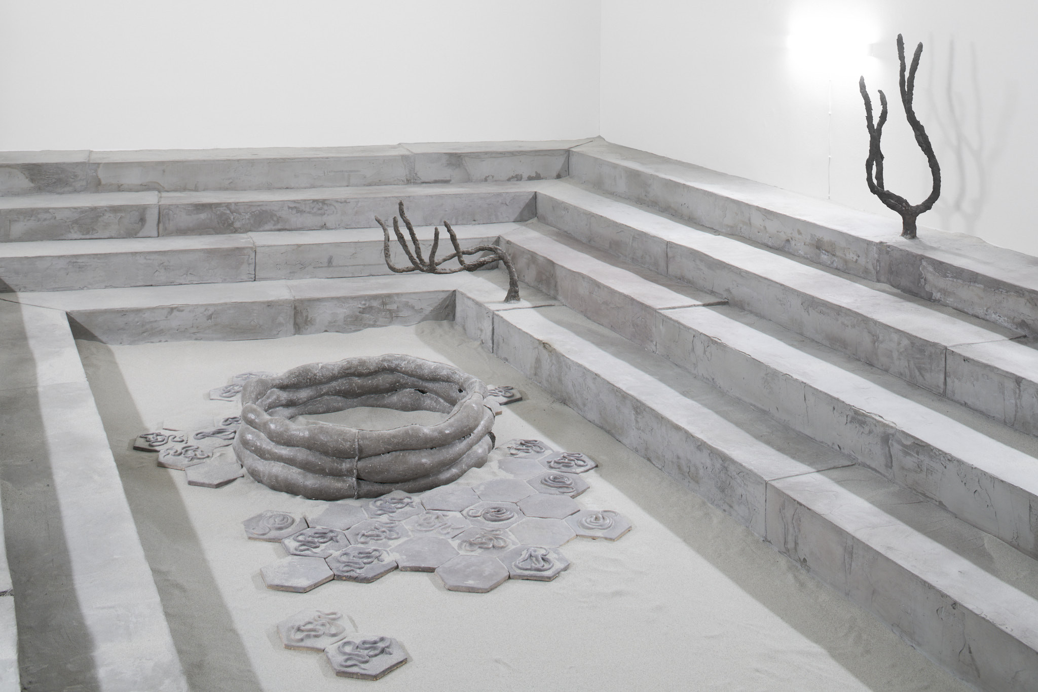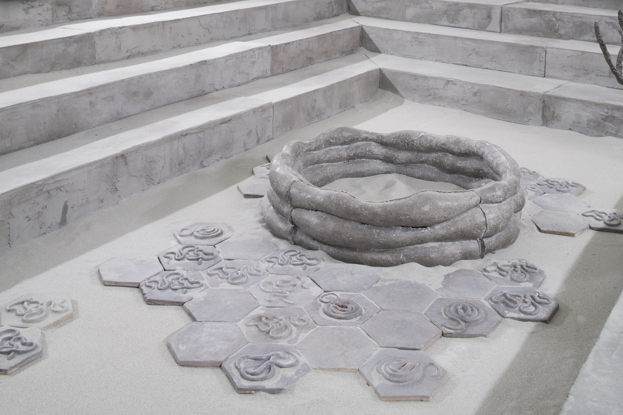 The place of otherness, emptiness, formation, potentiality of sensory perceptible materiality; Khora, emerges in the exhibition of Tereza Kalousová and Erika Velicková in the form of a symbol referring to the architecture of Greek temples and theatres covered with sand and overgrown by bushes. The artists have established a dislocated place, hovering in the gap which a gallery in the city centre, by itself, can be. They have created a space for contemplation, idleness and daydreaming over healing and signs and sharing the void.
