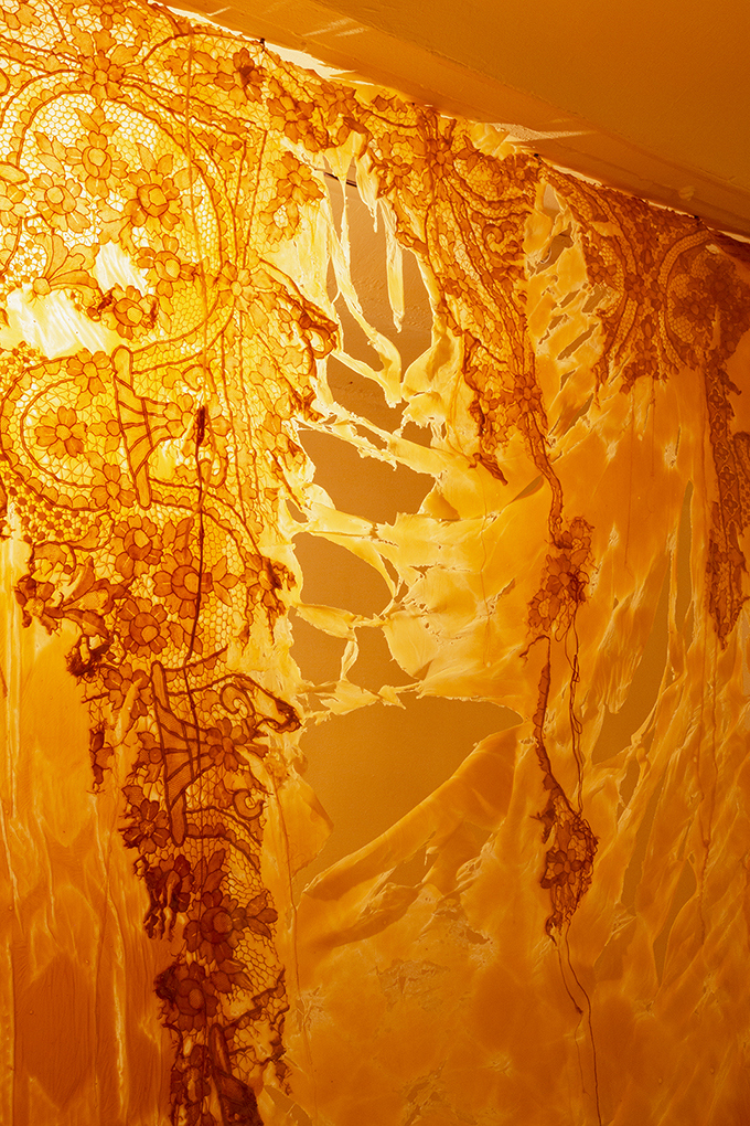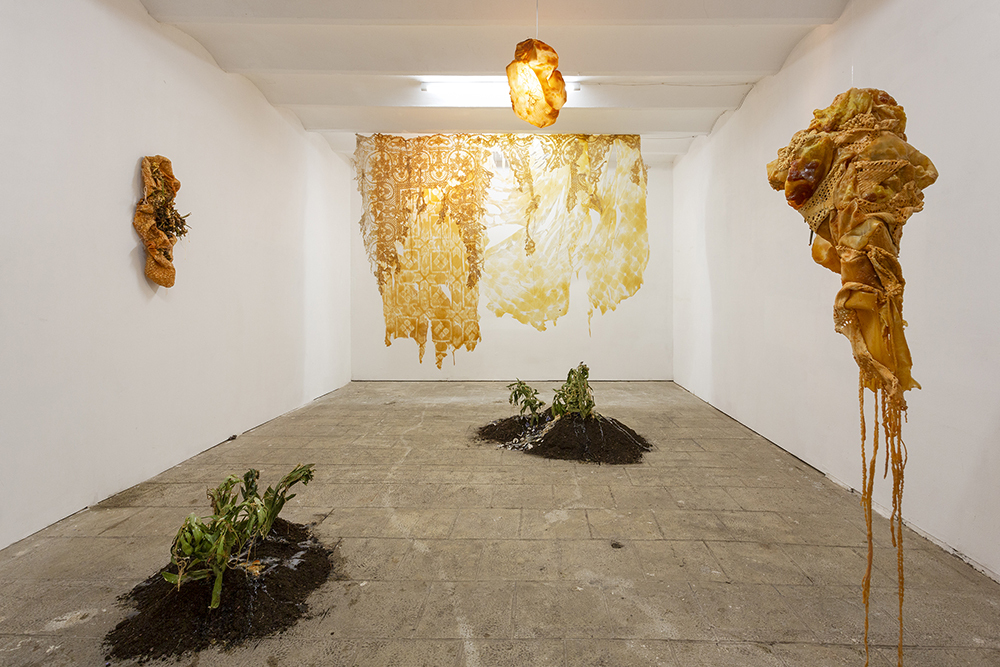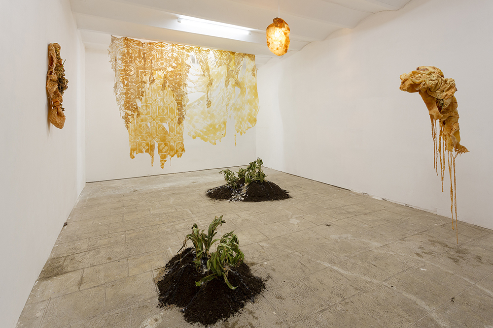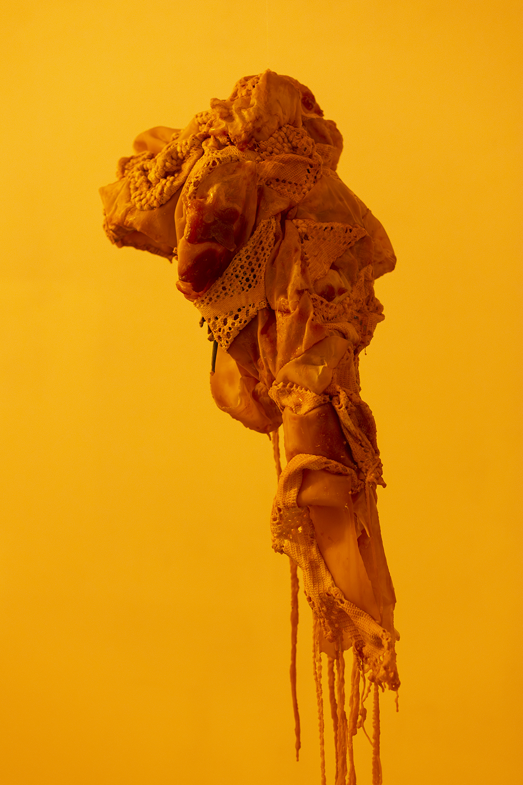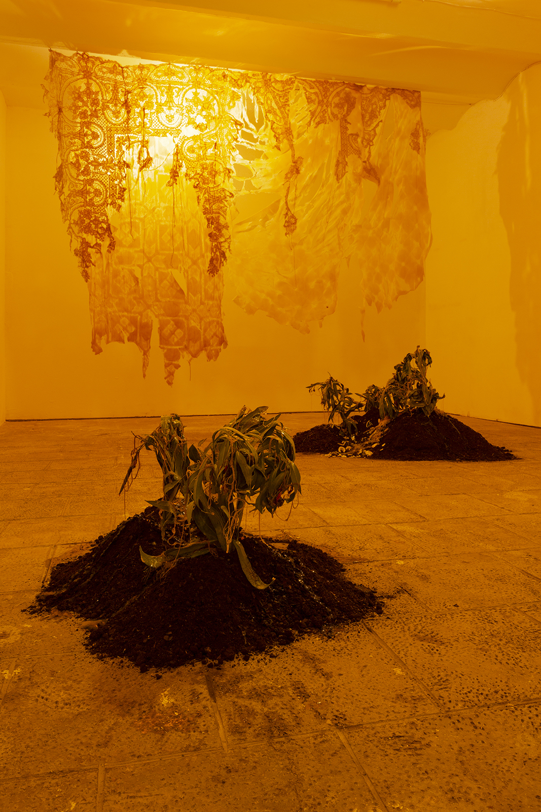 Since the times of myth, we were taught to rebuild our new skin as they and many others did. Our grandmothers wove blankets with which we covered ourselves. Our broken and chewed bodies become monstrous, strange beings.These new skins hide latex and polyester flowers that tell terrible stories. We take refuge and protect ourselves under their threads to look into the darkness without fear. Our wounds, now, ooze latex.