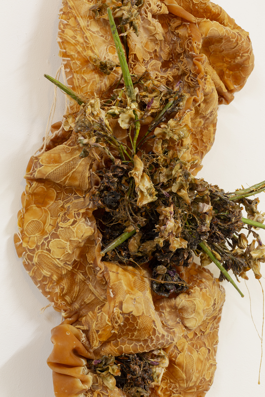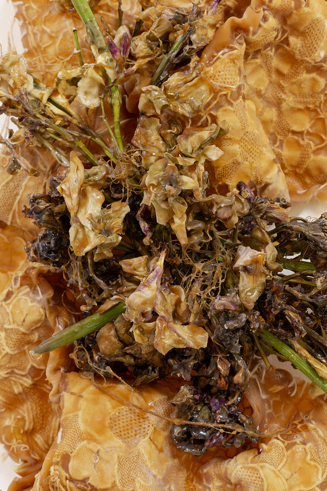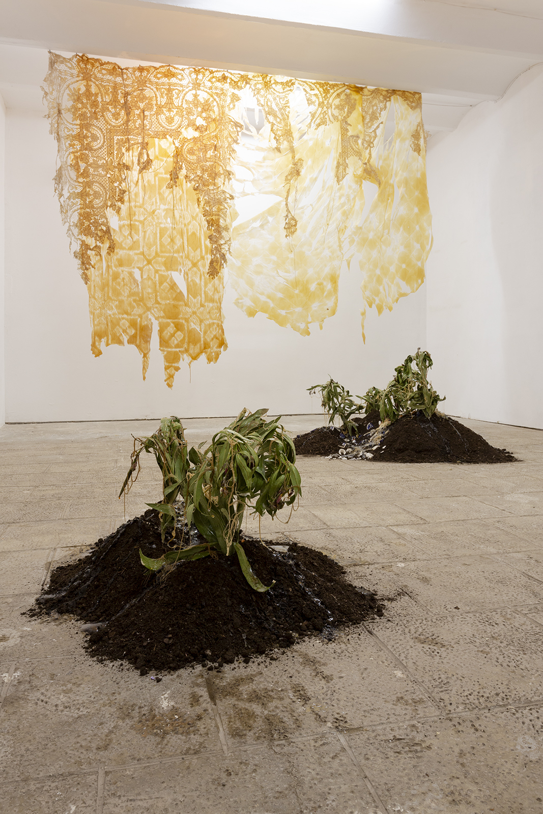 Since the times of myth, we were taught to rebuild our new skin as they and many others did. Our grandmothers wove blankets with which we covered ourselves. Our broken and chewed bodies become monstrous, strange beings.These new skins hide latex and polyester flowers that tell terrible stories. We take refuge and protect ourselves under their threads to look into the darkness without fear. Our wounds, now, ooze latex.