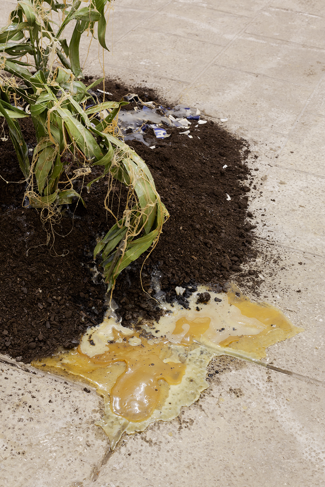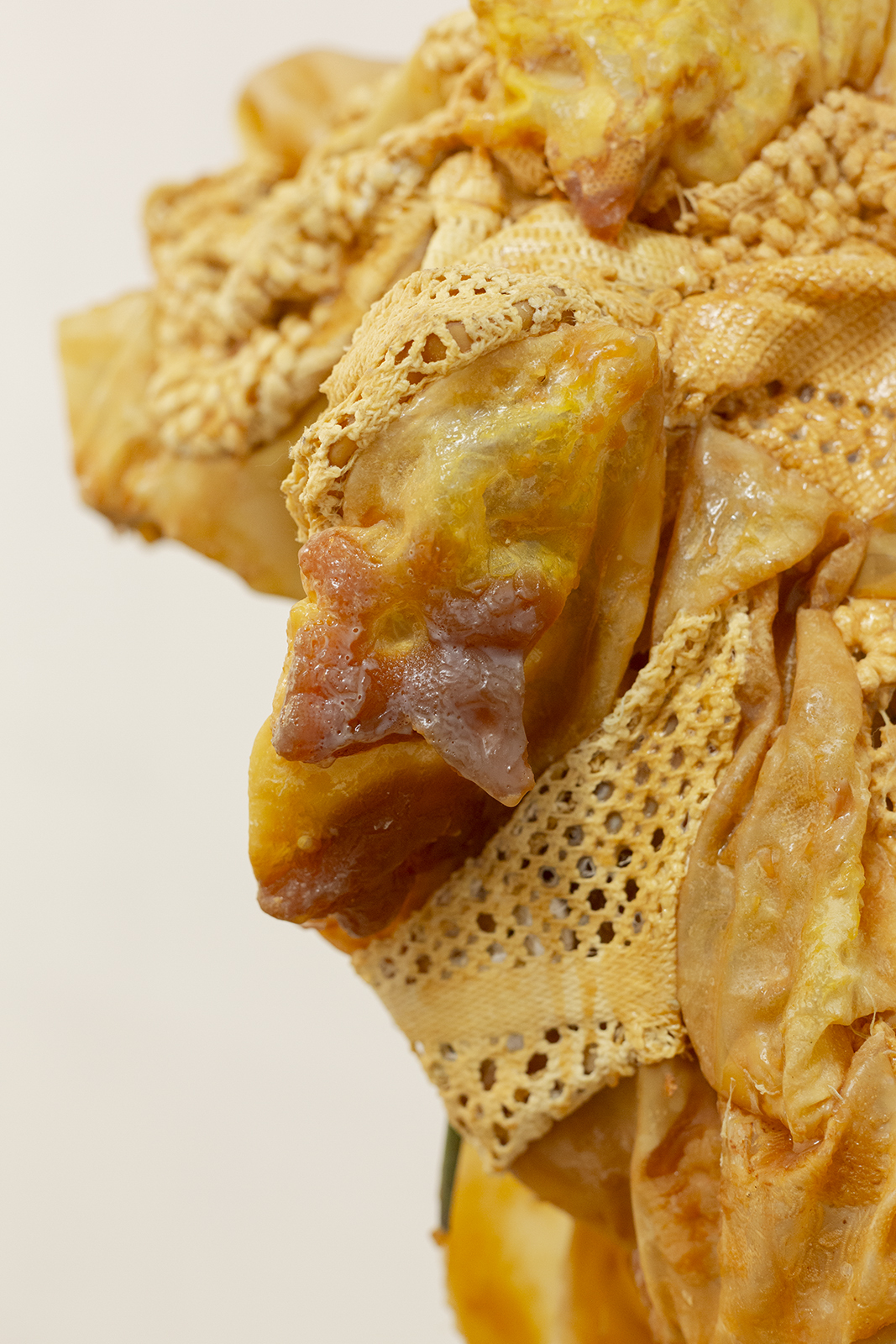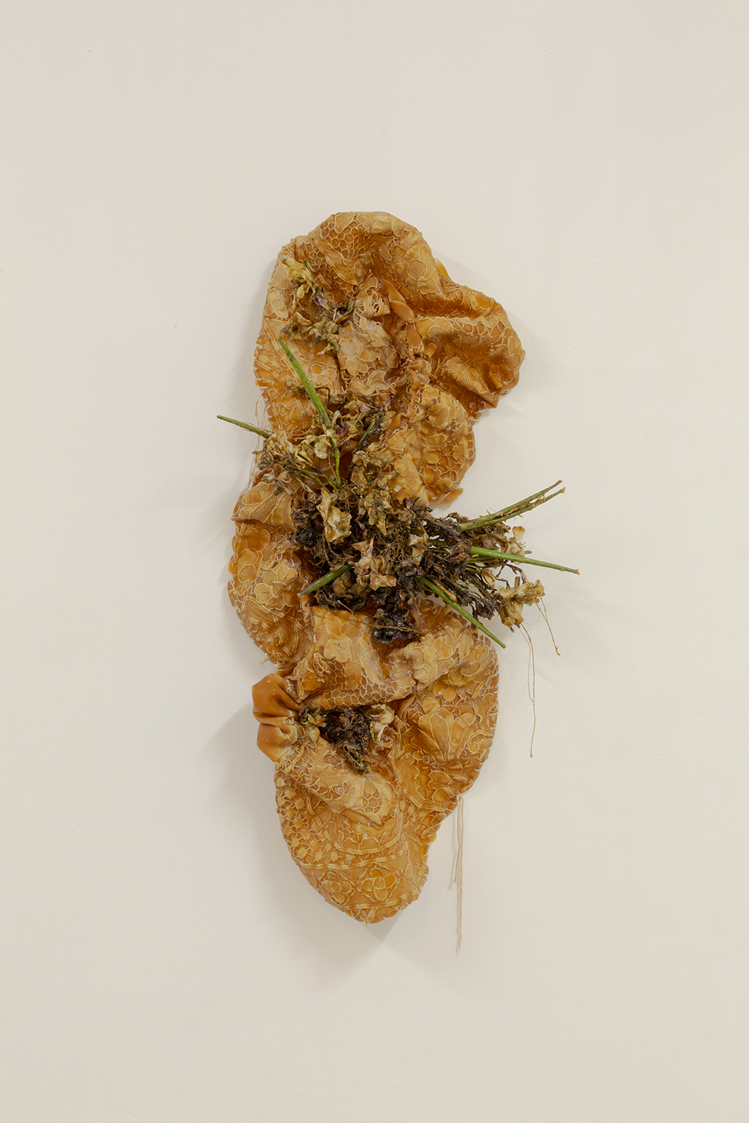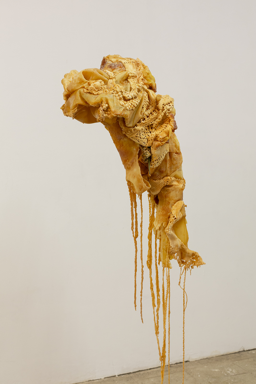 Since the times of myth, we were taught to rebuild our new skin as they and many others did. Our grandmothers wove blankets with which we covered ourselves. Our broken and chewed bodies become monstrous, strange beings.These new skins hide latex and polyester flowers that tell terrible stories. We take refuge and protect ourselves under their threads to look into the darkness without fear. Our wounds, now, ooze latex.