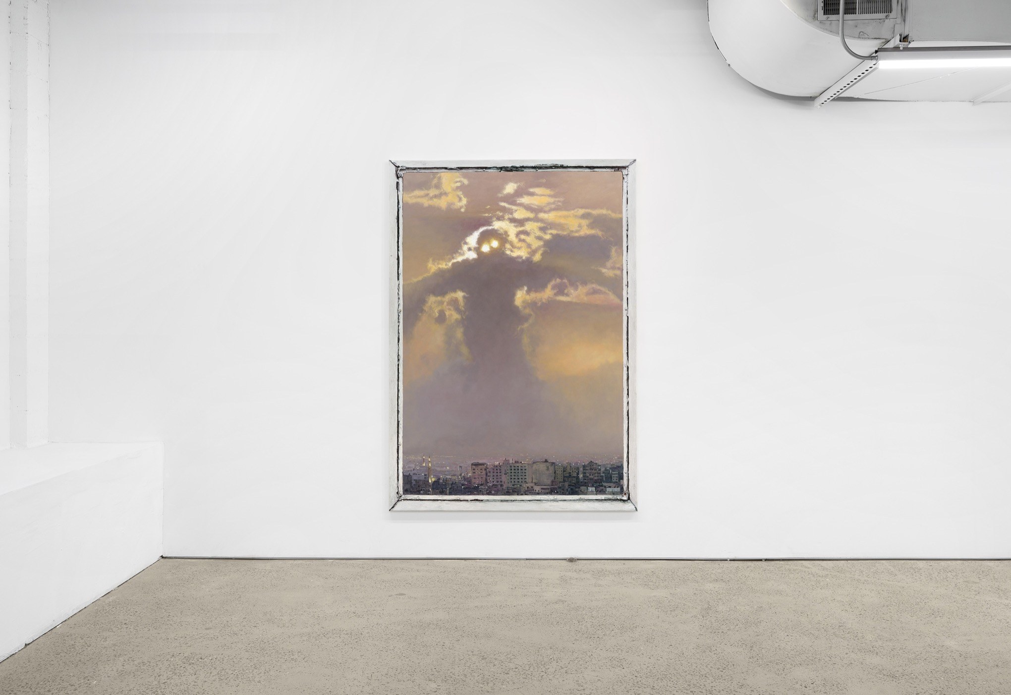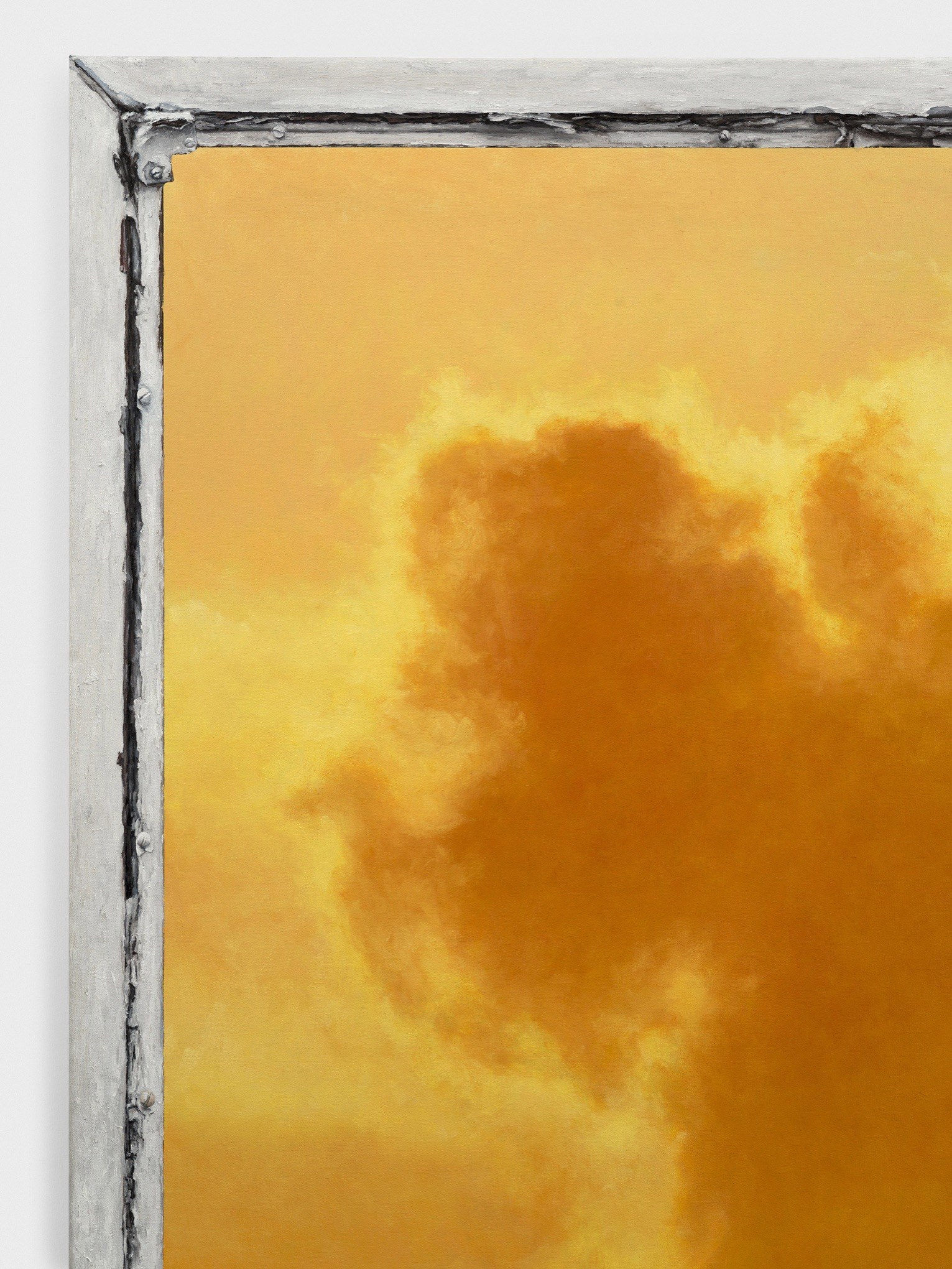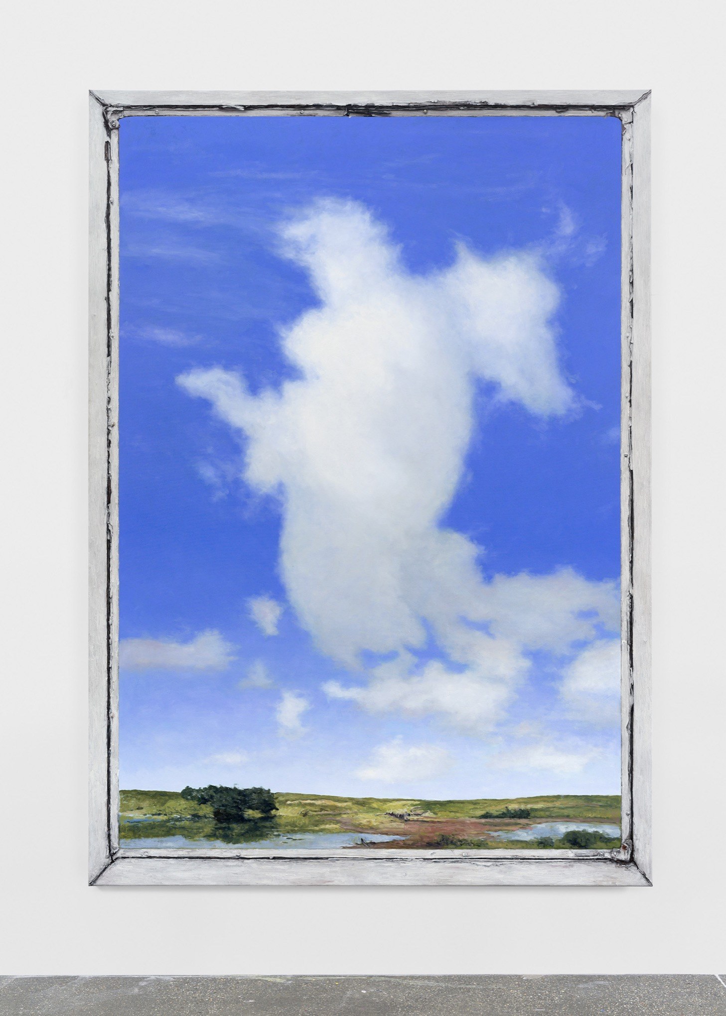 After graduating from the Utrecht School of the Arts in the Netherlands, Roest began to work in focused sets of five to ten paintings, most often investigating a specific theme, premise, or concept in an almost clinical fashion. This latest seriesâ-the angel paintingsâinvestigates the relationship between representation and deception by pushing the potential of artifice to its nth degree. Even the frames are an apt example of illusion: the weathered structures are meticulously rendered trompe l'oeil of actual frames. They invoke time as sunbleached snapshots of the sublime. The eroded, peeling paint of the frames work in sharp contrast with the traditional, pastoral landscapes below while a shining angel is crisply rendered above. Yet what is this angel but the most timeless, ineffable and complex system of allâweather, and specifically crepuscular rays, an effect that occurs when the contrast between light and dark is most evident. Humans have interpreted spiritual images in the sky since the beginning of mankind, since the dawn of consciousness.