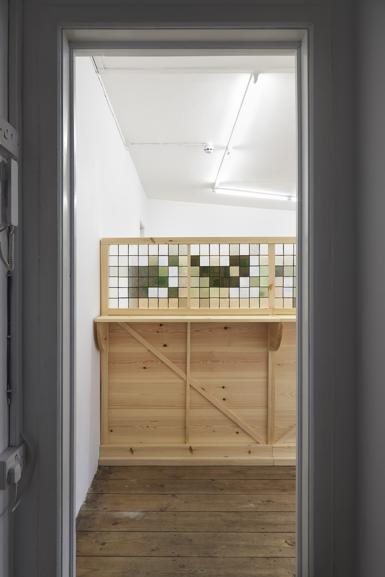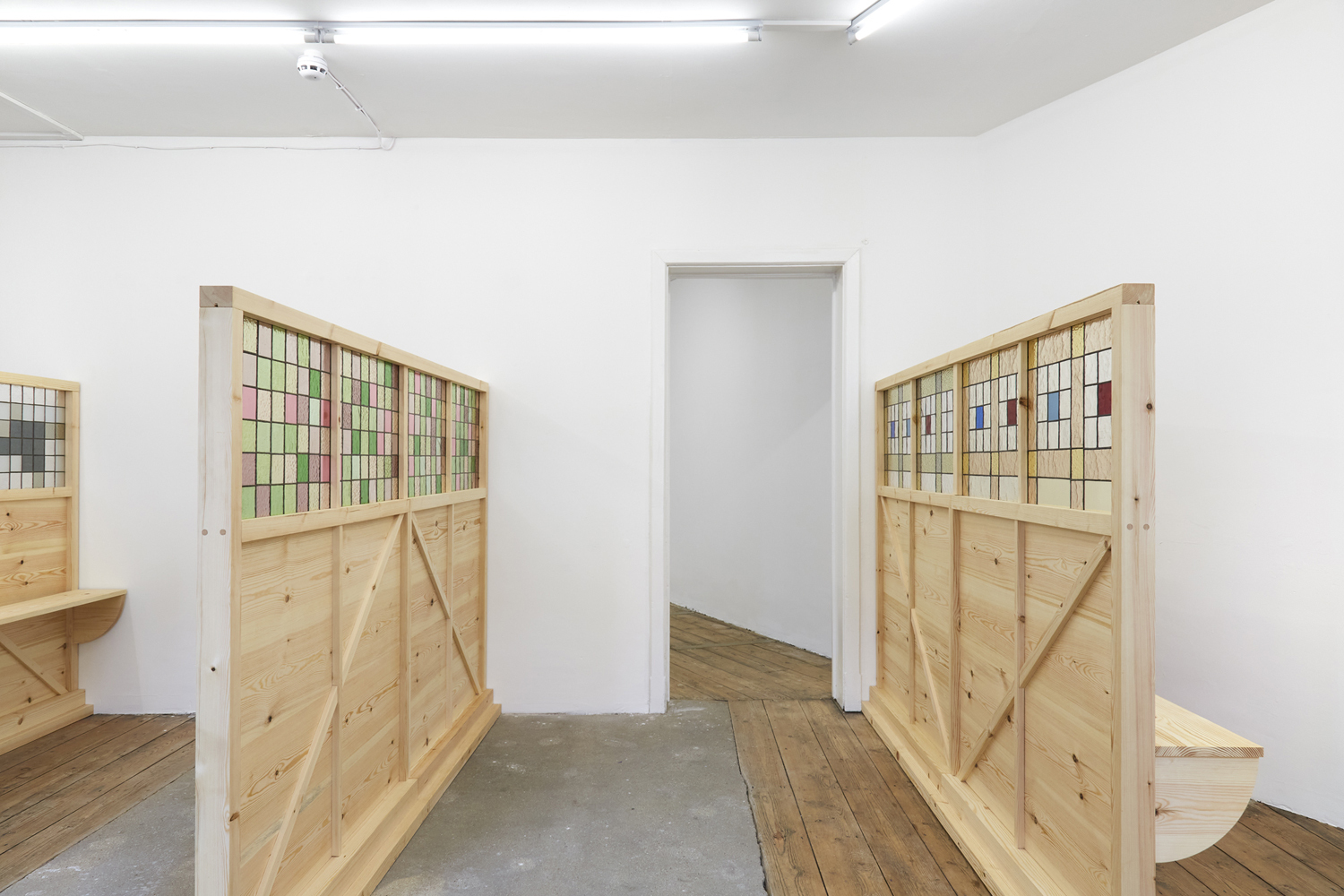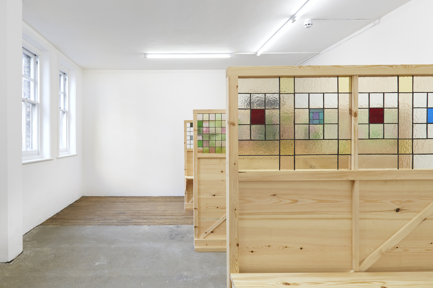 In the main room, three wooden panels divide the gallery into four alcoves â familiar designs and arrangements to evoke the interiors of public houses, also known as âpubsâ, the UK's most popular social institutions. Traditionally used to cordon off spaces and create an intimate setting for customers, the panels embody one of the exhibition's ambiguities: public spaces acting as private ones, and vice versa. They offer a sense of security, refuges for escape from everyday life, concealment and oblivion. If they conjure places operating in complex dynamics, both central actors of communitiesâ social fabric and profit-driven enterprises, Hill's panels also carry an ambiguous and fragile polysemy.