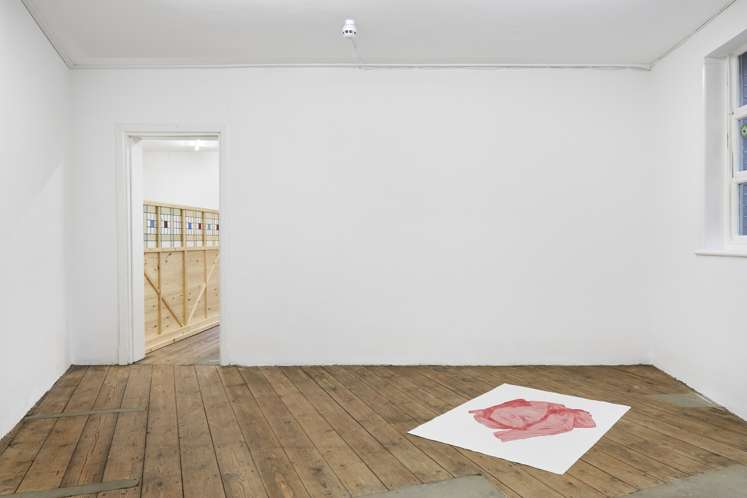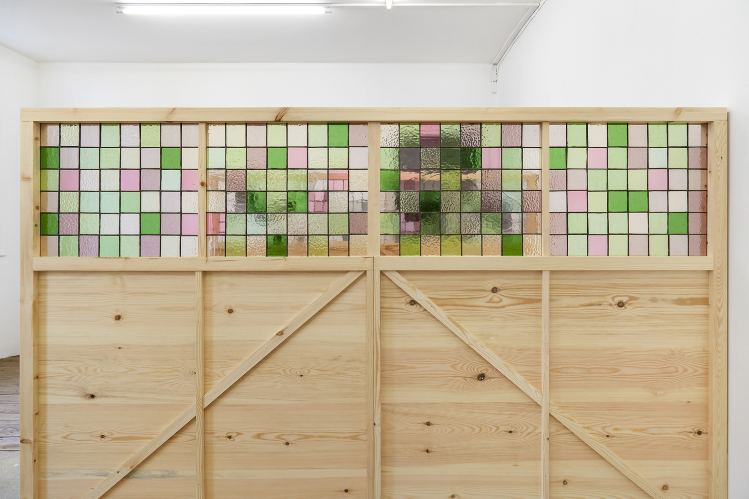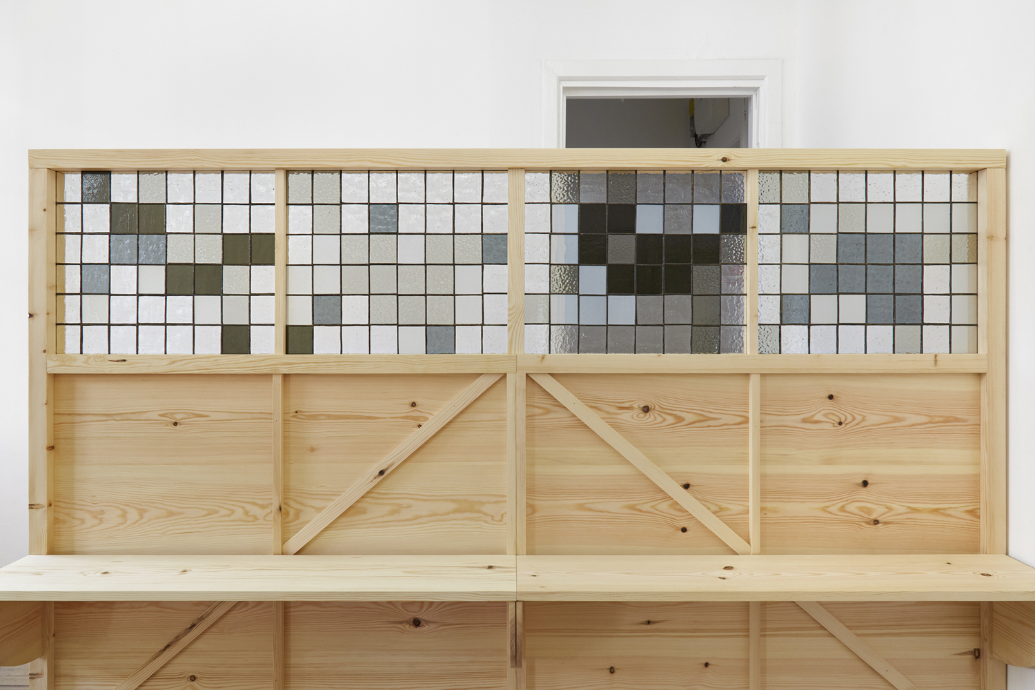 In the main room, three wooden panels divide the gallery into four alcoves â familiar designs and arrangements to evoke the interiors of public houses, also known as âpubsâ, the UK's most popular social institutions. Traditionally used to cordon off spaces and create an intimate setting for customers, the panels embody one of the exhibition's ambiguities: public spaces acting as private ones, and vice versa. They offer a sense of security, refuges for escape from everyday life, concealment and oblivion. If they conjure places operating in complex dynamics, both central actors of communitiesâ social fabric and profit-driven enterprises, Hill's panels also carry an ambiguous and fragile polysemy.