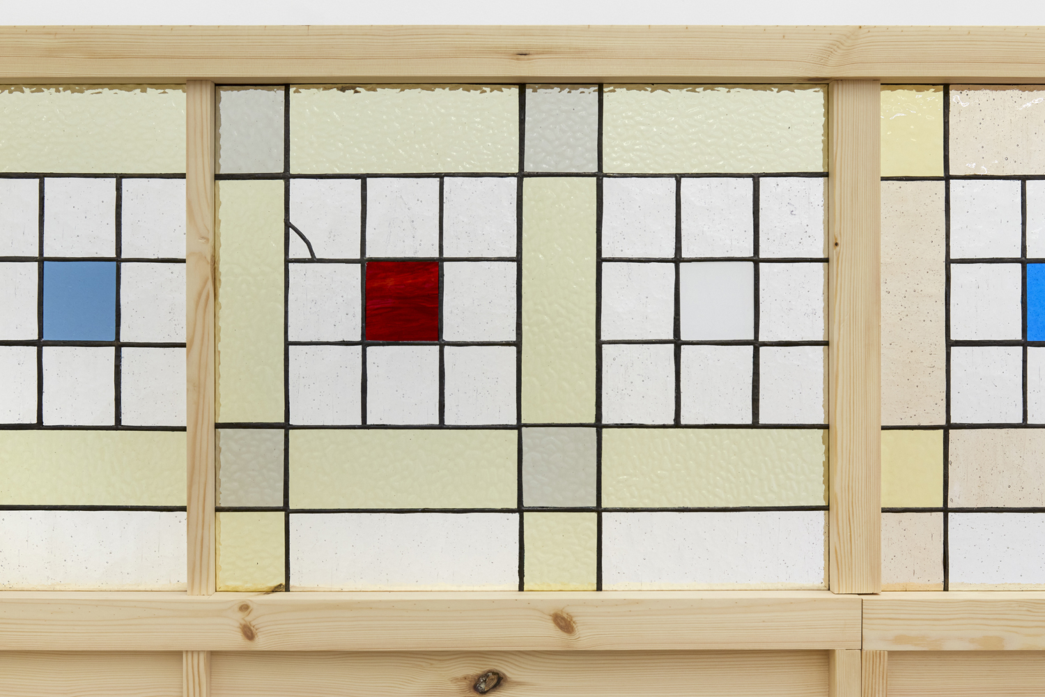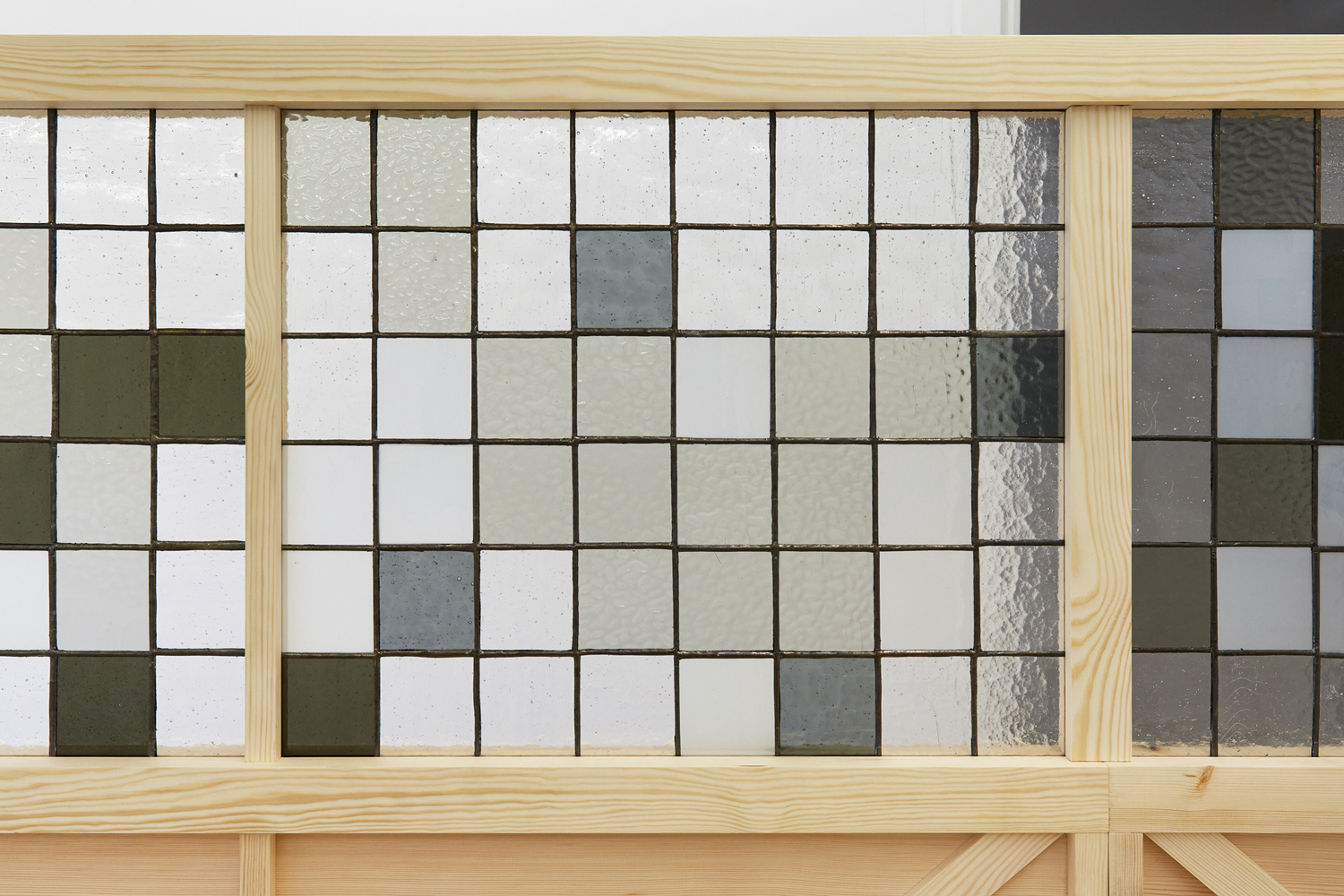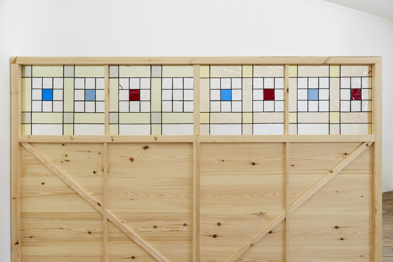 Each panel is adorned with an assortment of decorative elements, including corbels, traditional plinths and long rectangular stained-glass windows above a countertop. Despite appearances, the partitions are deceptively precise objects. They defy the notion of ready-mades, which typically involves manufactured objects stripped of their original utility and transformed into abstract versions of themselves. Creating technical drawings incorporating standardised timber, Hill built these structures alongside her immediate family. With precision, she assembles the wooden racks, cuts the glass elements and creates the patterns. The portrayal of the artist at work is central to approach her art; these repetitive gestures are ingrained within a precise time and place, orchestrated on her family's land and synchronised to the organic rhythm of a non-urban environment.