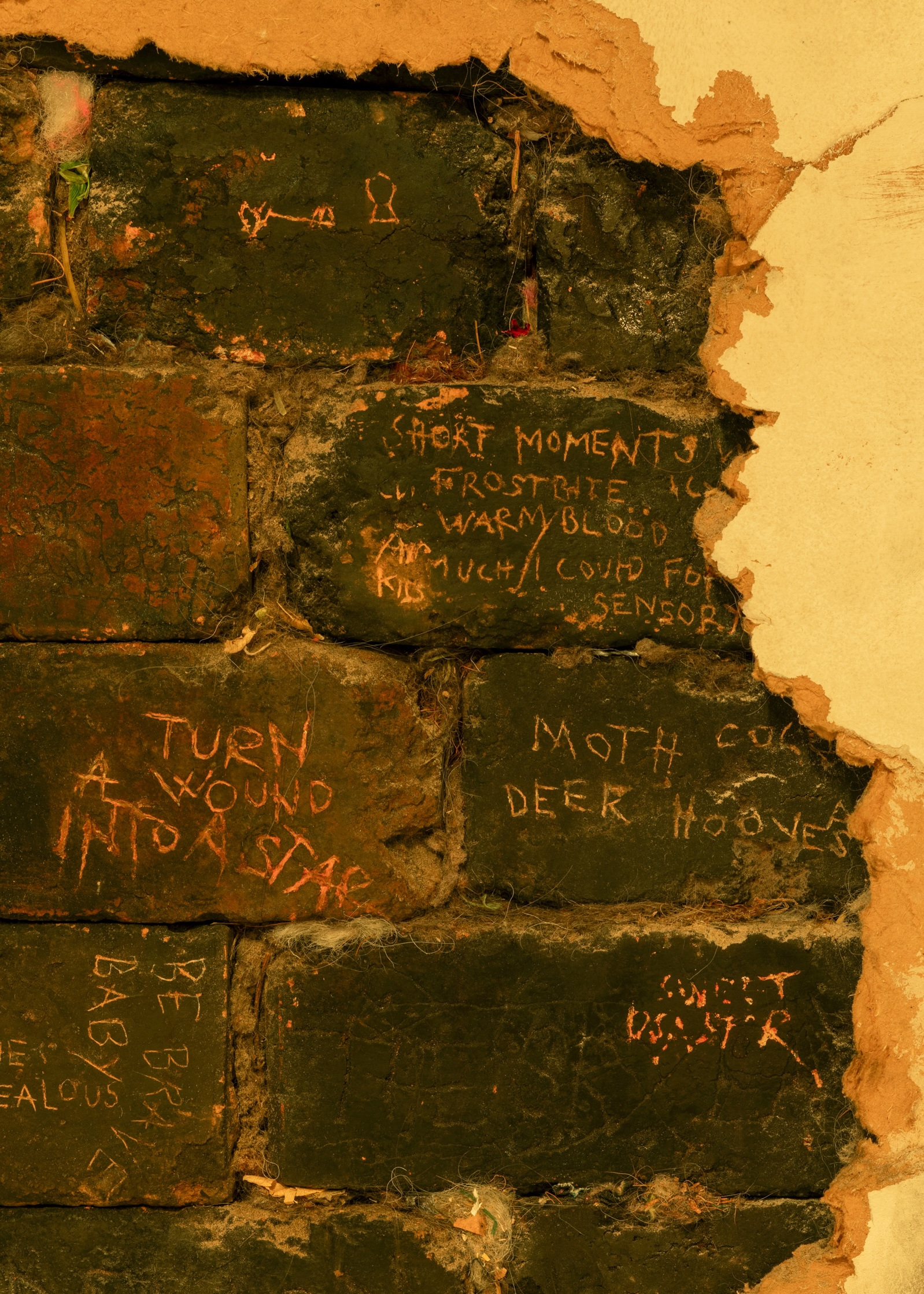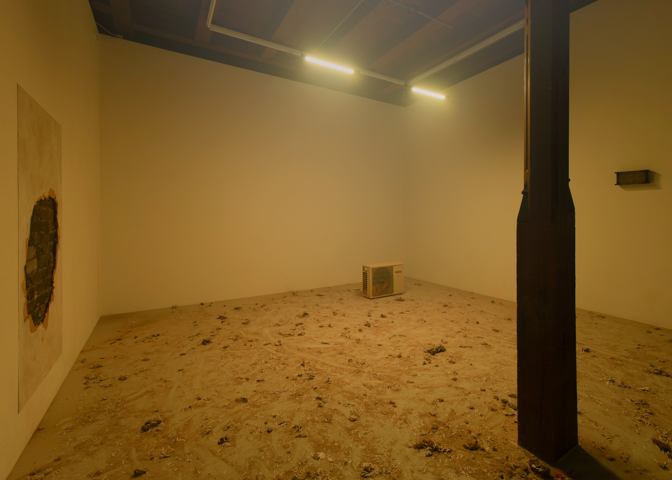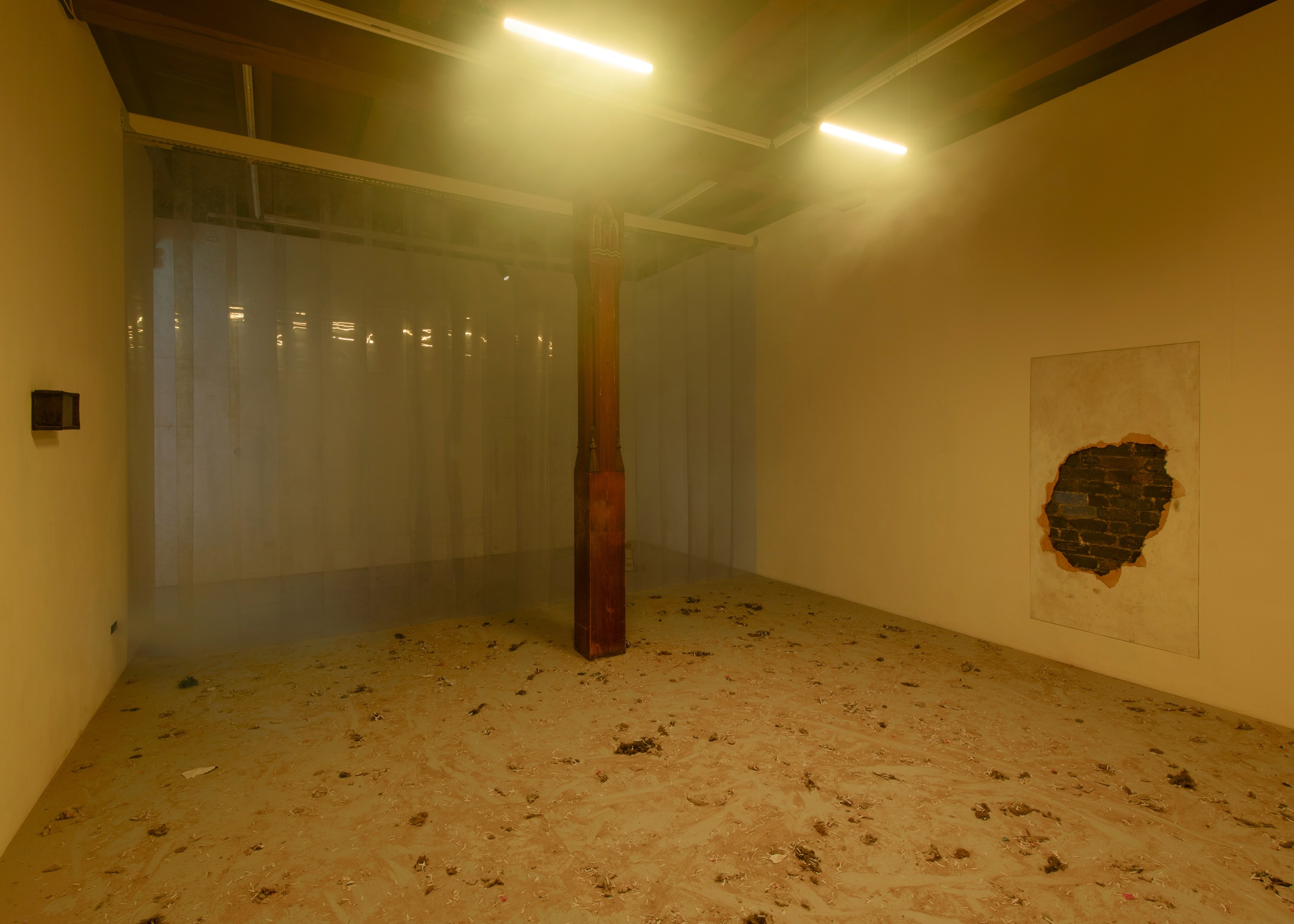 For Grüner & Vogelius, everything vibrates. A friction between narratives and materials seems to allow a transformation to begin. Something stands still and something moves in a constant exchange. The seeds for what the artists call the amorphous legacy of the future are laid. The amorphous remains of the future are understood as what remains in the future and leaves clear traces, without a fixed or determined form. With the exhibition Surge, Grüner & Vogelius speculate on what can arise by breaking down the exhibition space and re-appropriating its materials. The starting point for the exhibition is the consistent building material of the former church: Medieval large bricks. Original bricks and bricks with engravings that have the character of readymades are stacked in a monk bond in the space of Platform. A hole in the white wall testifies to a break with closed spaces and the defined forms, dualistic identities and linear understandings of time that characterize the present. Casts of failed Medieval large bricks in epoxy break with the character and connotations of the original bricks. In the encounter with the failed constructions of bricks, with their trembling, opaque materials and the original bricks, principles of how materials, form and space should be built and may appear are renegotiated. A renegotiation that takes place right down to particle level. Small particles change character based on the space or the context they are in. For Grüner & Vogelius, dust is the essential particles. In quantity and number, dust can take many forms, but it can also be easily stirred up and set in motion. At the same time, it can store endless stories that can rarely be seen at first glance. Staged light and dust make the elements of the exhibition appear deviant, vibrating and fleeting.