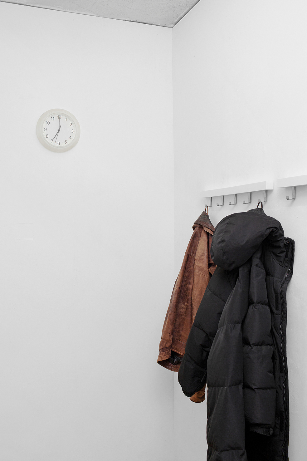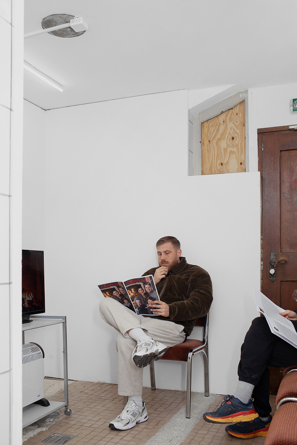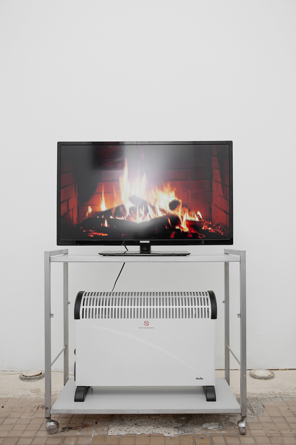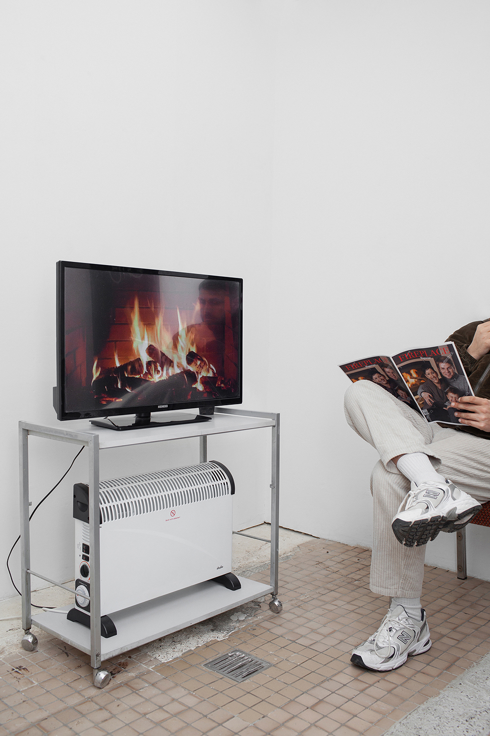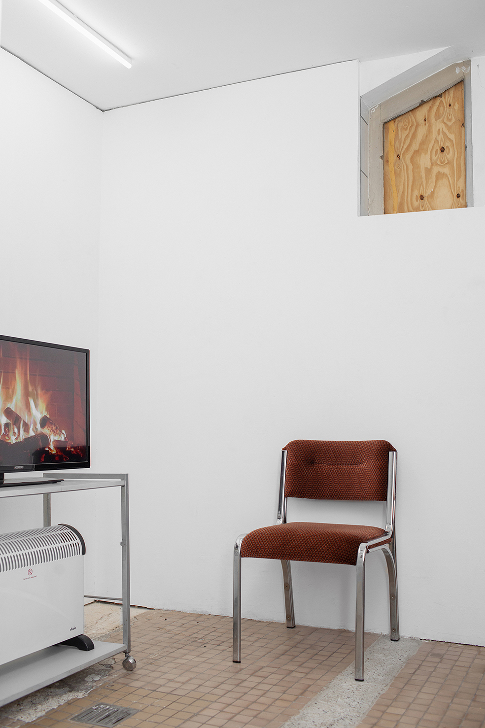 Chairs placed against the wall, a television playing a video of a fireplace in a loop, and a radiator; an arrangement that doesn't draw too much attention to itself and, in my opinion, only serves as a backdrop. In my opinion, something else, something I can’t quite point my finger to, is in the foreground of the exhibition. Someone referred to this exhibition as a waiting room, but that simply doesn't capture the given situation accurately. What is this space for? Not for waiting, not for warming up, not for experiencing art, and not for talking. I tried to follow the audio book; it was "Waiting for Godot," but my thoughts kept wandering back to memories of my father. I don't want to completely dismiss the interests of the artists, but isn't every exhibition primarily a canvas for the mental projections of the visitors, a place that triggers an uncontrollable mental cinema?