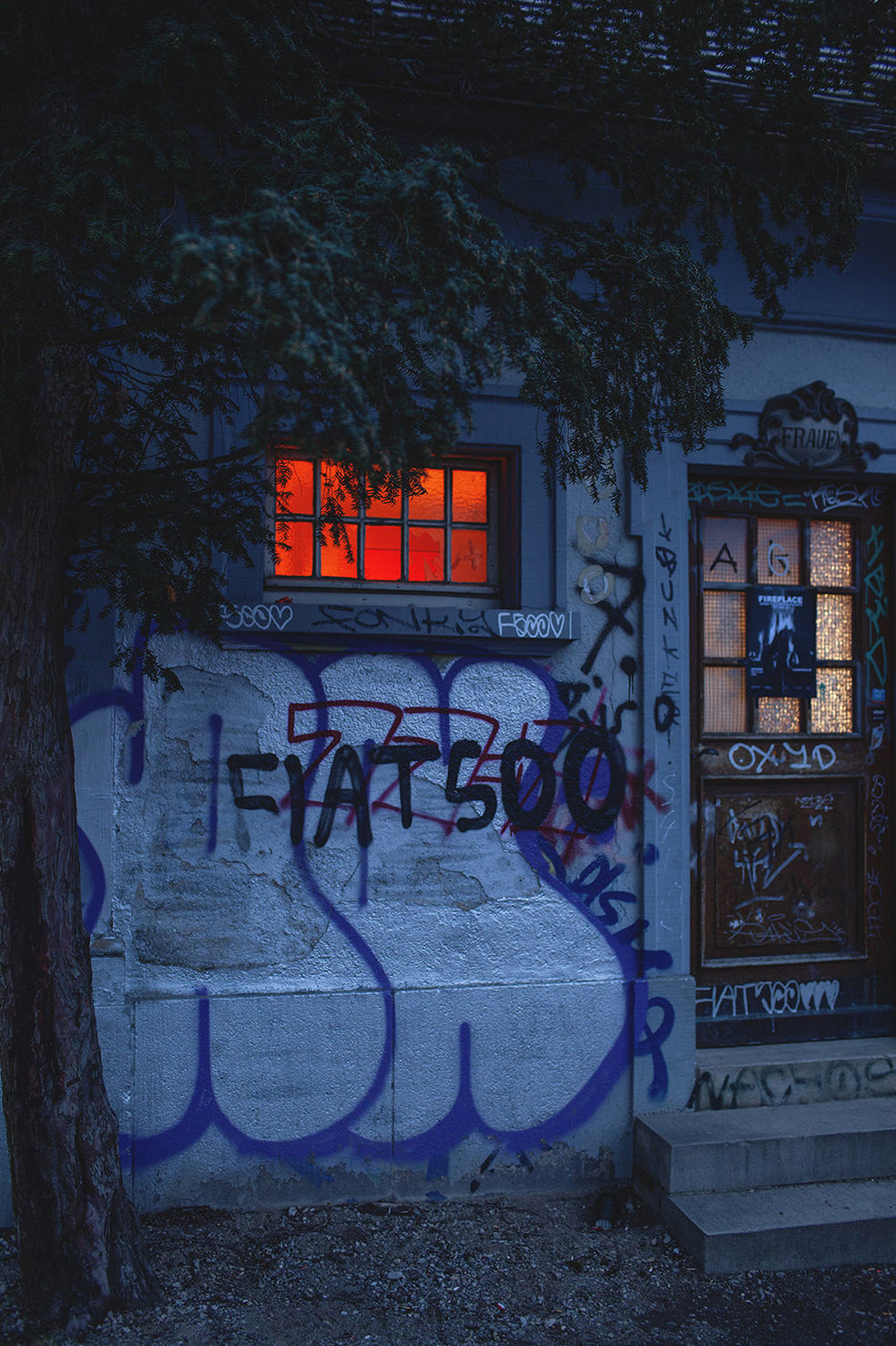 Actually I had expected a public toilet here, a "hygiene facility," to use that lovely expression. And indeed: Inside, traces of its previous use are still visible, from the stalls, the floor tiles, to the raunchy scribbles on the walls. But it seems to me now that it's a different kind of facility.