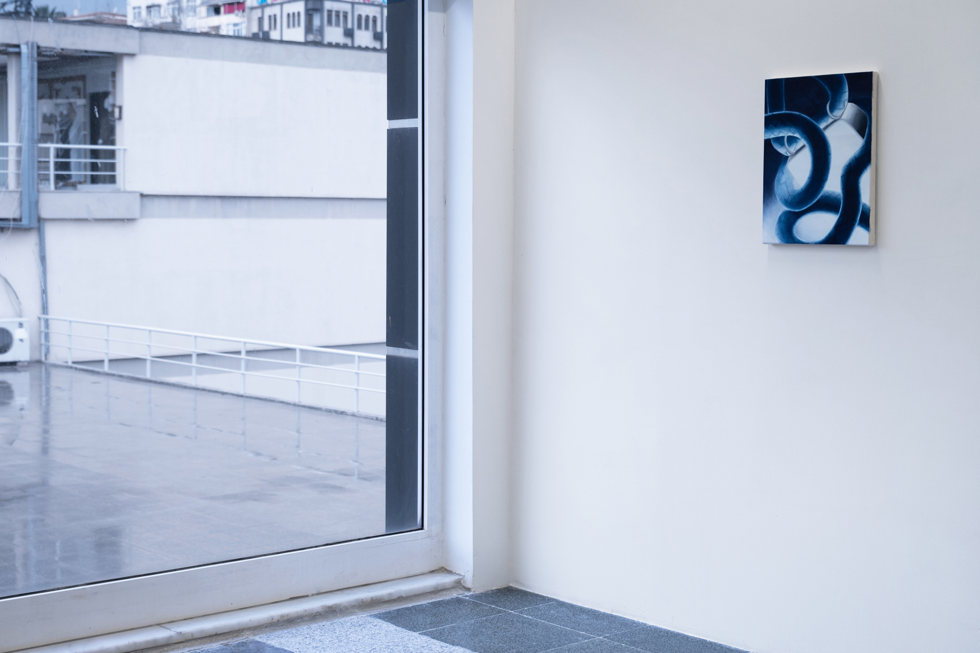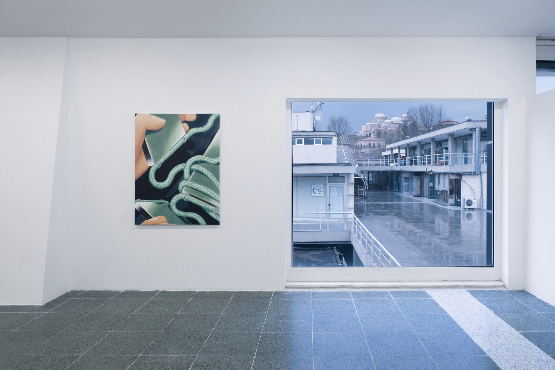 The title of the show, Return to Sender, refers to the alluring but strange stage of being sent somewhere unfamiliar to work, where things might get mixed up or lost, or not be received as intended. It can be read as missed messages or tangled up communication â mirrored visually in Antoniaâs painted, maybe dysfunctional screens. Or reflections on digital signals â as in Simonâs drawings being produced on a tablet and sent through a printer. It also alludes to them returning to a place they know and have been before, Istanbul, creating a small personal time travel for the duration of a few months.