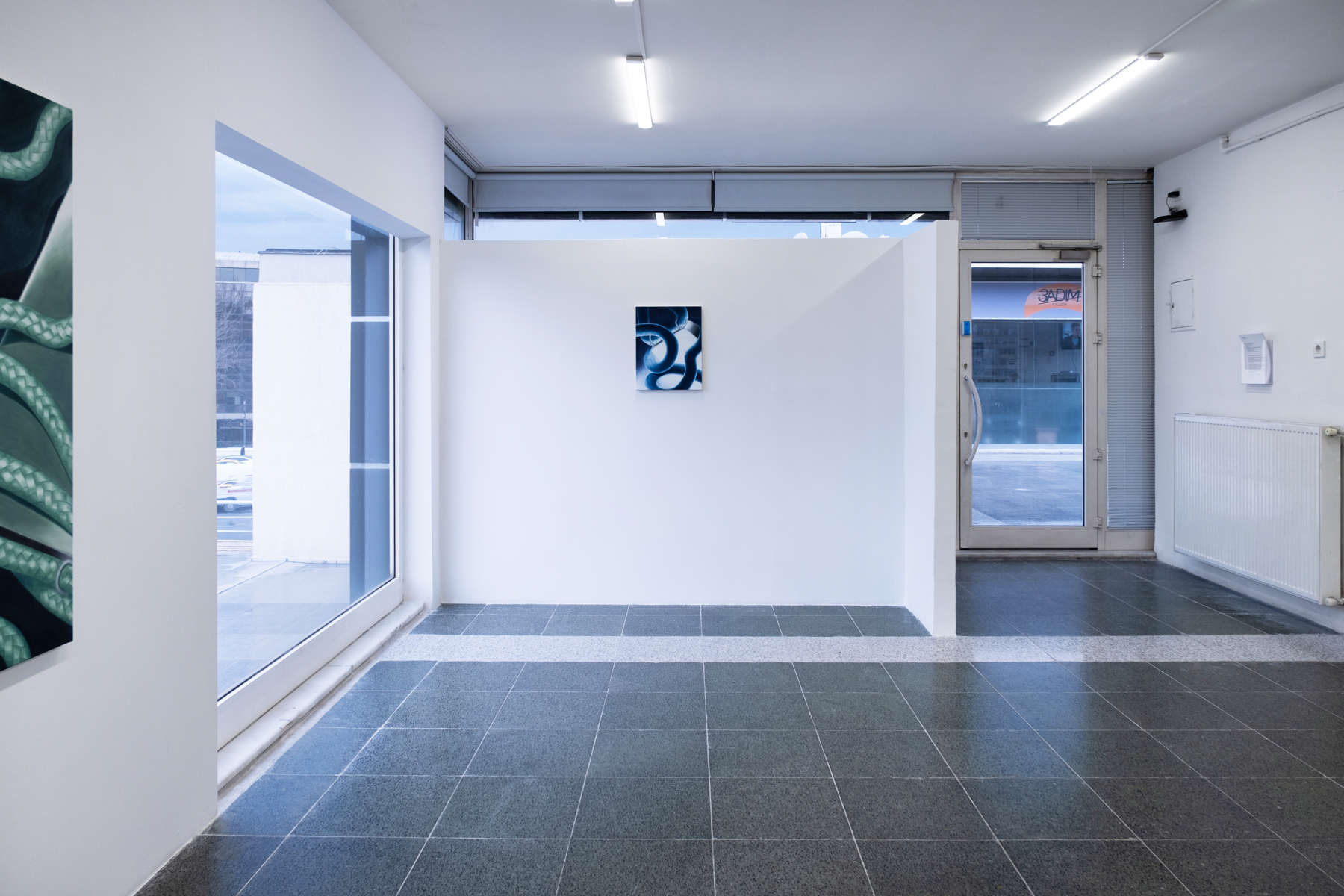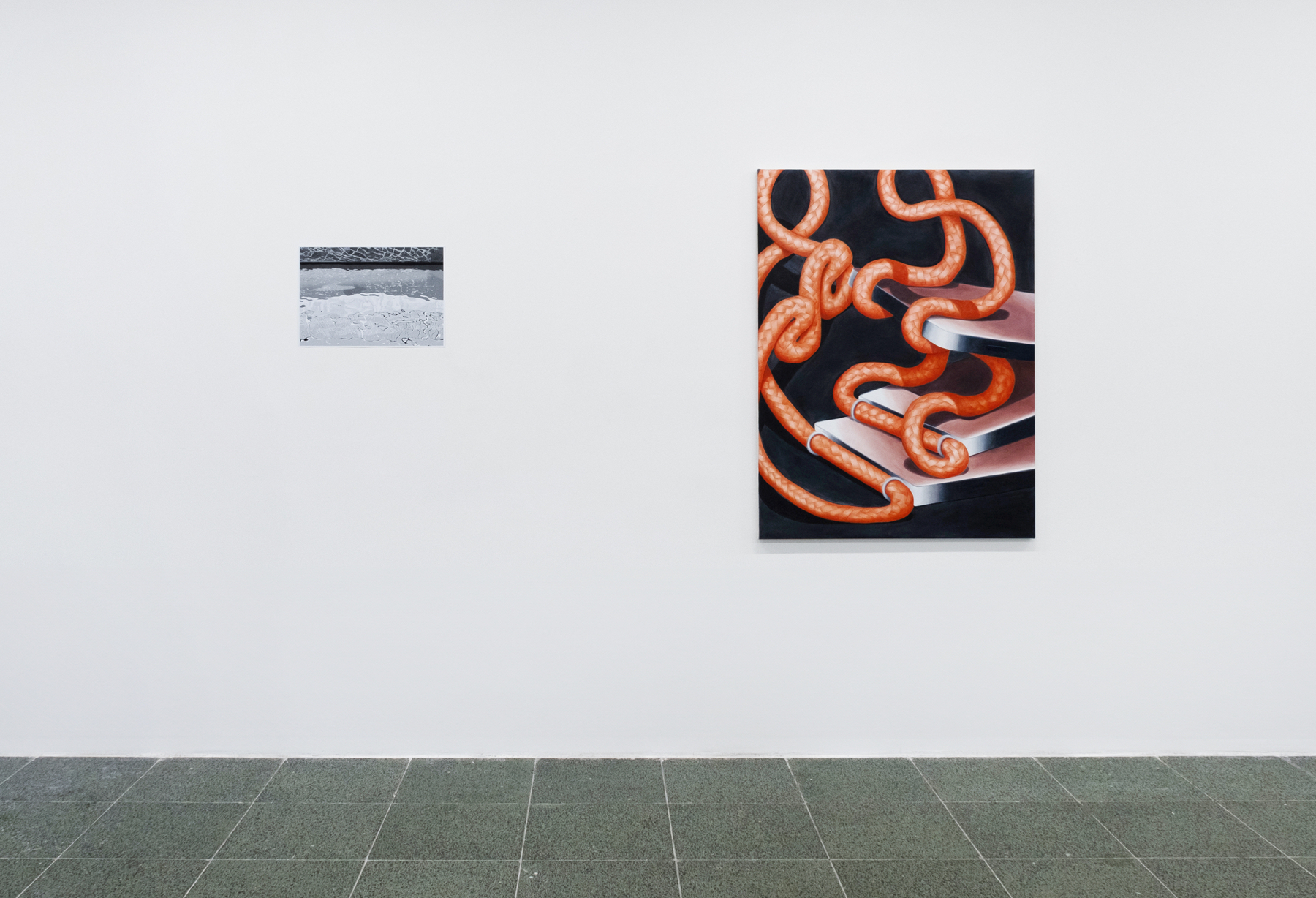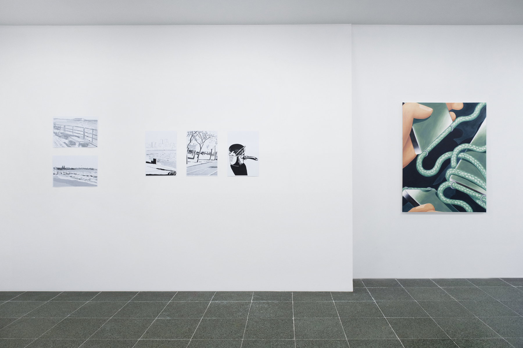 Antonia is showing a series of paintings, which are connected to each other by recurring forms and contents, playing on color and metamorphosing objects, as well as small drawings. Simon focused his production on digital drawings. He is showing black and white sketches â quick impressions of lights, shadows, and structures of his surroundings â as well as more dense observations using vector-based graphics, grit patterns and layers to create an image.