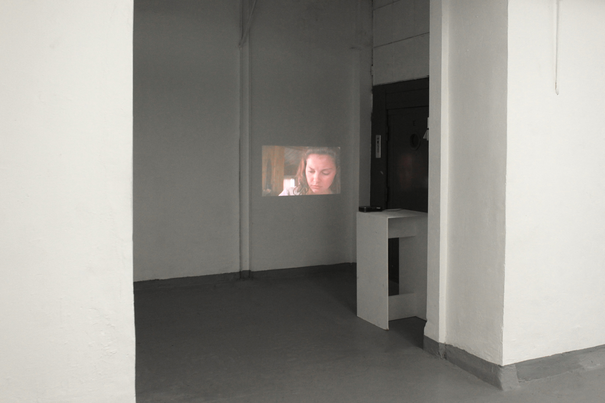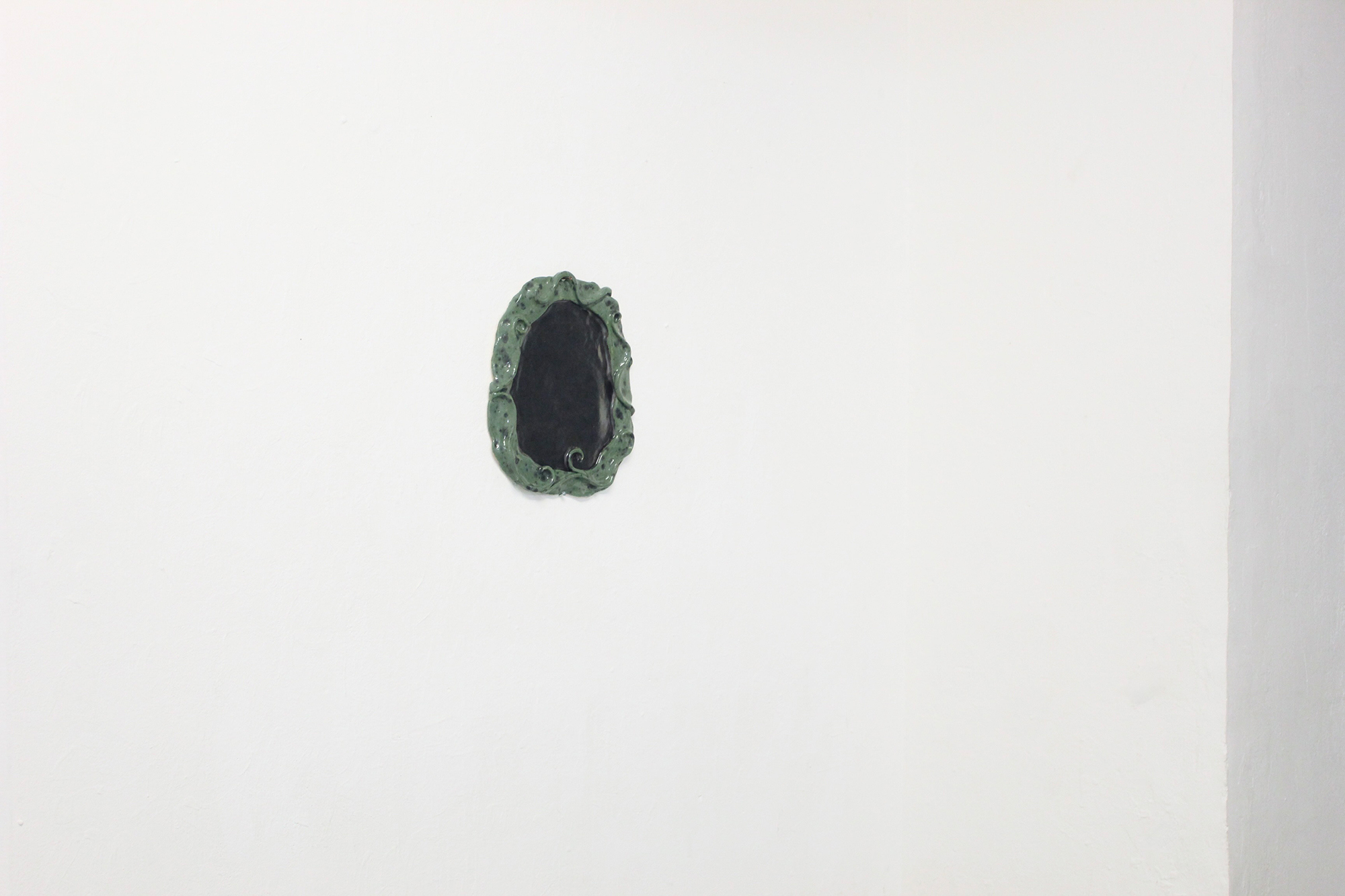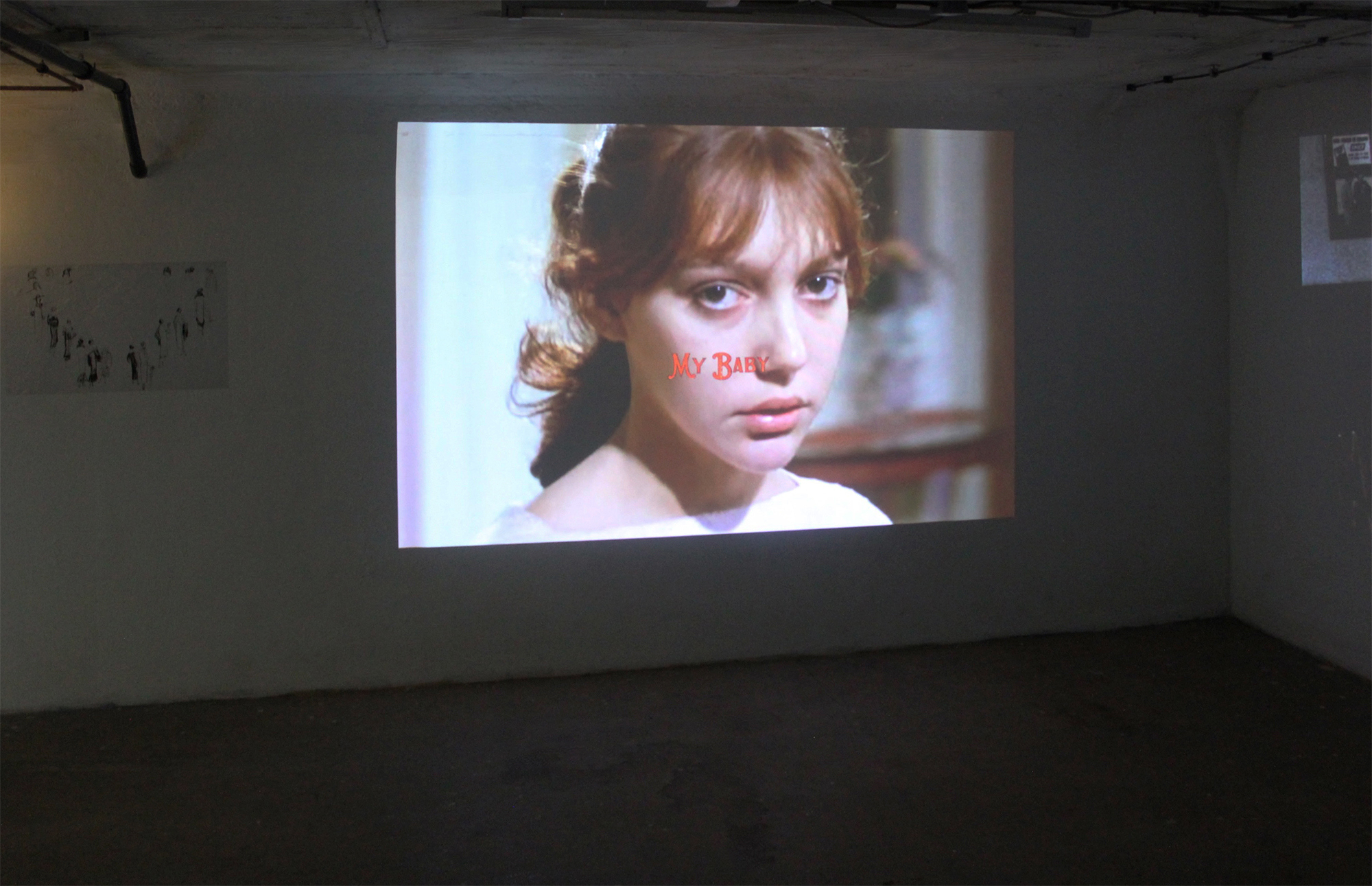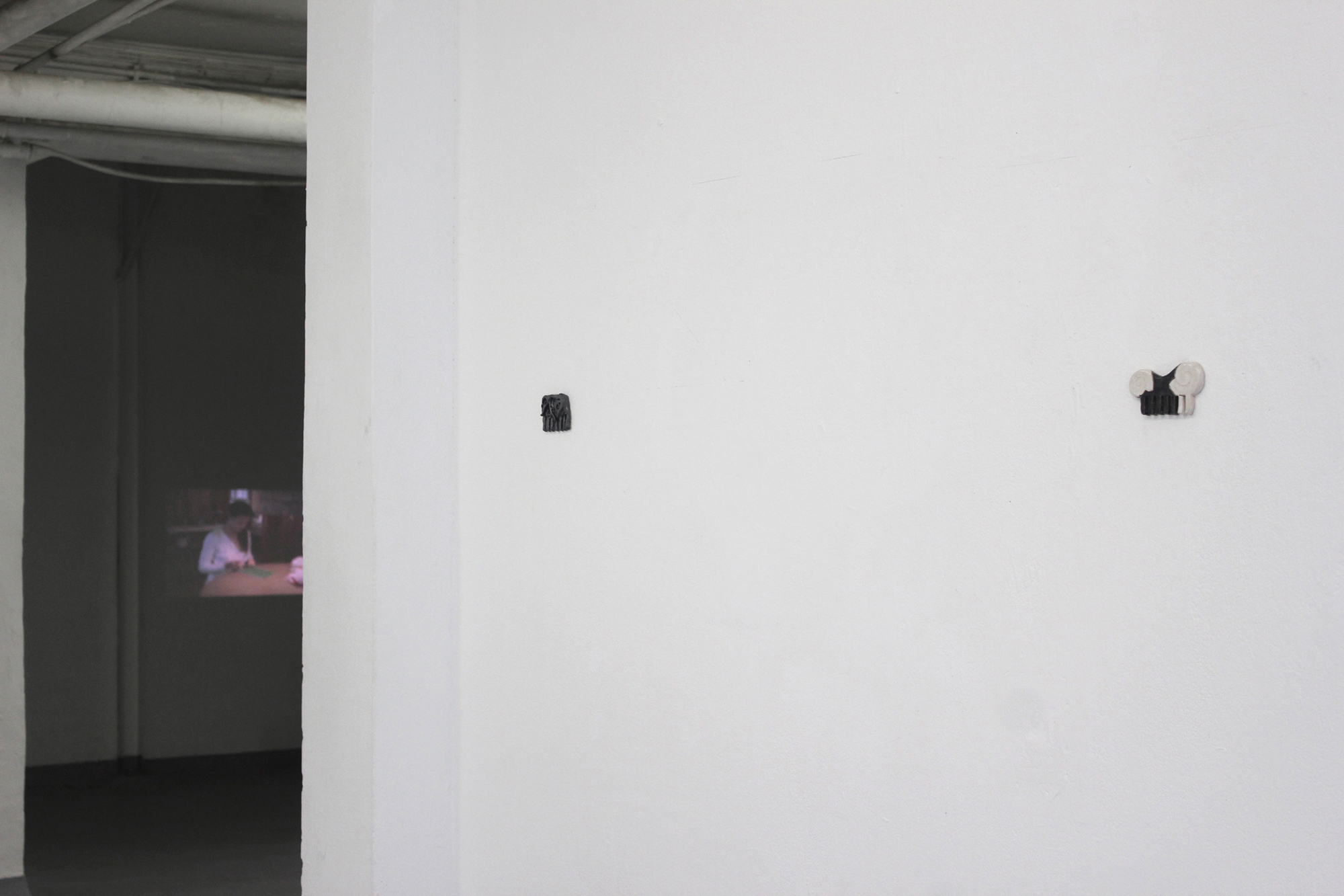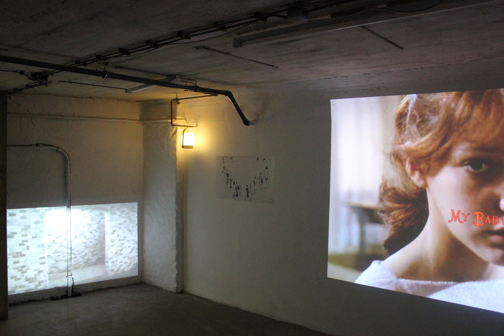 Ceramic works resembleing childhood memories and objects out of the fairytale of Snow White are combined with collages and a slide show that make use of found images in a diary-like way.
