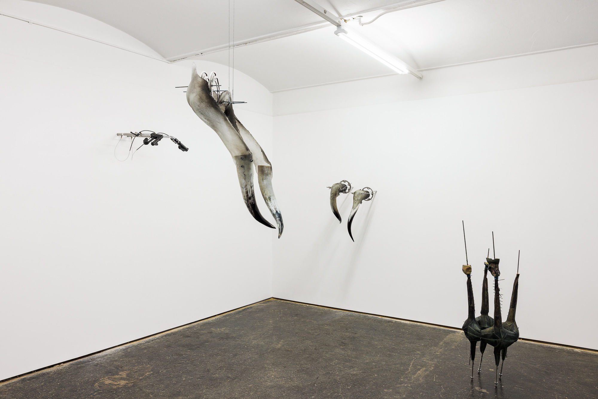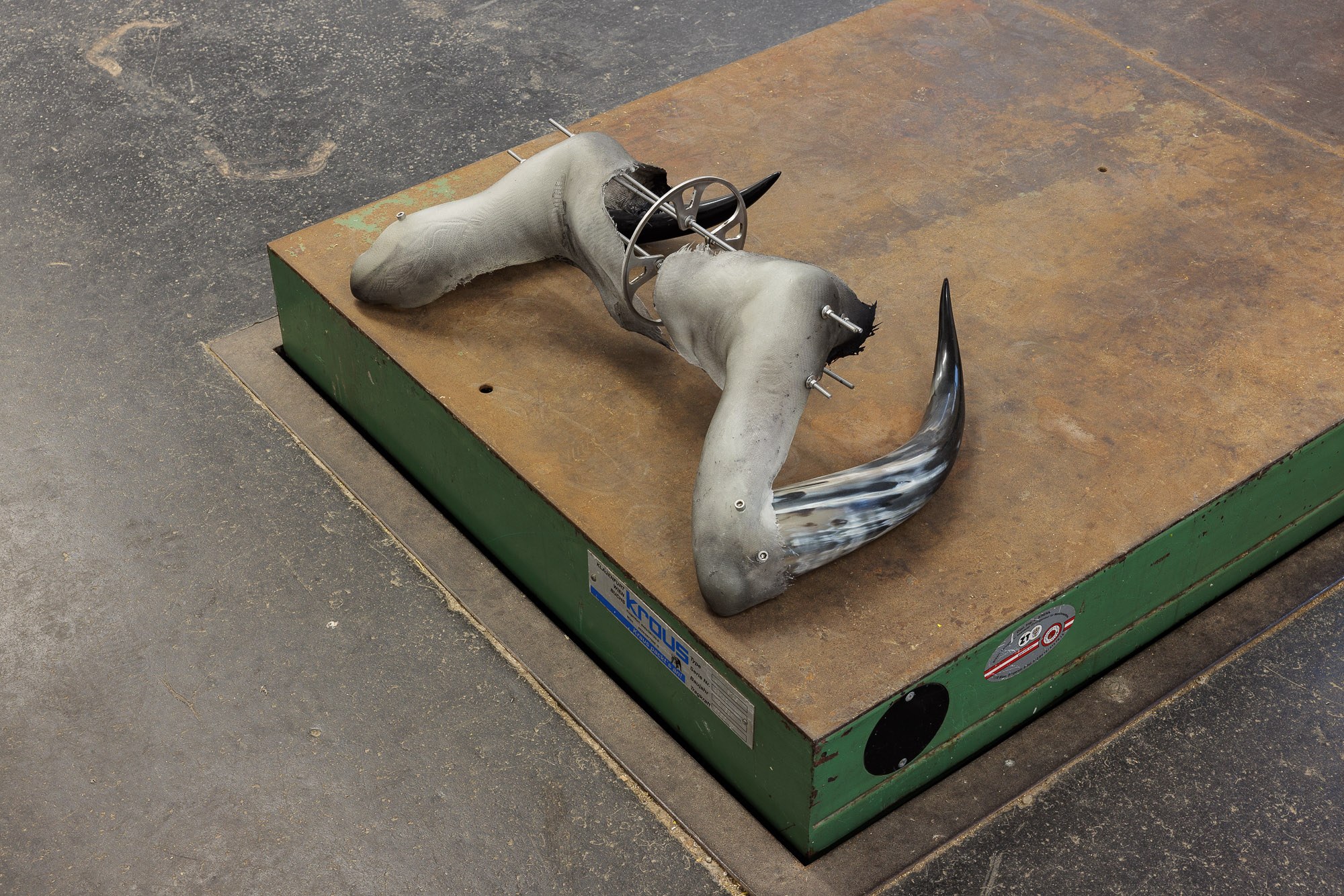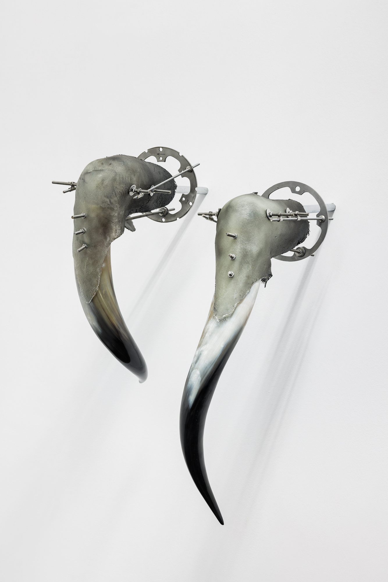 From this grotesque introspection, Sophia Gatzkan redirects the focus outwards again. Her prosthetic body extensions rest neatly lined up on the wall like armours, waiting to be put on at the right moment. The sinister combat equipment appears to originate from a highly advanced manufacturing process. The knees and shoulders have been moulded from glass fibre and plastic to fit the body perfectly. Attached to the end of each mould are animal horns that are as beautiful as they are menacing. Symmetrical screw connections with thick brake disks are reminiscent of complicated fractures and the strangely exciting feeling of carrying metal in your body.
