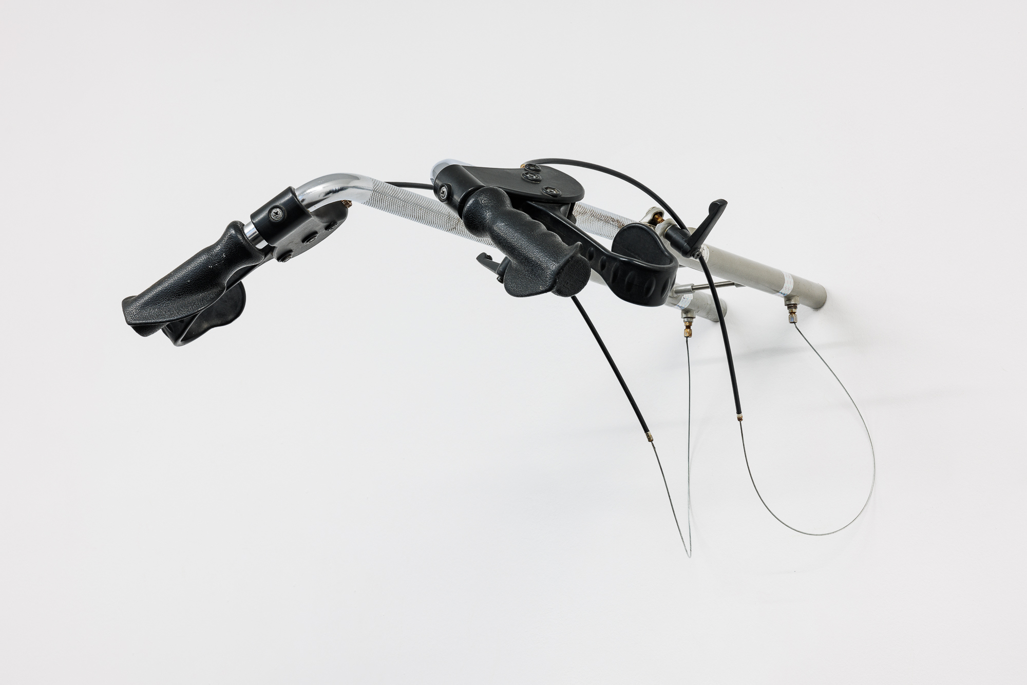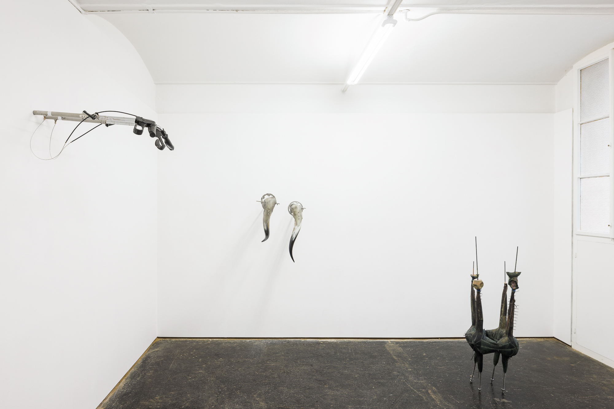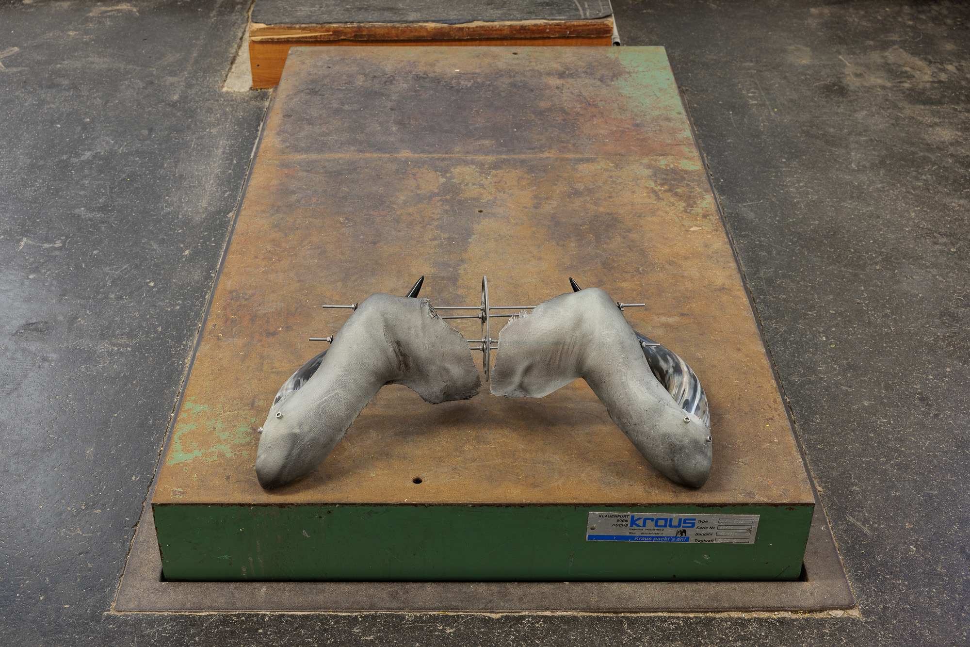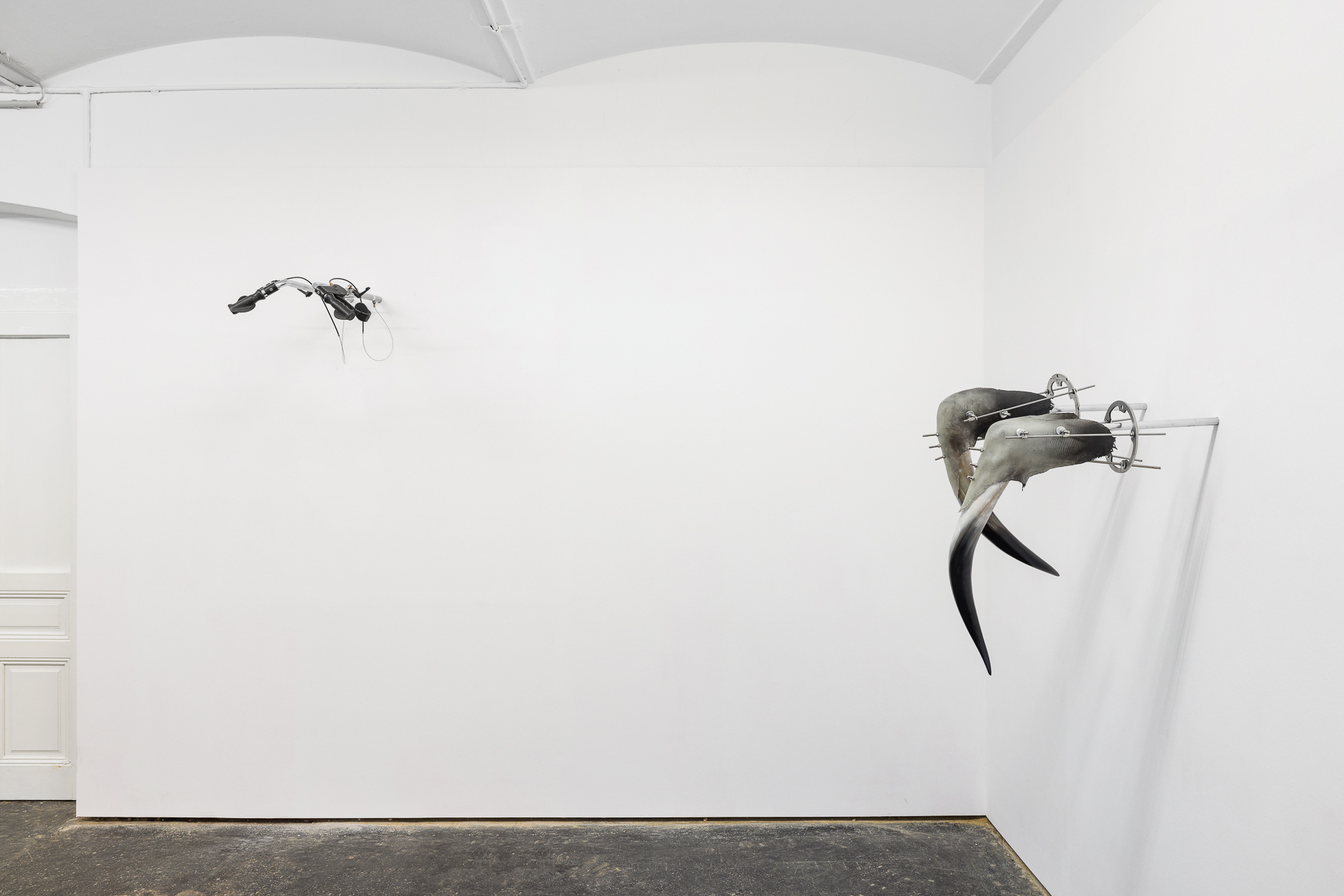 From this grotesque introspection, Sophia Gatzkan redirects the focus outwards again. Her prosthetic body extensions rest neatly lined up on the wall like armours, waiting to be put on at the right moment. The sinister combat equipment appears to originate from a highly advanced manufacturing process. The knees and shoulders have been moulded from glass fibre and plastic to fit the body perfectly. Attached to the end of each mould are animal horns that are as beautiful as they are menacing. Symmetrical screw connections with thick brake disks are reminiscent of complicated fractures and the strangely exciting feeling of carrying metal in your body.