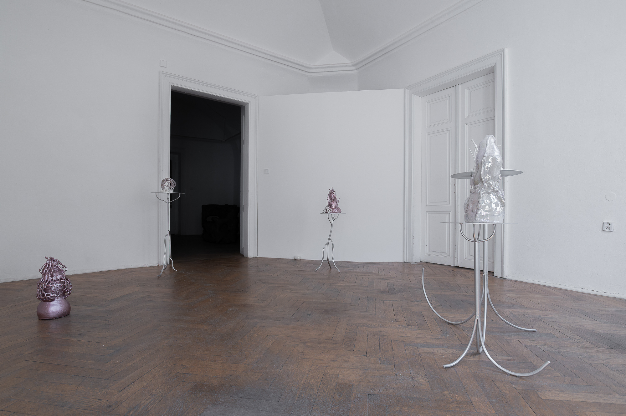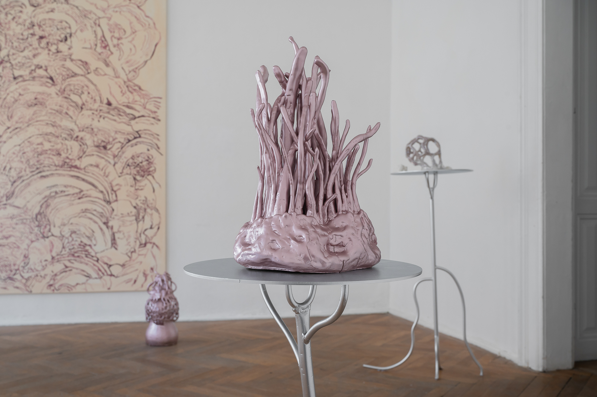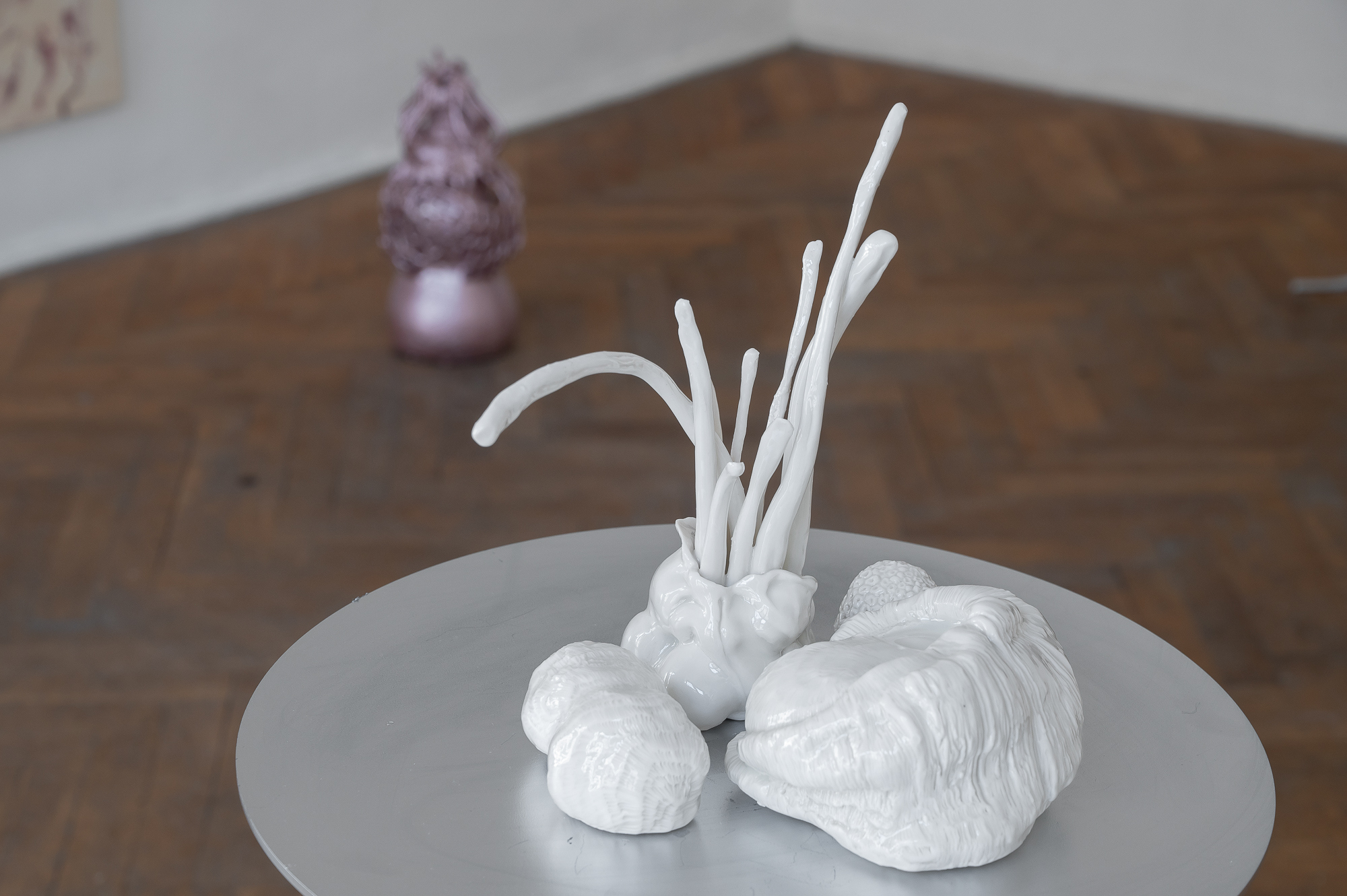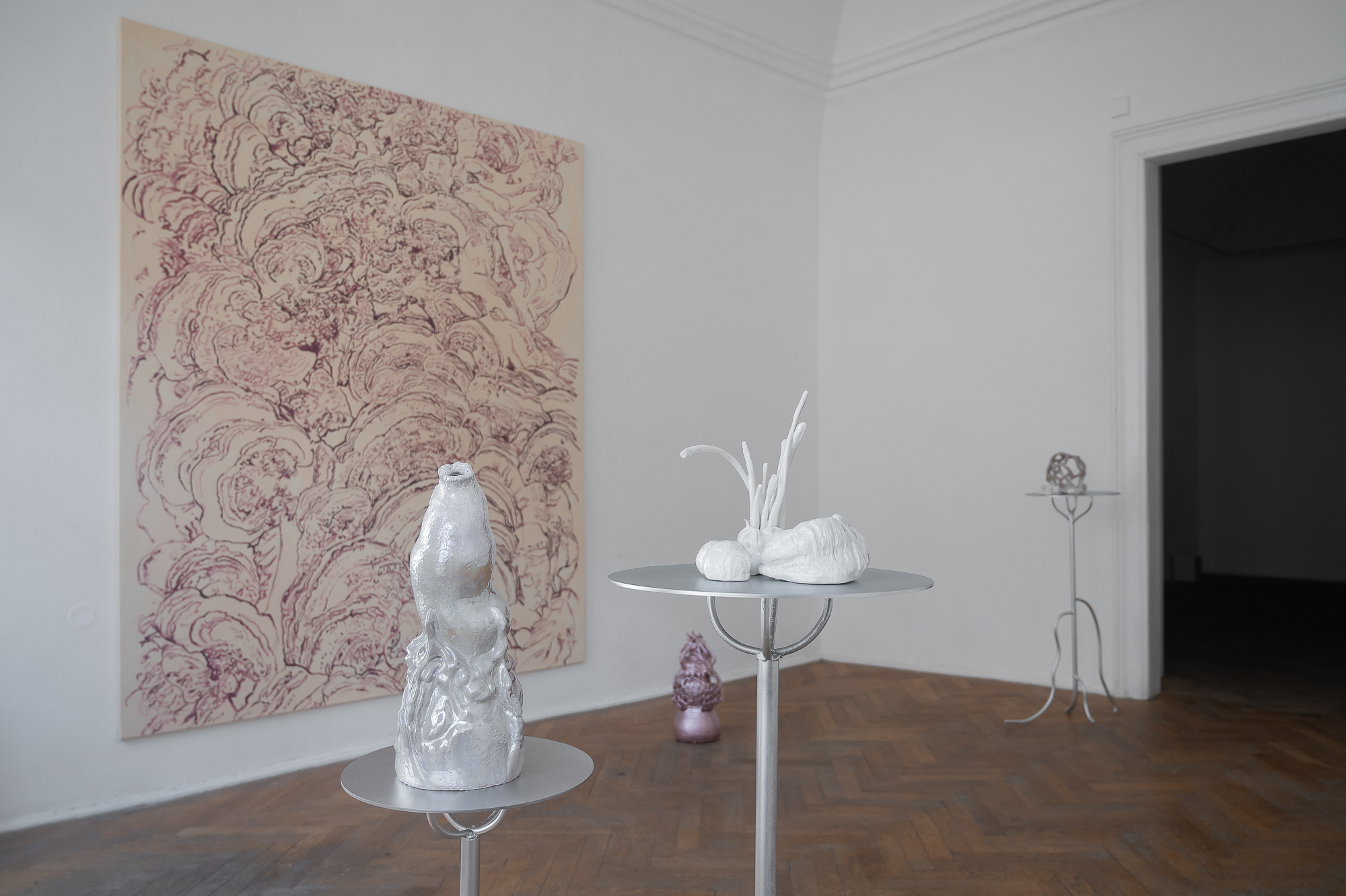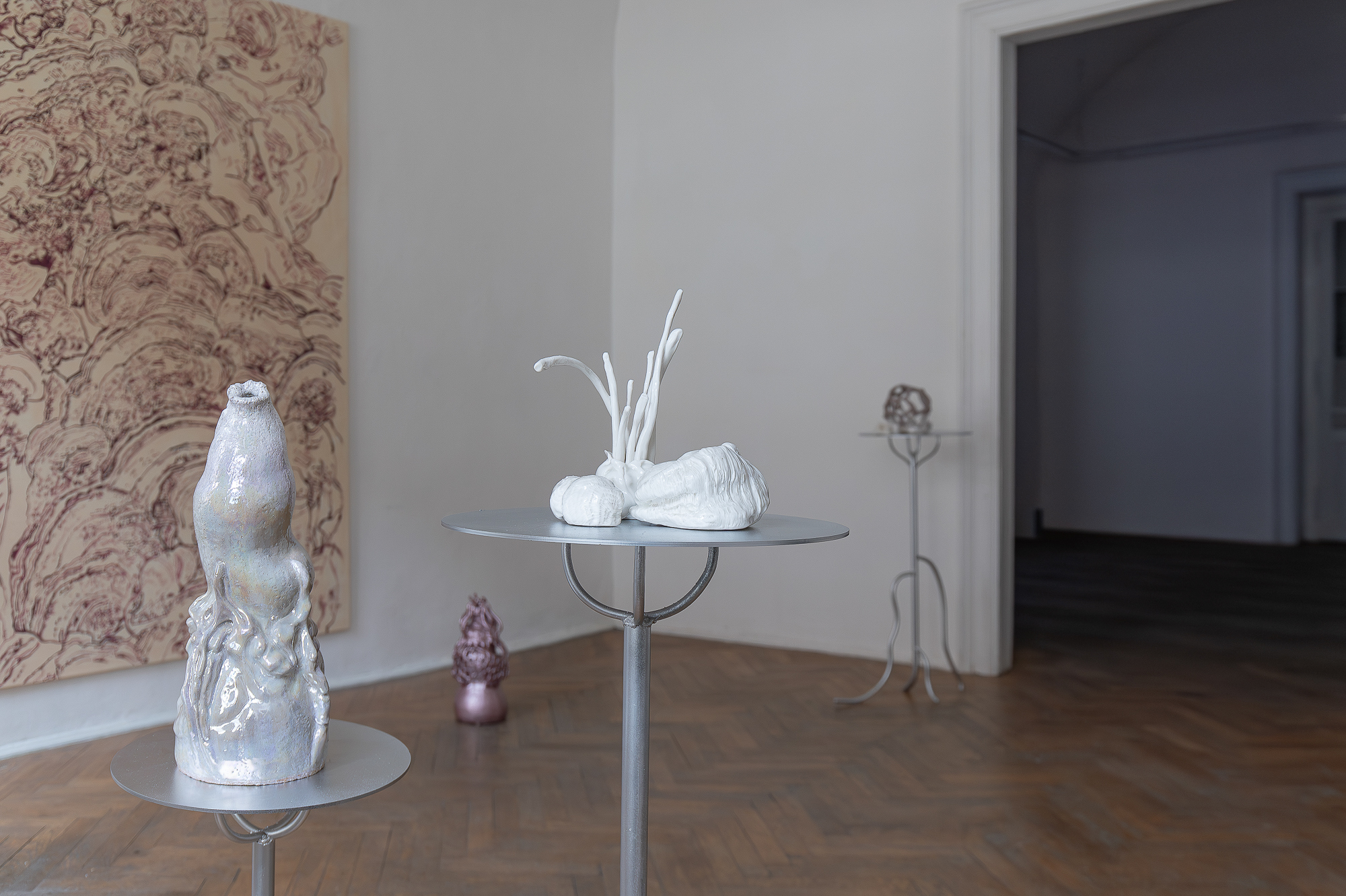 The exhibition taking place in Šopa Gallery brings together three artists – Katarína Bajkayová, Paula Malinowska and Klaudia Kosziba. Despite the different media they use (ceramics, painting, 3D digital animation), their interests have been meeting for a long time. The current exhibition in Košice has drawn clearer contours of this quiet dialogue. The artists nar- rate short stories of organisms, with jellyfish or various species of mush- rooms in main actress roles. The narrators are not omniscient, some are even frozen in time, petrified, and communicating only through their ma- terials, shapes, or brush strokes (Bajkayová, Kosziba). On the 54 square meter stage, themes of transformation, rebirth, eroticism, sex, or some kind of strange alien love are slowly revealed. Bajkayová, Malinowska and Kosziba simply test our sensitivity and reflect on the possibilities of seeing full, essential life in nature once again.