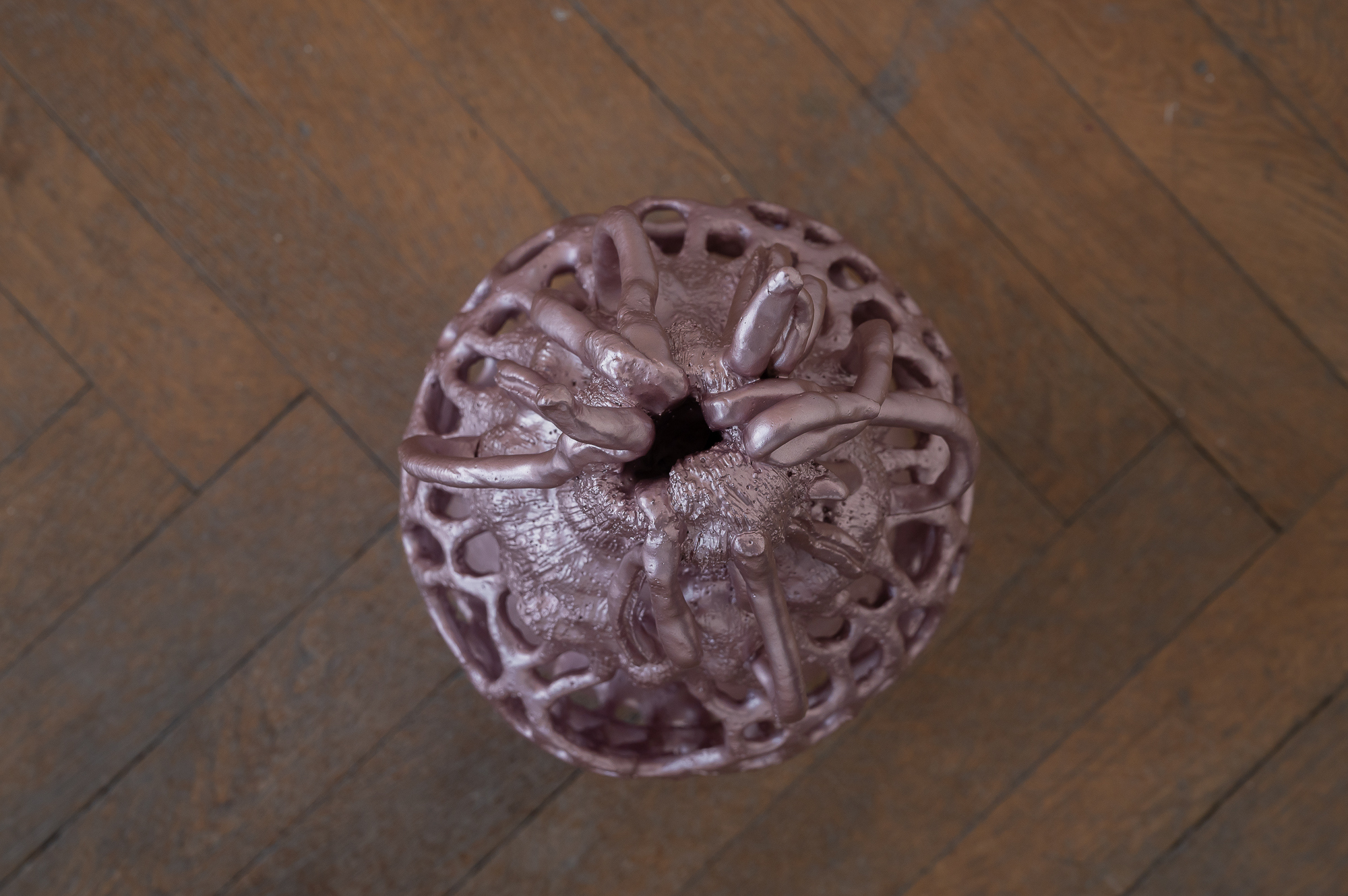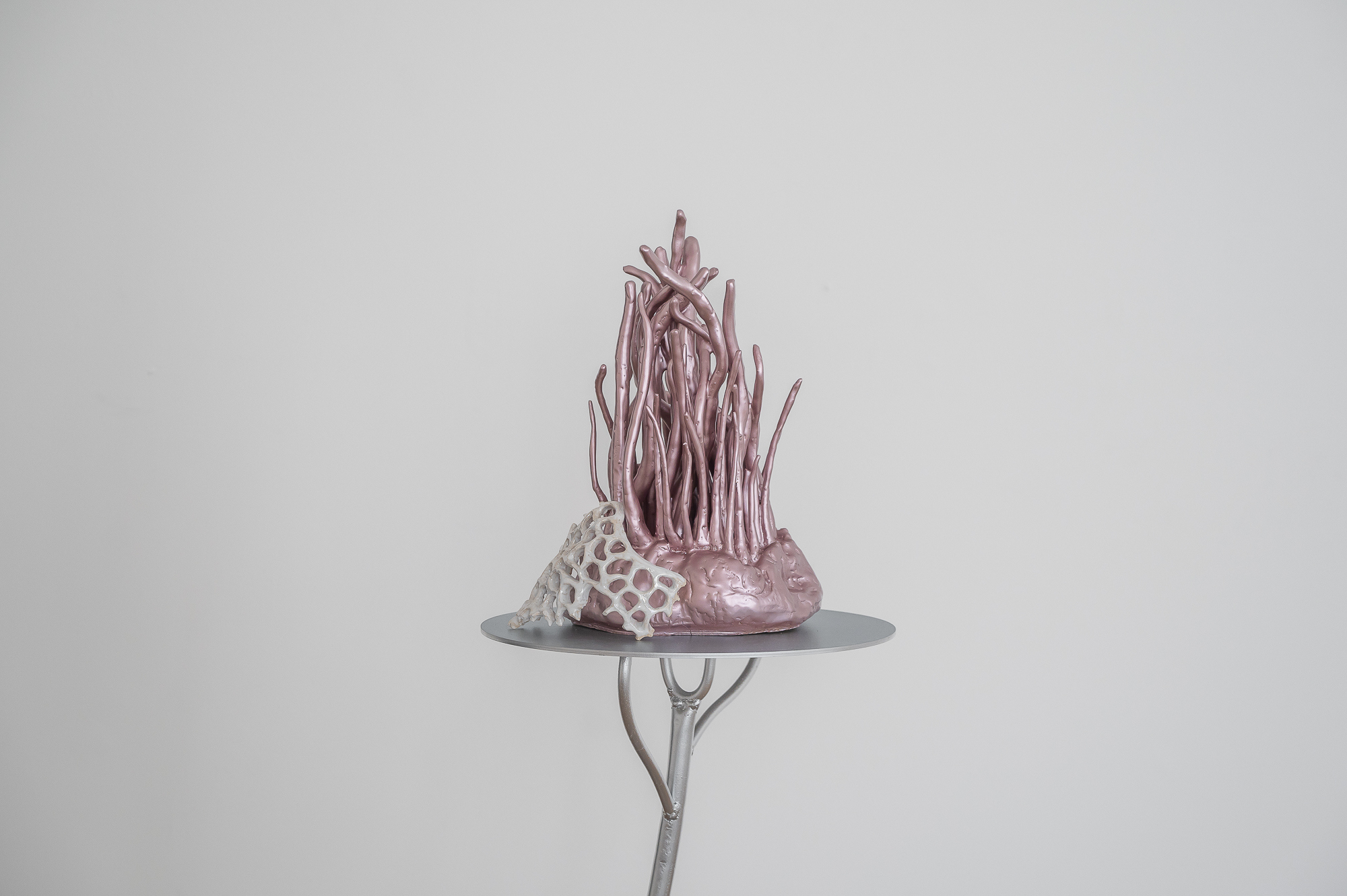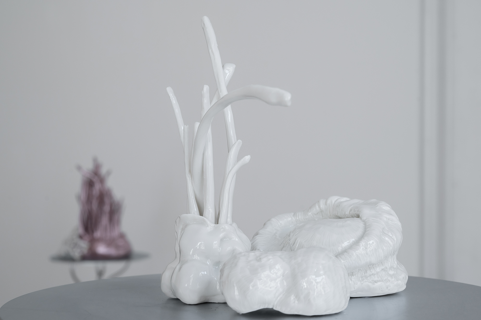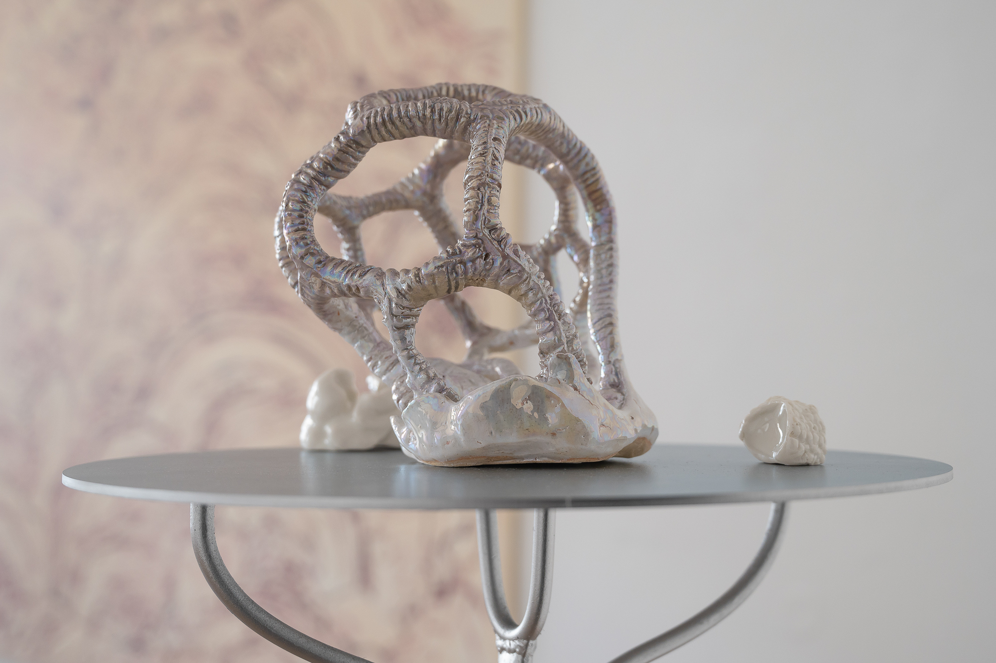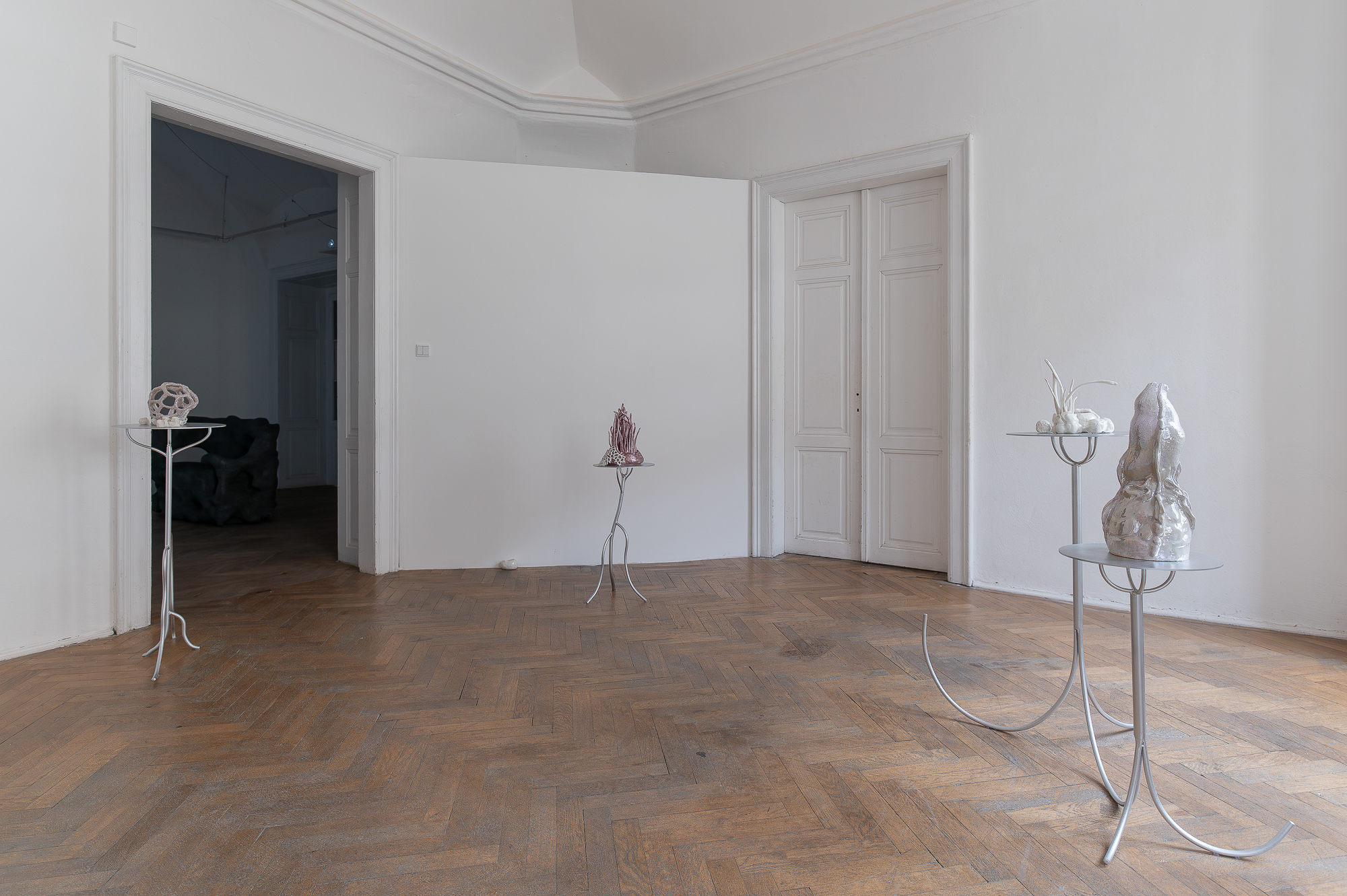 The exhibition taking place in Šopa Gallery brings together three artists – Katarína Bajkayová, Paula Malinowska and Klaudia Kosziba. Despite the different media they use (ceramics, painting, 3D digital animation), their interests have been meeting for a long time. The current exhibition in Košice has drawn clearer contours of this quiet dialogue. The artists nar- rate short stories of organisms, with jellyfish or various species of mush- rooms in main actress roles. The narrators are not omniscient, some are even frozen in time, petrified, and communicating only through their ma- terials, shapes, or brush strokes (Bajkayová, Kosziba). On the 54 square meter stage, themes of transformation, rebirth, eroticism, sex, or some kind of strange alien love are slowly revealed. Bajkayová, Malinowska and Kosziba simply test our sensitivity and reflect on the possibilities of seeing full, essential life in nature once again.