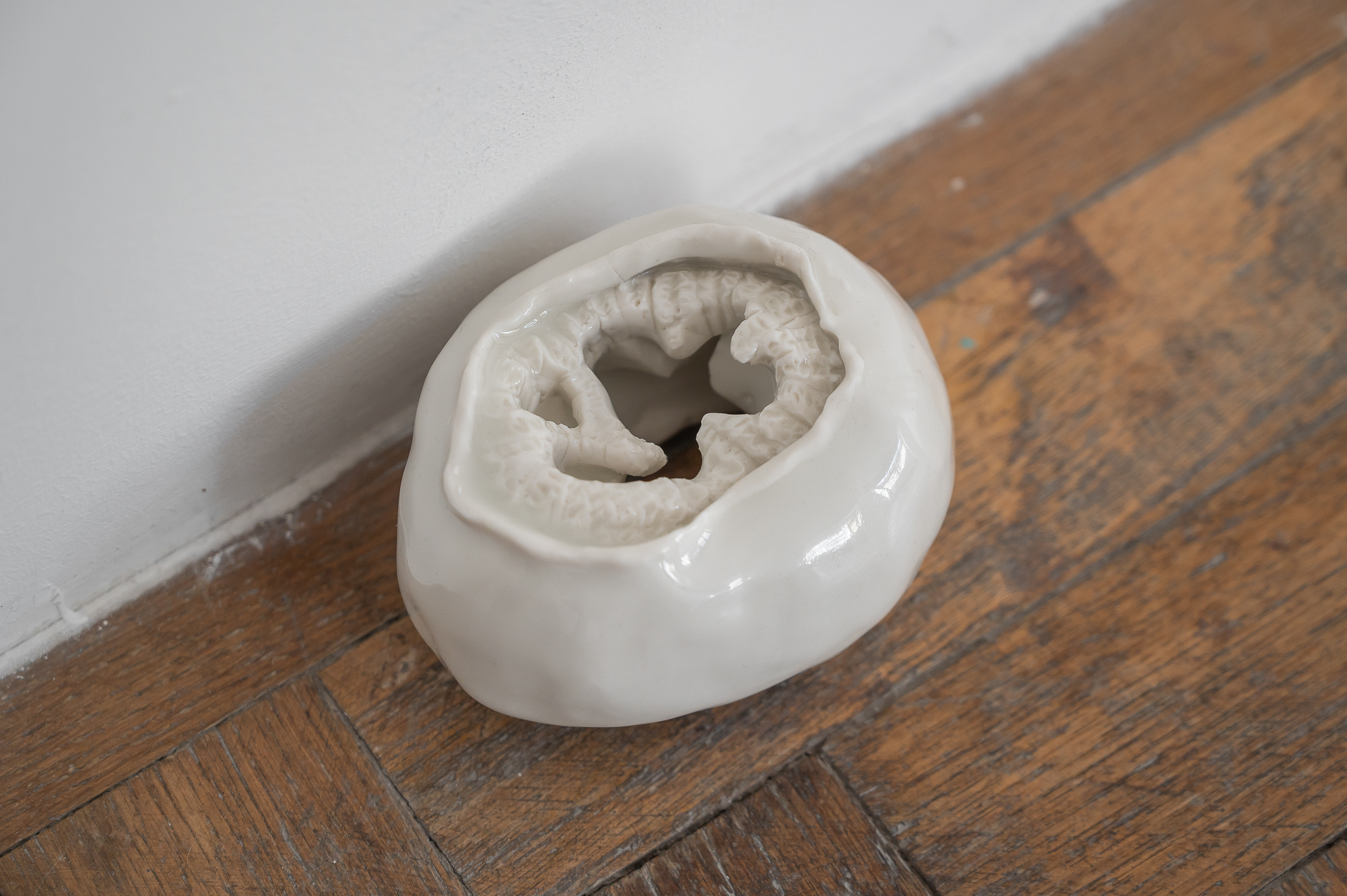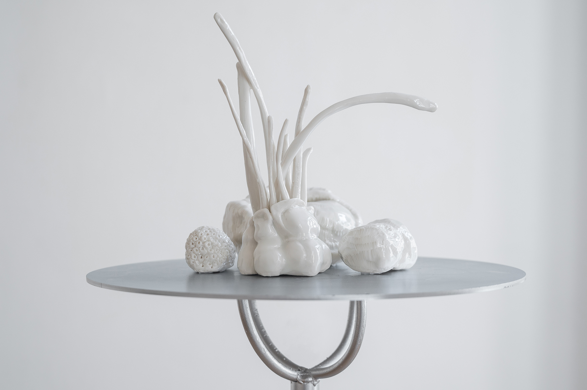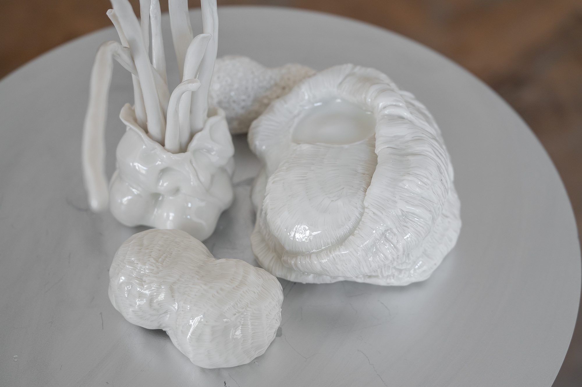 Katarína Bajkayová (born 1994) completed her M.A. studies in the Faculty of Arts of the Technical University in Košice, where she currently takes her PhD course. She mainly creates of spatial installations using ce- ramics in combination with other materials. Currently, she is particularly interested in the topics of social relations, housing, and eroticism, which she explores in the context of natural sciences, mythology, architecture and literature. Her source of inspiration for the current presentation in the Šopa Gallery in the life of fungi, primarily their ability of mutual care and reproduction. Katarína asks herself how we can get access to these traits. In doing so, she focuses on aphrodisiac mushrooms. The new series of her artworks will thus consist of ceramic objects whose shapes are based on real mushrooms with aphrodisiac effects. In doing so, she winds her reflections around the context of the ideas of Donna Haraway, Bruno Latour, and Alain Badiou.