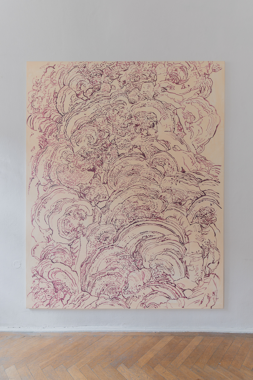 Klaudia Kosziba (born 1971) rounds up the selection of artists with a dis- tinctly painter’s approach, while, like Bajkayová, she devotes her atten- tion to mushrooms. Kosziba has focused on paintings in long term, includ- ing the way of their representation or historical transformations. In her recent paintings, she reflects her direct experience with mushrooms, trac- ing the metamorphosis of their aesthetic qualities, growth, or cessation. As in Malinowska’s case, ancient Greek culture stretched the canvas for her artistic decisions (think of Ovid’s Metamorphoses, for example). This environment is already present in the title of the entire Hymenophore series, which refers to the mythological Hymen, the god of marriage. The second meaning is linked with the anatomy of fungi, referring to the fila- ment structures that expel spores. In layman’s terms, these are actually fungi’s reproductive organs. It is no coincidence that her works share the gallery space with the works of Katarína Bajkayová as well as the shape interpretation of aphrodisiac mushrooms, so that they ultimately come to life together in their full symbolic potential. Klaudia Kosziba is a painter and teacher at the Academy of Fine Arts in Bratislava. She has been the leading persona of the Ateliér mal+by since 2008.