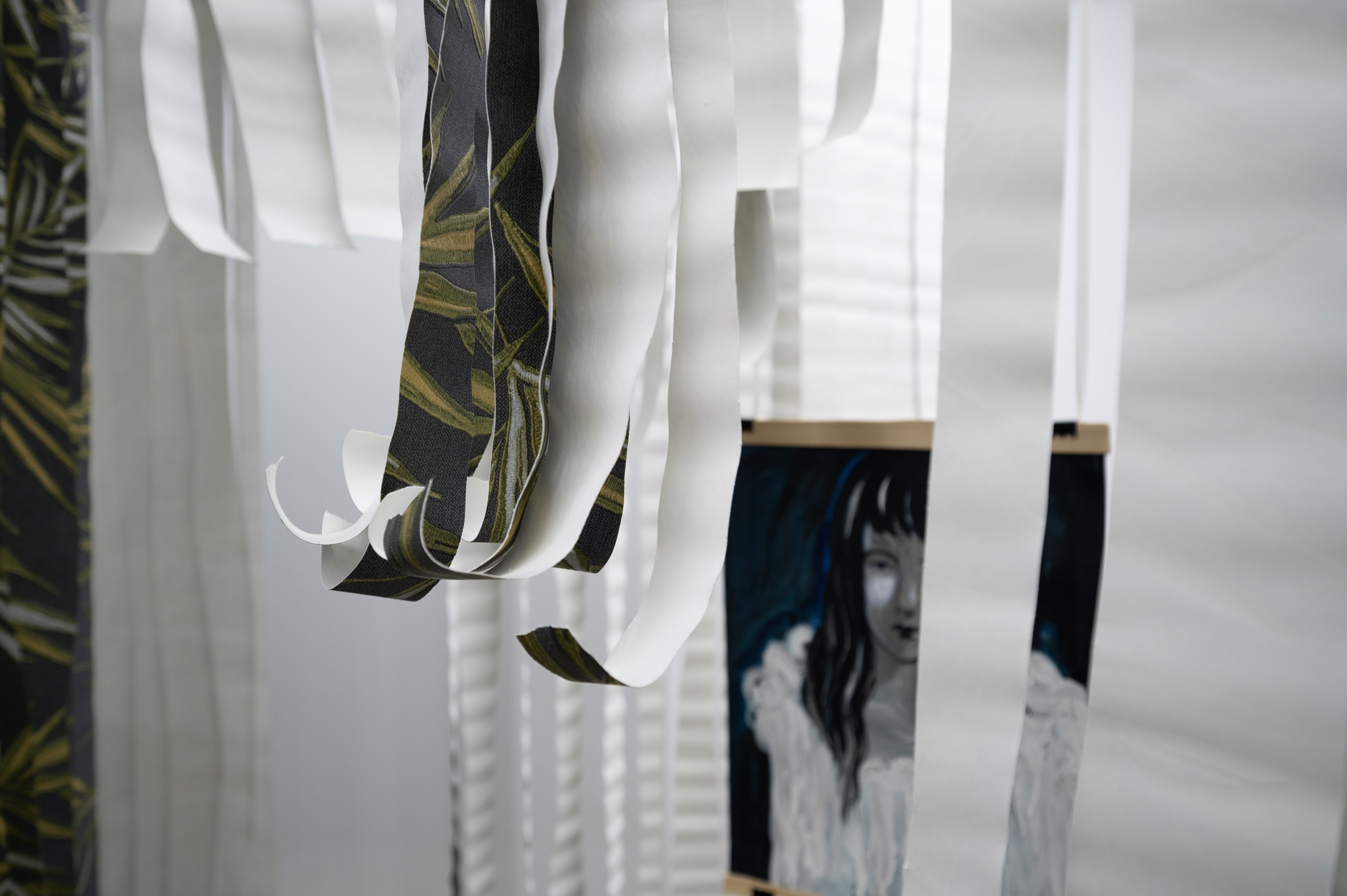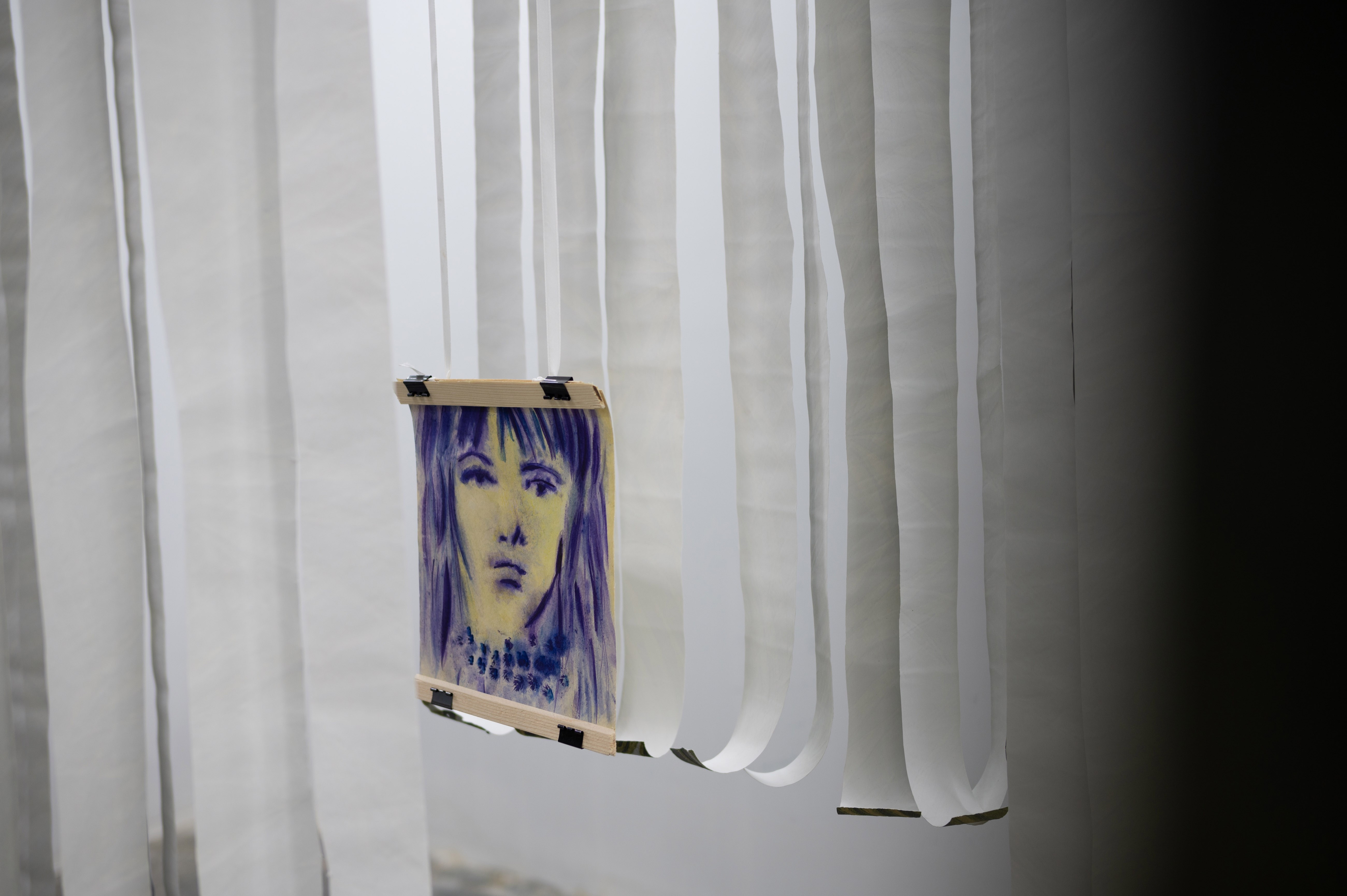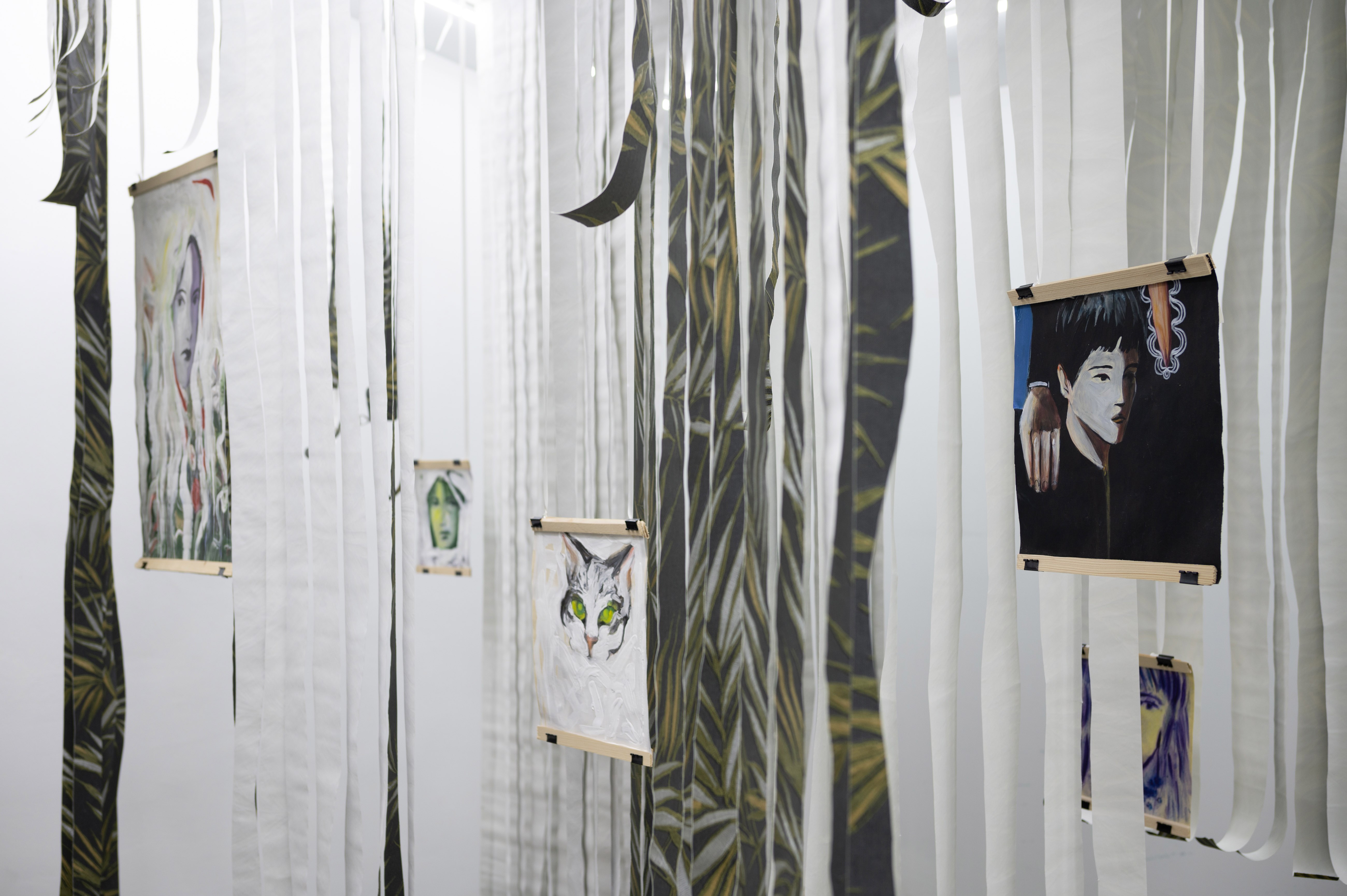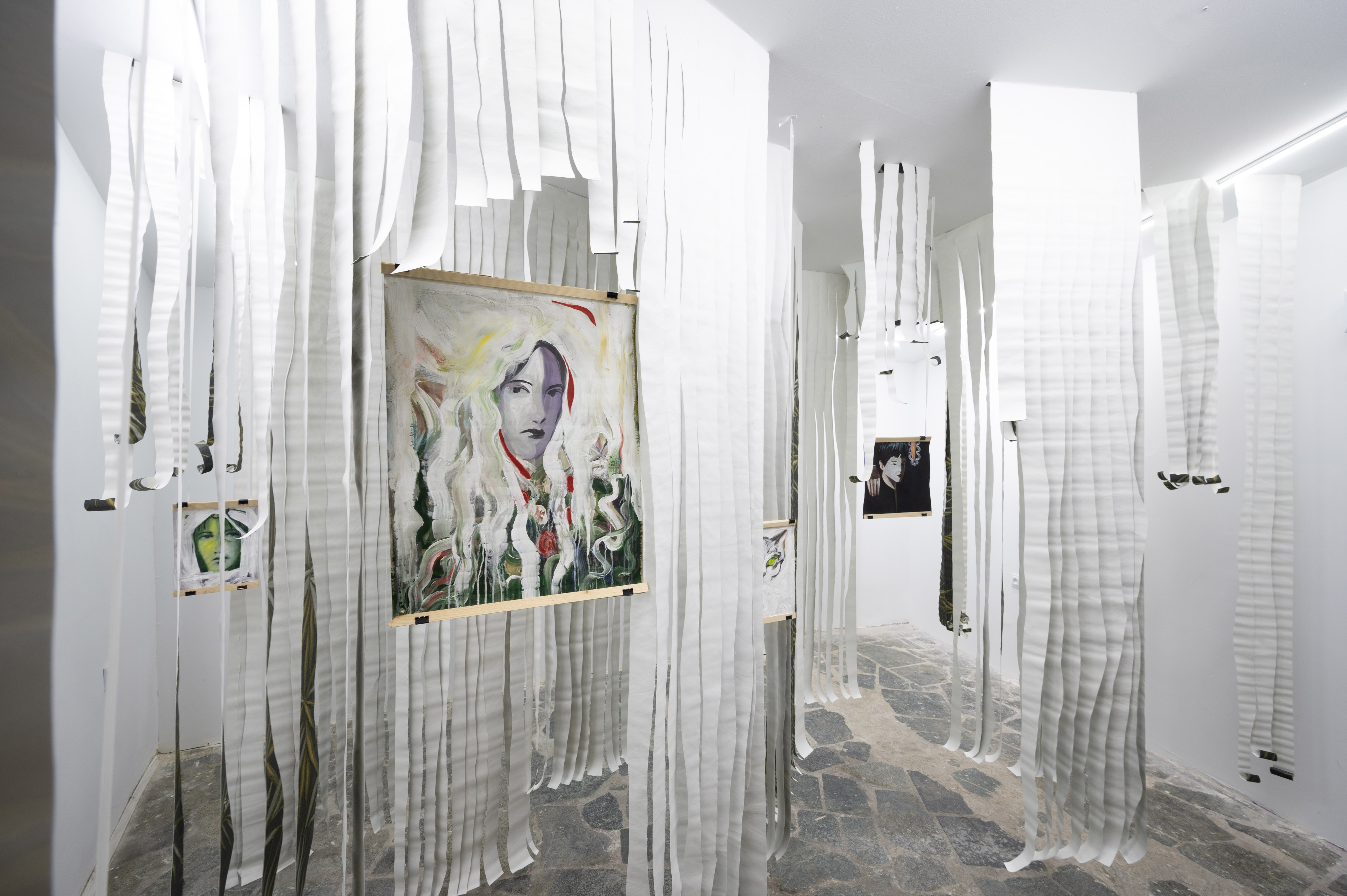 Show presents Emin’s paintings as a total installation - room is full of cut wallpapers, creating a maze-forest-like structure within which the portraits are discovered.