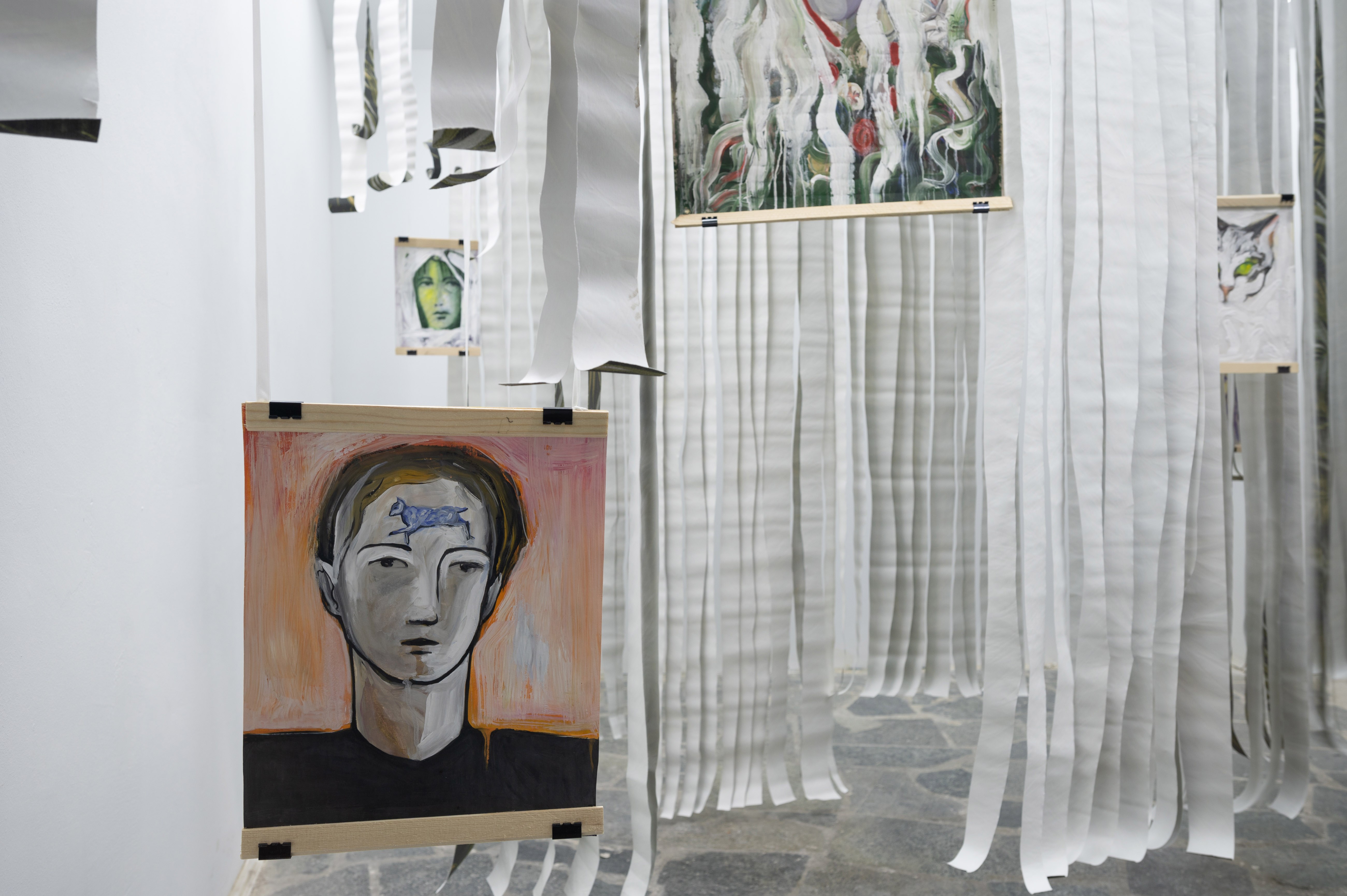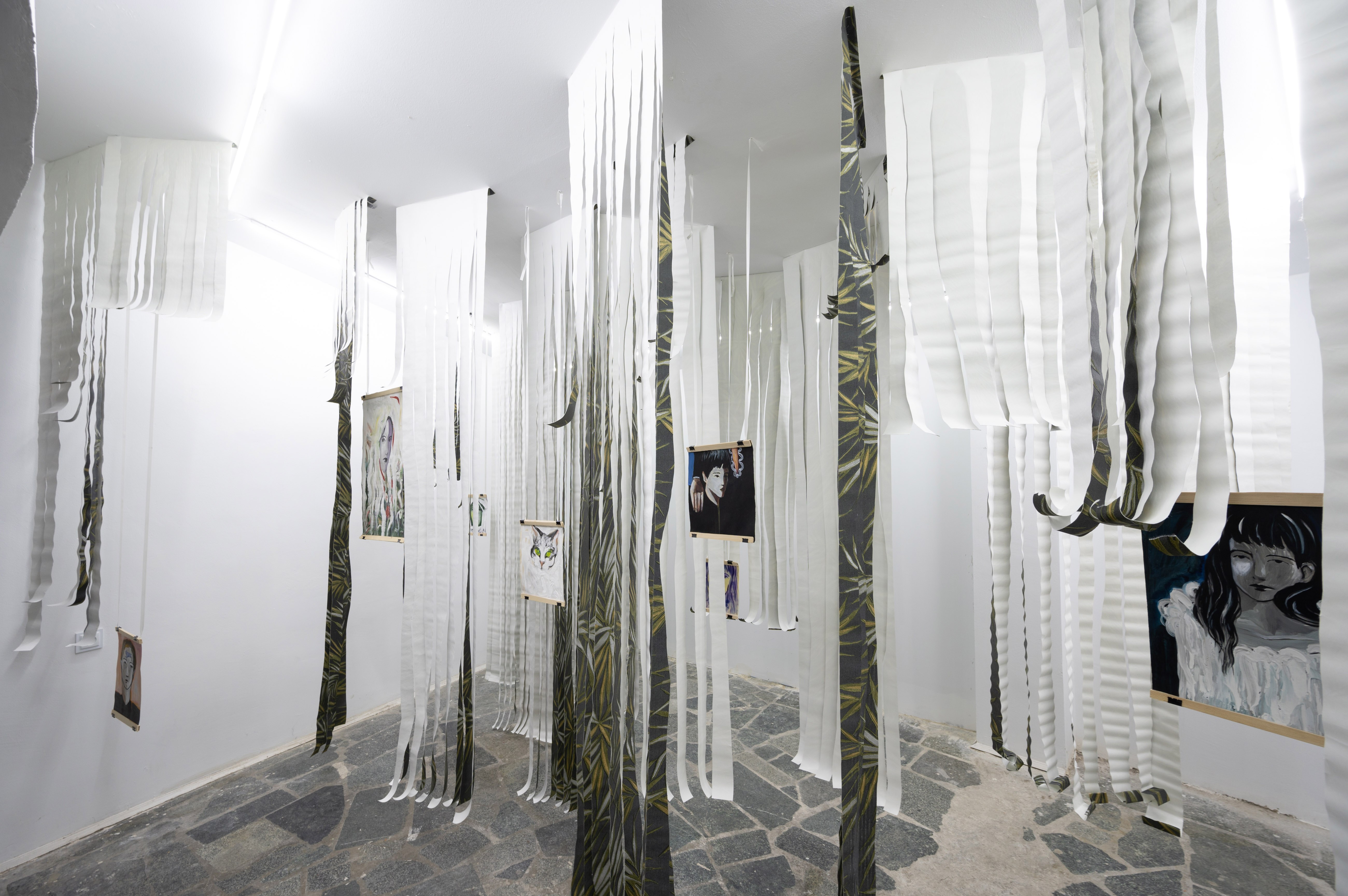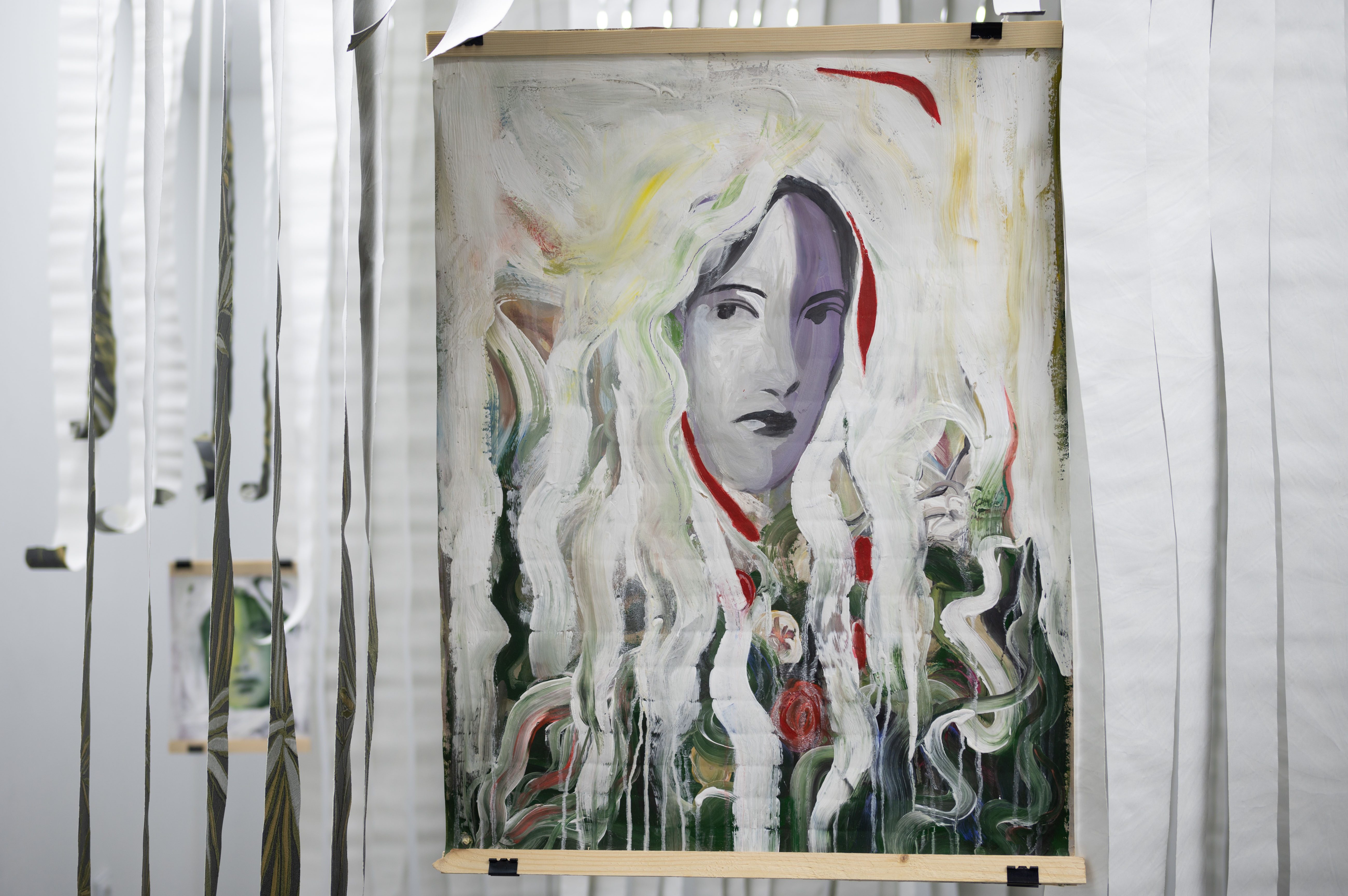 Show presents Emin’s paintings as a total installation - room is full of cut wallpapers, creating a maze-forest-like structure within which the portraits are discovered.