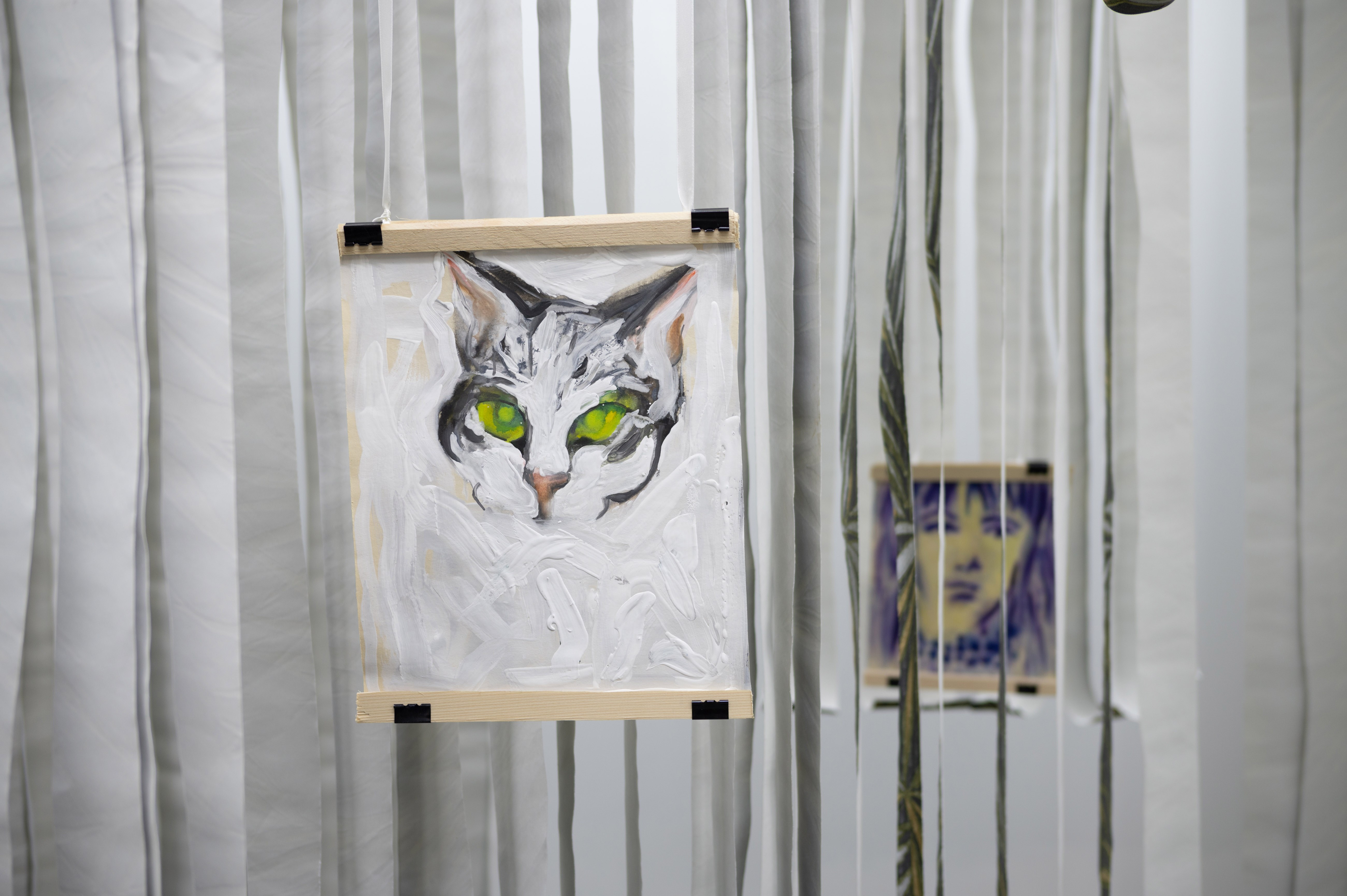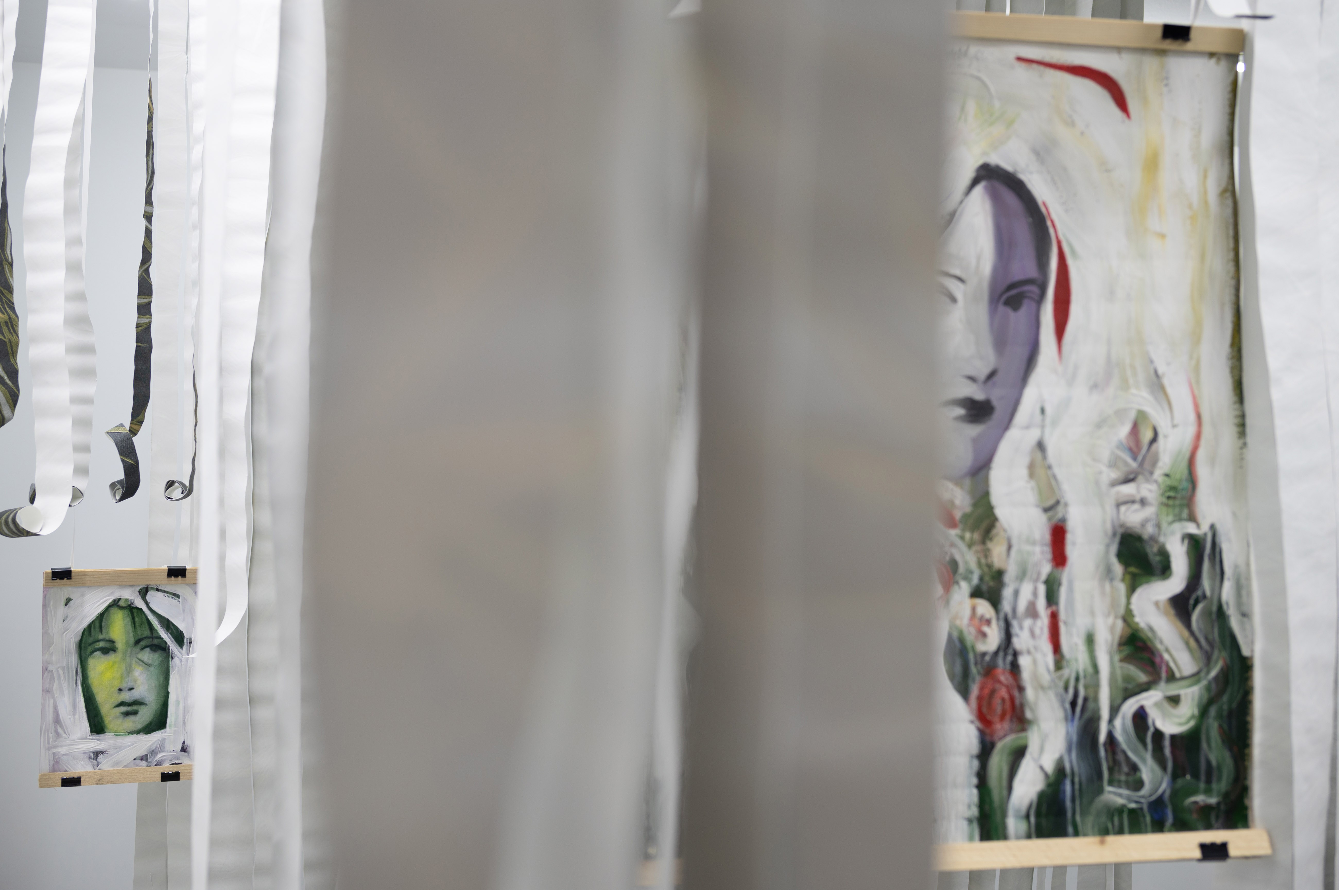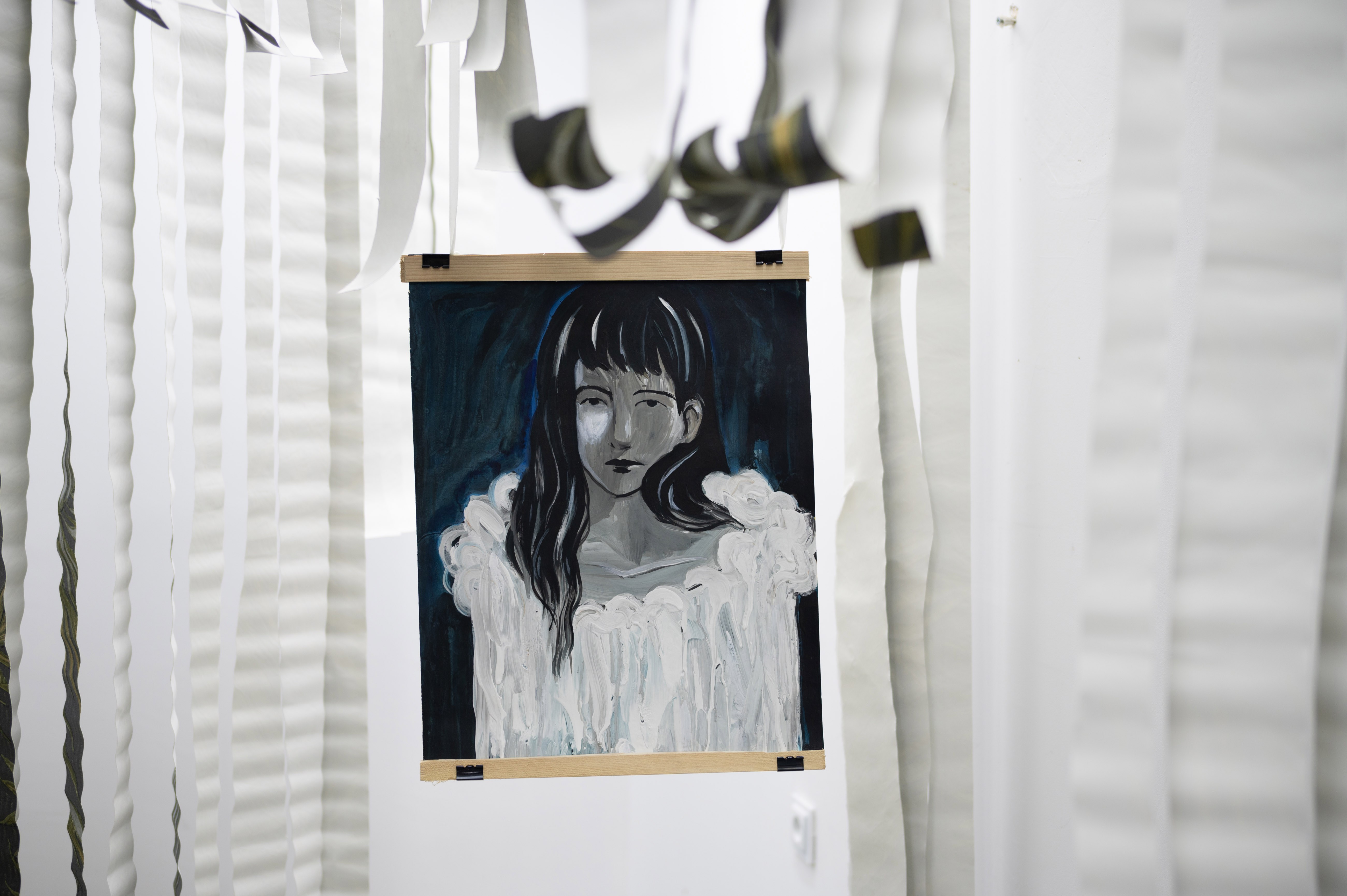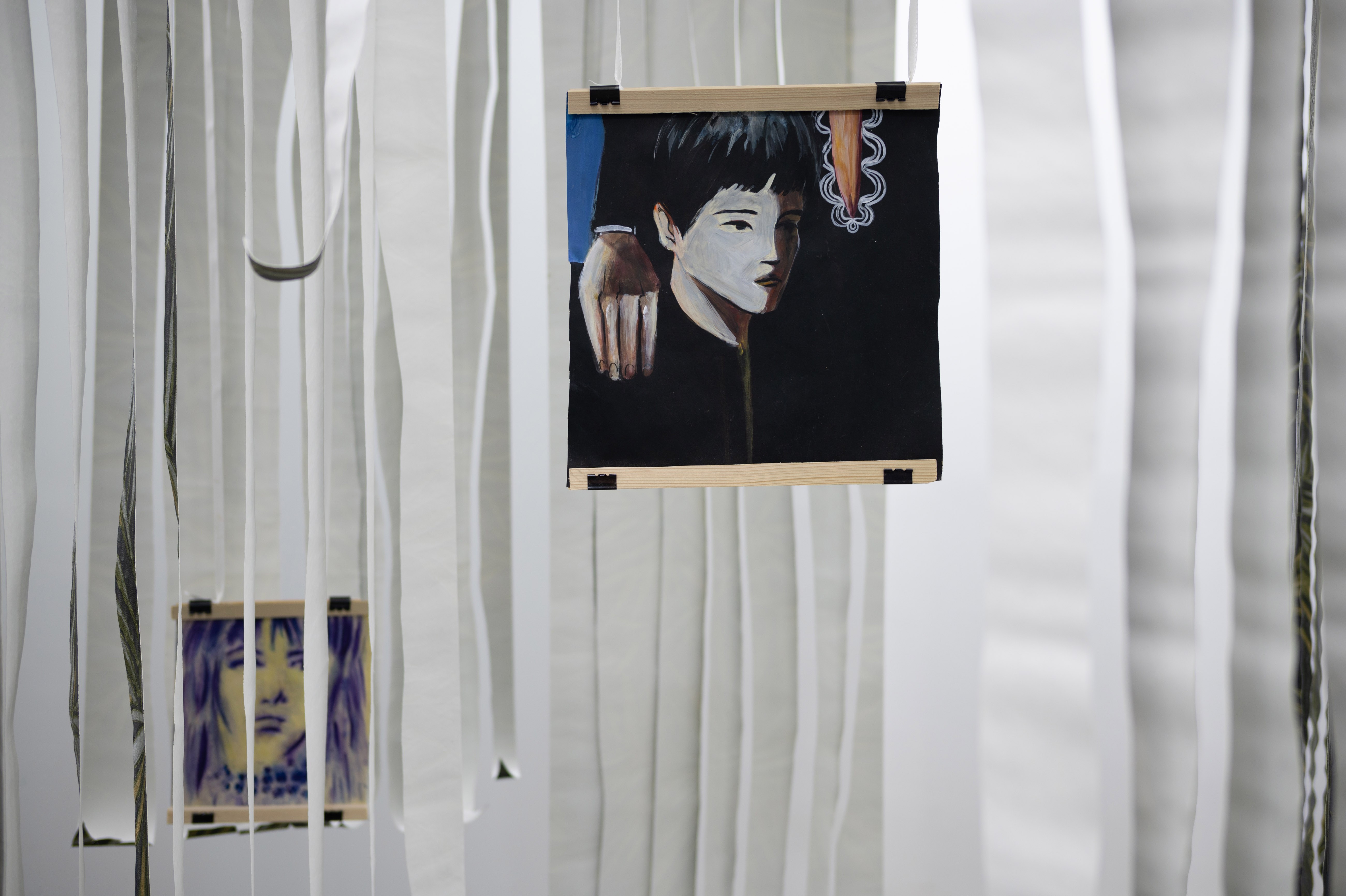 Show presents Emin’s paintings as a total installation - room is full of cut wallpapers, creating a maze-forest-like structure within which the portraits are discovered.