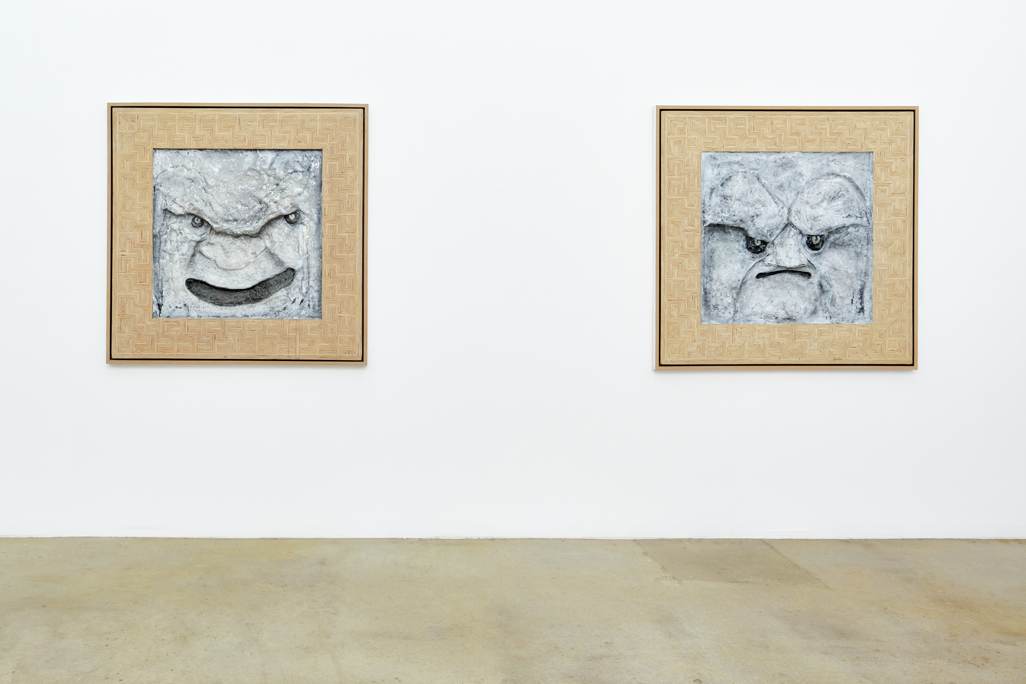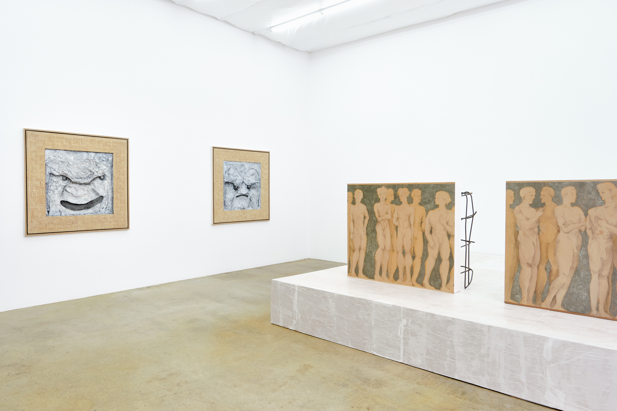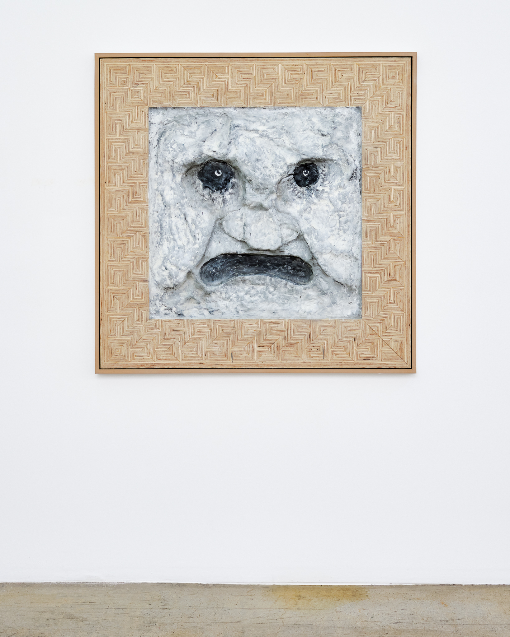 Greek meanders come back in plywood, edge grain outward, reminding you that there was deductive abstraction millennia before that was an idea. There are masks of pain and anger that also look like emojis. The materials are hybrid and unclassical—plastic inlay, faux stone finish. The gallery is a stage. What’s being staged doesn’t speak in one voice. There’s a recovery of the strange queer classicism of 1930s and ’40s, a queer world that’s far from cute and cuddly. There’s Minimalism doing its thing in its afterlife. There’s myth and what myth conceals.