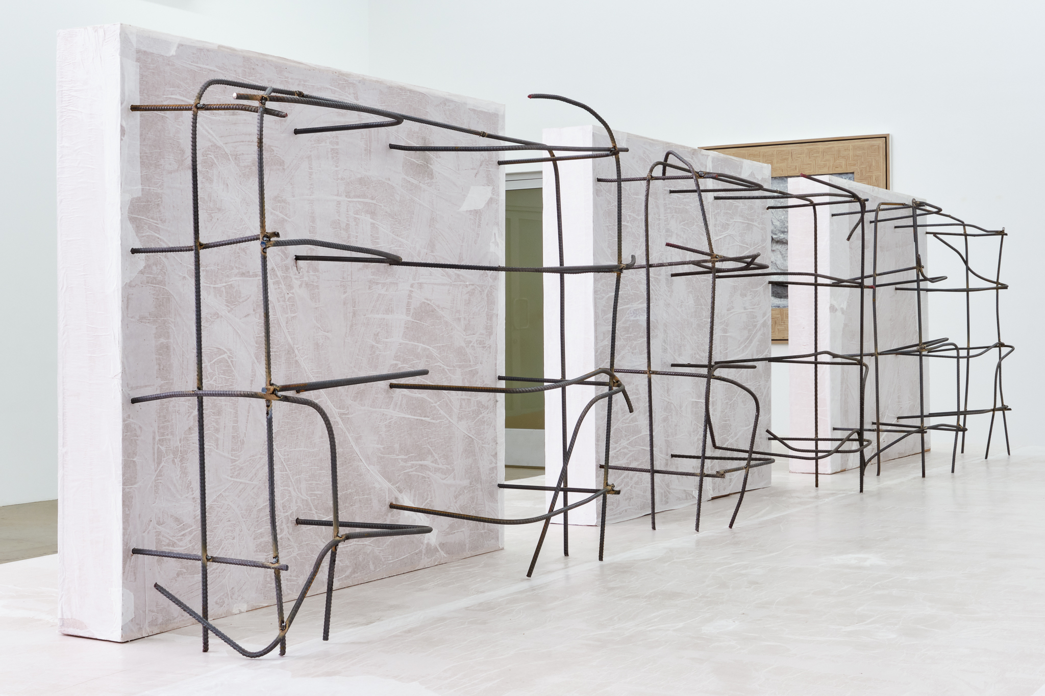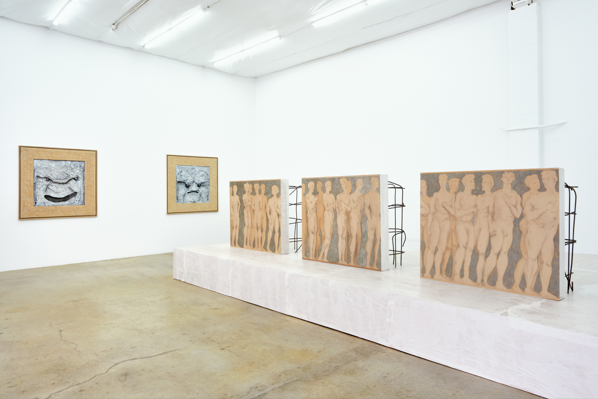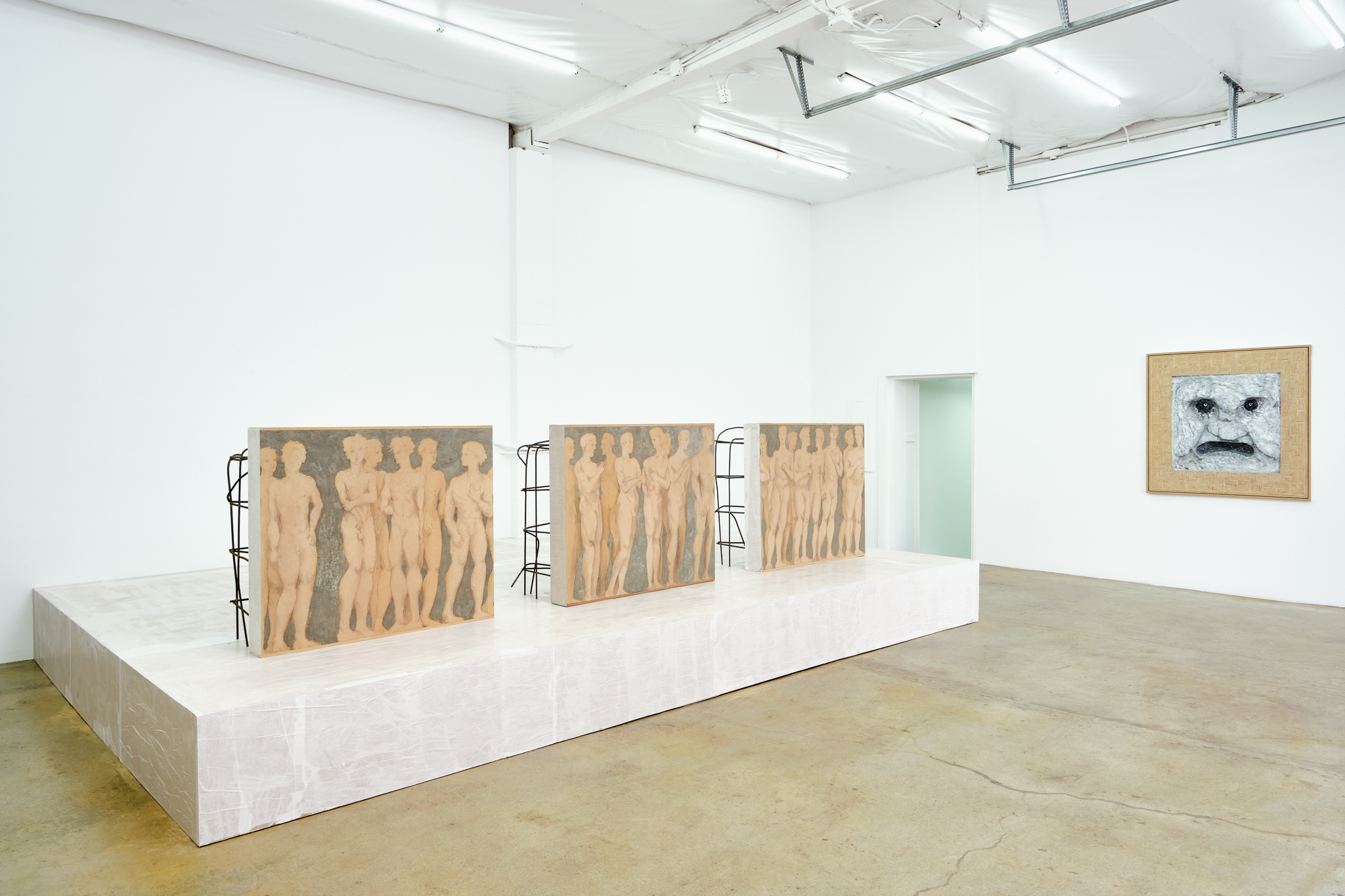 Greek meanders come back in plywood, edge grain outward, reminding you that there was deductive abstraction millennia before that was an idea. There are masks of pain and anger that also look like emojis. The materials are hybrid and unclassical—plastic inlay, faux stone finish. The gallery is a stage. What’s being staged doesn’t speak in one voice. There’s a recovery of the strange queer classicism of 1930s and ’40s, a queer world that’s far from cute and cuddly. There’s Minimalism doing its thing in its afterlife. There’s myth and what myth conceals.