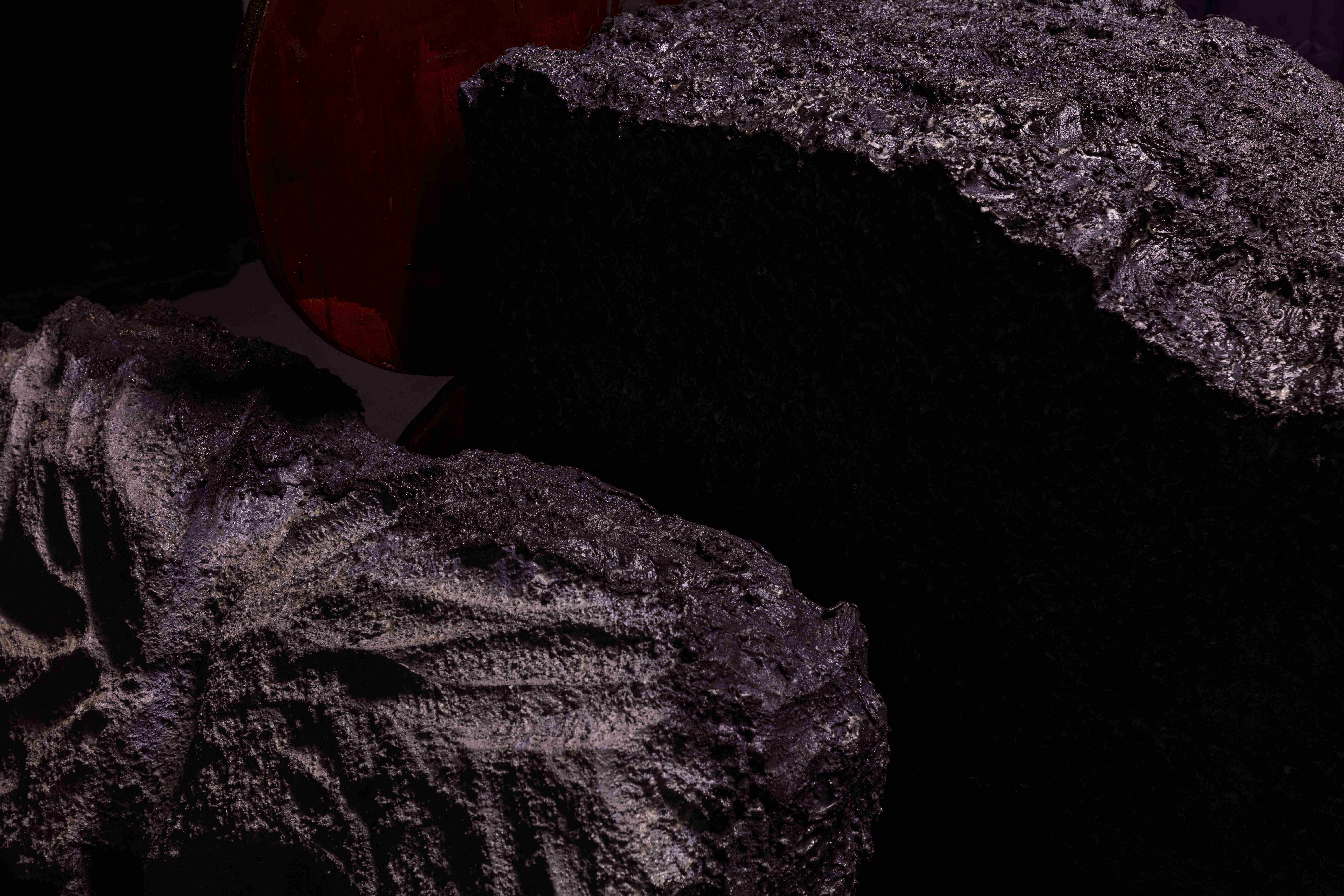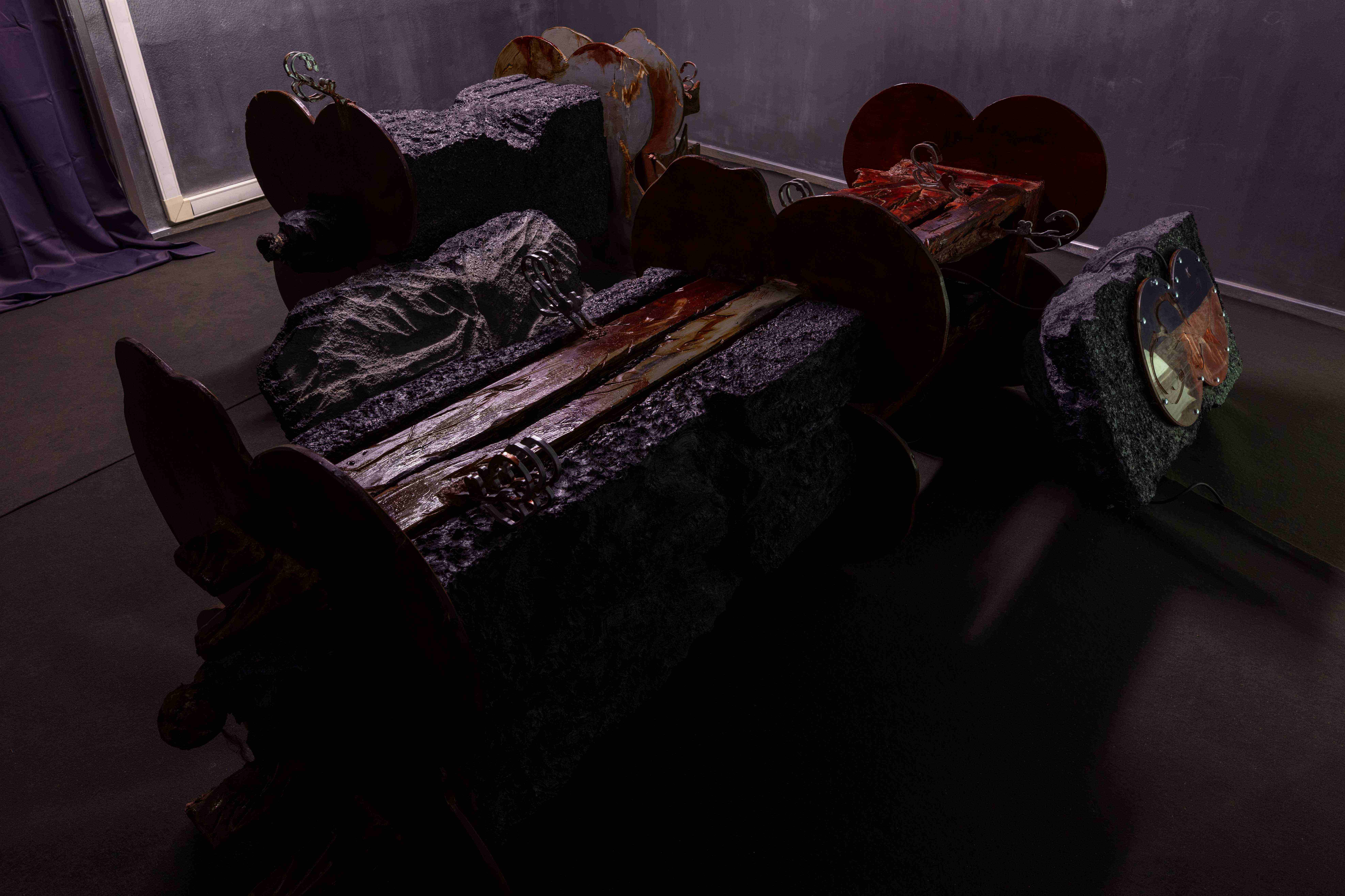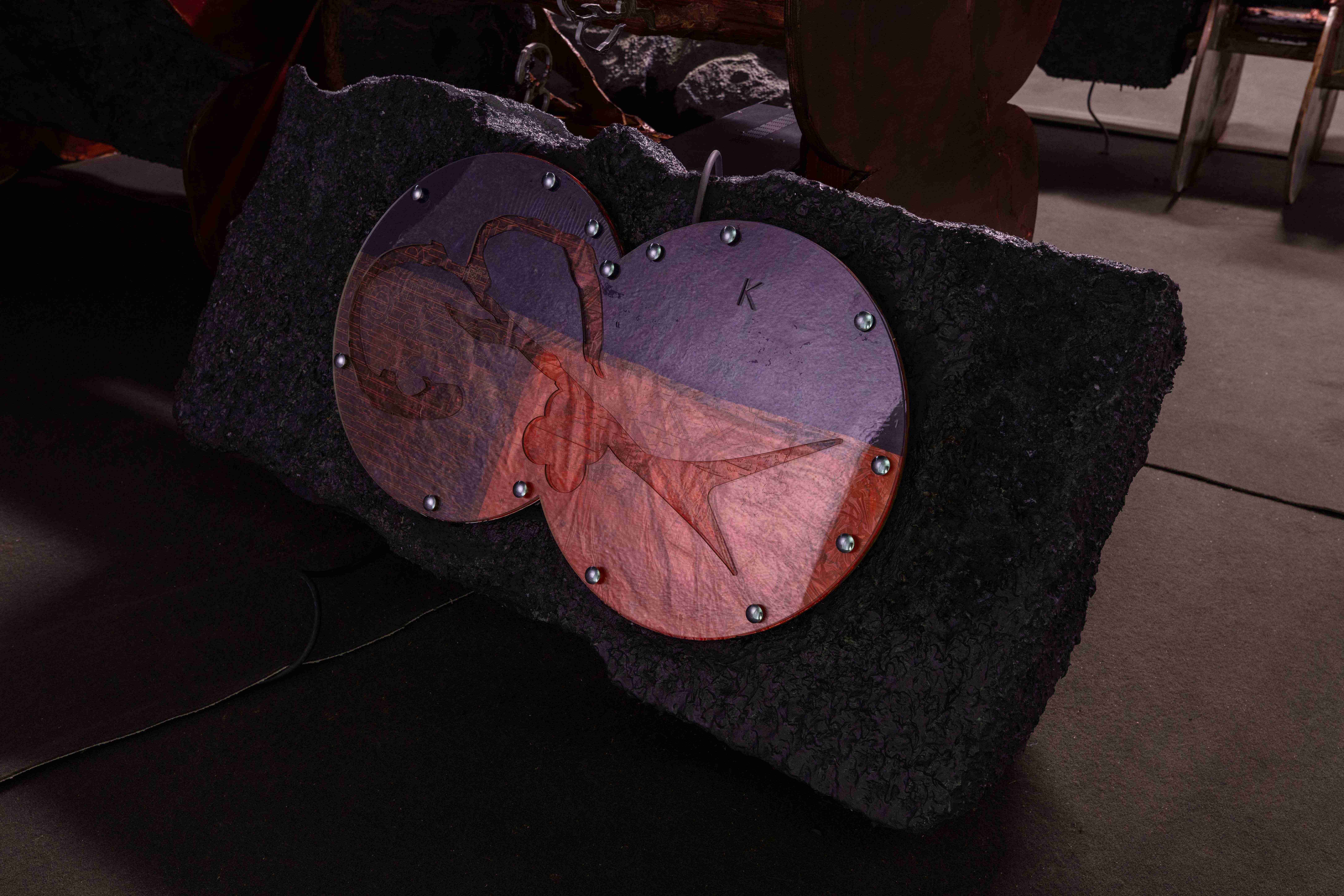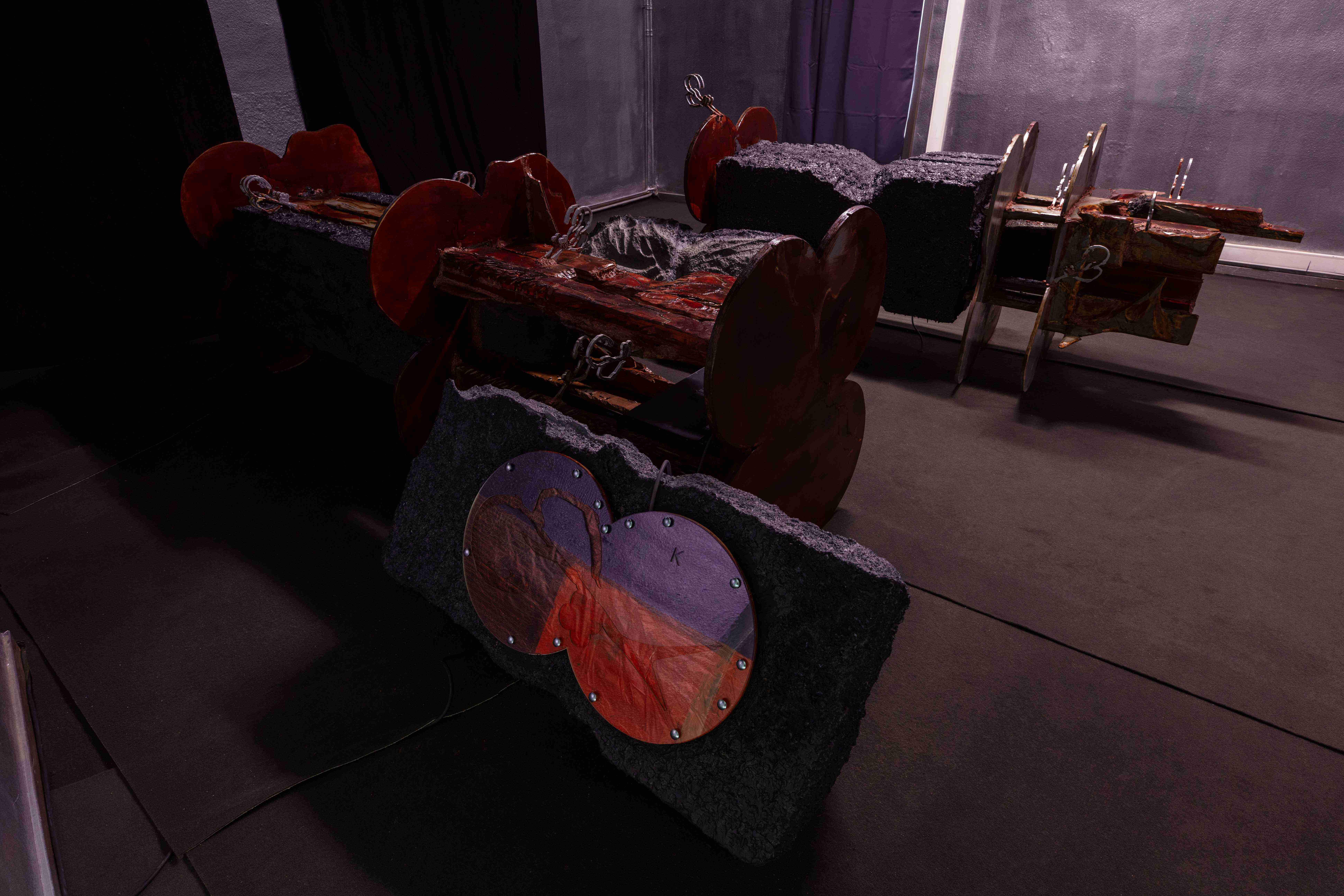 "First Blossoming of a Lava-Fuelded Consciousness" is a sculptural and sound installation featuring two characters, K and M. These two protagonists are prototypes of the Tree-Radio-Antenna hybridised with pyrophyte plants. Like fire lilies, these dead trees have regenerated thanks to a volcanic flow that destroyed everything in its path. The trees are made up of wooden structures that oscillate between industrial objects and organic matter, as well as rocky capsules/seeds like the mineral aspect of soil after a volcanic explosion. Lying in the middle of an ashen-grey desert landscape, reminiscent of the inside of lava tunnels, K and M have been lying for who knows how many years. "Voices from beyond the ashes. Just as seashells carry the sound of the ocean, if we put the hollowed-out seeds of pyrophytic plants to our ears, they will tell us about the interior of the volcano". Voices emerge from the seeds of the trees, bringing K and M to life in a crescendo of sound. As if fossilised in lava, the Untermeyerâs Brain (snowglobes 1 & 2) pieces act as memory cards, recalling the different narrative layers of the projects; a plastic interpretation of Donna Harawayâs concept of the Thick Present.