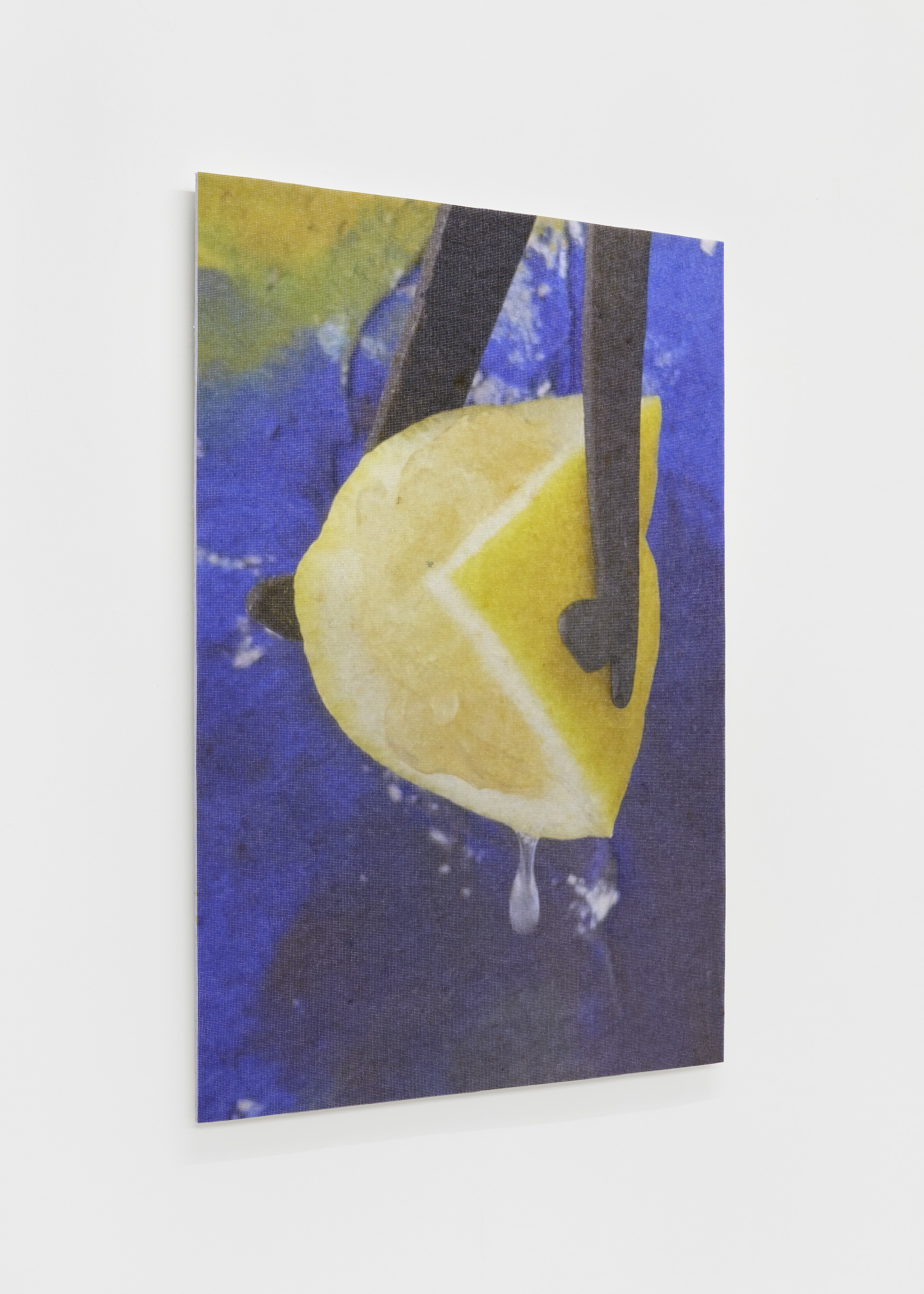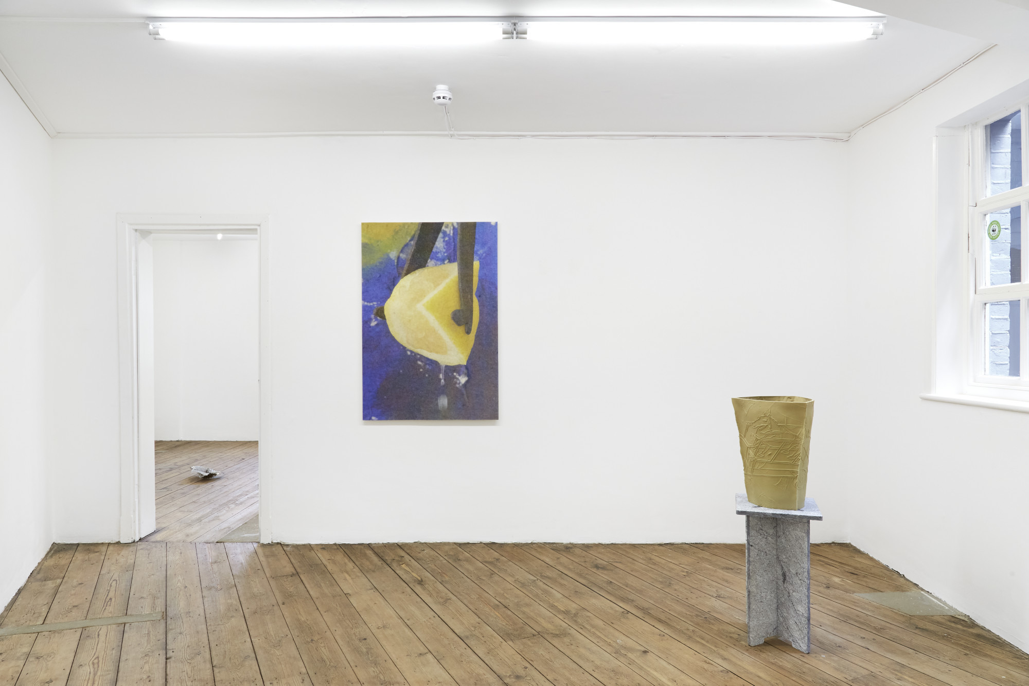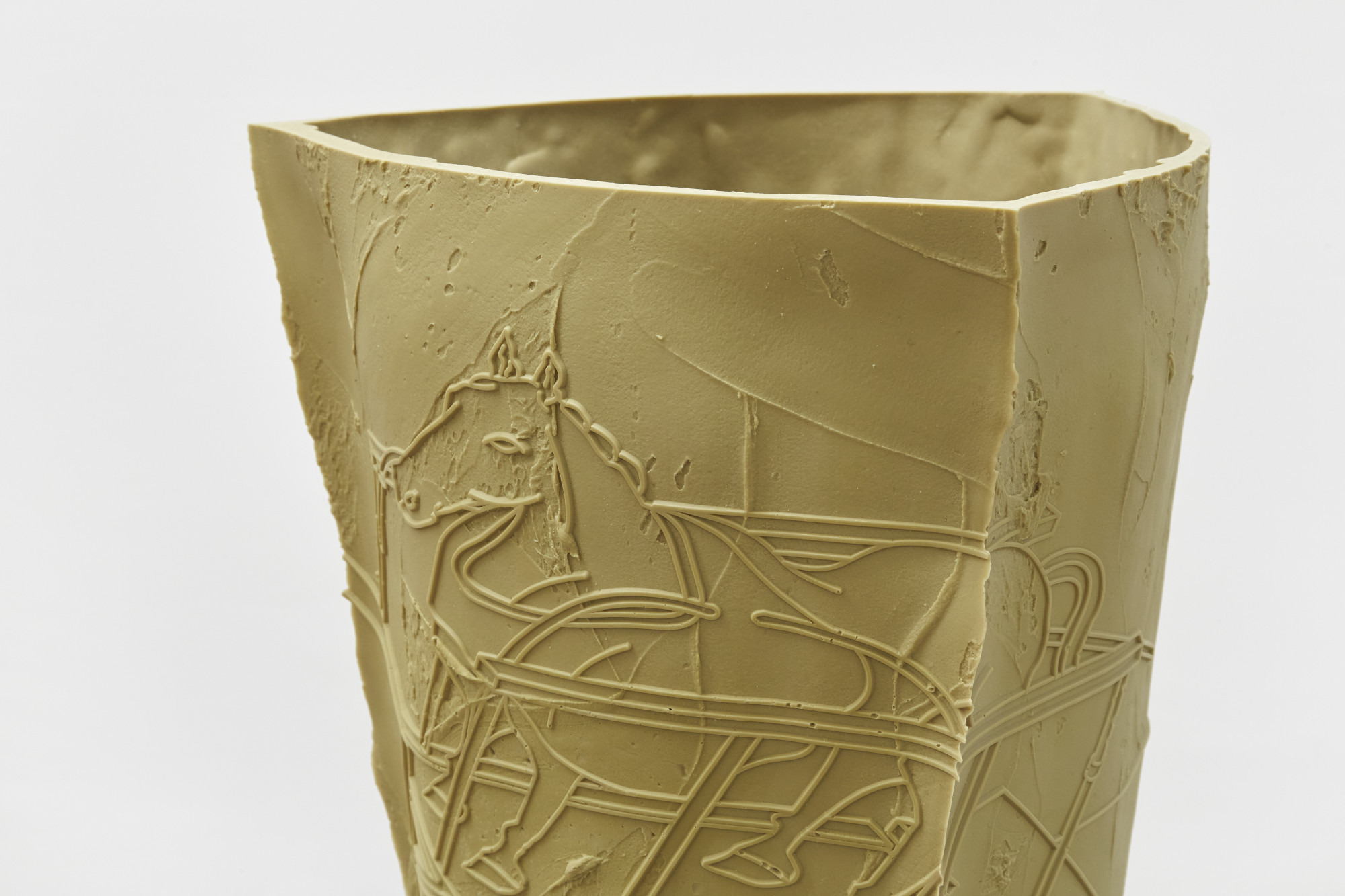 Elsewhere things become a bit more confrontational, two large full-colour images on embroidery mesh adhered to thick fabric mattress wadding stretch out the time between two sequential frames of moving image. Sitting amongst them is a wax vase-like vessel with smooth guts and rough external faces. A single engraved drawing wrapping around its swollen diameter, the cart before the horse.