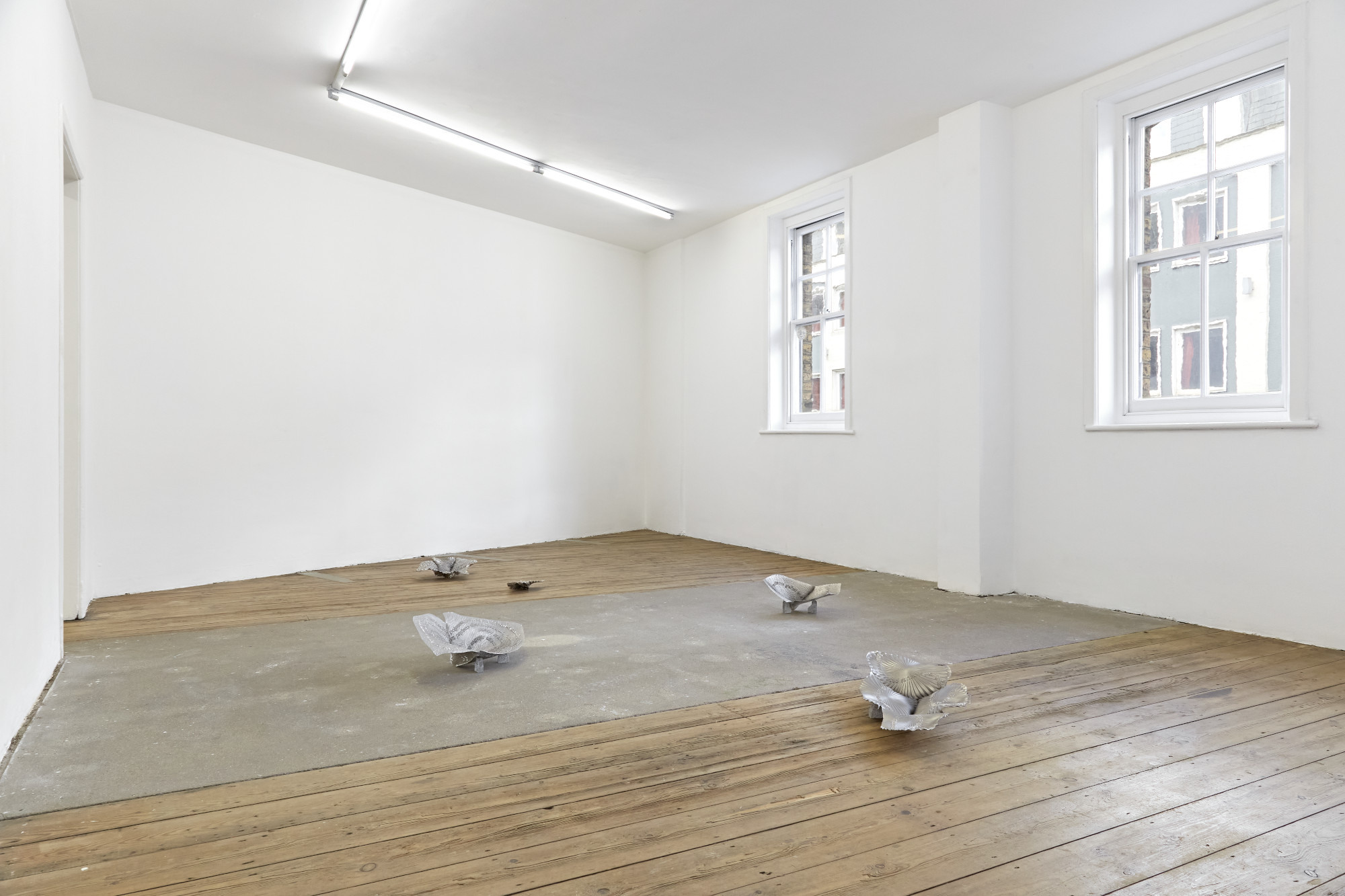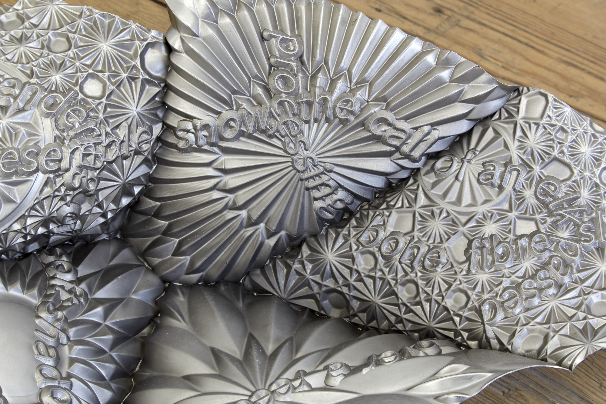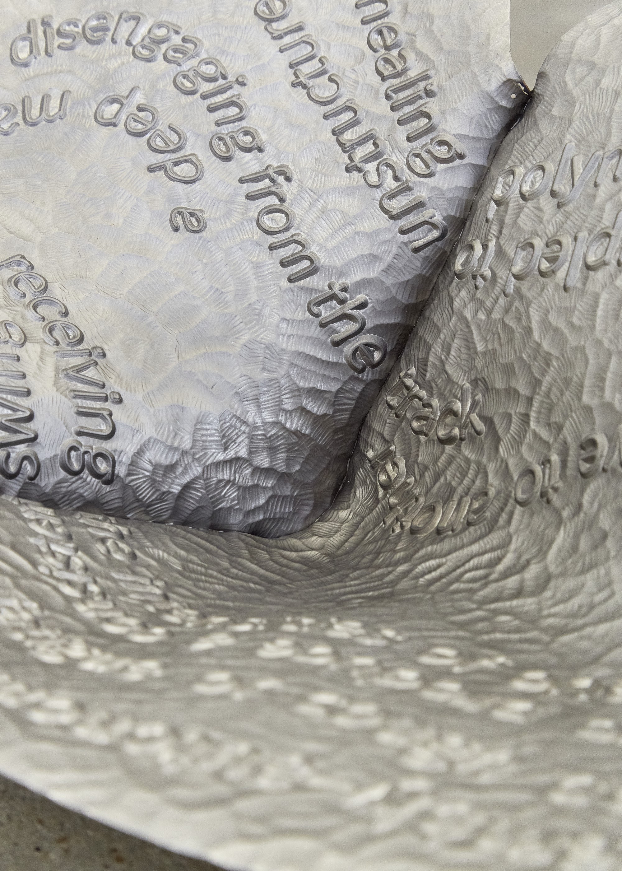 The first moments as you enter the gallery might present a feeling of emptiness, meaning giving way to gravity and pooling on the floor. A series of Fuller’s ultra-thin electroplated foils offer a cautious welcome. Continuous conductive metal skins — tenths of a millimetre thick that have been slowly grown in tanks of electrolytic solution — take up this vulnerable space communing at your feet. Engraved texts circulate the folded and stitched surfaces, caught like whispers in a colliding glass well, circling a plughole that’s not forthcoming.