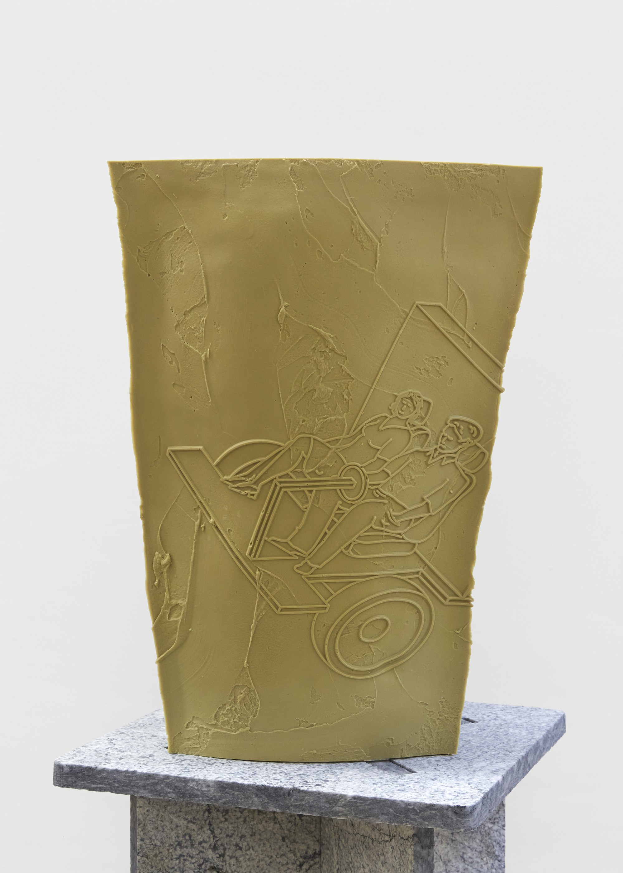 James Fuller, The cart before the horse, 2024. Patent Application Publication US 2023/0228260 A1, rotationally moulded beeswax, carnauba wax and calcium carbonate, 48(H) x 35(W) x 35(D) cm
