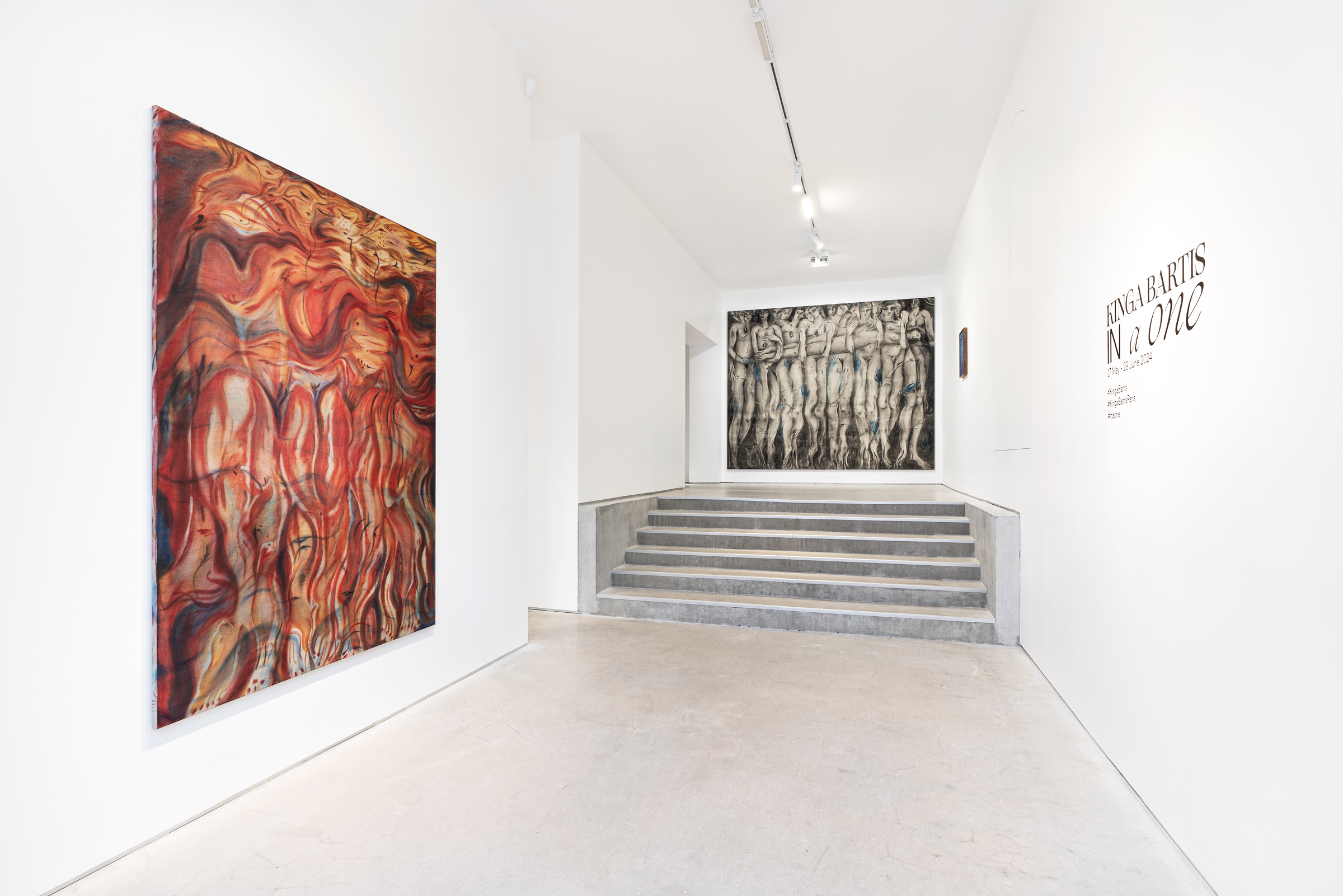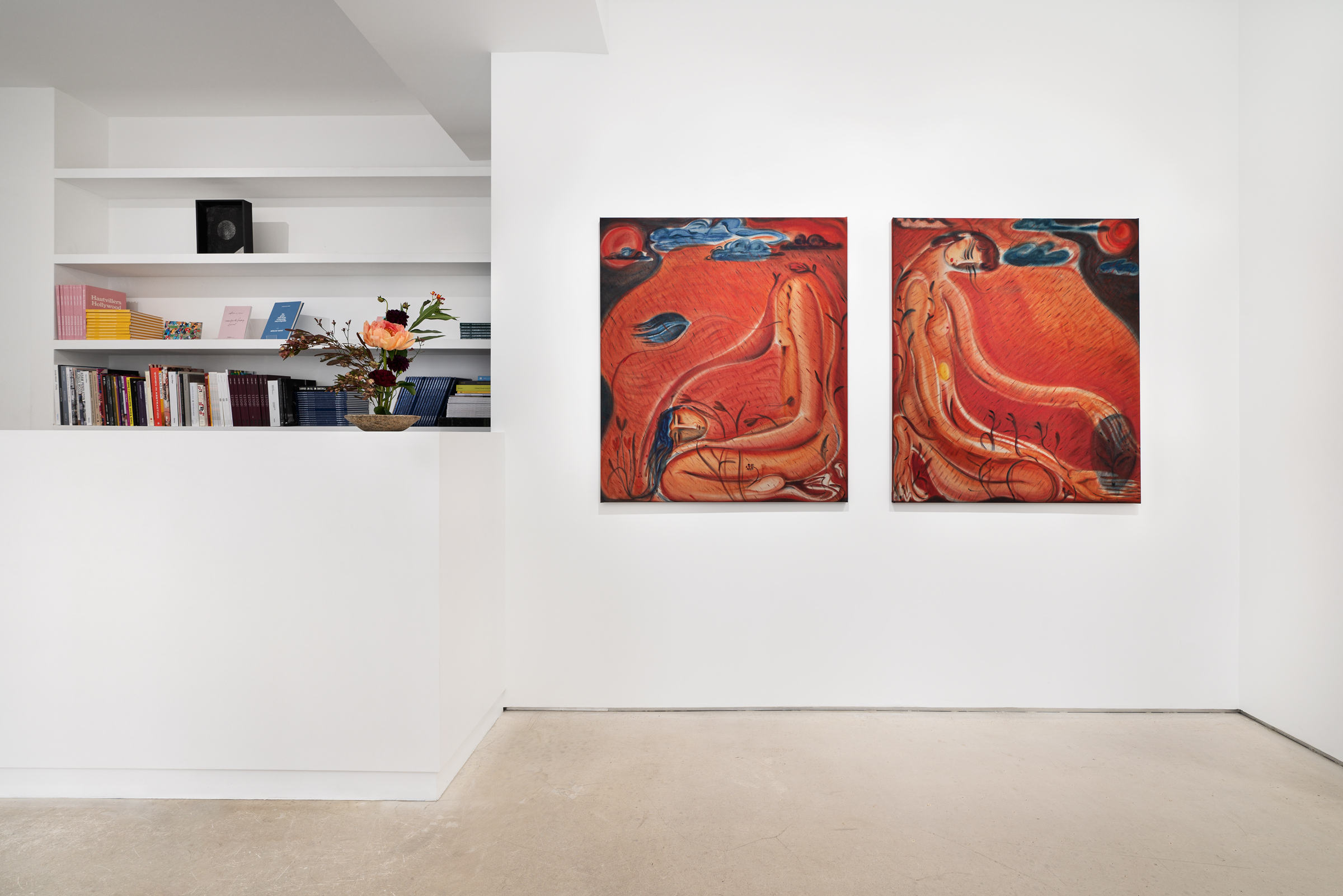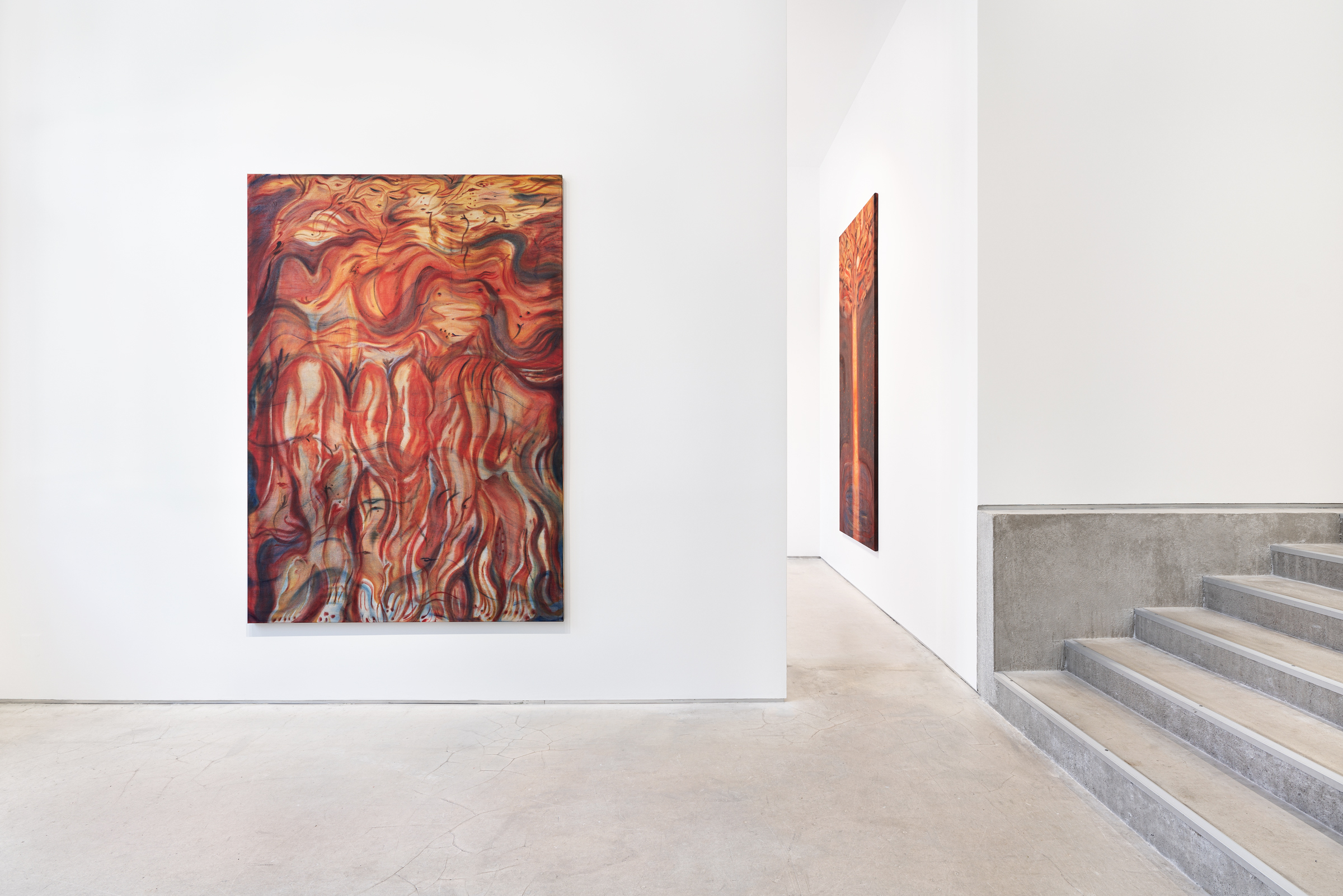 Kinga Bartisâ paintings swish, tremble, pulse, yawn. Rooted in sensation, they start from an impulse in the artistâs body that travels through the arm, hand, and brush, in sweeping strokes across towering canvases evocative of bodily scales. Rendered fluidly in fiery palettes, this suite of twelve compositions, which range wildly from 3 meters to 30 cm in width, reward sustained looking. Entire landscapes unfold within the crook of a limb. Fingers and feet morph into roots, and birds seemingly bloom from the conflagrations of cirrus-clouded skies. They consider the self in all its fluidities, and trouble â through collapsed foreground and backgrounds, landscapes and figures â the binary distinctions between human and nature, male and female, the individual and the multiple.