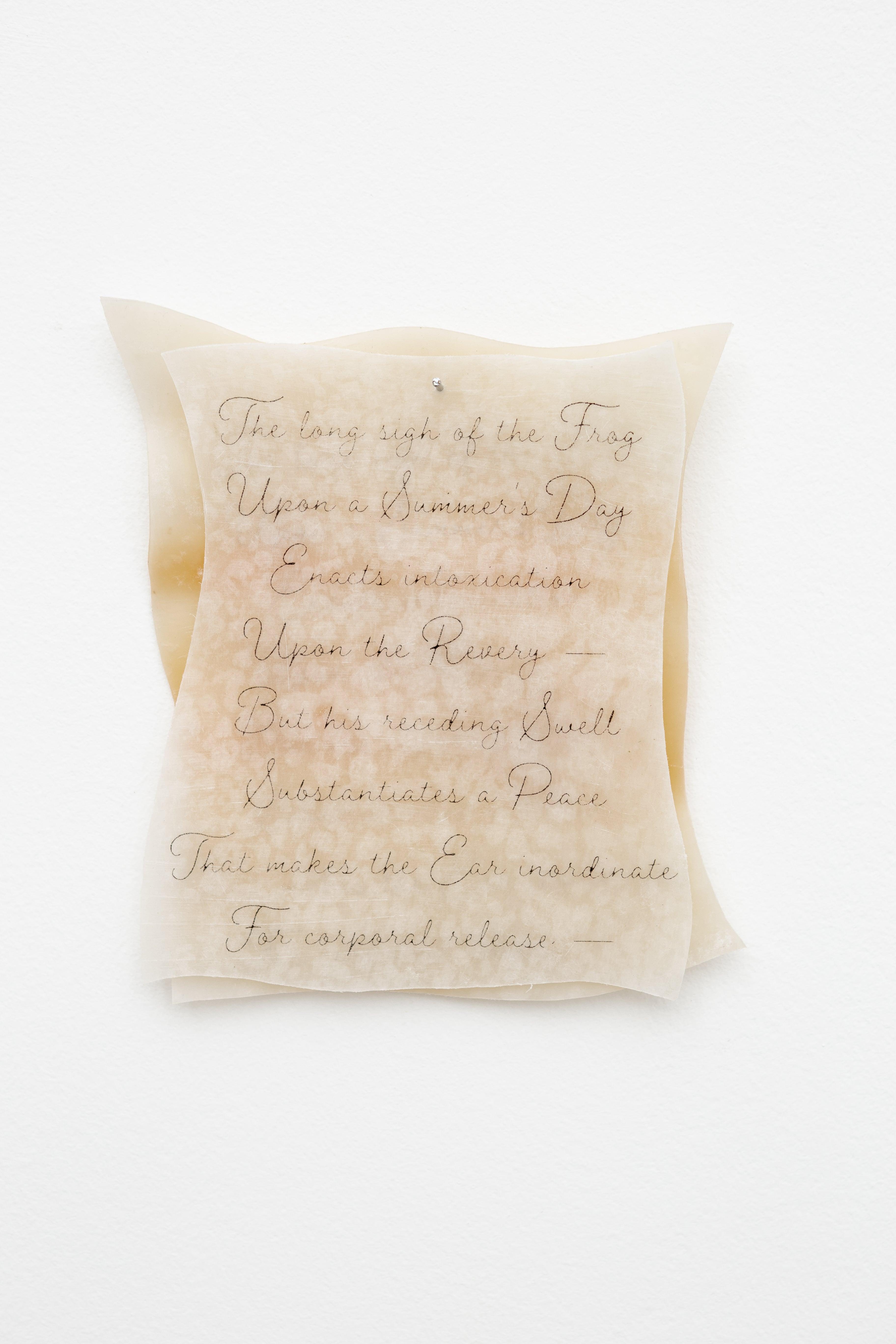 The explanation for the chosen solitude is the incomprehensibility, the otherness, the spiritual pain that slowly becomes corporeal. The exhibition, rich in Sapphic allusions, transforms the gallery space into an interior space, where the rejection of womanhood and the expectations placed upon it, and all that Dickinson turned to instead of marriage and motherhood can become embodied: her garden, her flowers, nature.