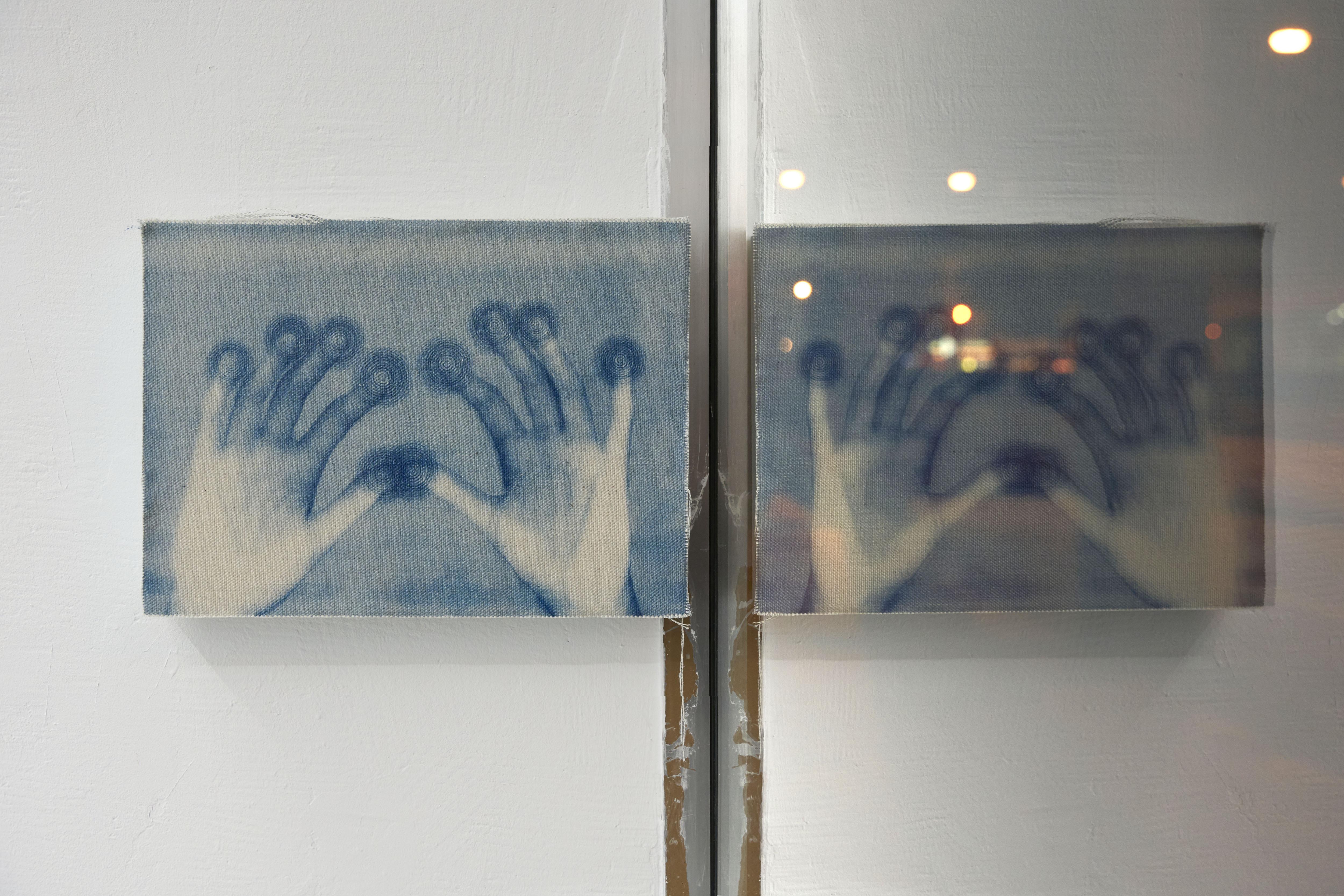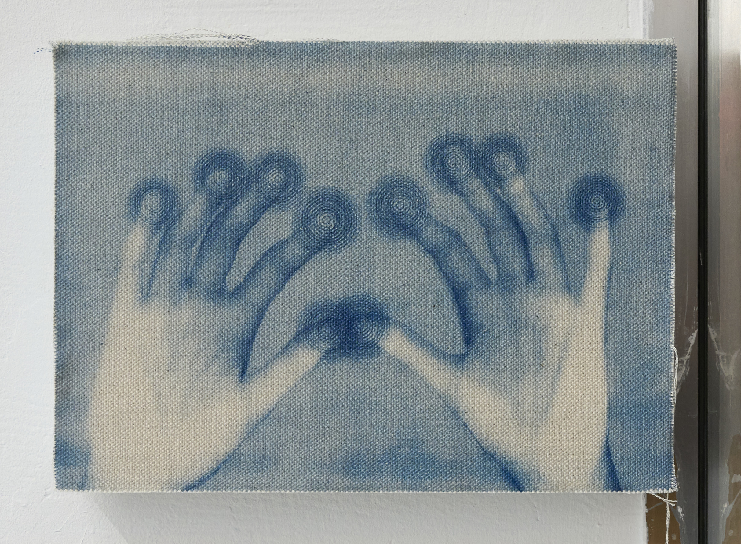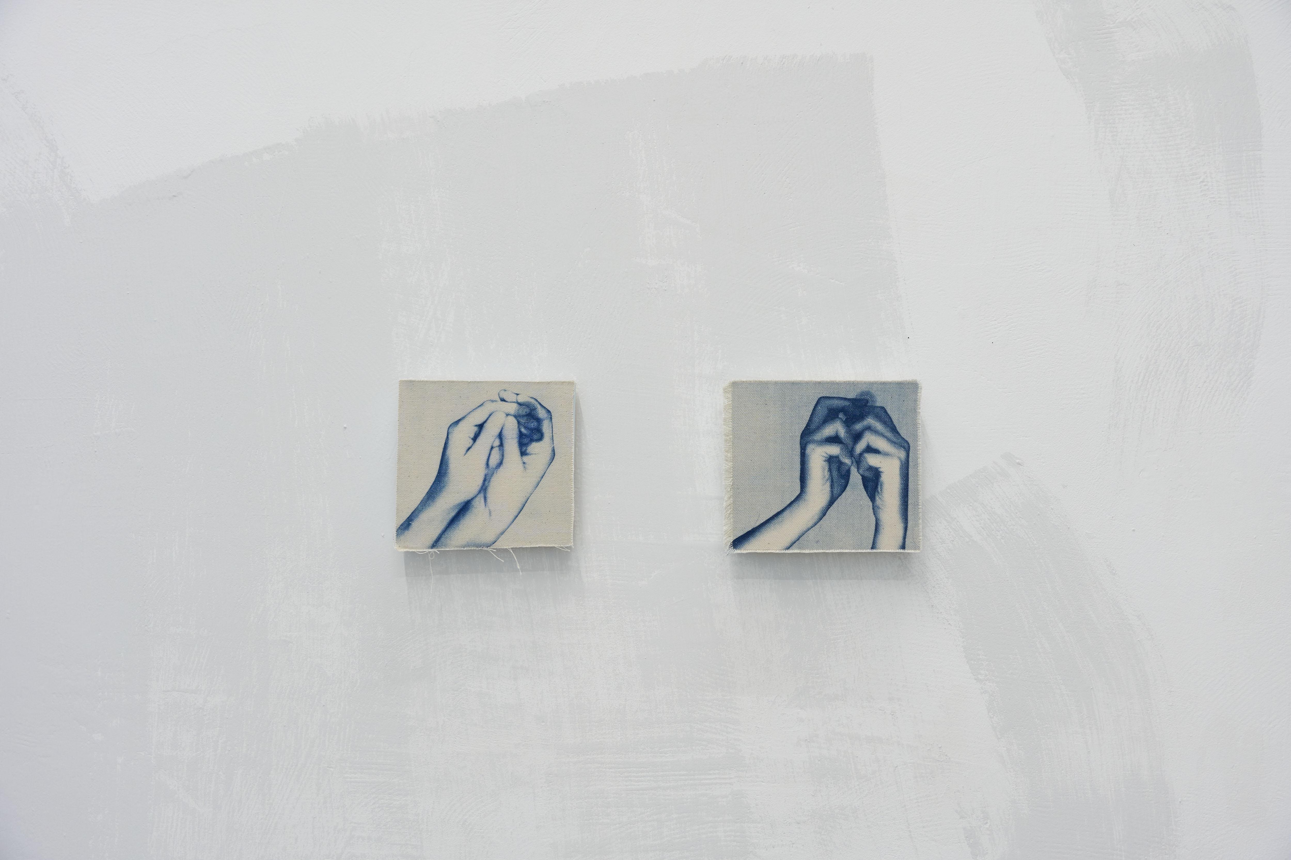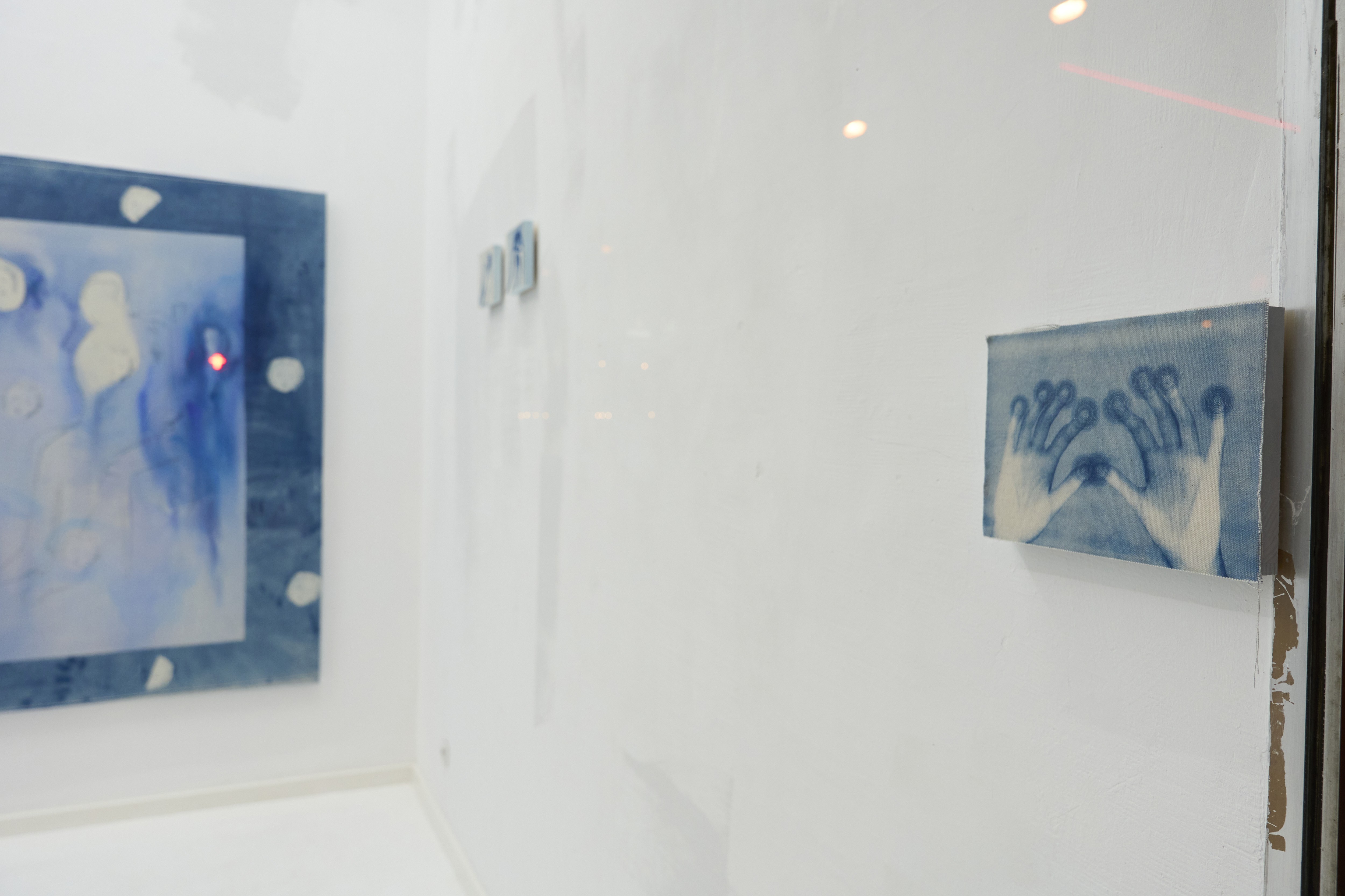 The exhibition by Swiss-Spanish artist Lena Laguna Diel transforms G10 Projektraum into a blue, melancholic world. In her installation, she combines drawing, painting and digital elements in deep blue cyanotypes whose motifs seem to float in space like dreams. Laguna Diel deliberately turns away from traditional painting techniques and fills her canvases with the colour tones created through the photographic printing process. The resulting wall objects hypnotize the viewers and drag them into an abyss of an endless cyan-coloured world in which human figures, faces and hands co-exist.