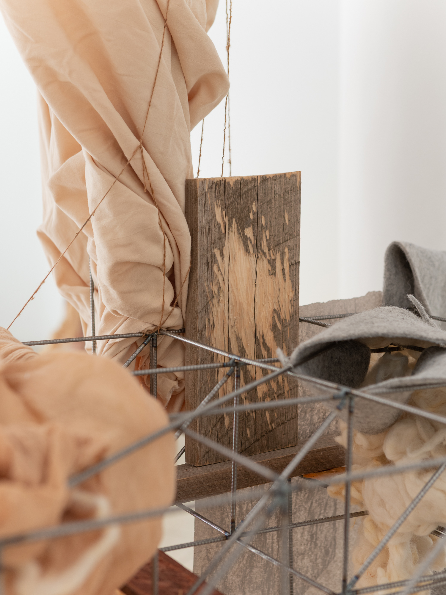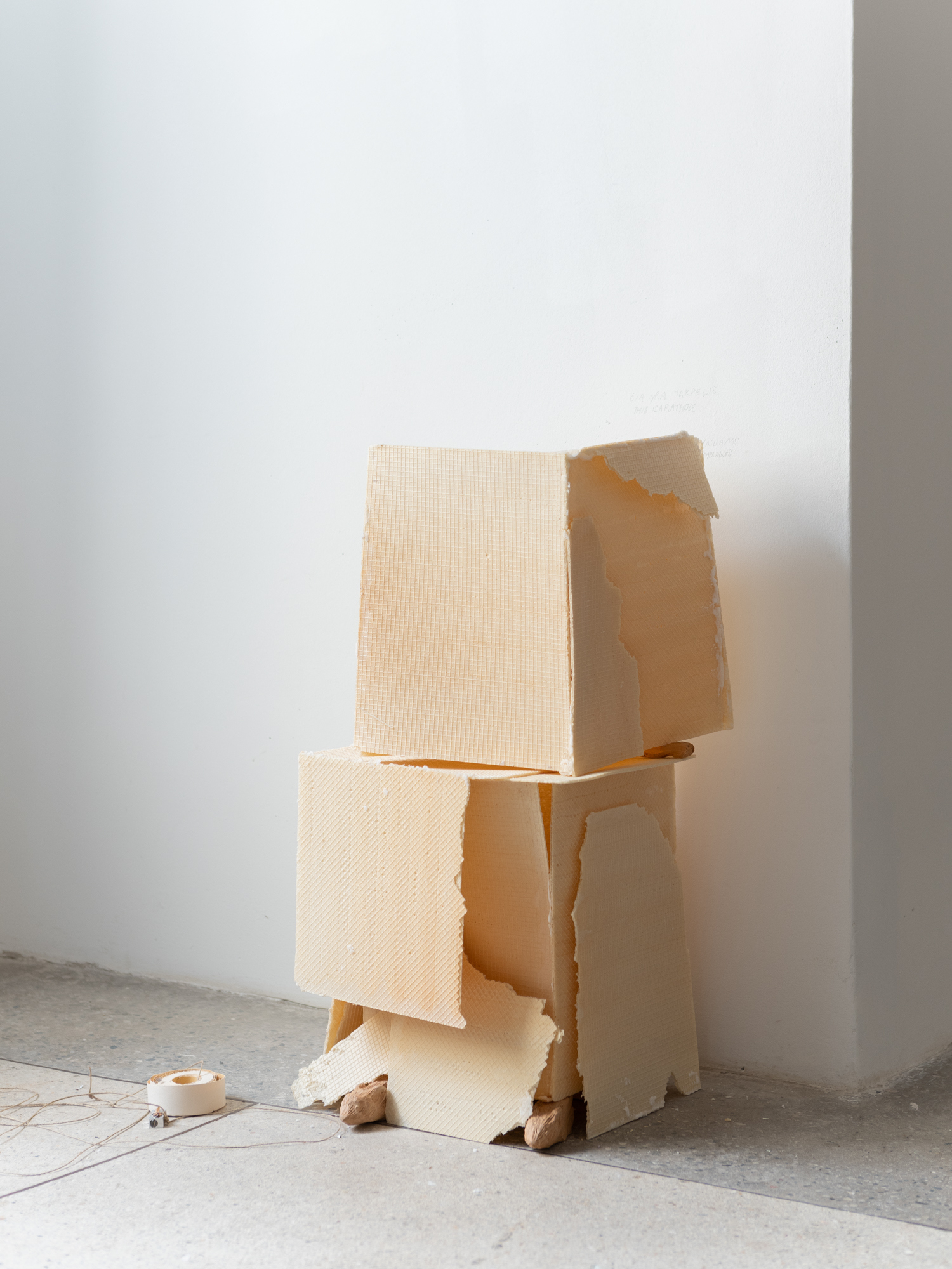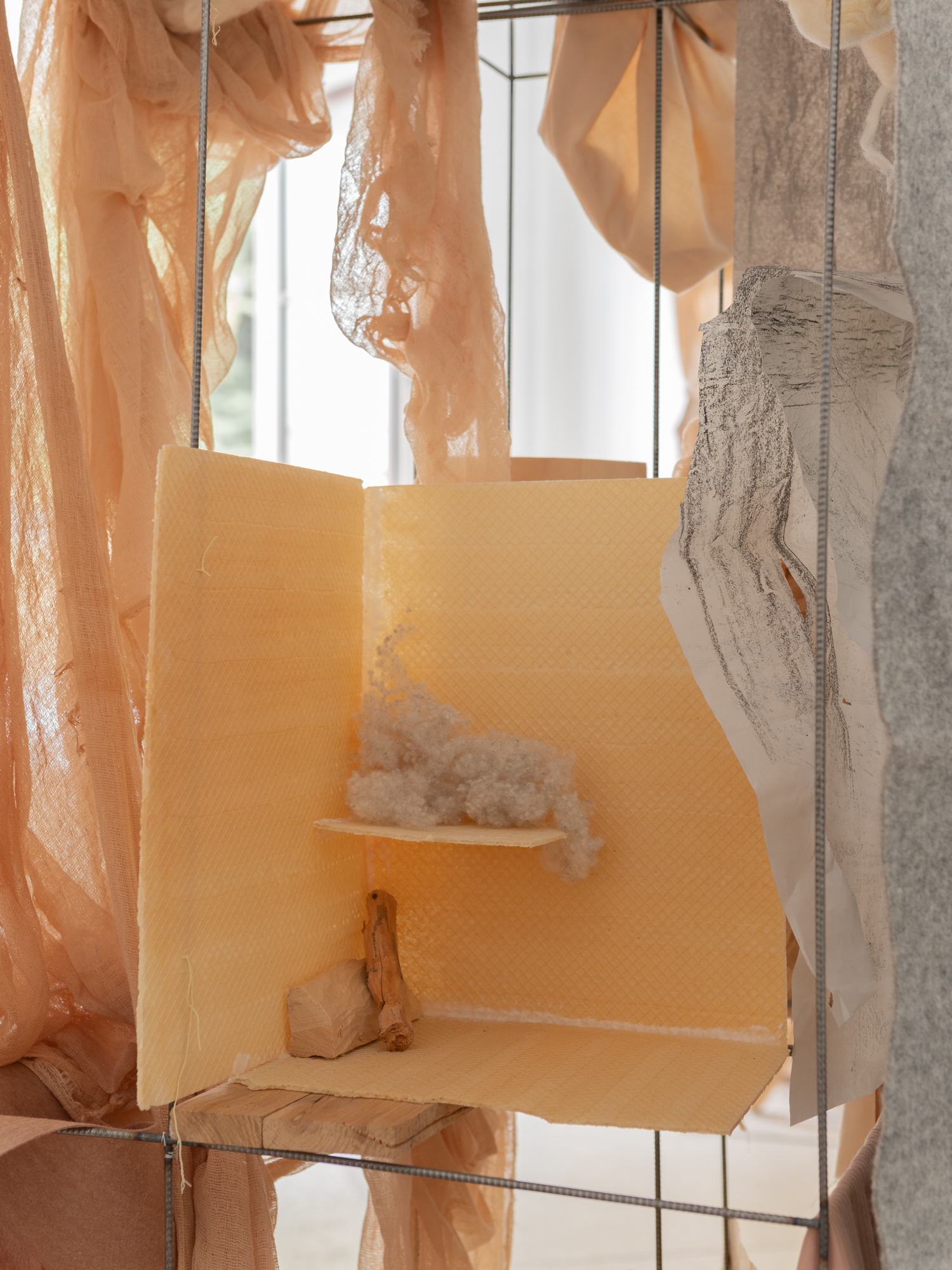 Towering bedrooms, dozens, maybe even thirty-something of them make up dusty sediment altars. The perimeters of chambers, their floors, the usual desire paths are bitten out of cardboard, or biscuits. The walls, thinner than paper, are in some rooms soft, malleable to touch. In other stories, as if after incessant rat pleas, swarms of wasps constructed domes and columns. Belched out, porous nooks for life and death. Scattered and blackened from decay bone courtyards are always ready for relentless change. Rat’s teeth never stop growing. She scurries between dank warm reek and crisp drafts, stretching doorways’ cob veils through all air ducts.