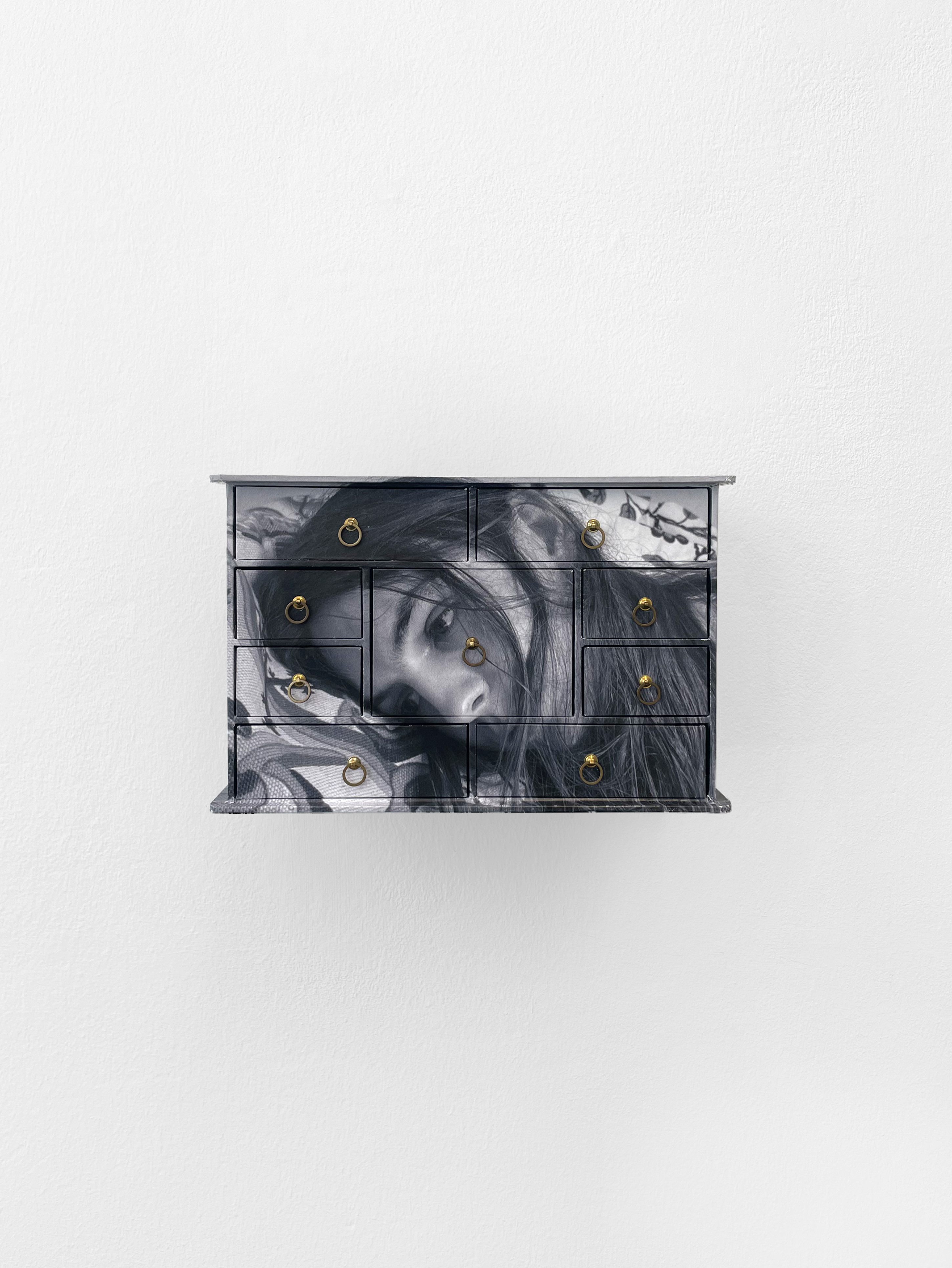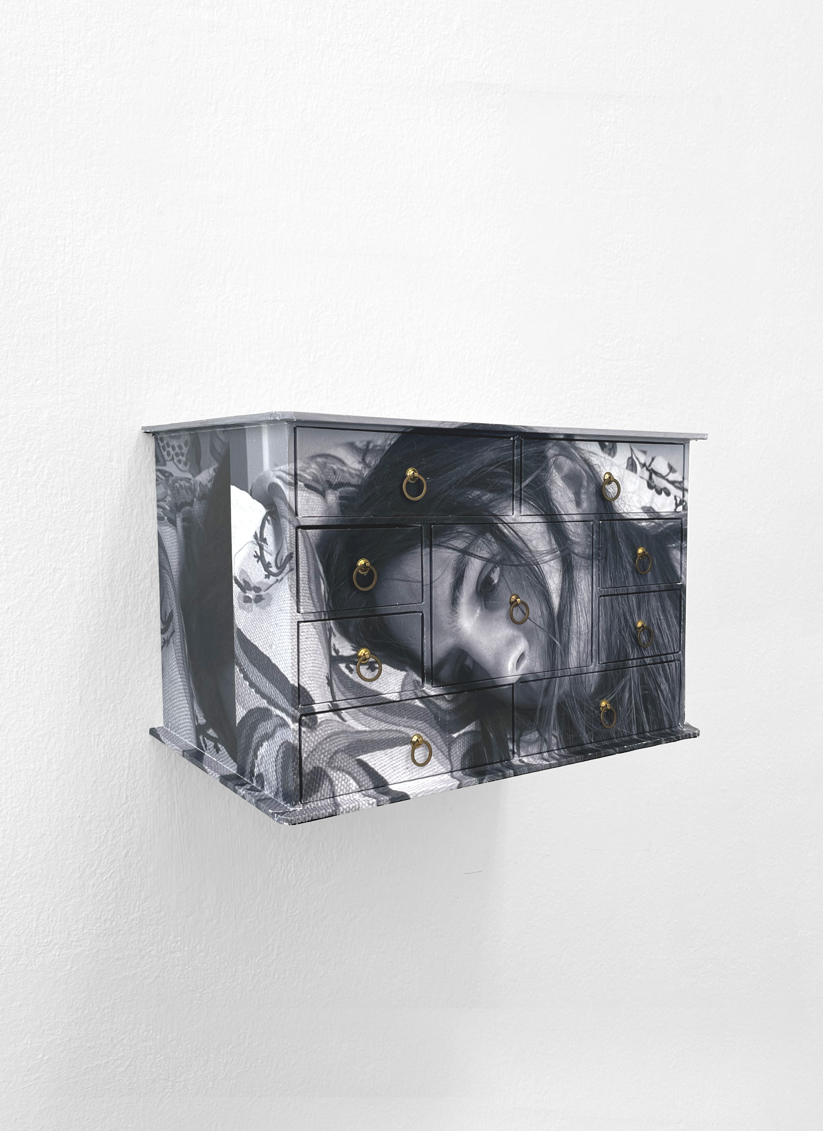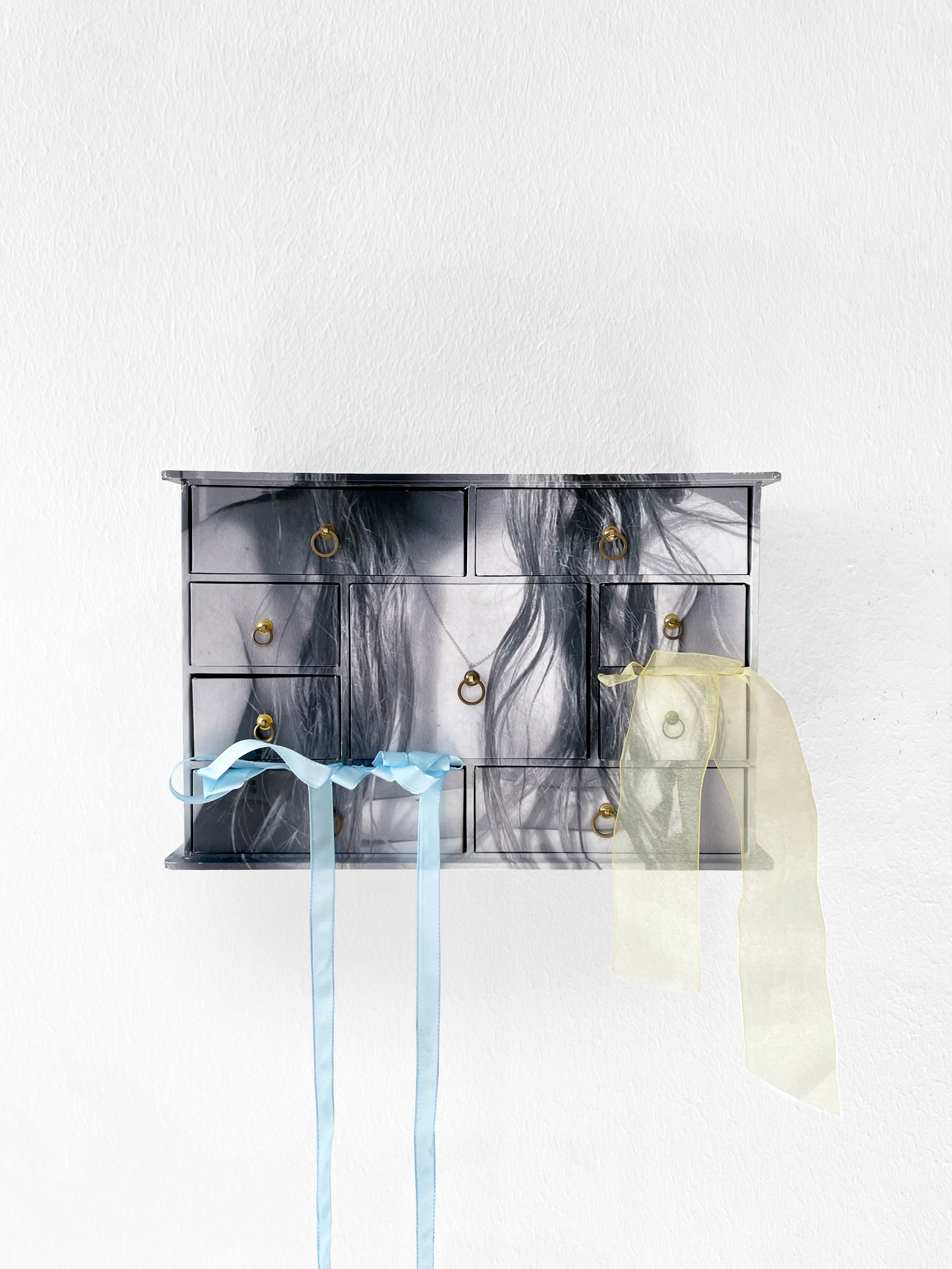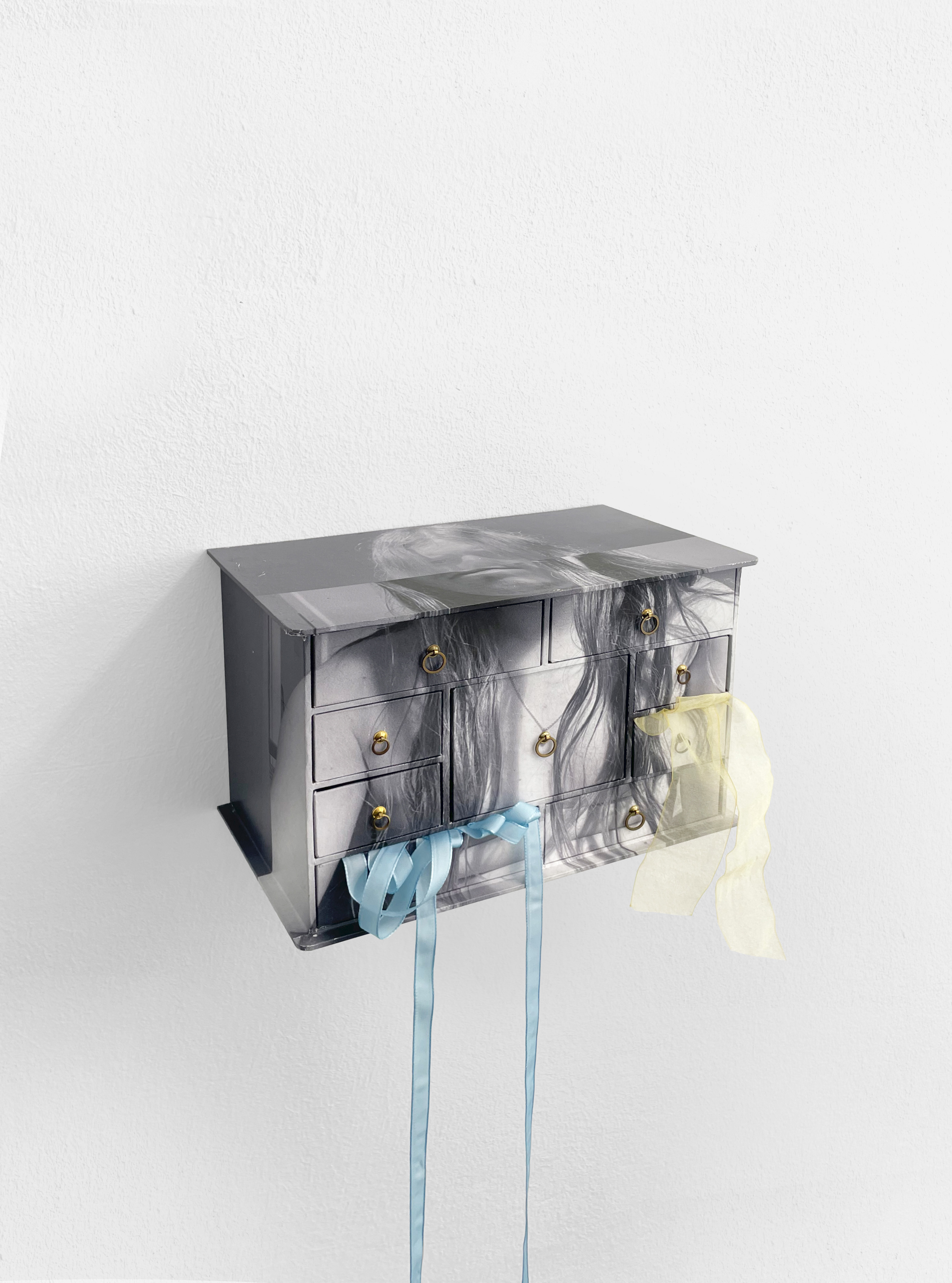 eveling the playing field, the artist implements seemingly antagonistic forces as he exploits the counterpart to abstraction, namely ornamentation and craftsmanship craftsmanship, moreover, that is traditionally associated with women: graphic and textile design. rawing on the silhouettes of chocolate boxes from the traditional Viennese artisan Altmann & KuÌhne (known for Wiener WerkstaÌtte designs by KatoÌ LukaÌts), his wall-mounted sculptures (Chest and Alex, both 2024) imitate chests of drawers and engage with the whimsical phenomenon of the treasure box as a repository for childhood memories or everyday commodities. Close-ups of long hair on an uncovered chest, oral fabric patterns (the tendril as inspired by the craft of block printing and reinterpreted by the Viennese architect and modernist Josef Frank) or collaged gift ribbons subsume the austere structure of the grid as the artist engages with sexual ambiguity.