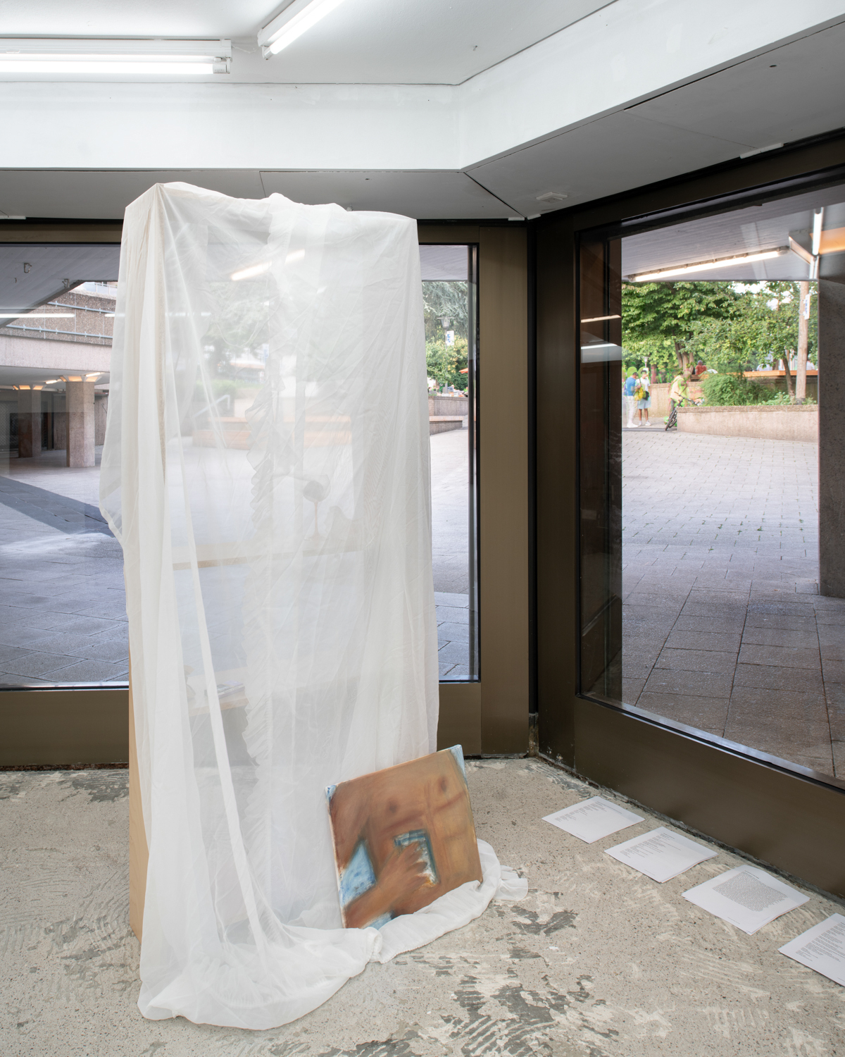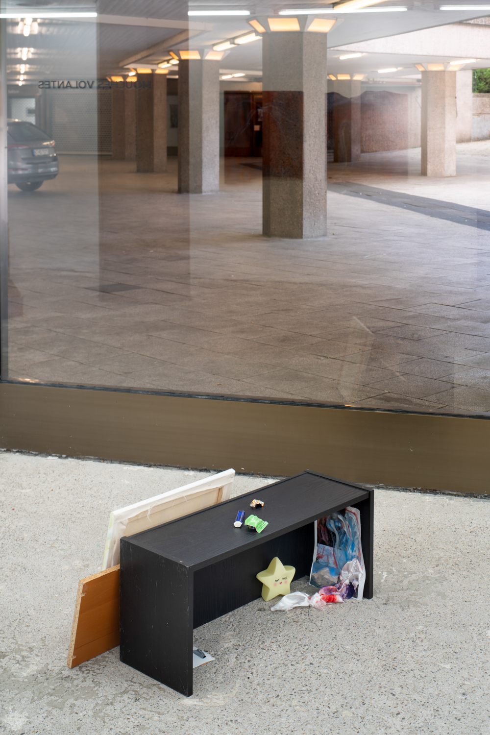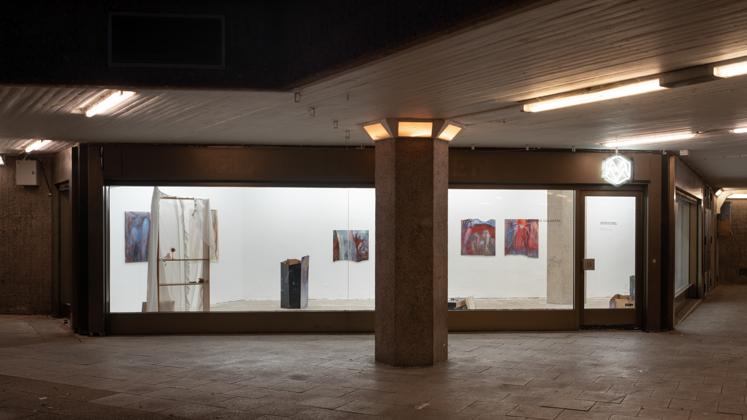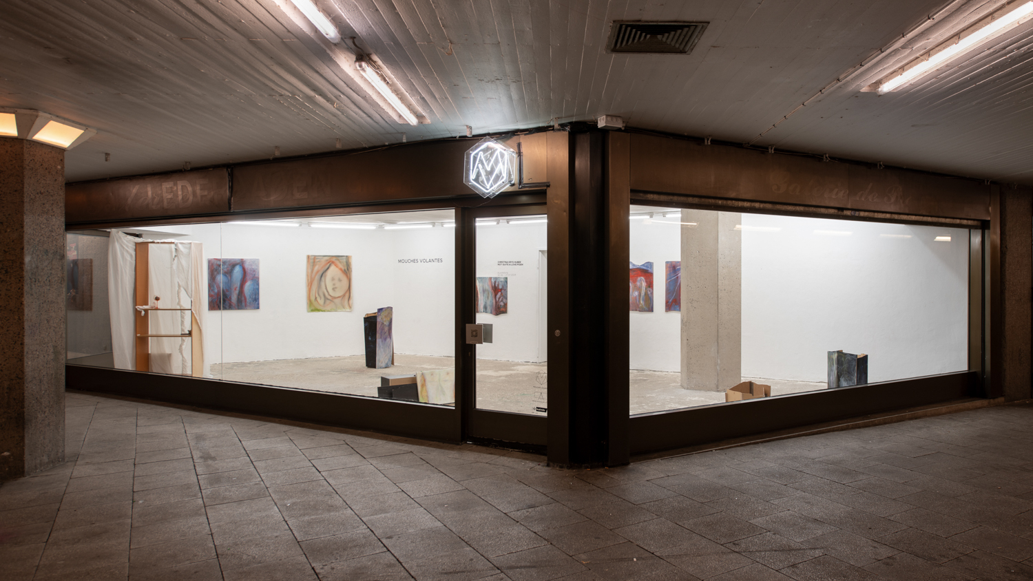 The solo exhibition NOT QUITE A LOVE POEM by Christina Krys Huber is dedicated to questions of queer identity and social belonging in seemingly standardised social structures. The focus is on the coexistence of different subjects in urban space and their relationship to each other, taking the immediate surroundings of Mouches Volantes as a reference.