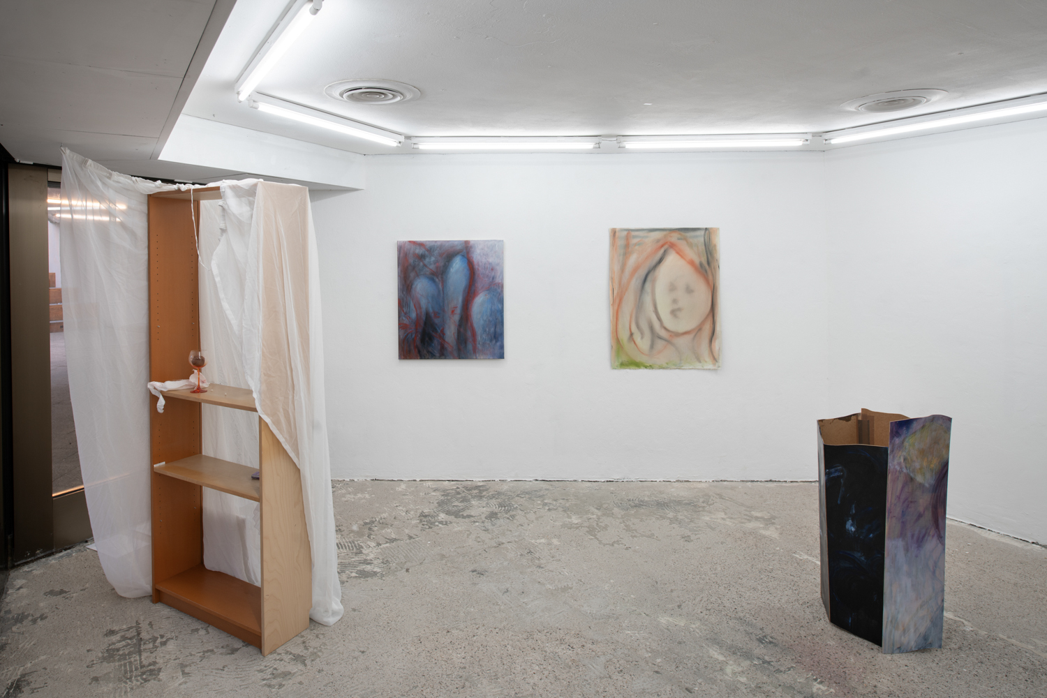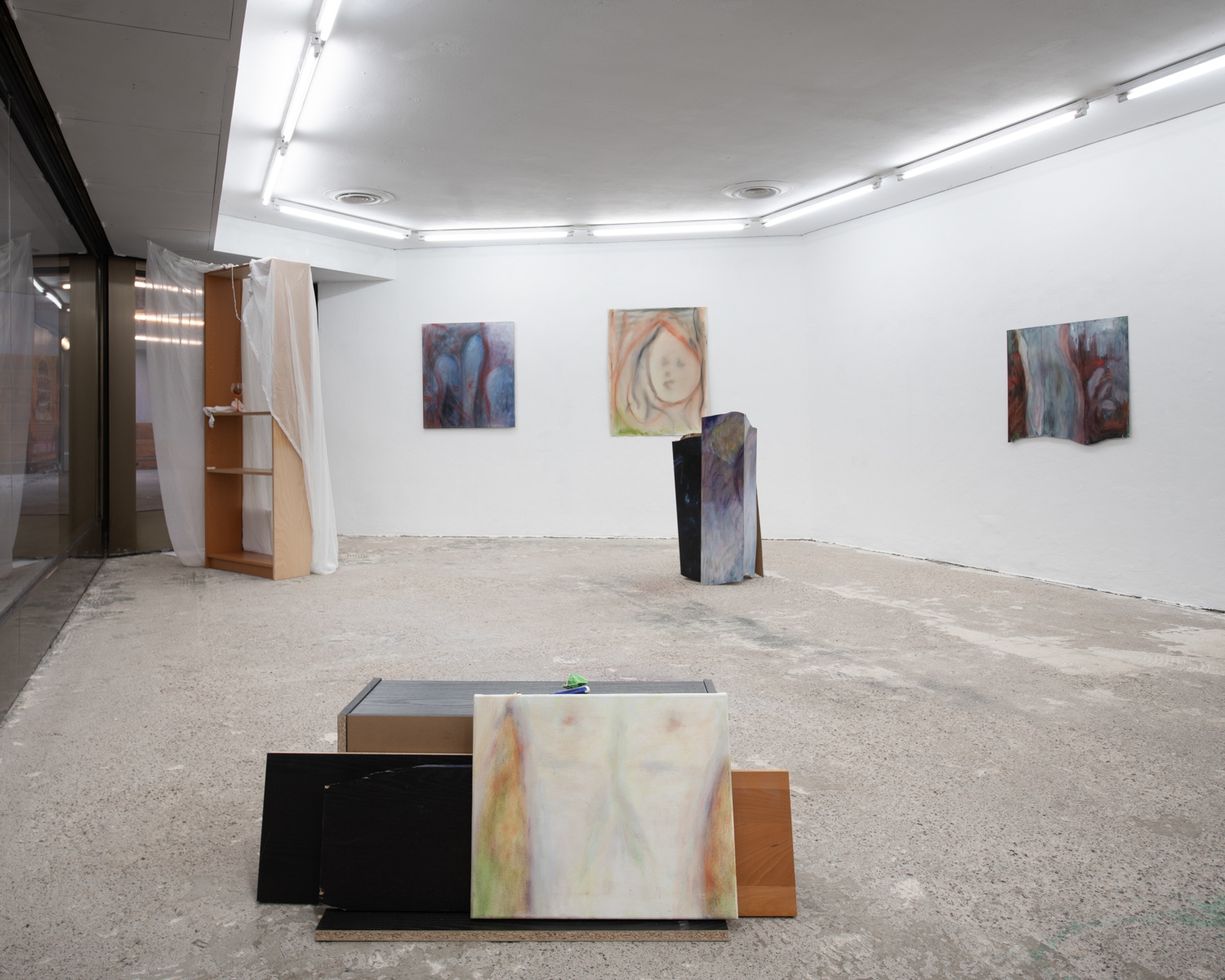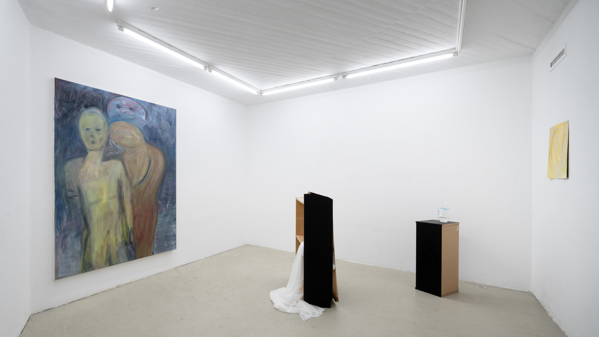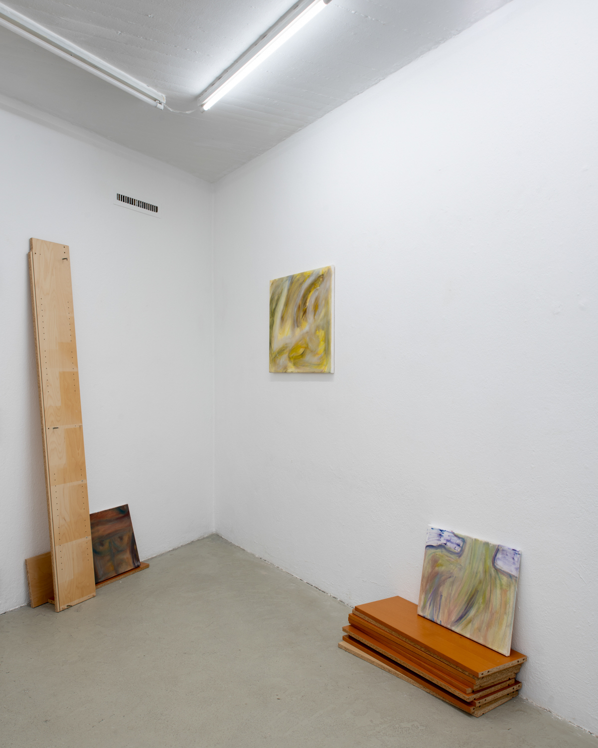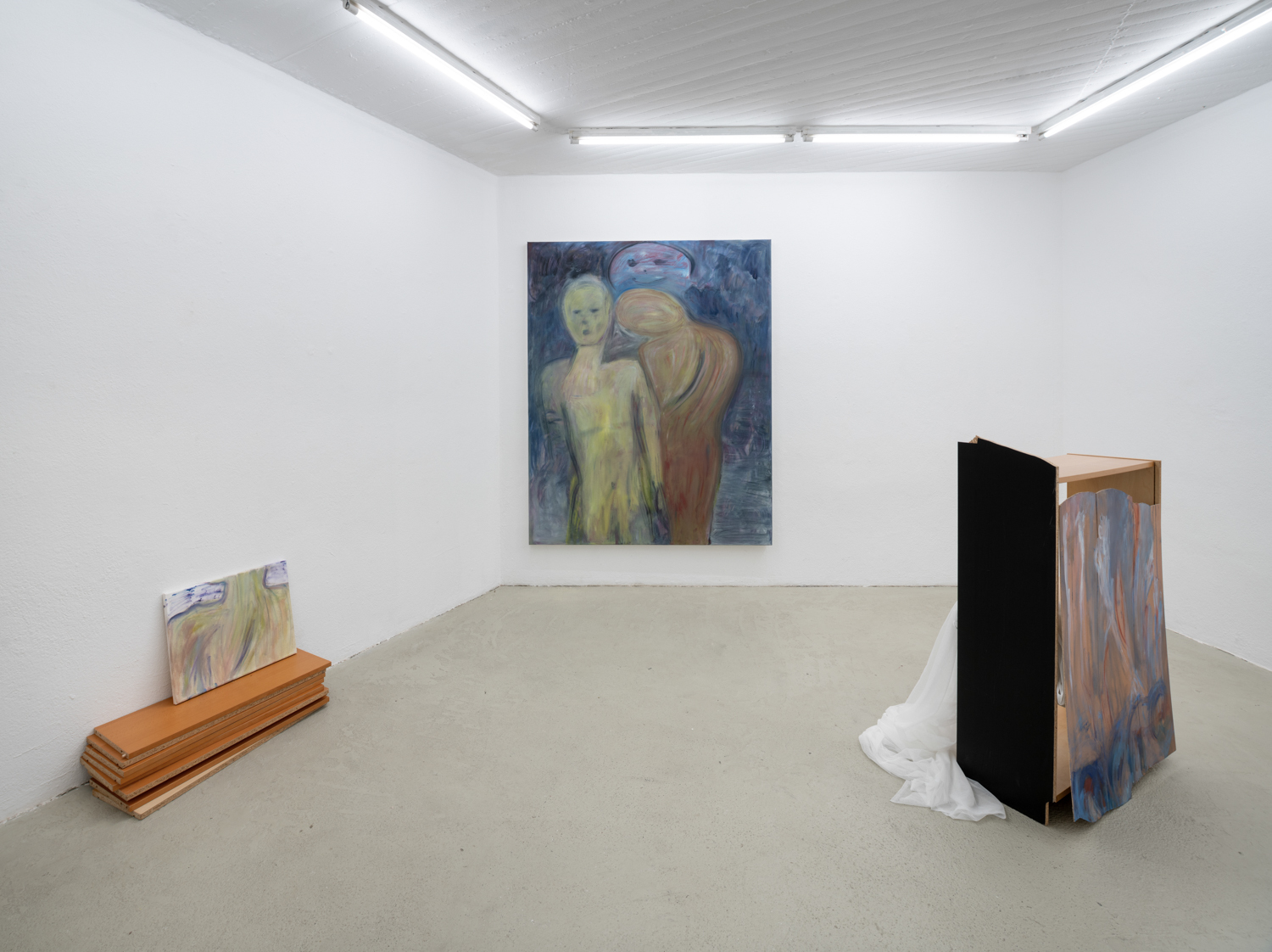 Christina Krys Huber's characteristic paintings, in which human bodies appear fragmented, serve as a starting point. The figures, some of which are only hinted at and distorted, merge with the abstract backgrounds on the canvas. In a new series of works presented for the first time, the artist also appropriates plywood from discarded IKEA Billy shelves. The pieces of furniture, often used for temporary and quick furnishings, are robbed of their actual function in their deconstructed form. The spatial installation plays with the visitors' self-perception and throws them back onto their own physicality. Through poetic texts, the artist also provides an insight into personal memories and into an imagined and real collective memory. A performative reading will take place as part of the opening. NOT QUITE A LOVE POEM is Christina Krys Huber's first presentation in North Rhine-Westphalia.