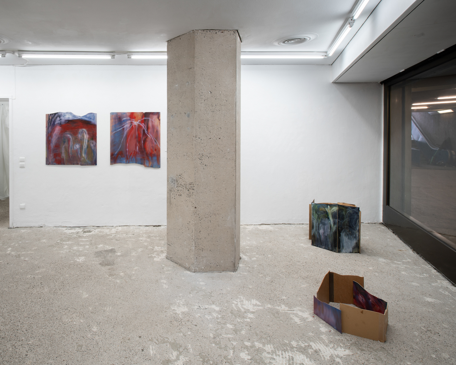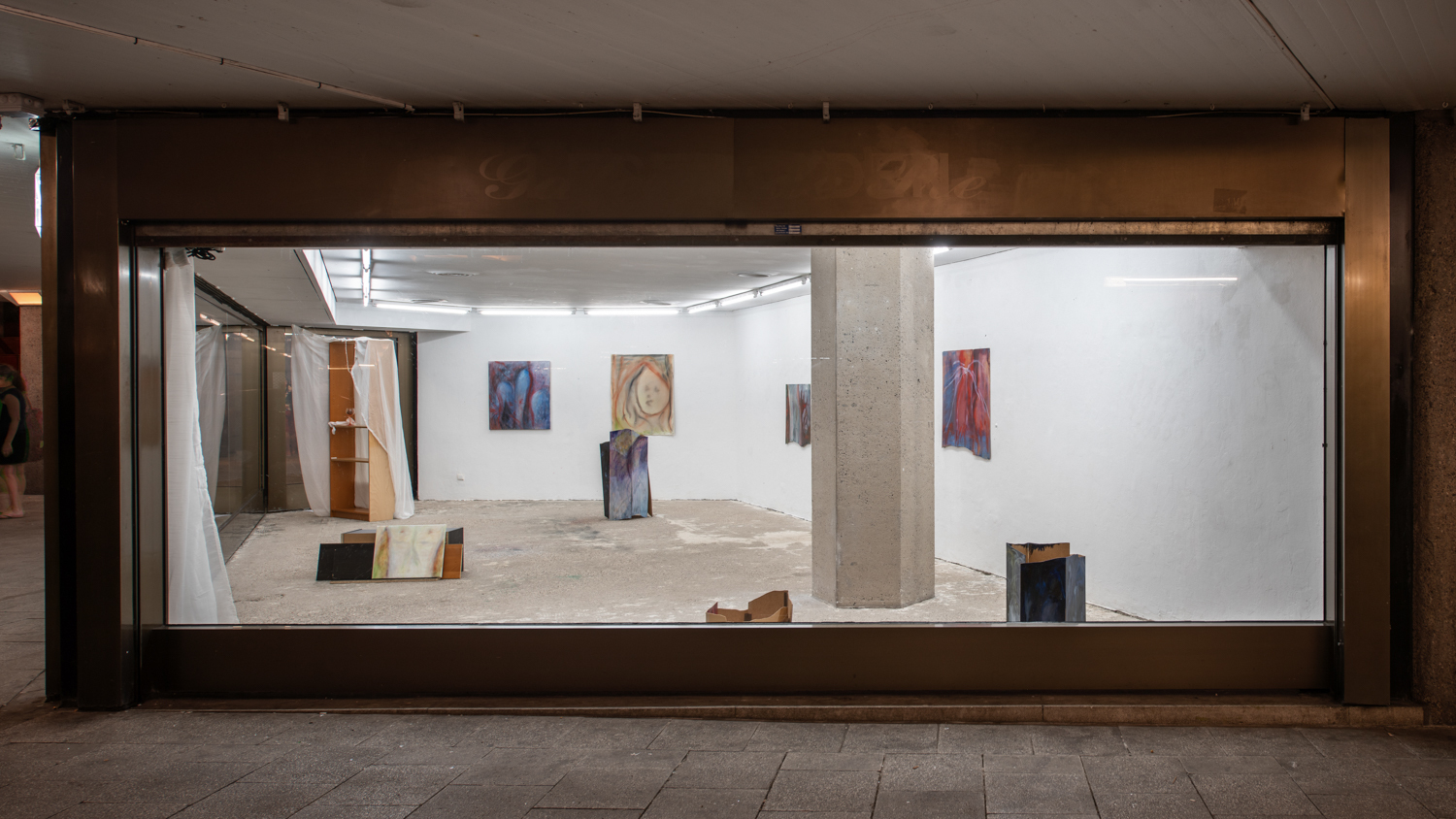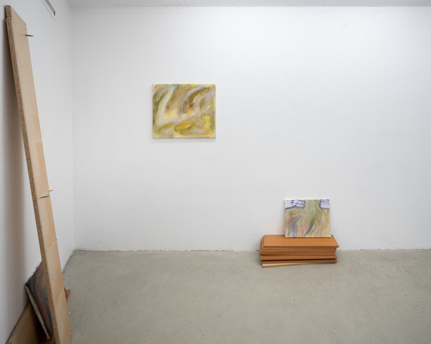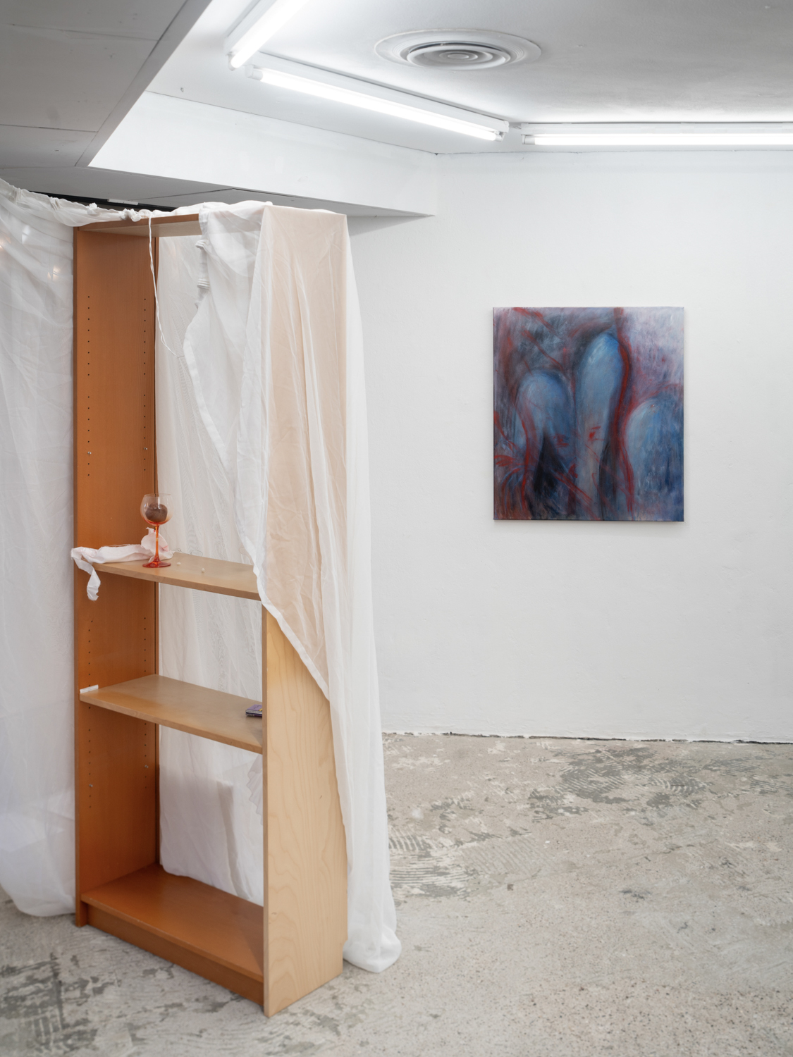Christina Krys Huber's characteristic paintings, in which human bodies appear fragmented, serve as a starting point. The figures, some of which are only hinted at and distorted, merge with the abstract backgrounds on the canvas. In a new series of works presented for the first time, the artist also appropriates plywood from discarded IKEA Billy shelves. The pieces of furniture, often used for temporary and quick furnishings, are robbed of their actual function in their deconstructed form. The spatial installation plays with the visitors' self-perception and throws them back onto their own physicality. Through poetic texts, the artist also provides an insight into personal memories and into an imagined and real collective memory. A performative reading will take place as part of the opening. NOT QUITE A LOVE POEM is Christina Krys Huber's first presentation in North Rhine-Westphalia.