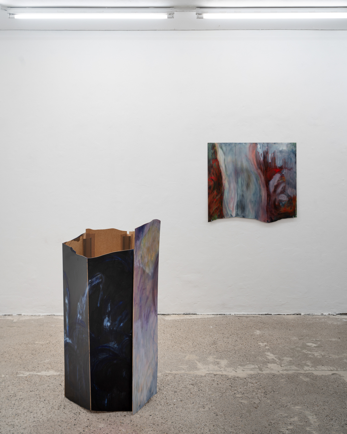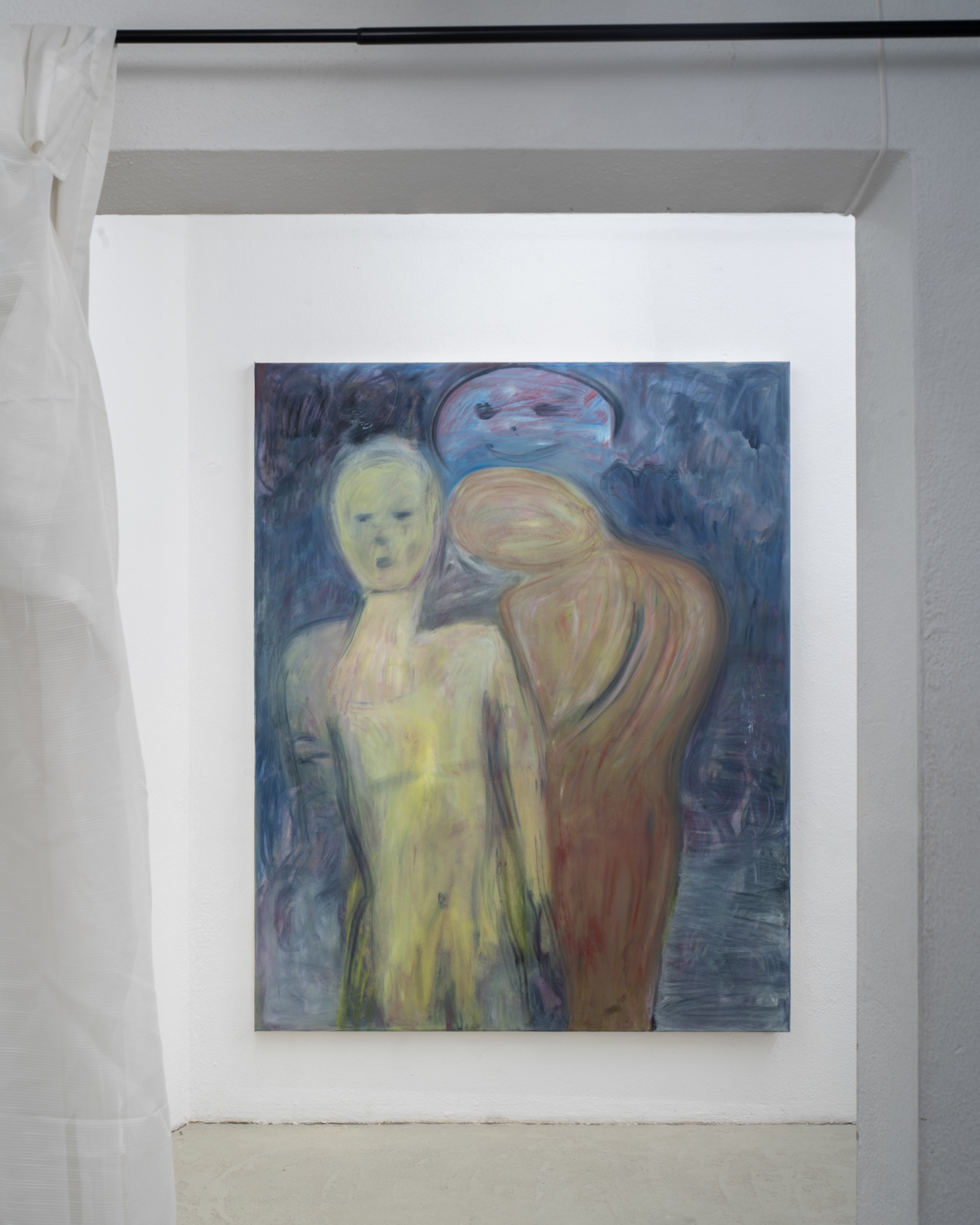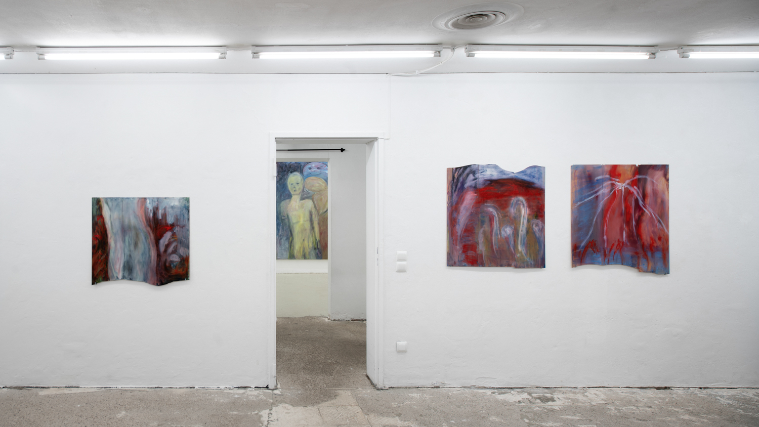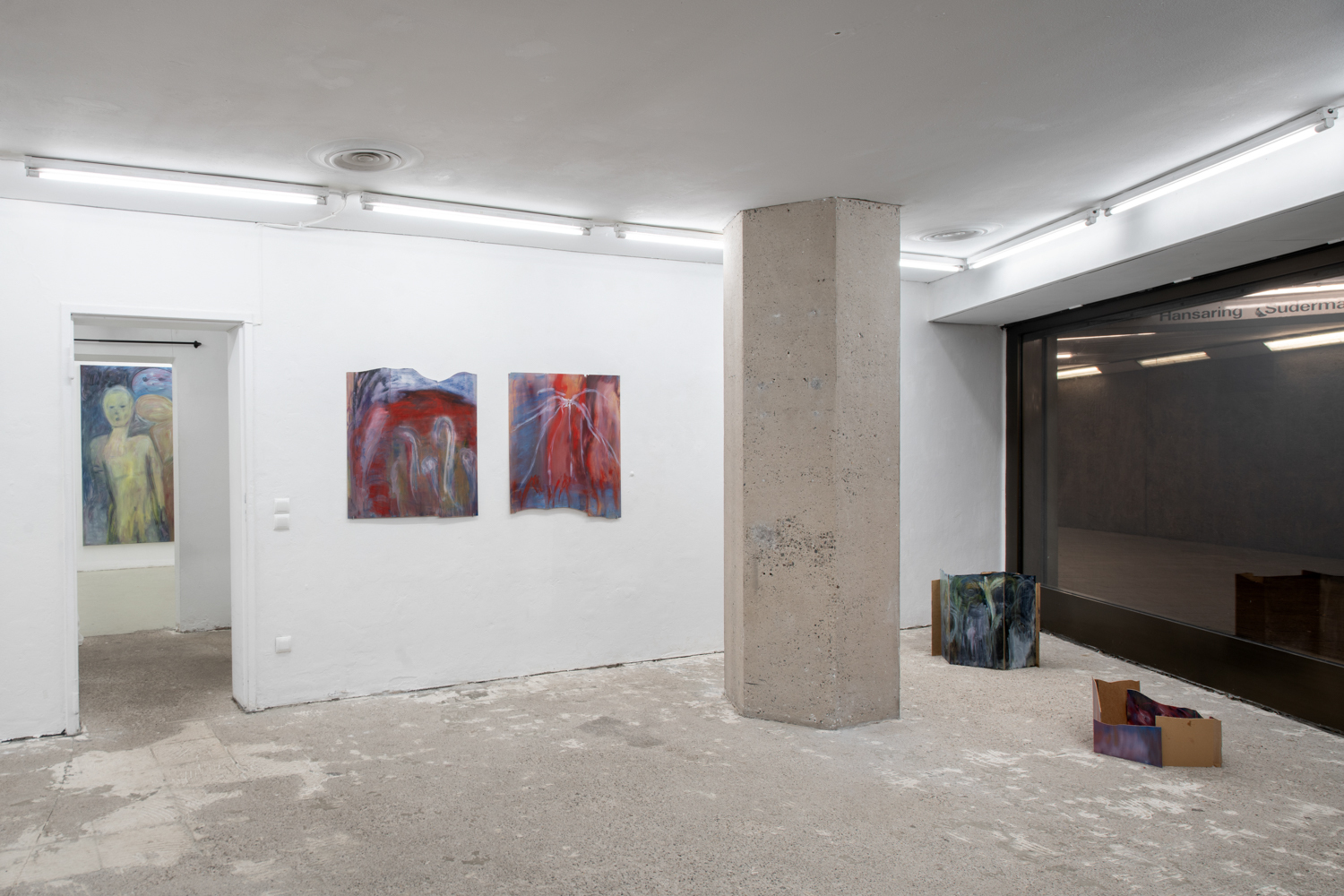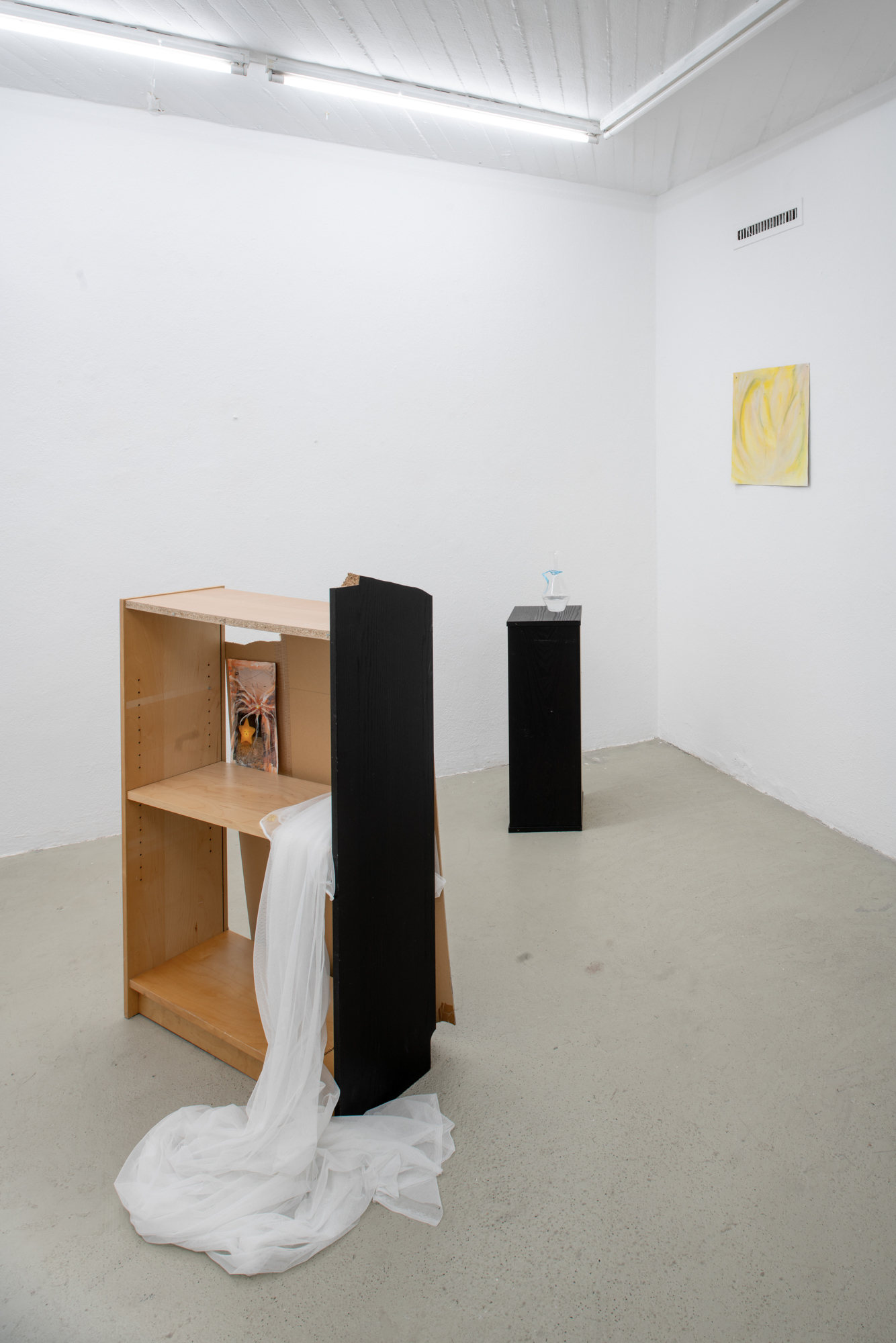 Christina Krys Huber's characteristic paintings, in which human bodies appear fragmented, serve as a starting point. The figures, some of which are only hinted at and distorted, merge with the abstract backgrounds on the canvas. In a new series of works presented for the first time, the artist also appropriates plywood from discarded IKEA Billy shelves. The pieces of furniture, often used for temporary and quick furnishings, are robbed of their actual function in their deconstructed form. The spatial installation plays with the visitors' self-perception and throws them back onto their own physicality. Through poetic texts, the artist also provides an insight into personal memories and into an imagined and real collective memory. A performative reading will take place as part of the opening. NOT QUITE A LOVE POEM is Christina Krys Huber's first presentation in North Rhine-Westphalia.