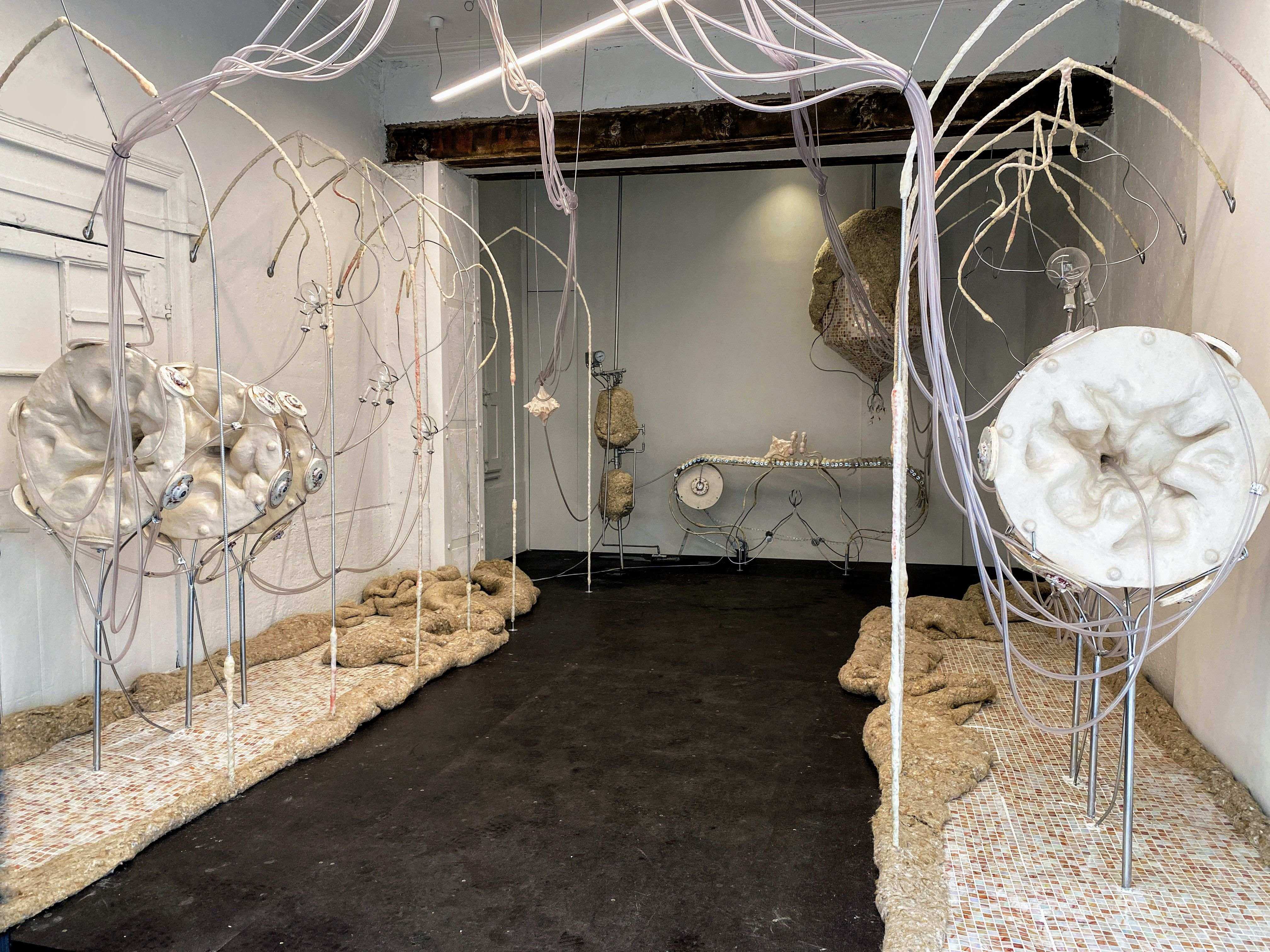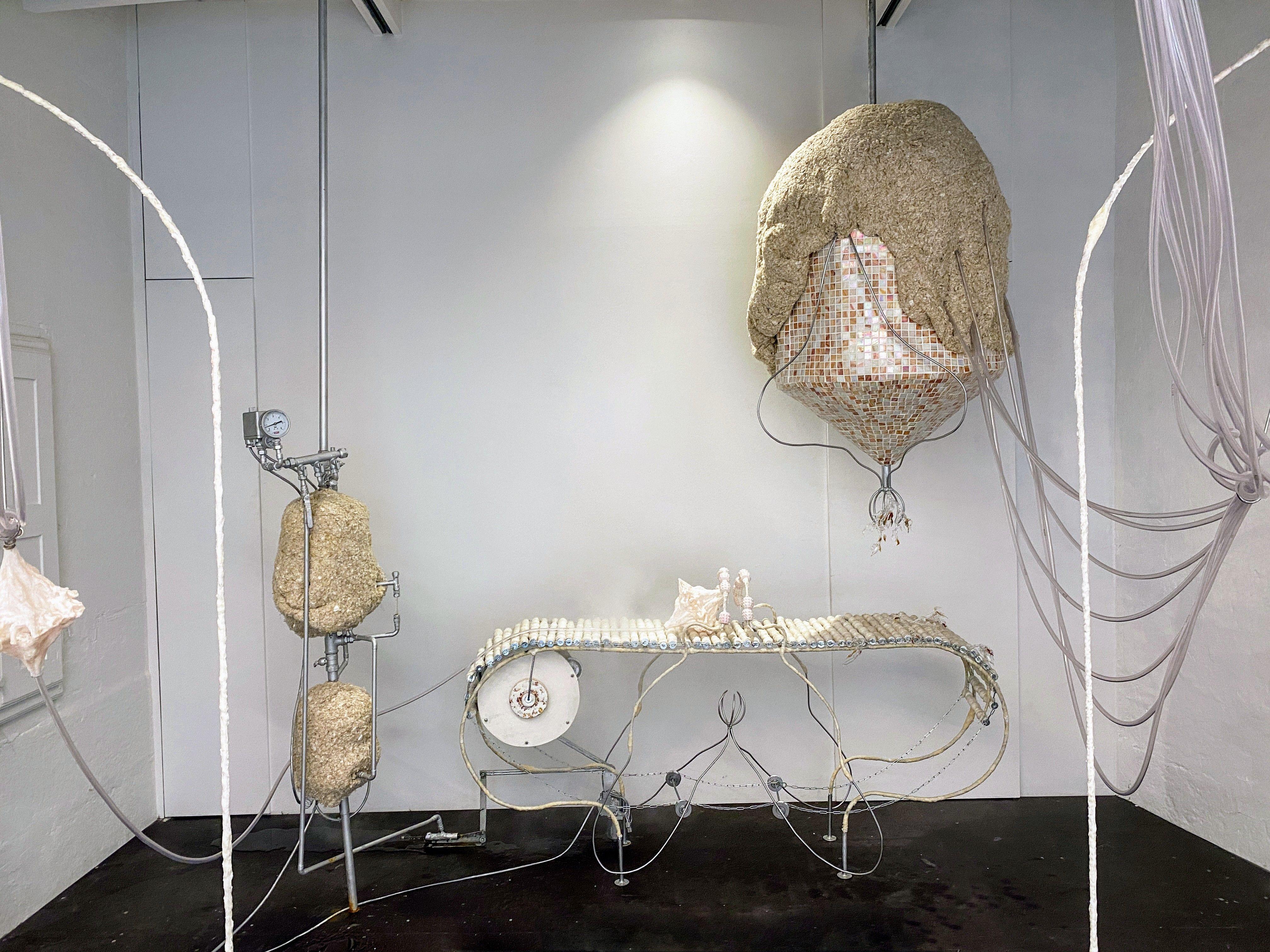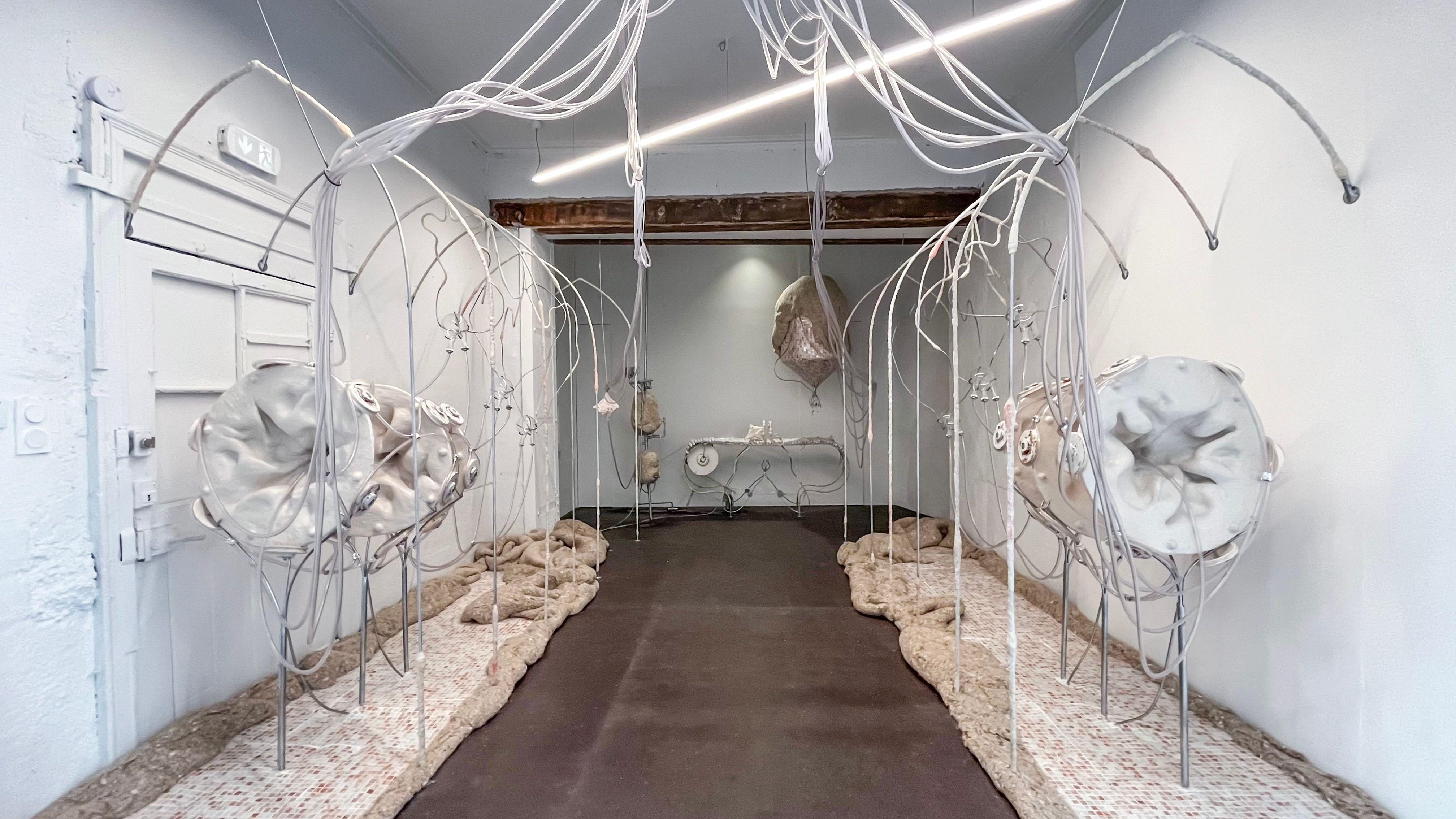 "As places of transformation in a quasi-clinical world, the immersive installations by AnaĂŻs Gauthier hybridize the organic with the industrial. They are active as a body-machine that comes to break the silence to explore our contemporary care mechanisms. The artist proposes here an in-situ installation in two parts: a factory of the intimate that is mechanized, an imperfect machinery that becomes humanized. Unidentified hybrid forms question the mechanization of our bodies at work and their potential failure. The gears seem ready to shake like vital organs, but a permanent seepage betrays their emotional overheating."