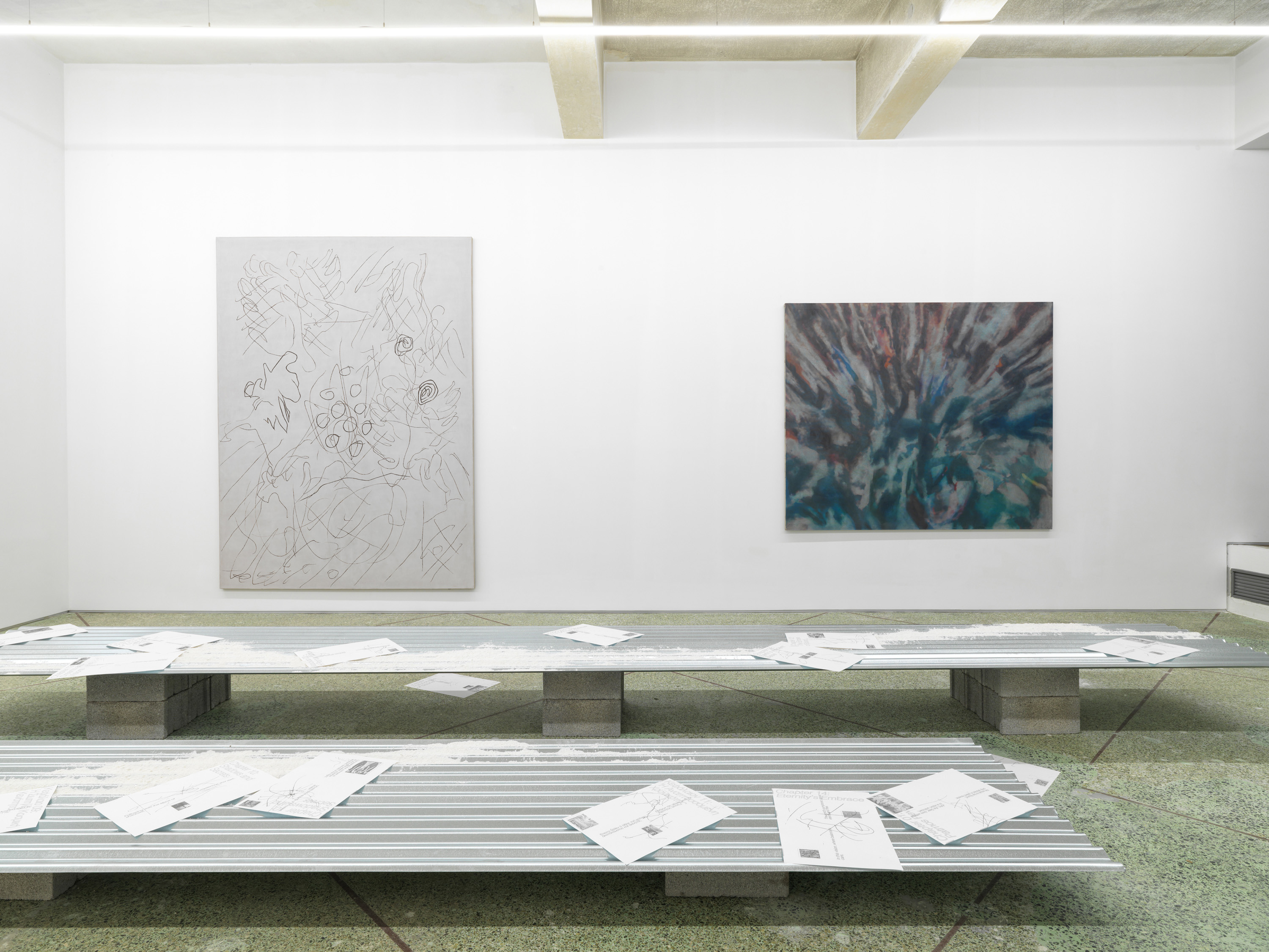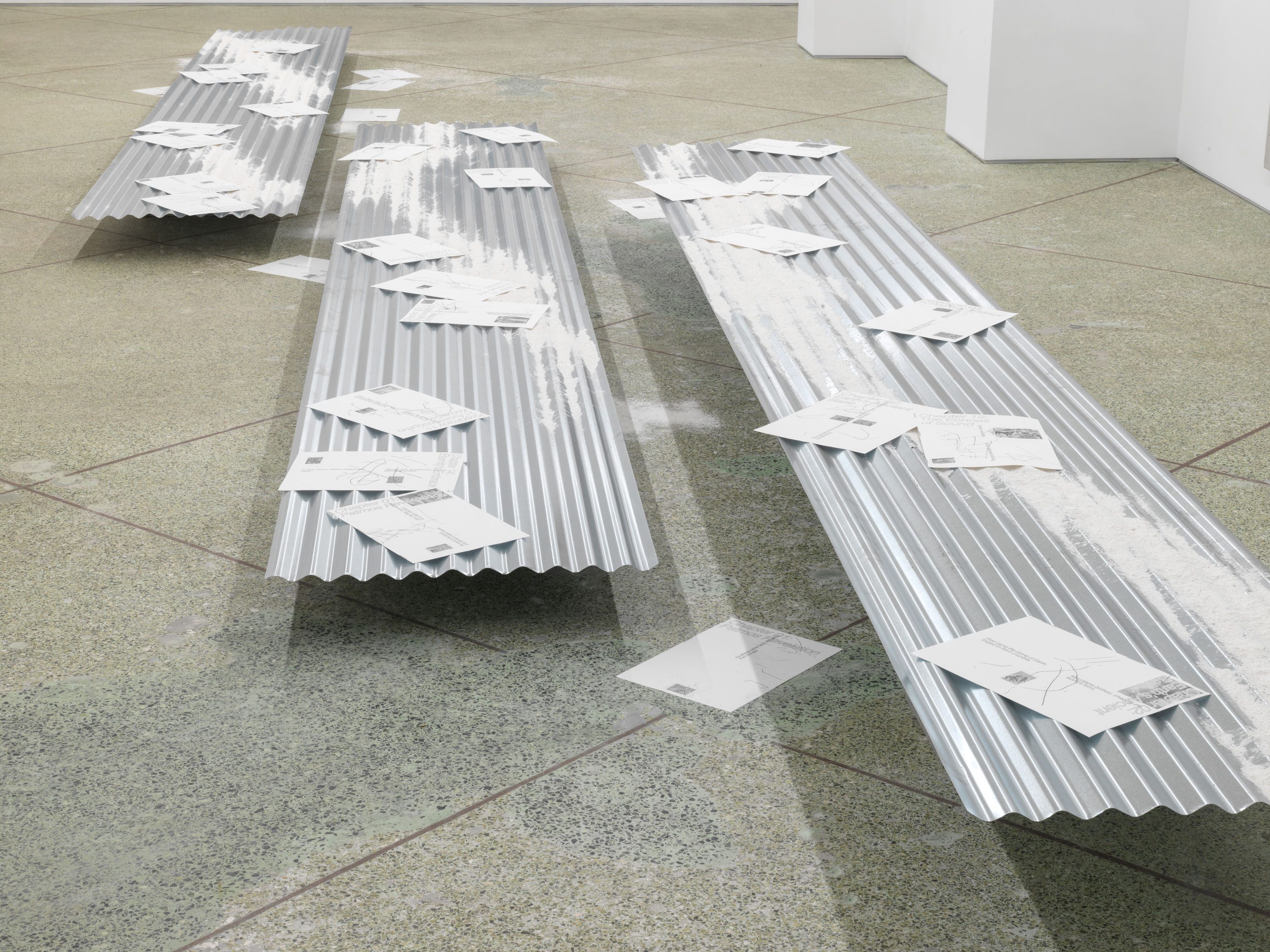 Last but not least, in the center of the gallery stands an installation of wavy metal panels, marble dust and scattered posters that carry the text from the artist's 2023 long poem and performance âAshes from the Seaâ, also created in a similar process of training, generating and editing back. The text generation processes Lemos uses are developed with his own poems or music lyrics and are then cyclically translated into other iterations and multiple versions that are re-selected into their final poem format.