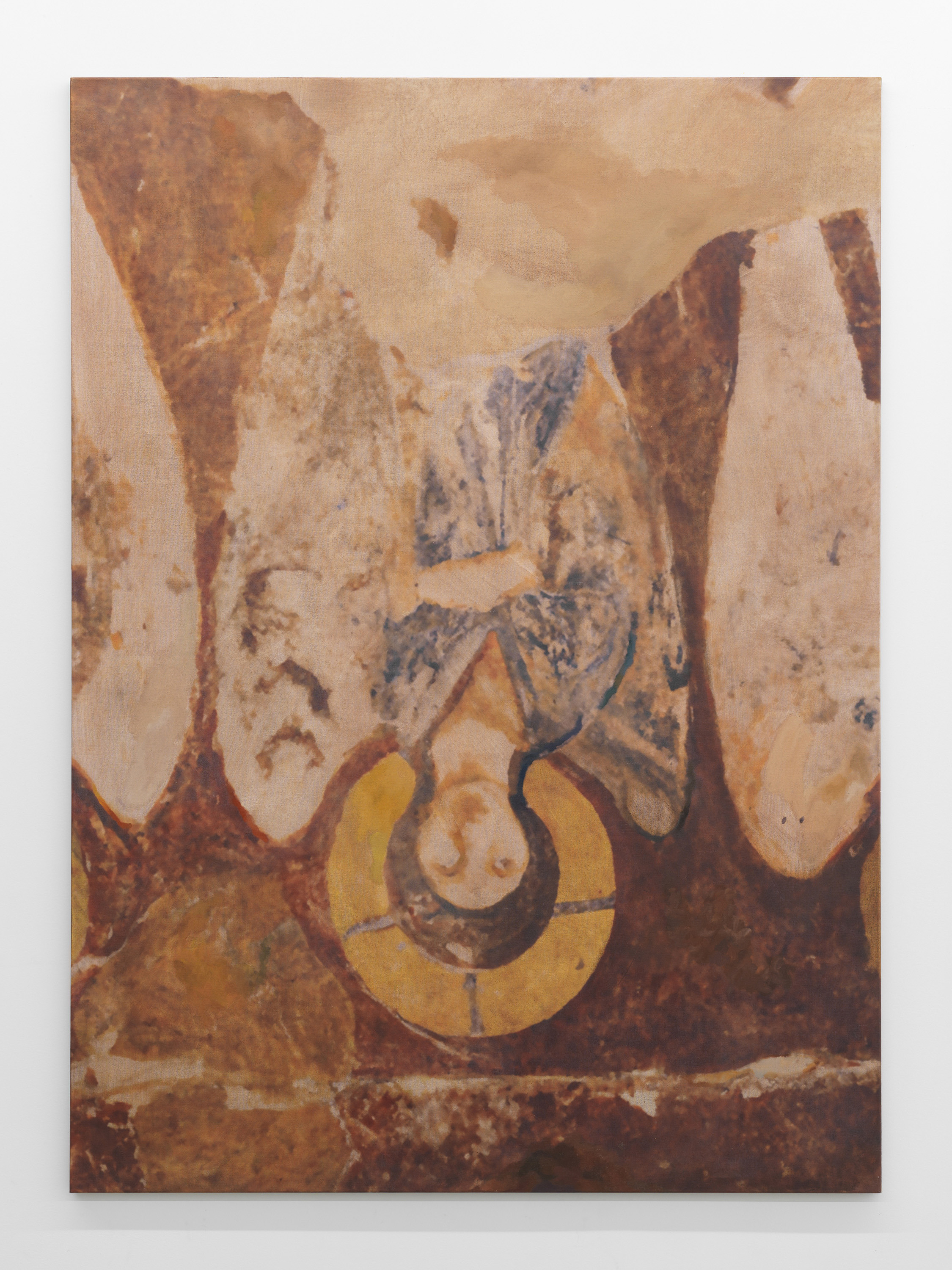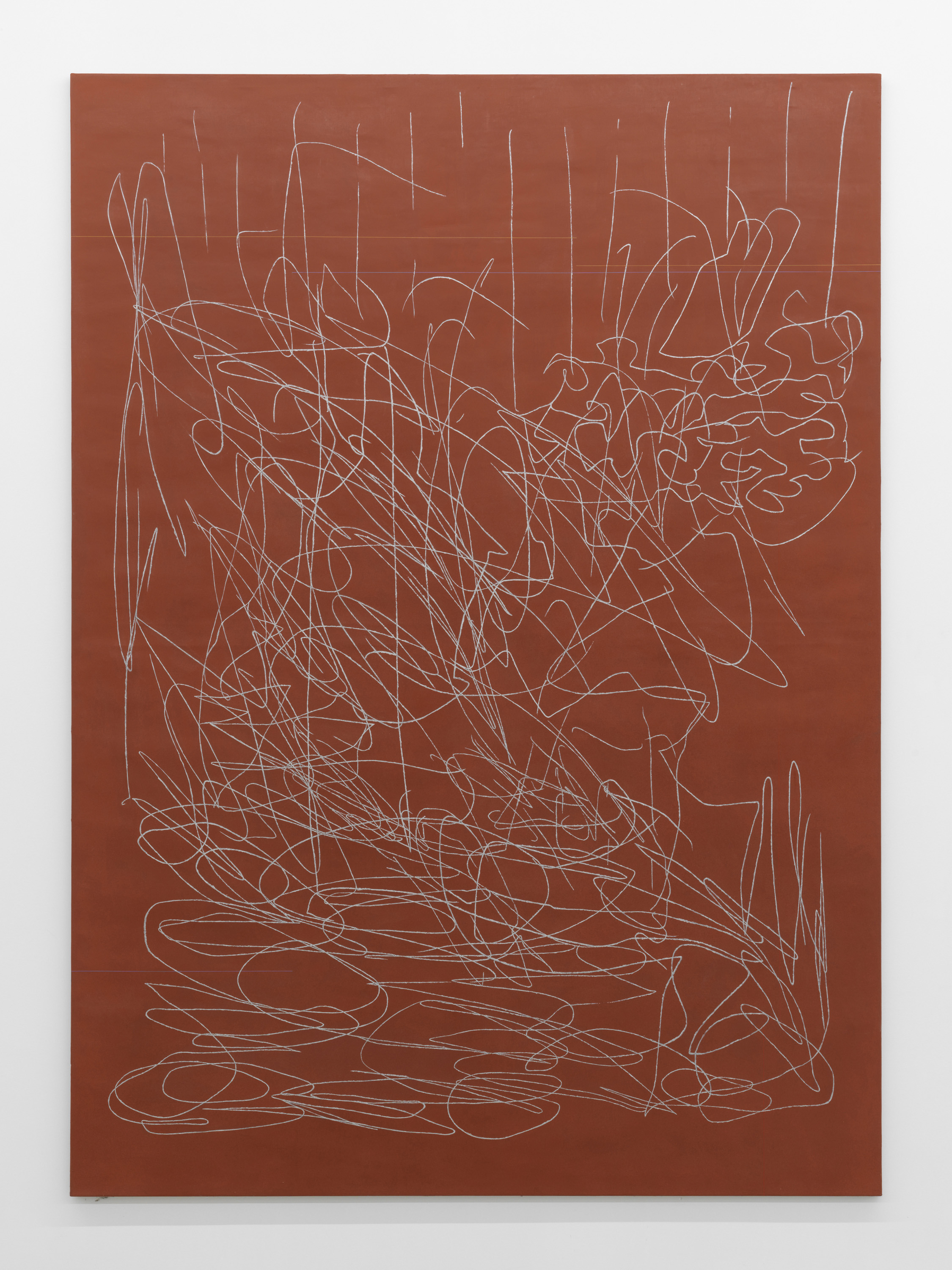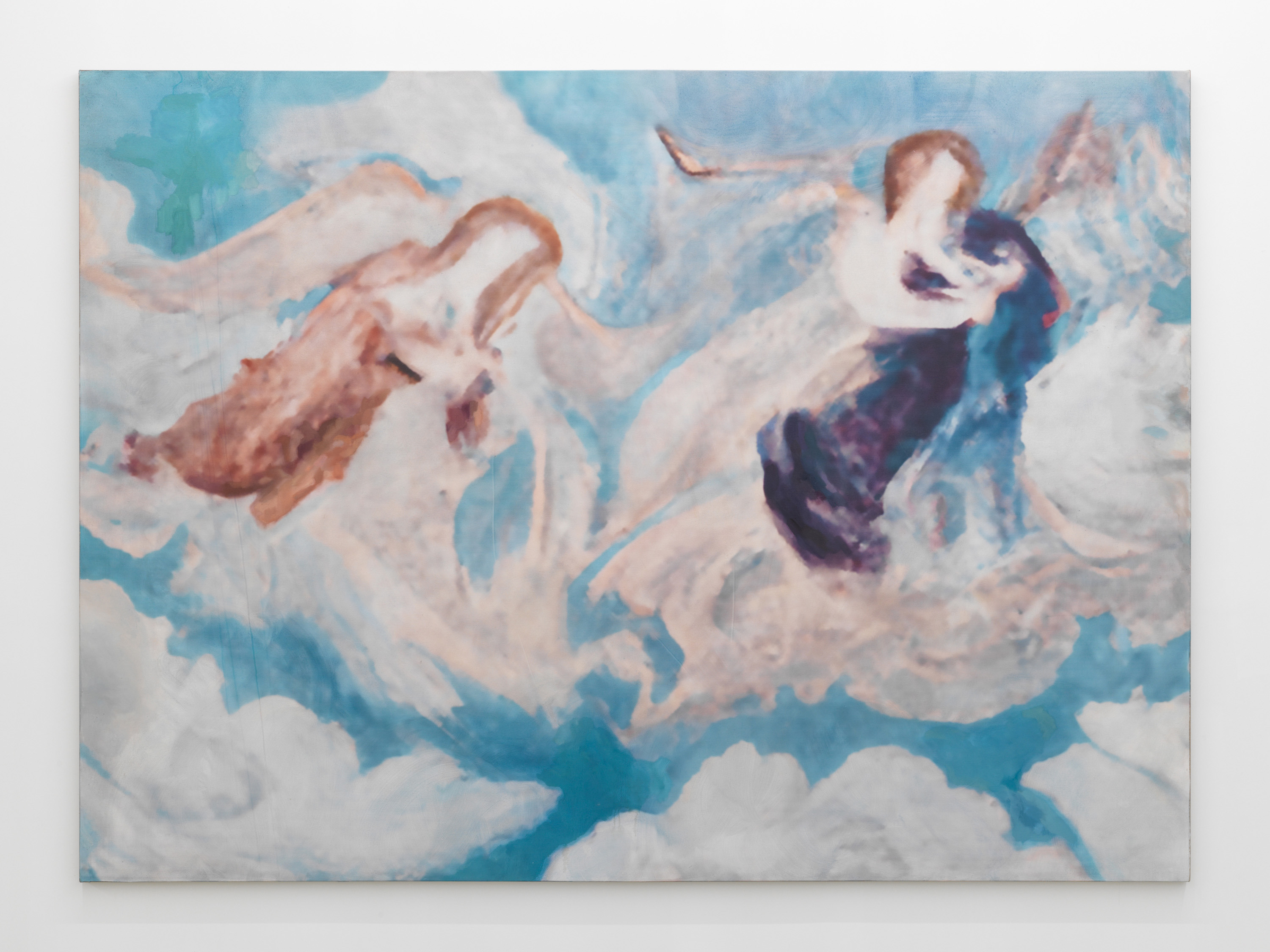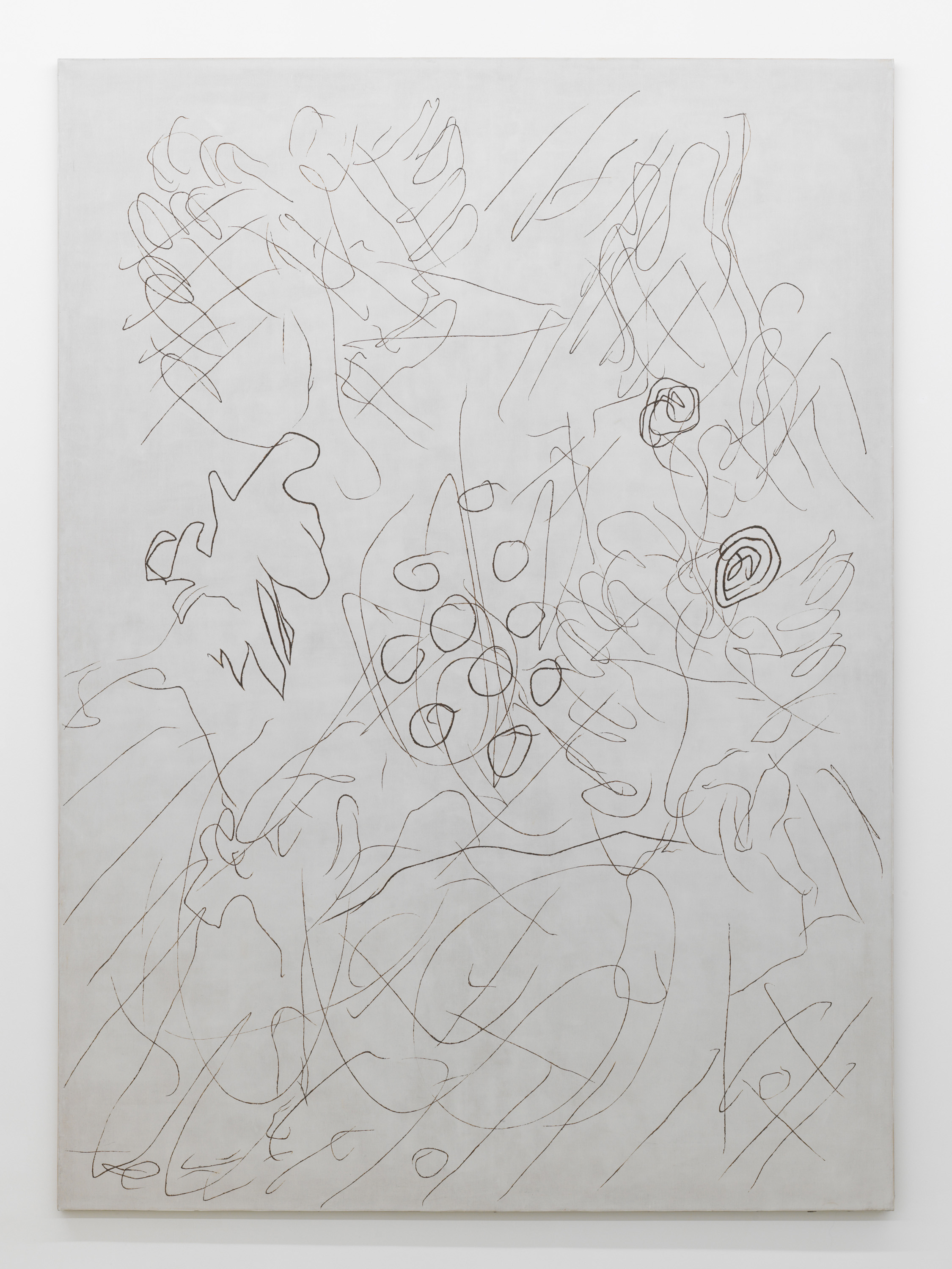 An important part of the production process of these works is the use of photographic images that Lemos has shot or collected, as well as the creation of hundreds of rudimentary sketches, which were given as training materials to the custom AI software/tools, in order to create new interpretations and versions according to specific instruction sets. Then, through a cyclical collaborative process between Lemos and these tools, the artist created works that consist either of monochrome abstract paintings with drawn lines suggesting sketches or occasional abrasions and erasures, or more figurative works depicting angels, saints, spirits, or scenes of nature or people that incorporate themes of transience, transformation, otherworldliness.