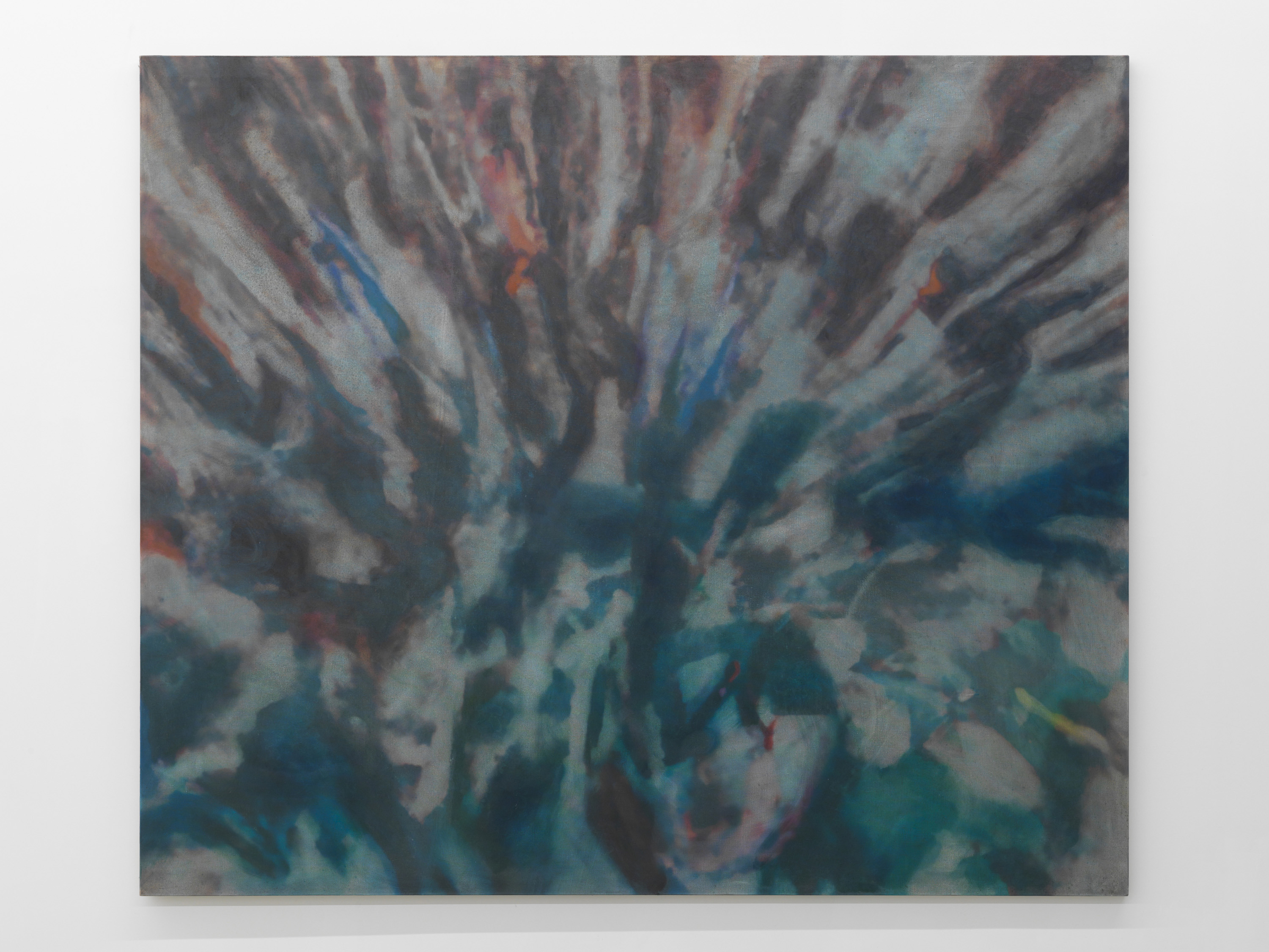 Technically, the multicolored paintings are large-scale hybrid compositions crafted with UV-cured ink and gestural oil paint brushstrokes over linen. The digital images generated by the neural networks serve as foundational elements, accentuated by Lemos' selective application of oil paint to enhance texture, depth, color and composition. This synthesis of industrial processes and traditional painting techniques underscores the exhibition's exploration of collaborative and experimental art practices.