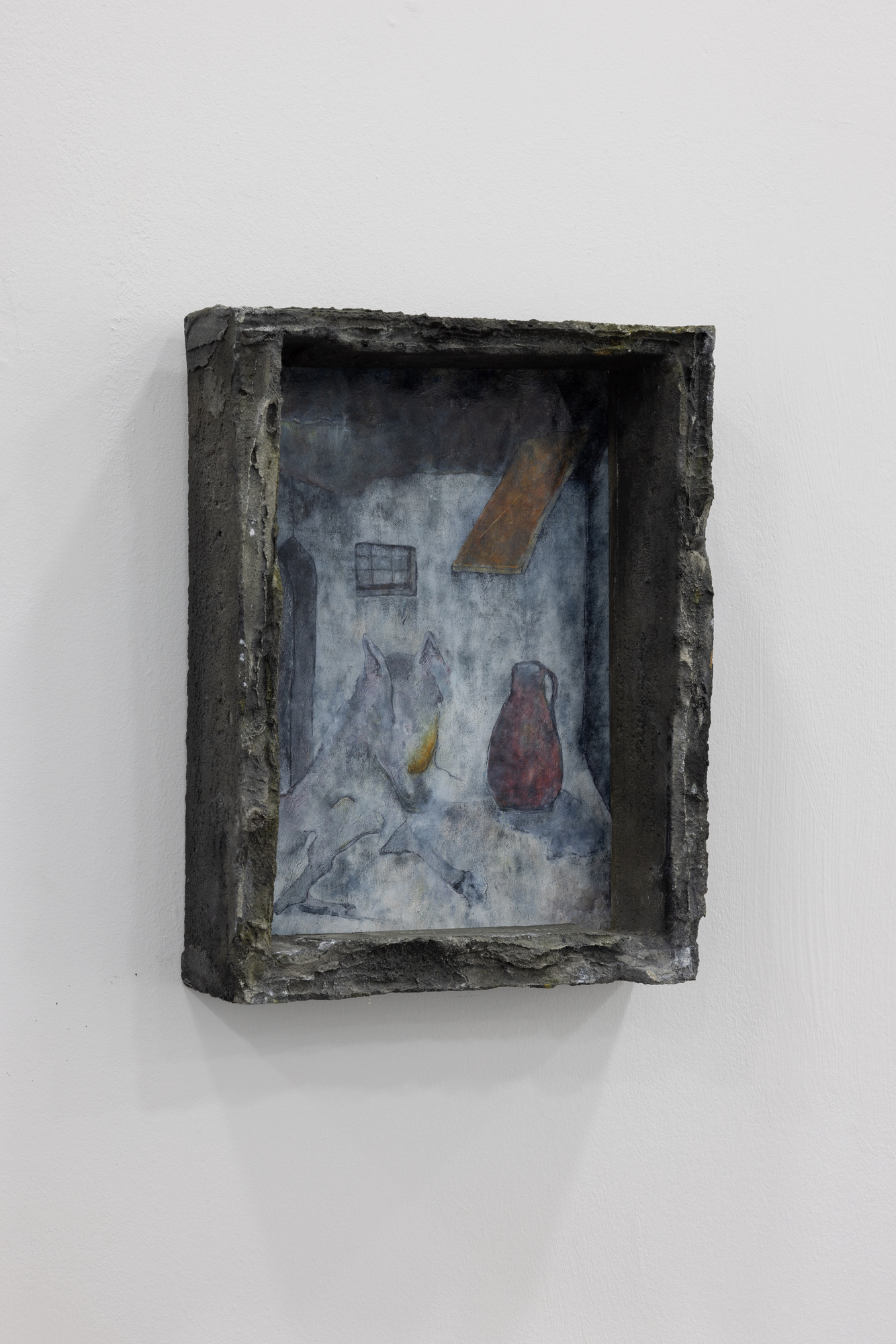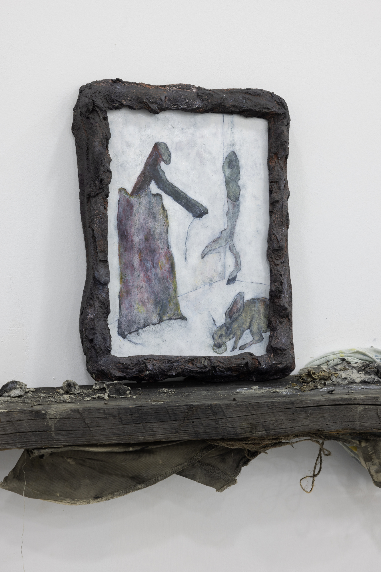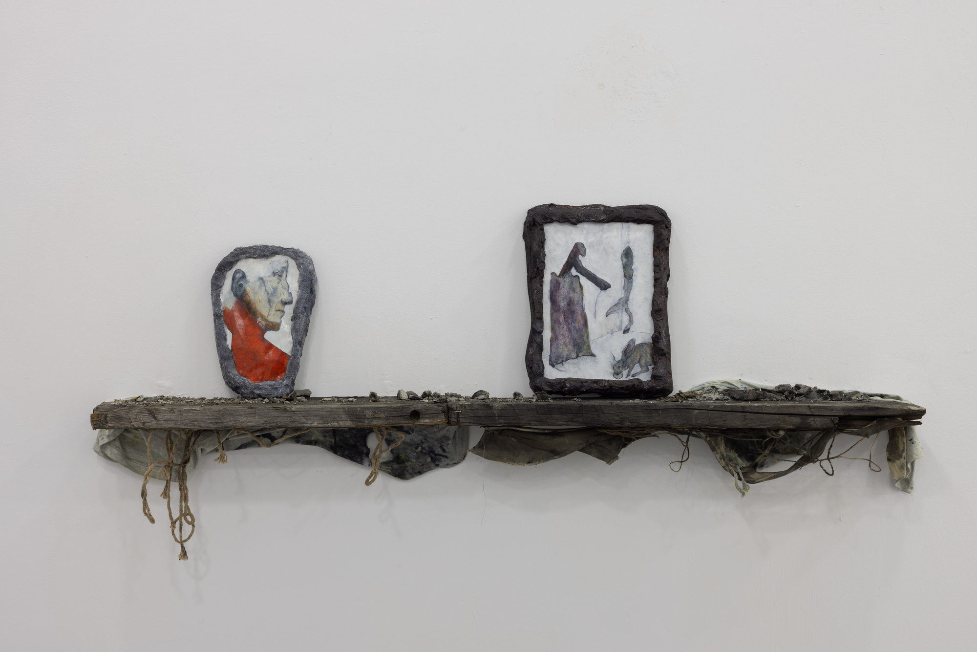 One piece depicts a hand wielding a tool, echoing the historical monument of Svetitskhoveli, suggesting the âfirst dayâ might be a new chapter built on past foundations, a nonsensical reimagining of history, or a surreal endeavour to grasp fleeting memories. The artistâs handmade cement frames, juxtaposed against the watercoloursâ impermanence, symbolise our efforts to solidify these ephemeral experiences. Bend- elianiâs work compels us to question how we piece together fragments of time and anchor these fleeting images in a permanent reality.