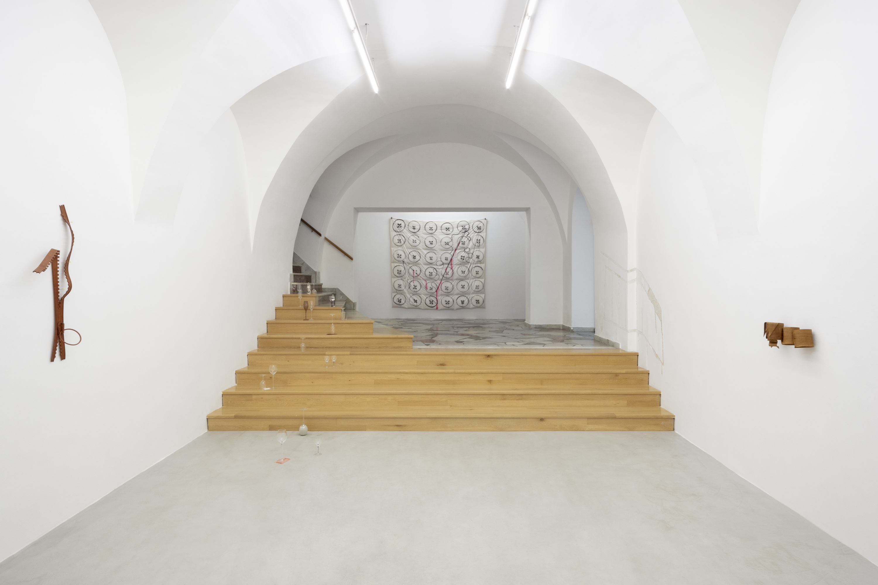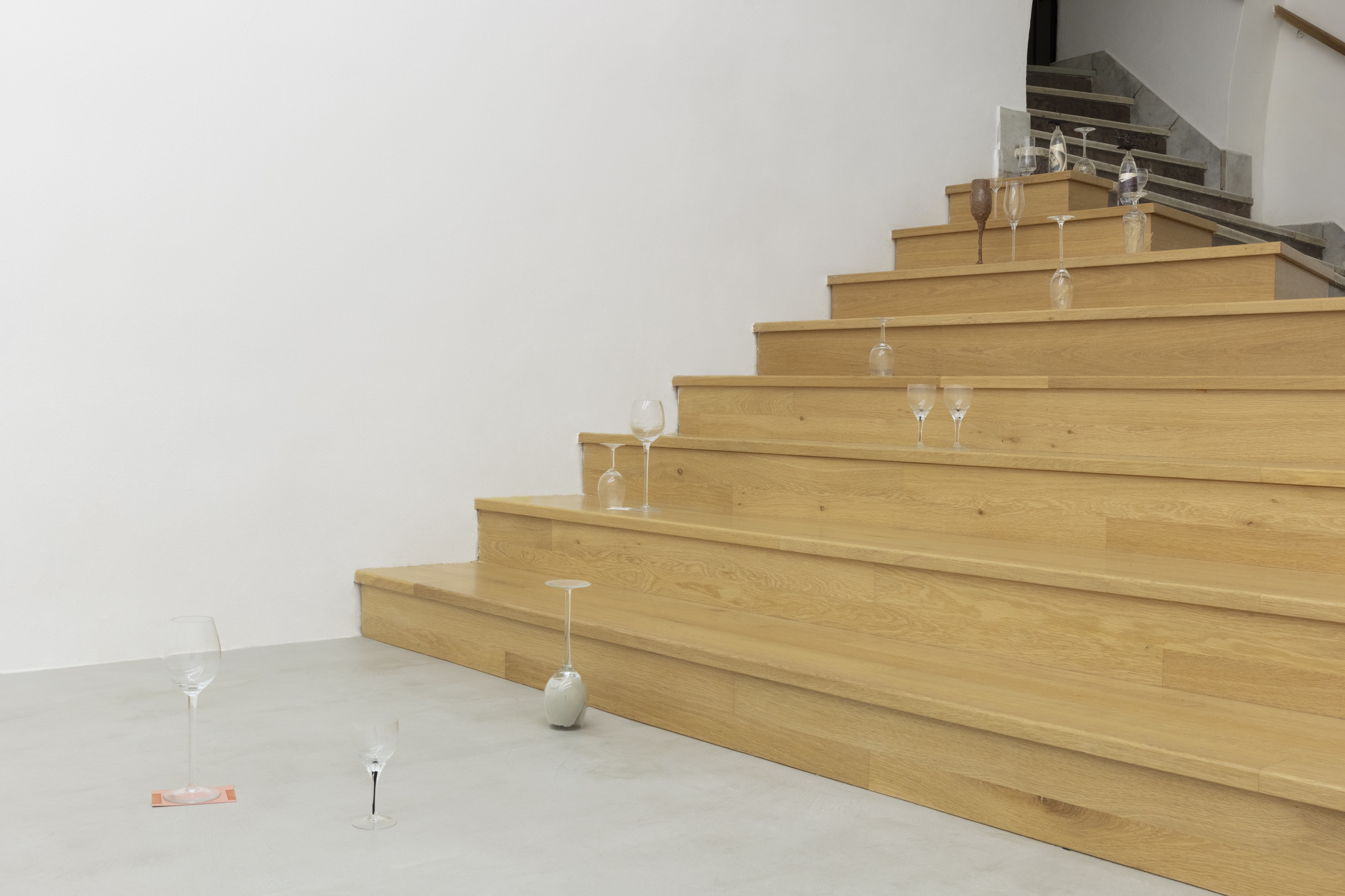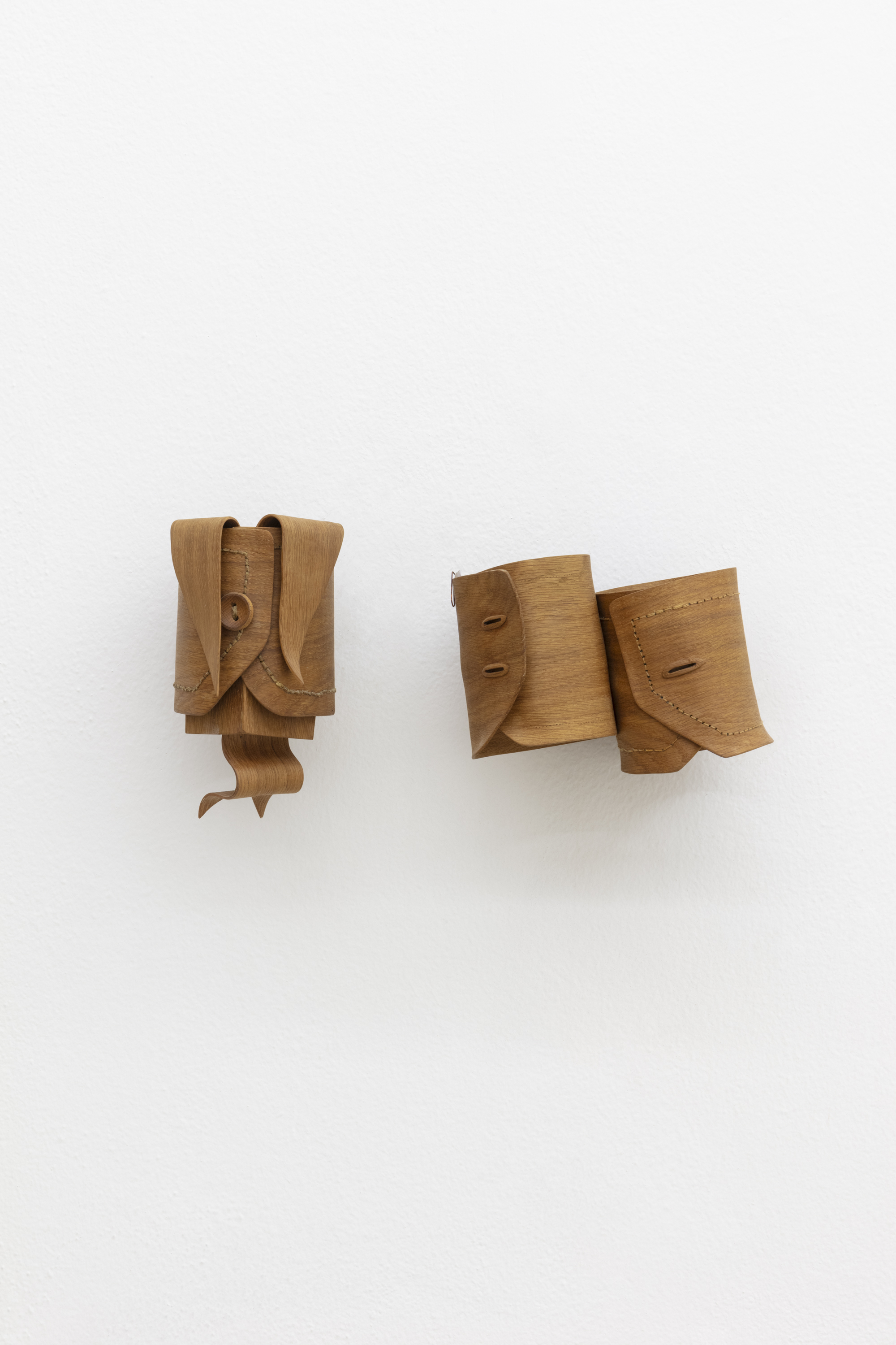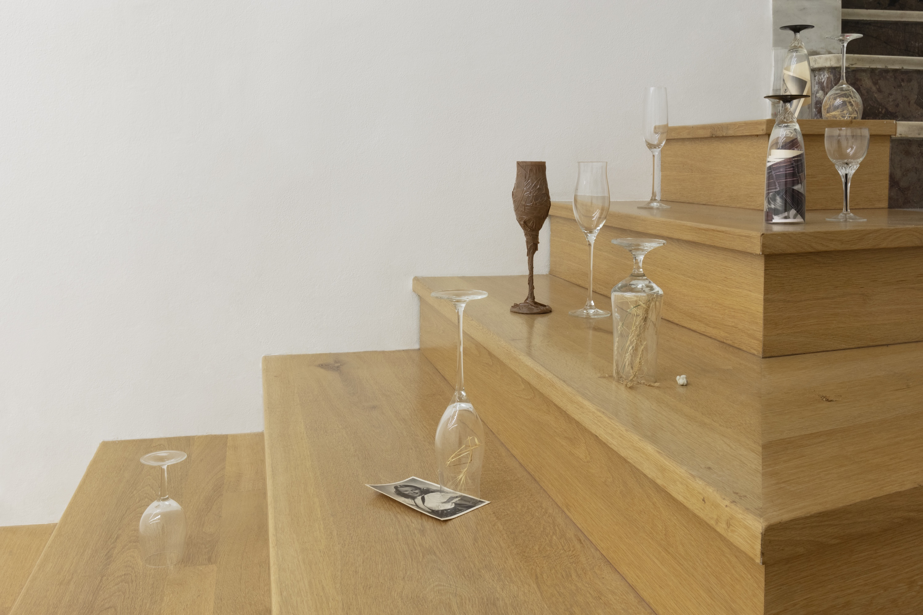 Trin Alt's, Tobias Izsó's and Layo Laurence Mussi's exhibition presents a selection of their individual works, yet at the same time, these pieces are connected by a shared dialogue of similar underlying narratives and meanings. This might include an interest in the everyday, as seen through its material traces and pictorial symbols. Tobias explores the poetics of 'ordinary' things, transforming them with great craftsmanship and material sensitivity into stylized reliefs and objects. These works evoke various cultural codes—surrealism, children's railways, or 1960s apartment interiors—creating a journey through collective cultural memory. Layo, on the other hand, brings everyday objects closer to the realm of the ready-made. His installation, made from various dinner party glasses, stand as lonely remnants of the past. The cultural associations tied to these objects suggest conversations, arguments, or debates, functioning as still lifes that allude to impermanence. Trin Alt works with previously used everyday items such as blankets or discarded cardboard boxes.