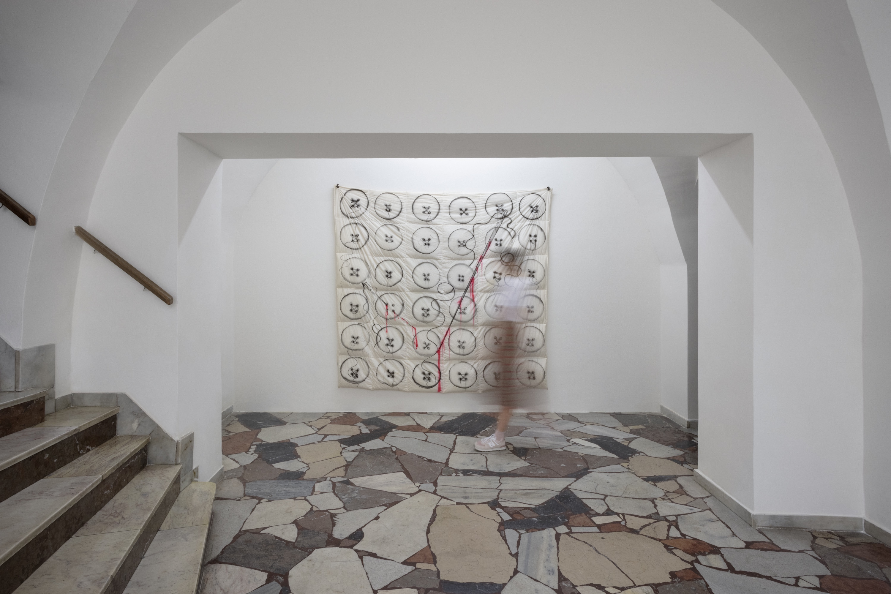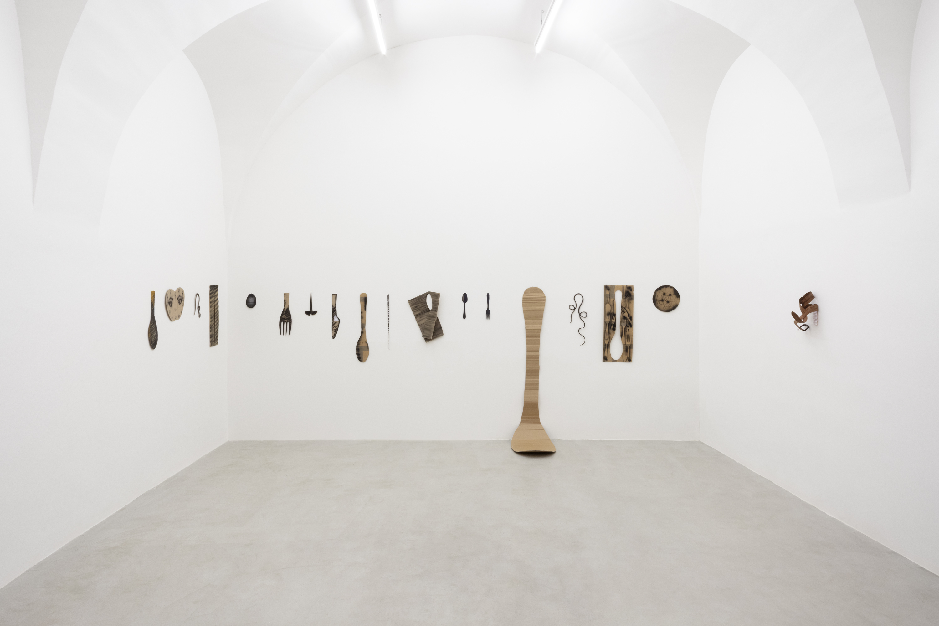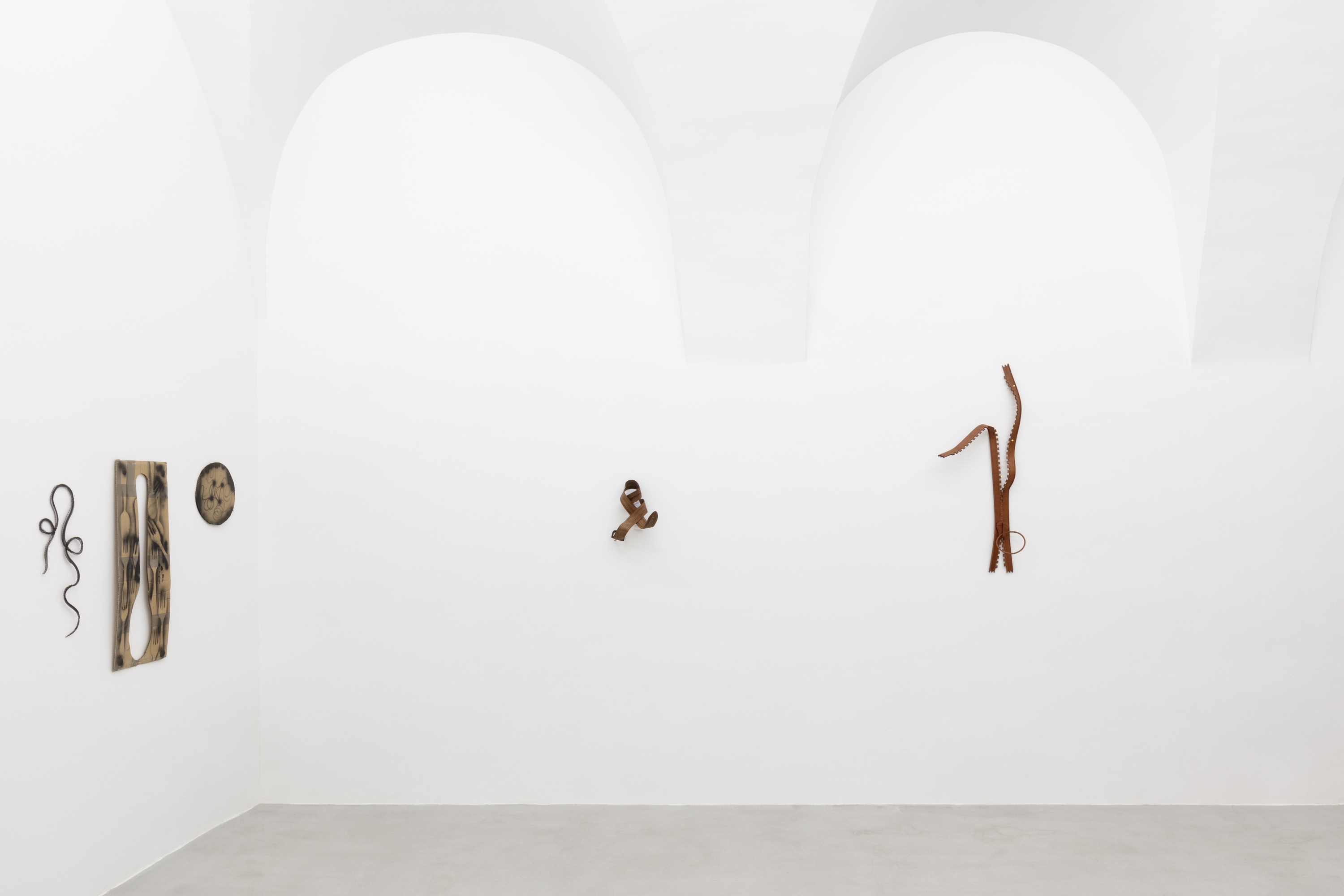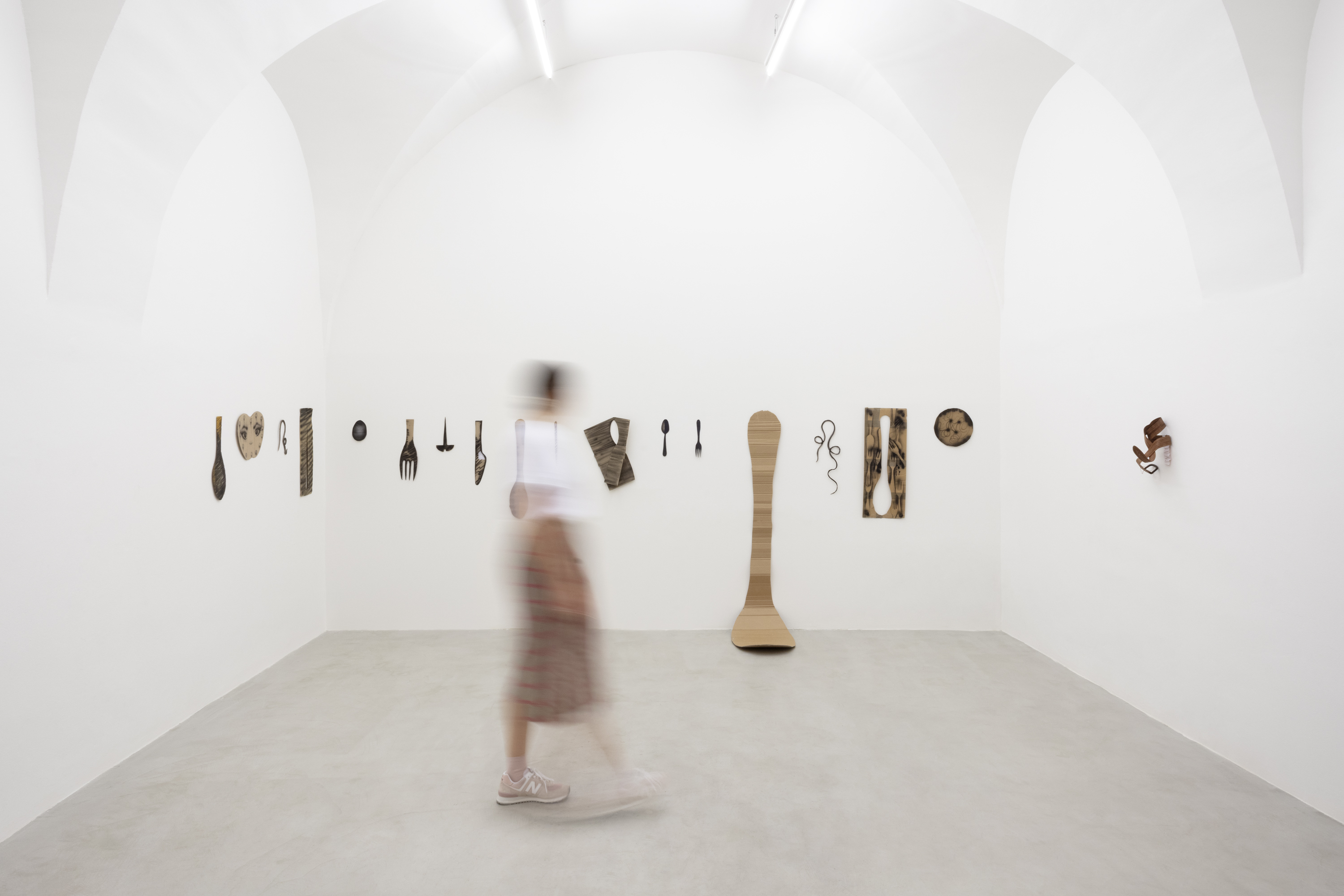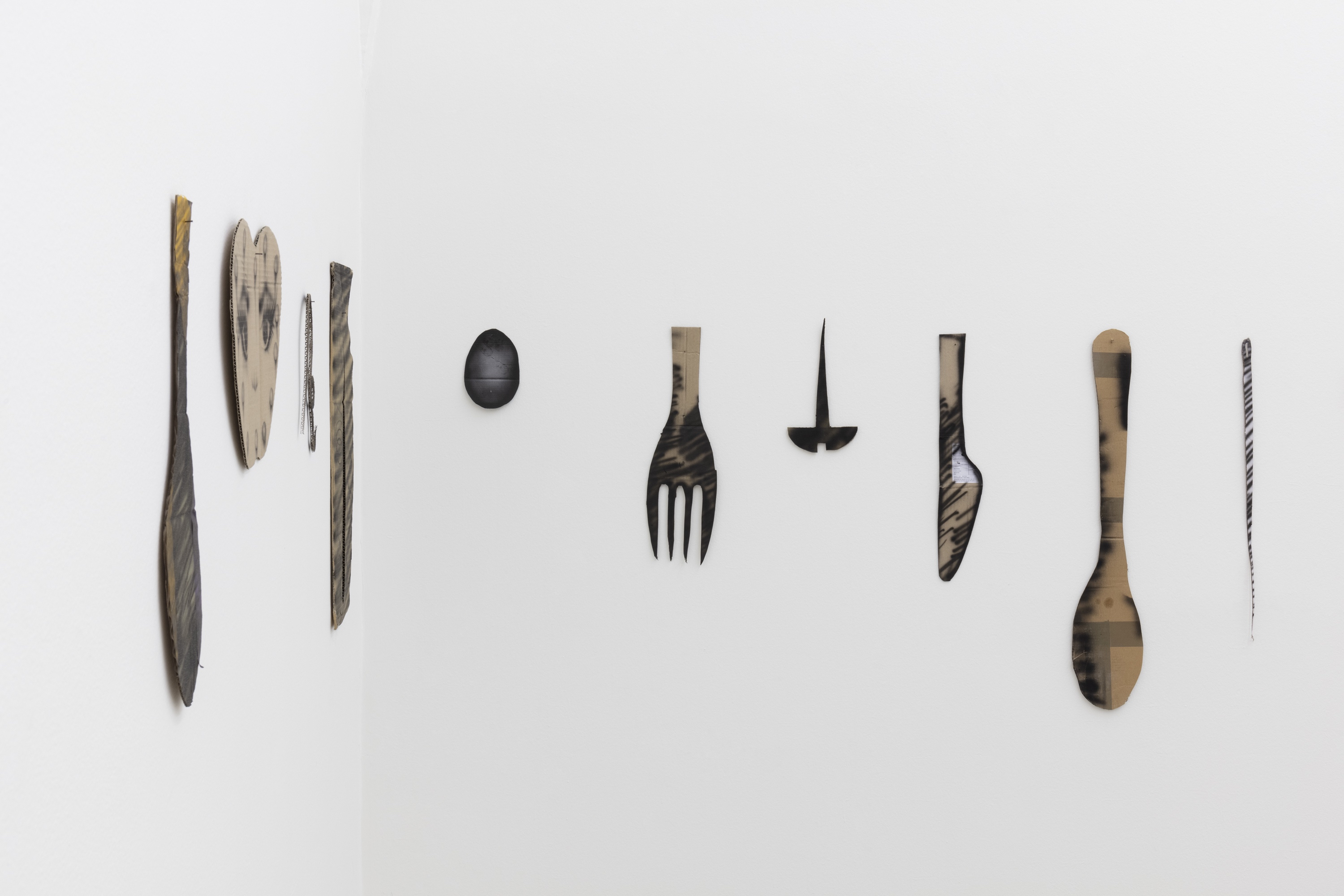 Trin Alt's, Tobias Izsó's and Layo Laurence Mussi's exhibition presents a selection of their individual works, yet at the same time, these pieces are connected by a shared dialogue of similar underlying narratives and meanings. This might include an interest in the everyday, as seen through its material traces and pictorial symbols. Tobias explores the poetics of 'ordinary' things, transforming them with great craftsmanship and material sensitivity into stylized reliefs and objects. These works evoke various cultural codes—surrealism, children's railways, or 1960s apartment interiors—creating a journey through collective cultural memory. Layo, on the other hand, brings everyday objects closer to the realm of the ready-made. His installation, made from various dinner party glasses, stand as lonely remnants of the past. The cultural associations tied to these objects suggest conversations, arguments, or debates, functioning as still lifes that allude to impermanence. Trin Alt works with previously used everyday items such as blankets or discarded cardboard boxes.