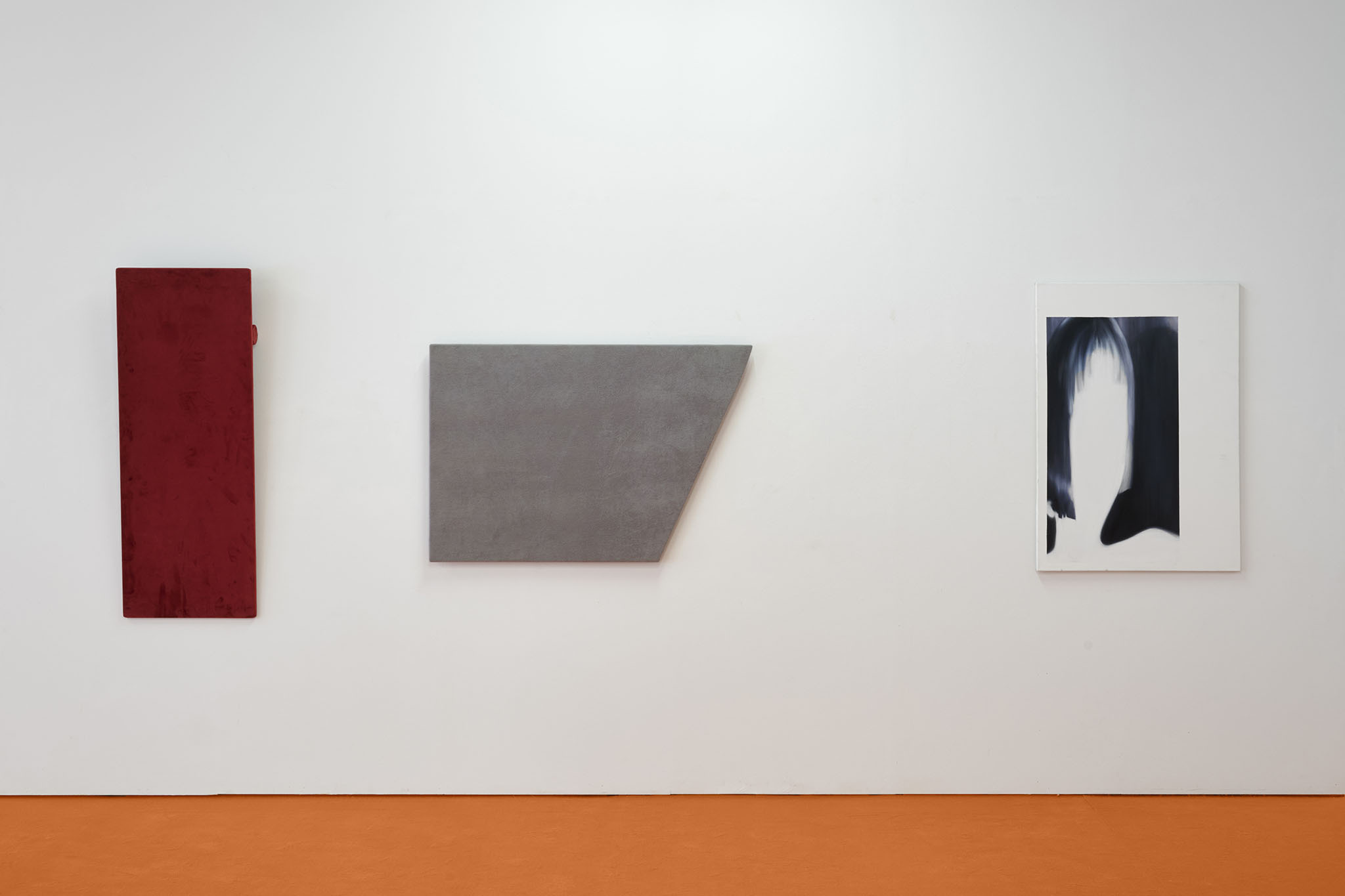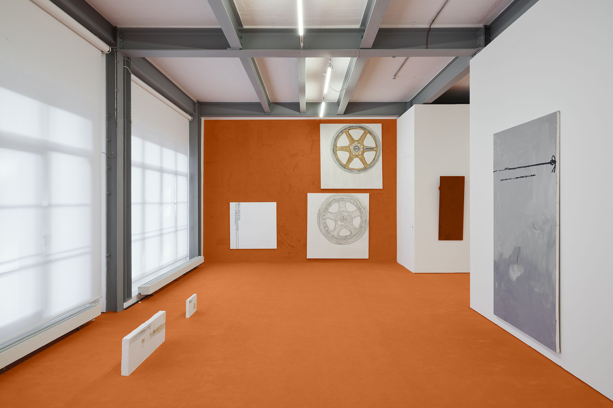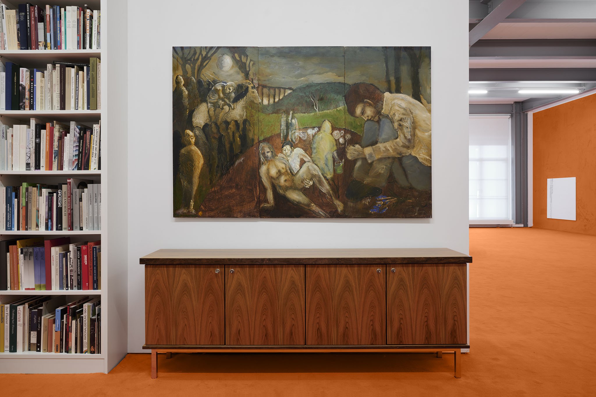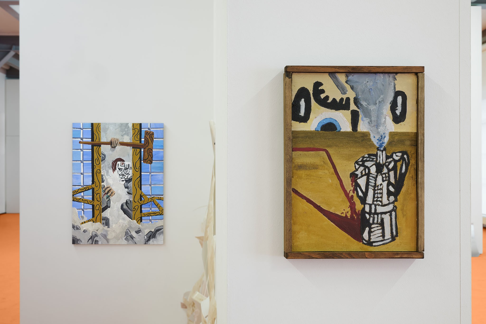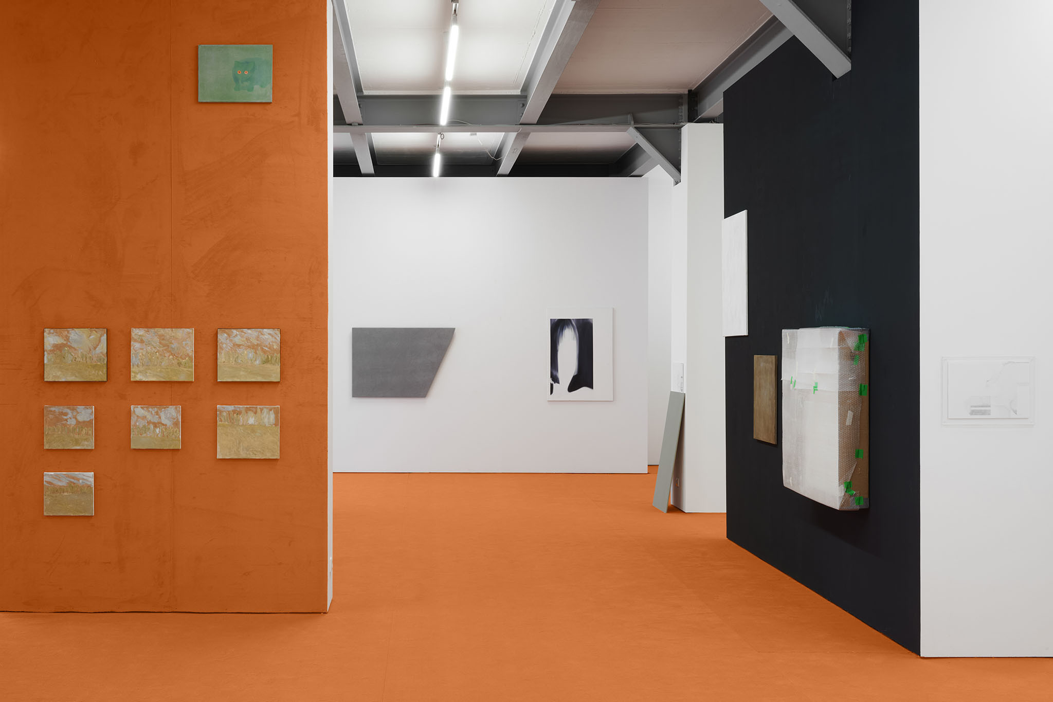 And then they paint, but not like a band. Rather as if each and every one of them had asked themselves: ‘What do I want? Where am I going?’ – This is obvious in the exhibition with its orange floors and walls. The penetrating colour creates a bracket, but it does not have to hold anything together, as nothing necessarily diverges; the orange succeeds in visibly liberating the works from the white grey of the studios.