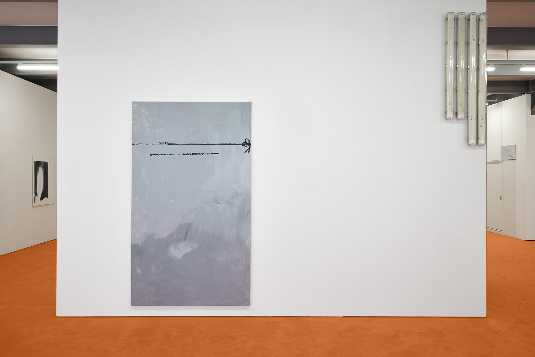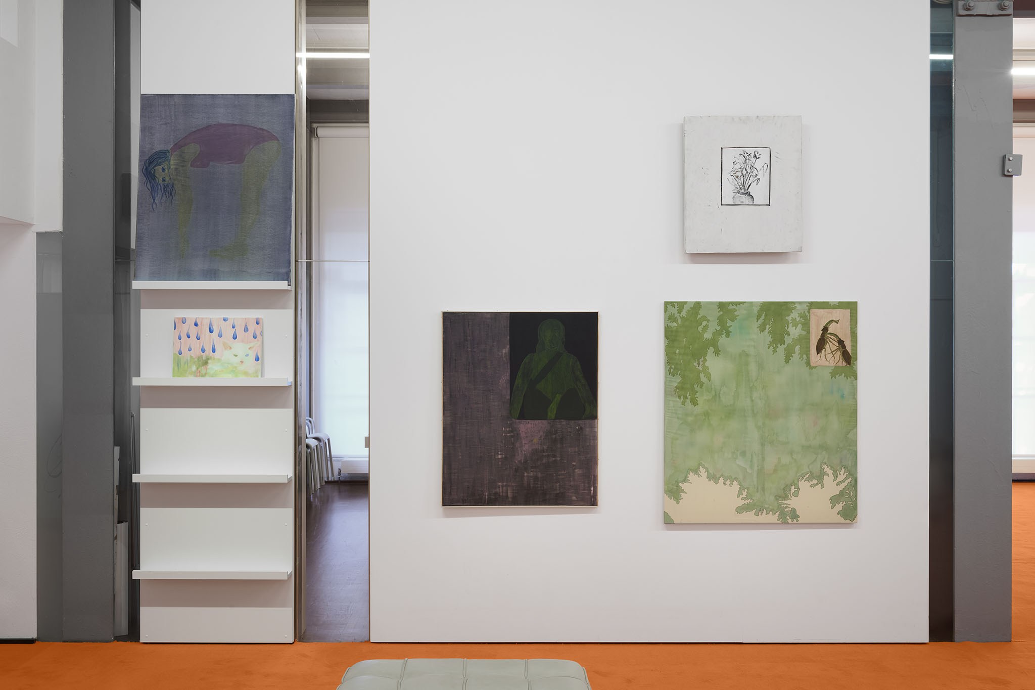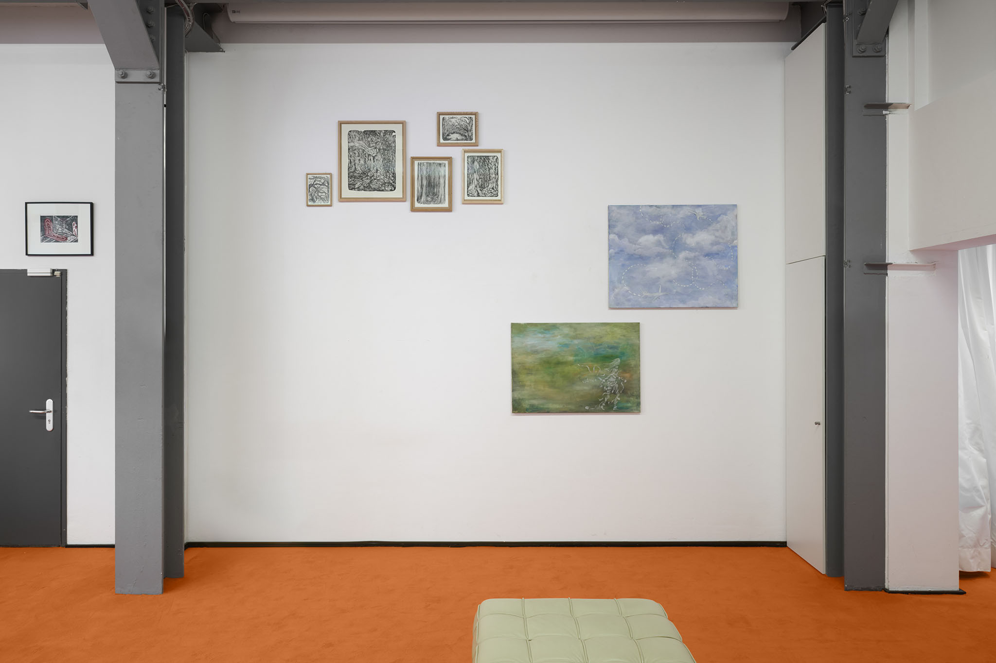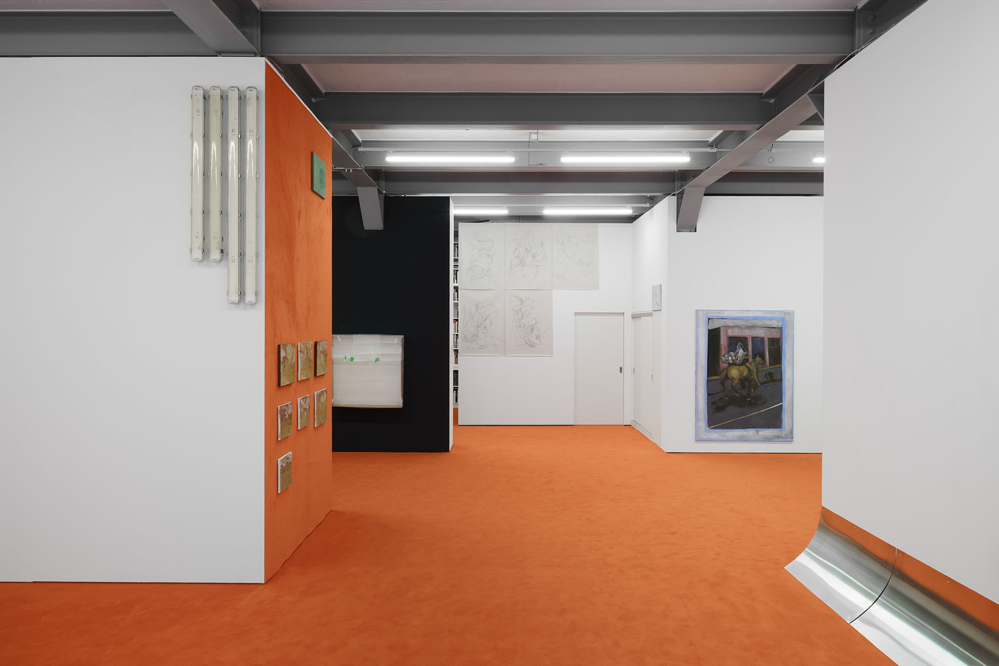 And then they paint, but not like a band. Rather as if each and every one of them had asked themselves: ‘What do I want? Where am I going?’ – This is obvious in the exhibition with its orange floors and walls. The penetrating colour creates a bracket, but it does not have to hold anything together, as nothing necessarily diverges; the orange succeeds in visibly liberating the works from the white grey of the studios.
