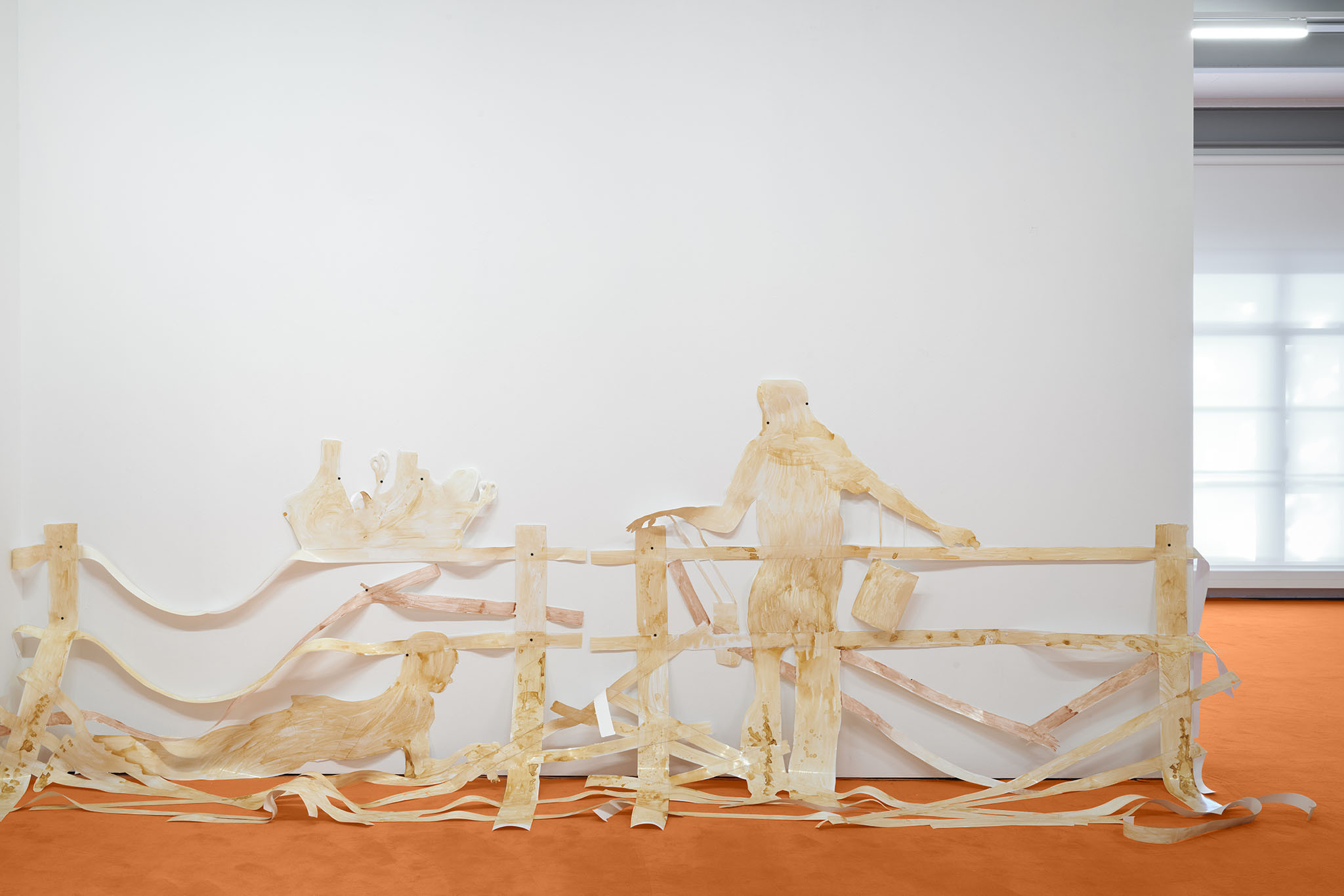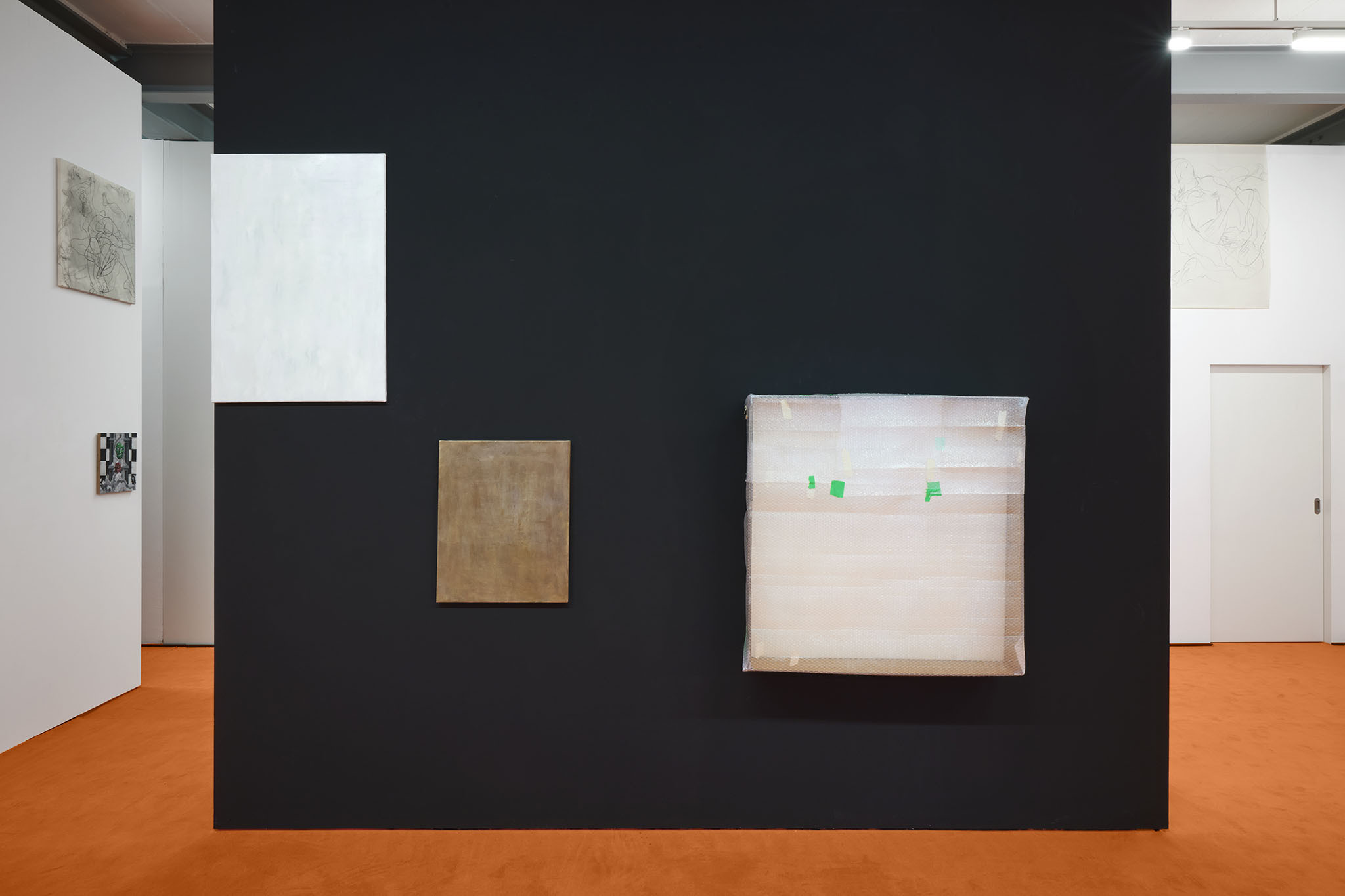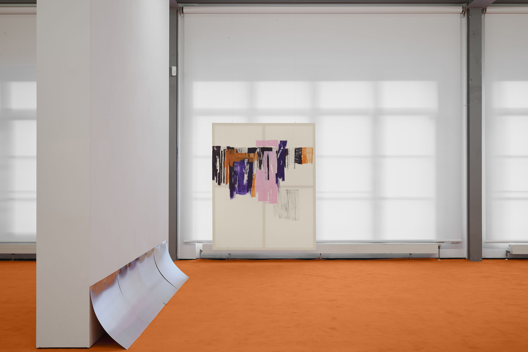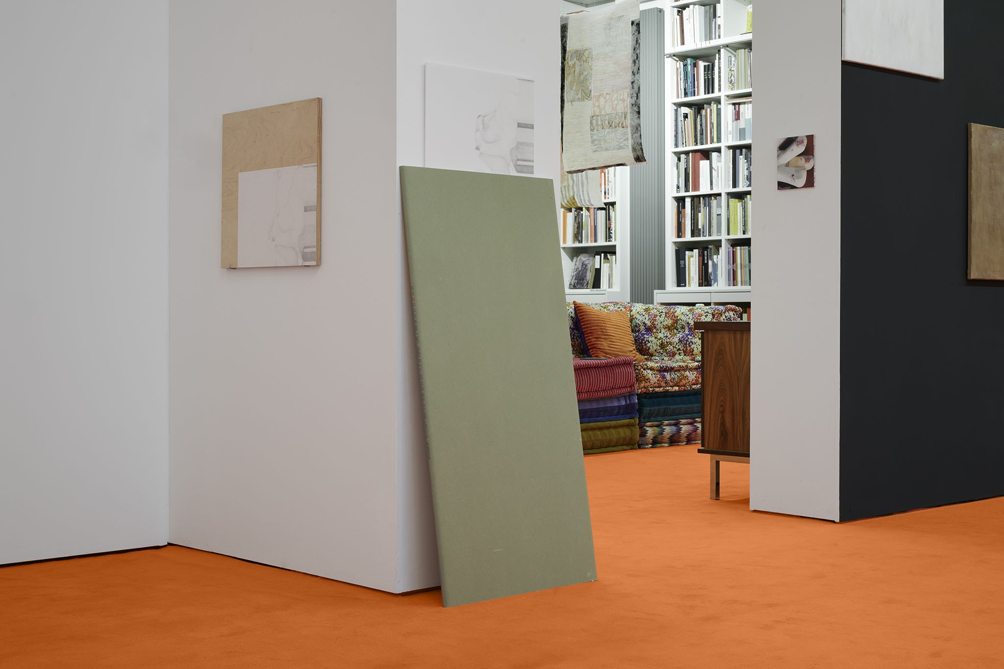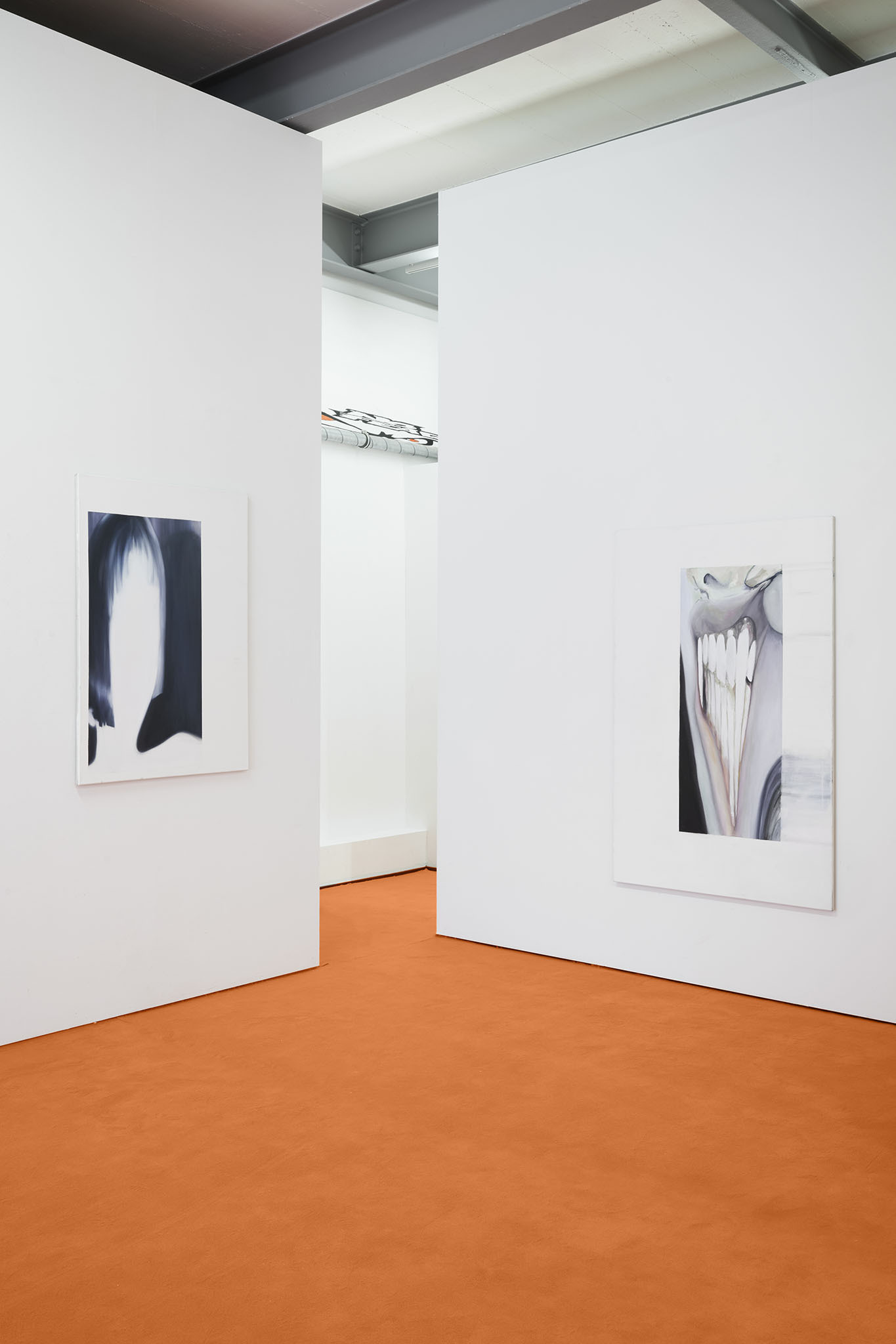 And then they paint, but not like a band. Rather as if each and every one of them had asked themselves: ‘What do I want? Where am I going?’ – This is obvious in the exhibition with its orange floors and walls. The penetrating colour creates a bracket, but it does not have to hold anything together, as nothing necessarily diverges; the orange succeeds in visibly liberating the works from the white grey of the studios.