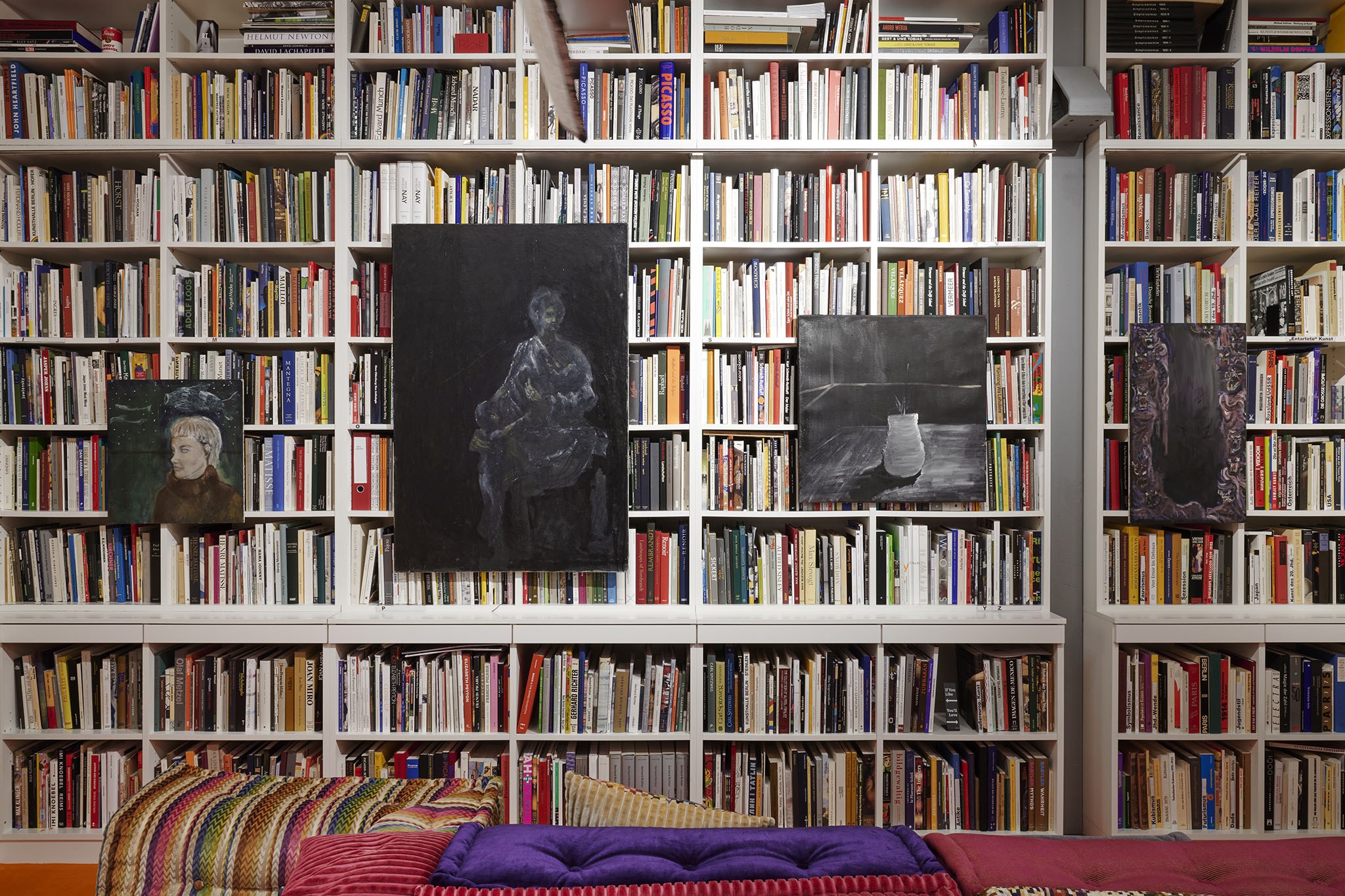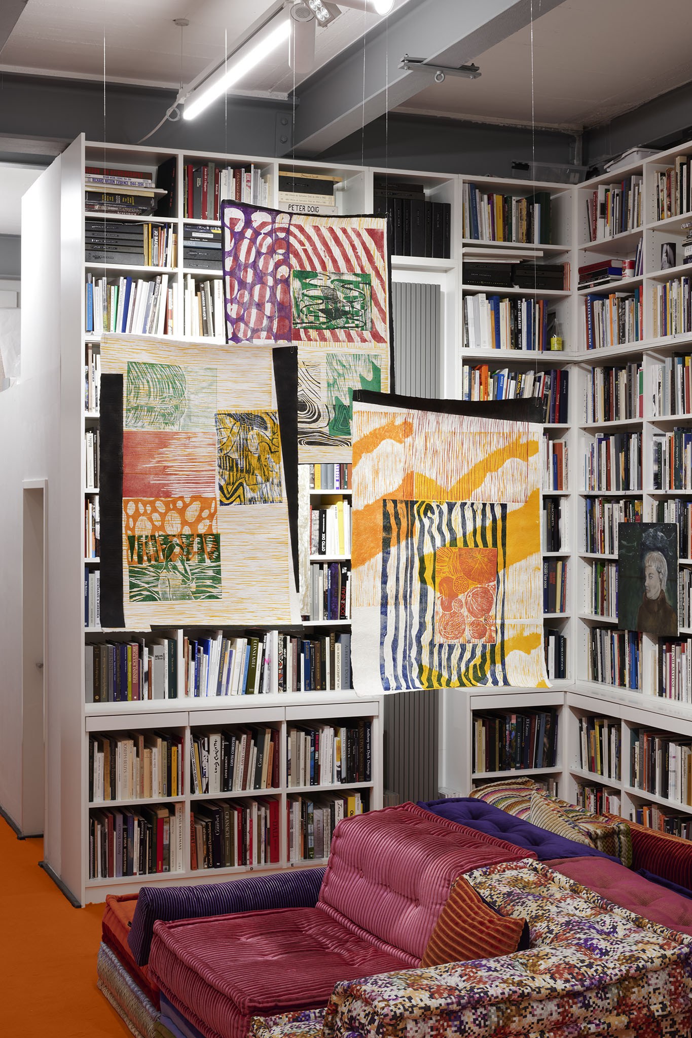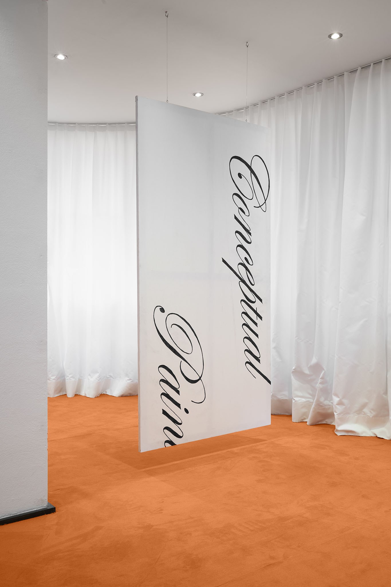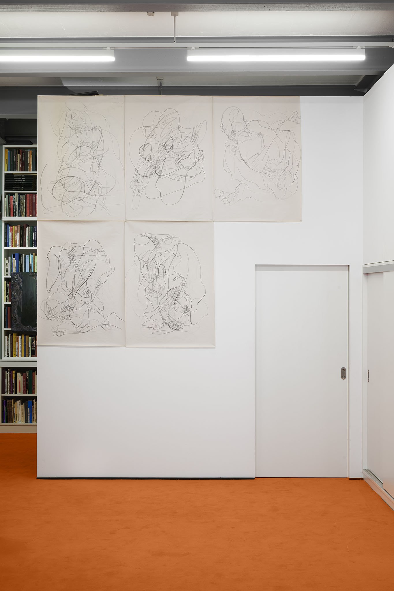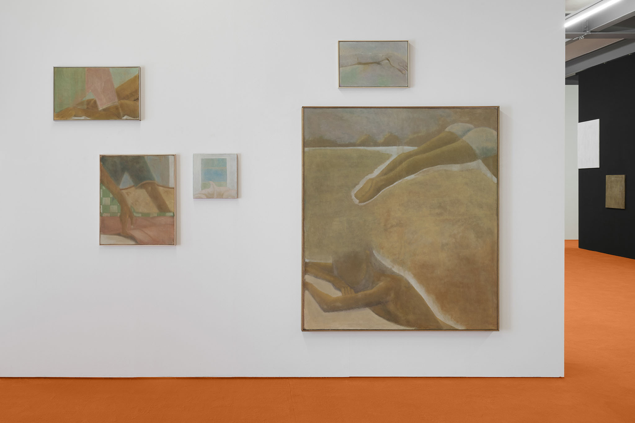 And then they paint, but not like a band. Rather as if each and every one of them had asked themselves: ‘What do I want? Where am I going?’ – This is obvious in the exhibition with its orange floors and walls. The penetrating colour creates a bracket, but it does not have to hold anything together, as nothing necessarily diverges; the orange succeeds in visibly liberating the works from the white grey of the studios.