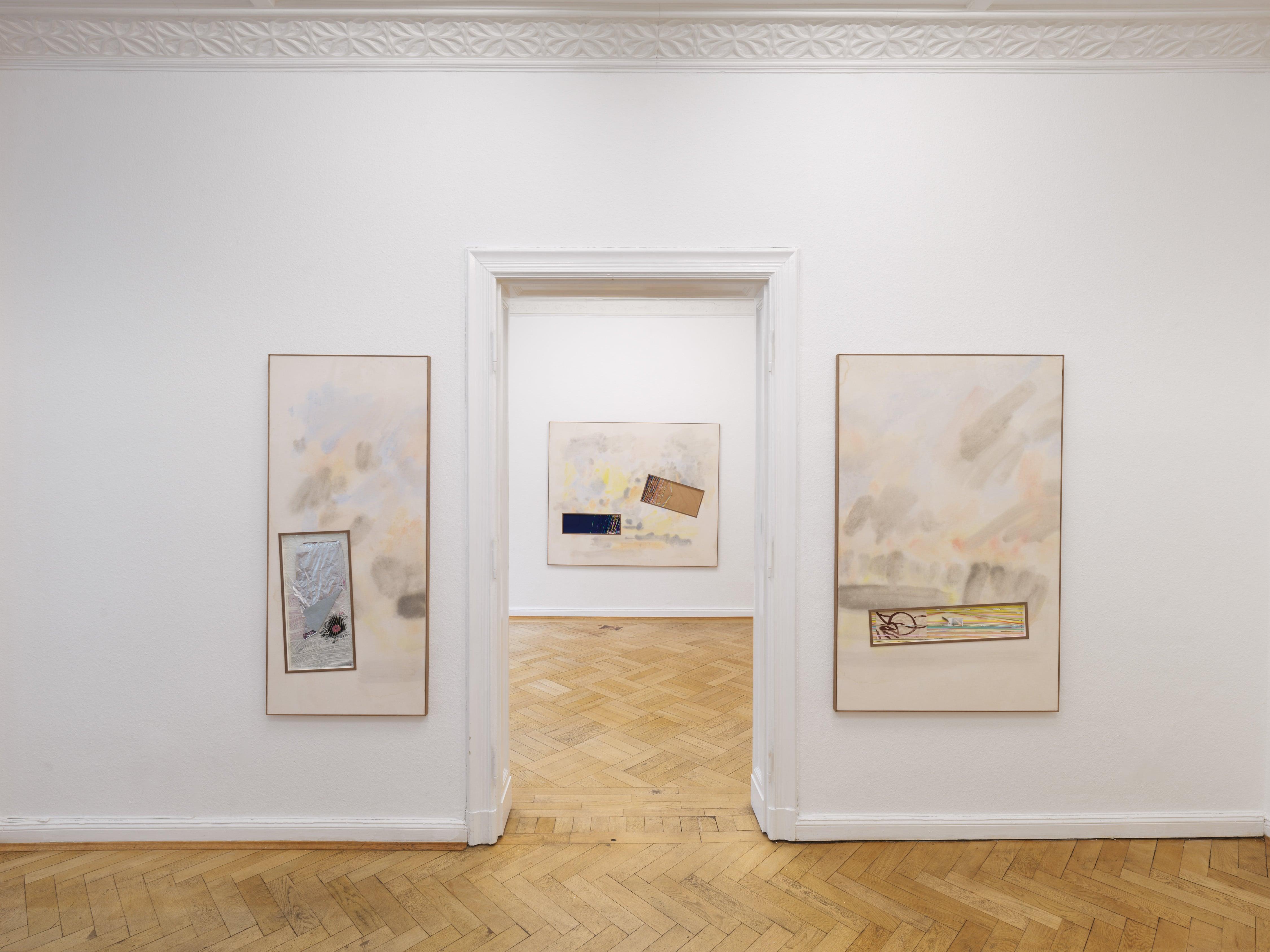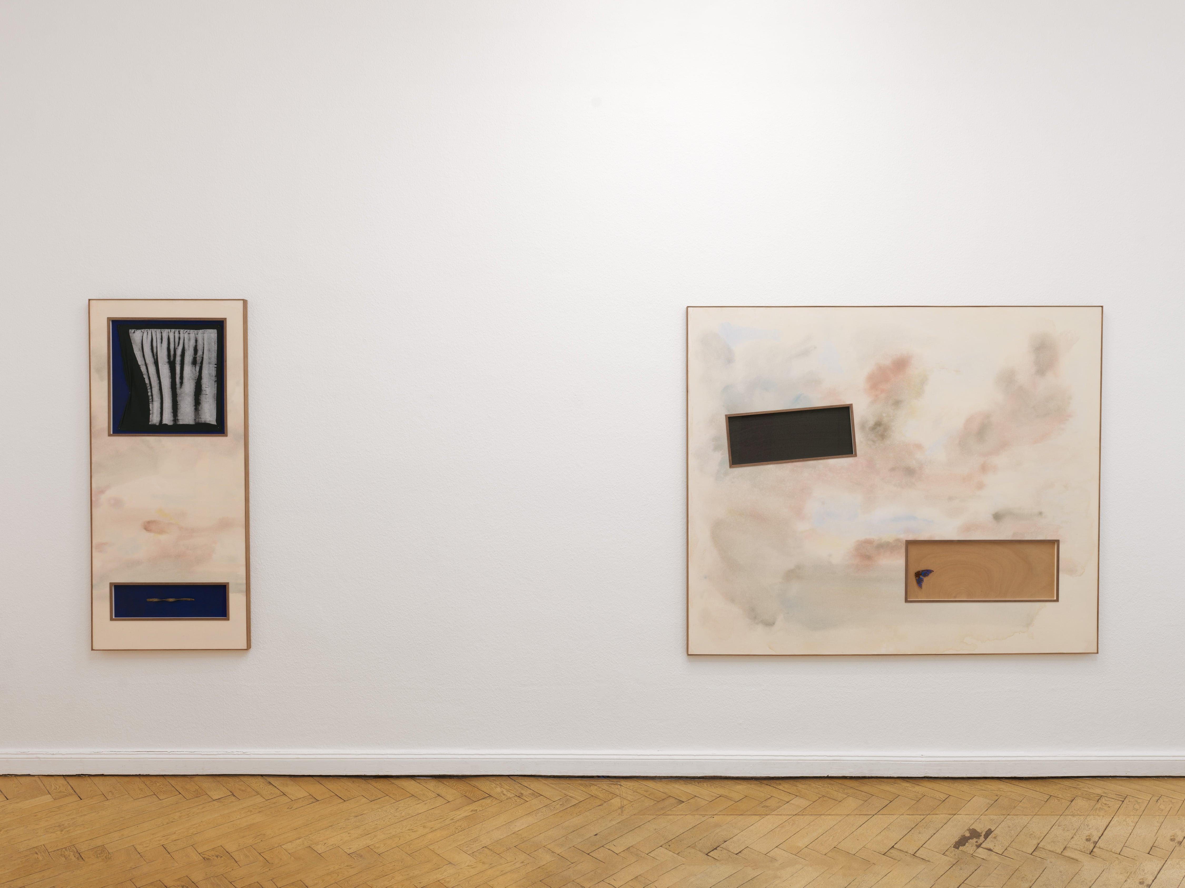 Across the works exhibited in Sag mir wo die Sonne steht, viewers are reminded of their specifically human vantage point on time. Just as the sun seems to rise or set, relative to our senses, the rectangular portals BPJ opens into each painting document the emergence of the concrete from mists of abstraction. In a piece like Sag mir wo die Sonne steht (Foda-se Zeitgeist Schmetterling) (2024), the insectoid elements affixed to it are as much literal as symbolic: they document an irreducible experience while taking on all the connotations wings have in mythology and folklore. Contained by the sky-like architecture, a living creature almost seems to take flight, moving toward the area delimited by the brown rectangle, which could itself be near or far away, earth or sky.